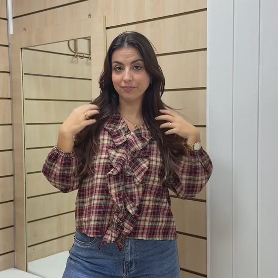 Camisa feminina em padrão xadrez em tons quentes, perfeita para os dias mais frescos. Apresenta decote em V com detalhe de folho frontal que acrescenta um toque romântico e sofisticado ao look. As mangas compridas com ligeiro volume e punho elástico garantem conforto e um cair elegante.