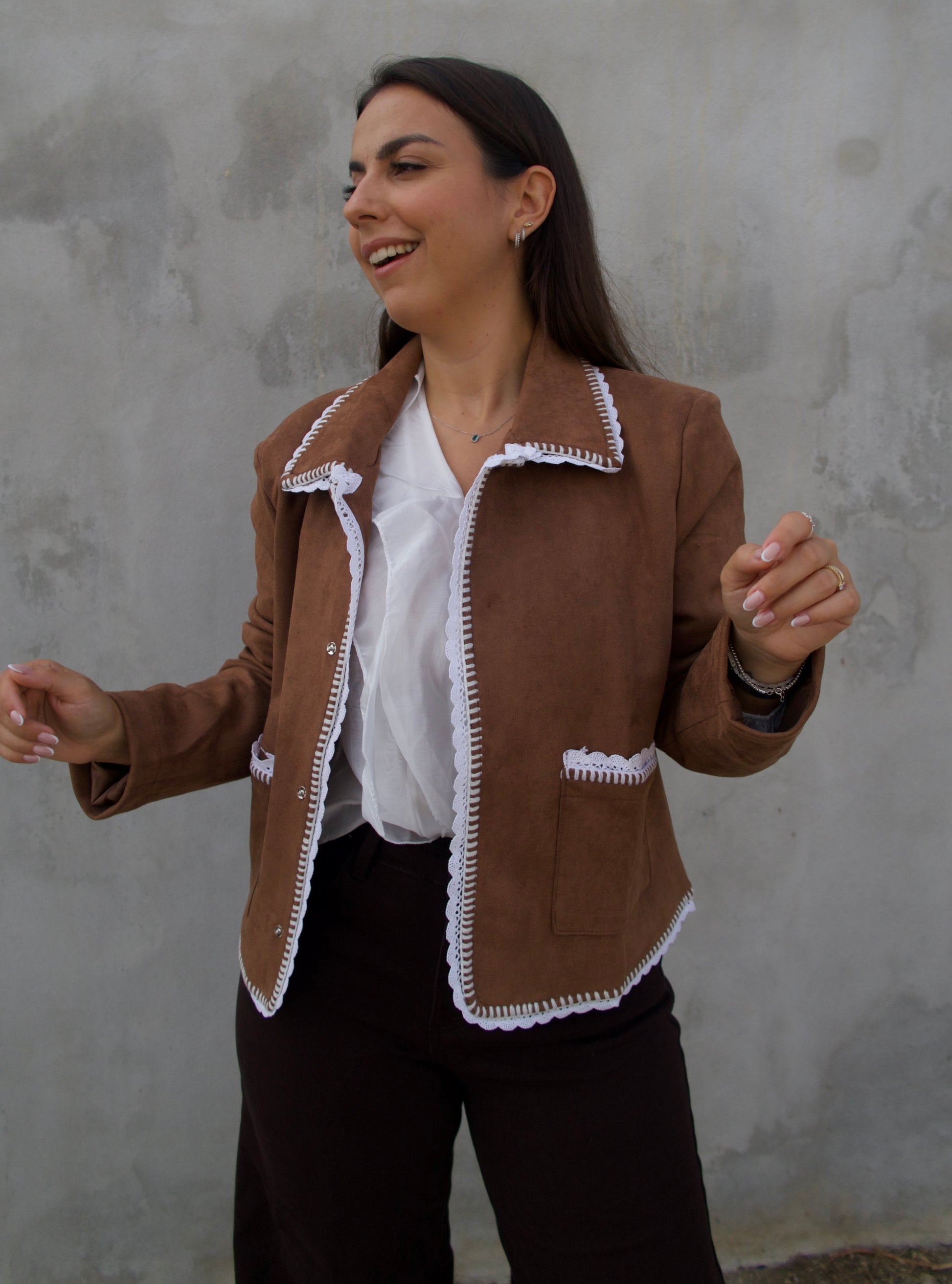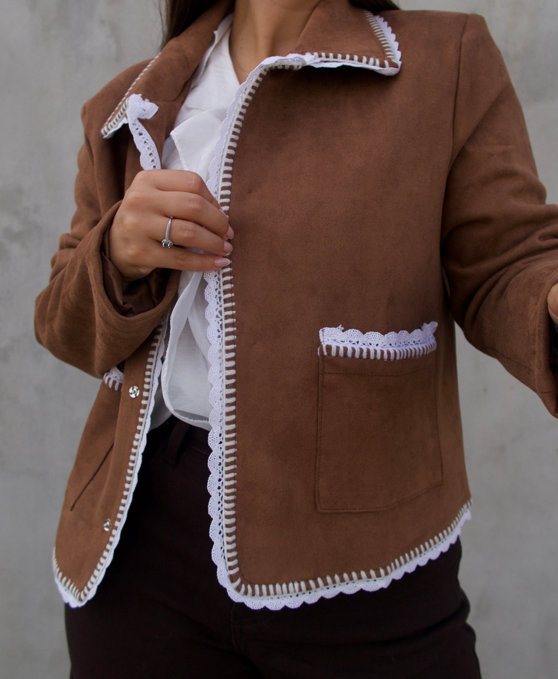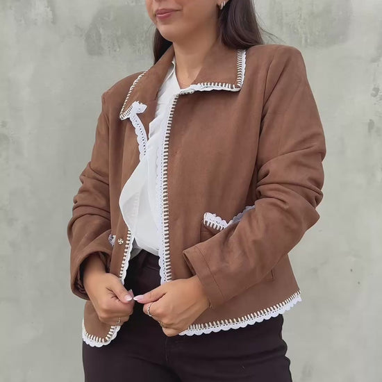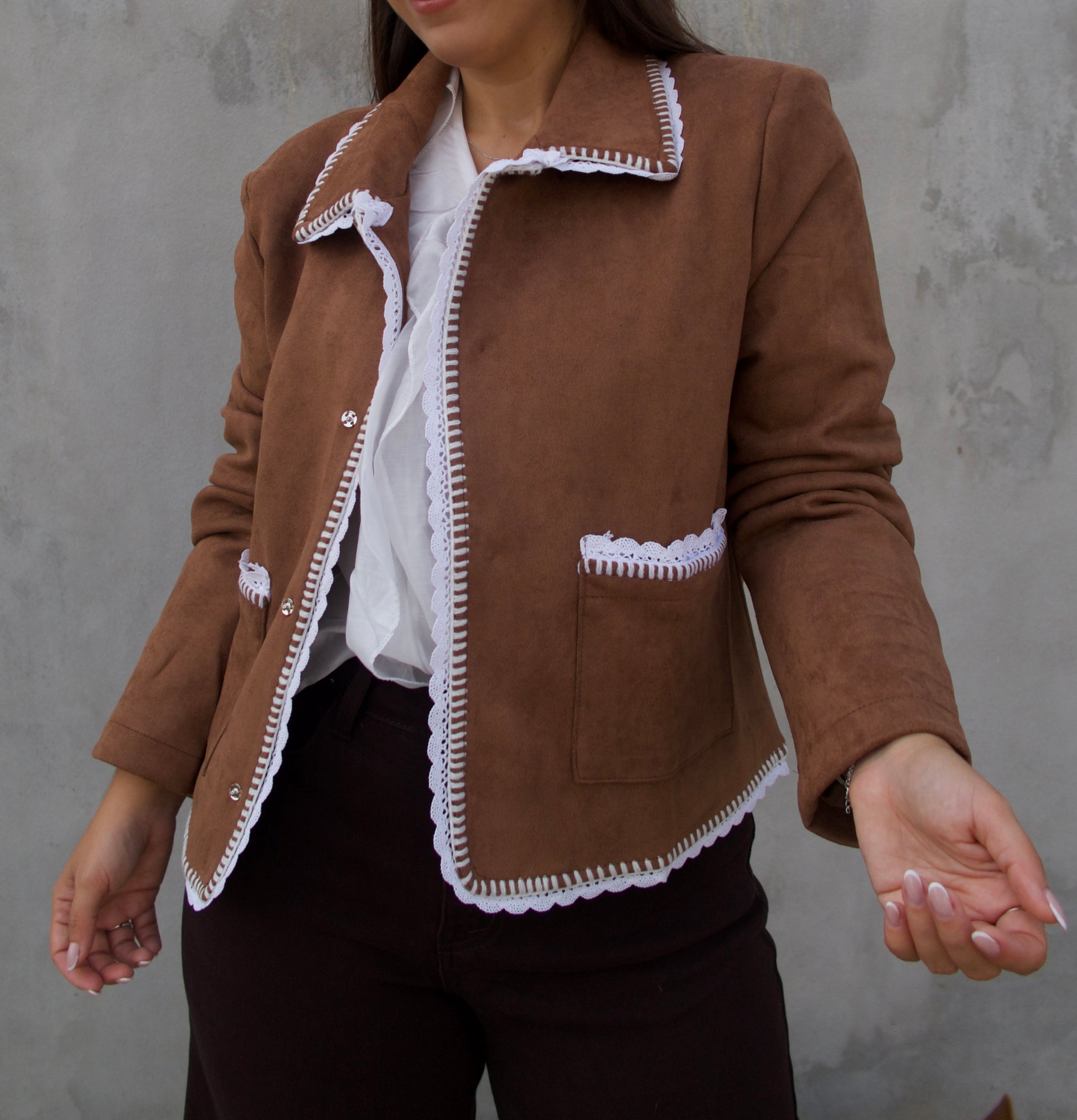 Casaco em camurça com acabamento em crochet branco em pequenos detalhes. Um modelo versátil e moderno que une estilo boho chic e conforto. Possui bolsos e botões de pressão. Ideal para compor looks casuais com um toque sofisticado.