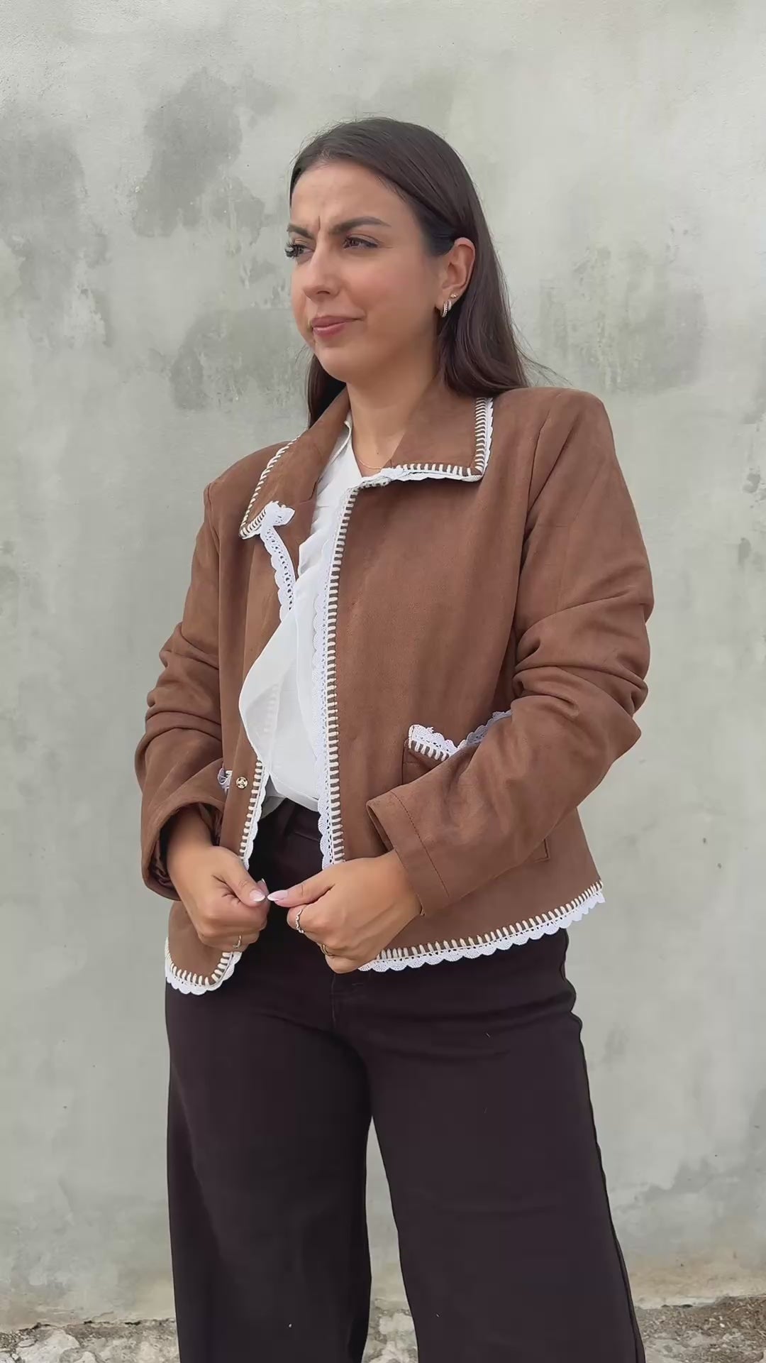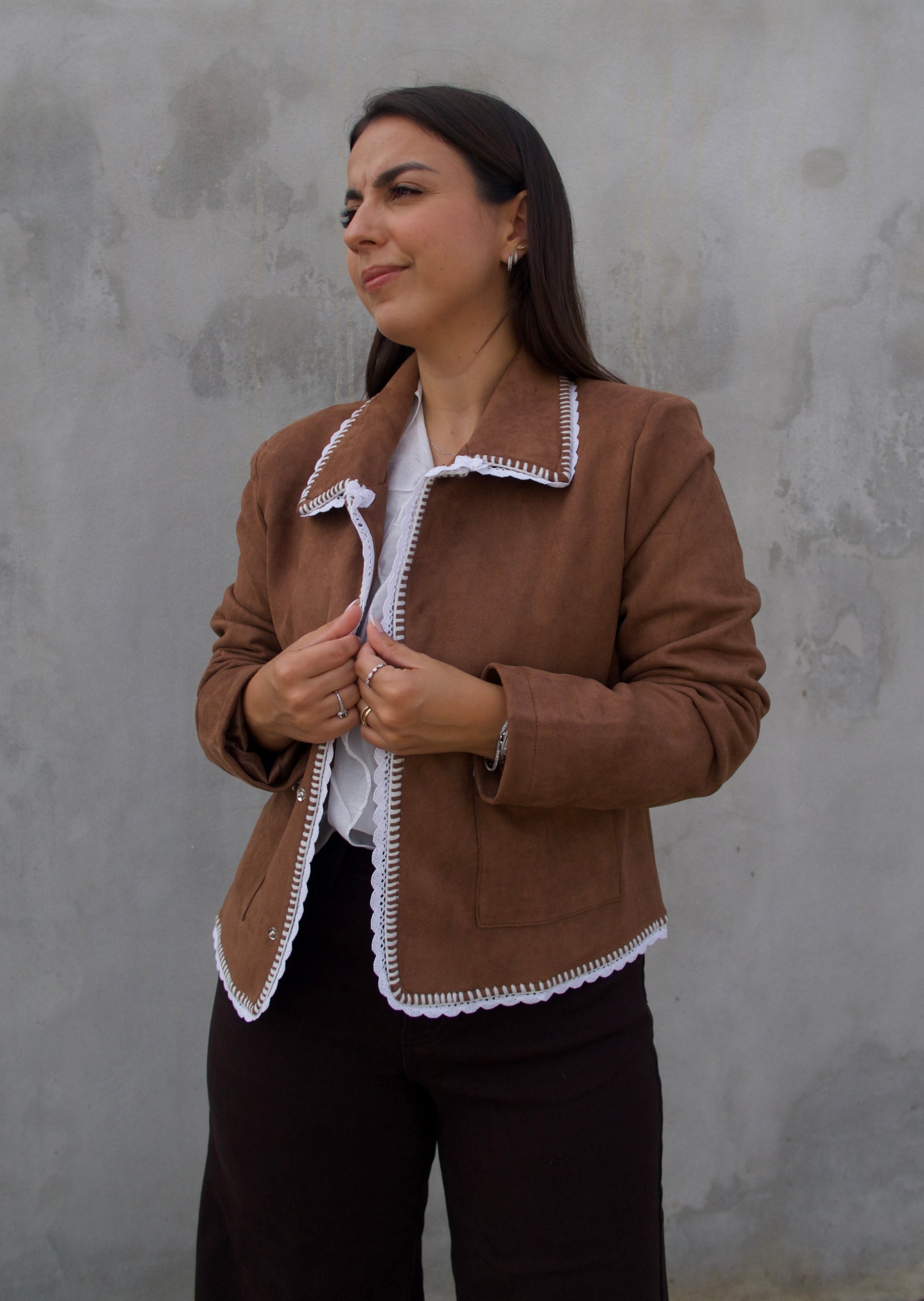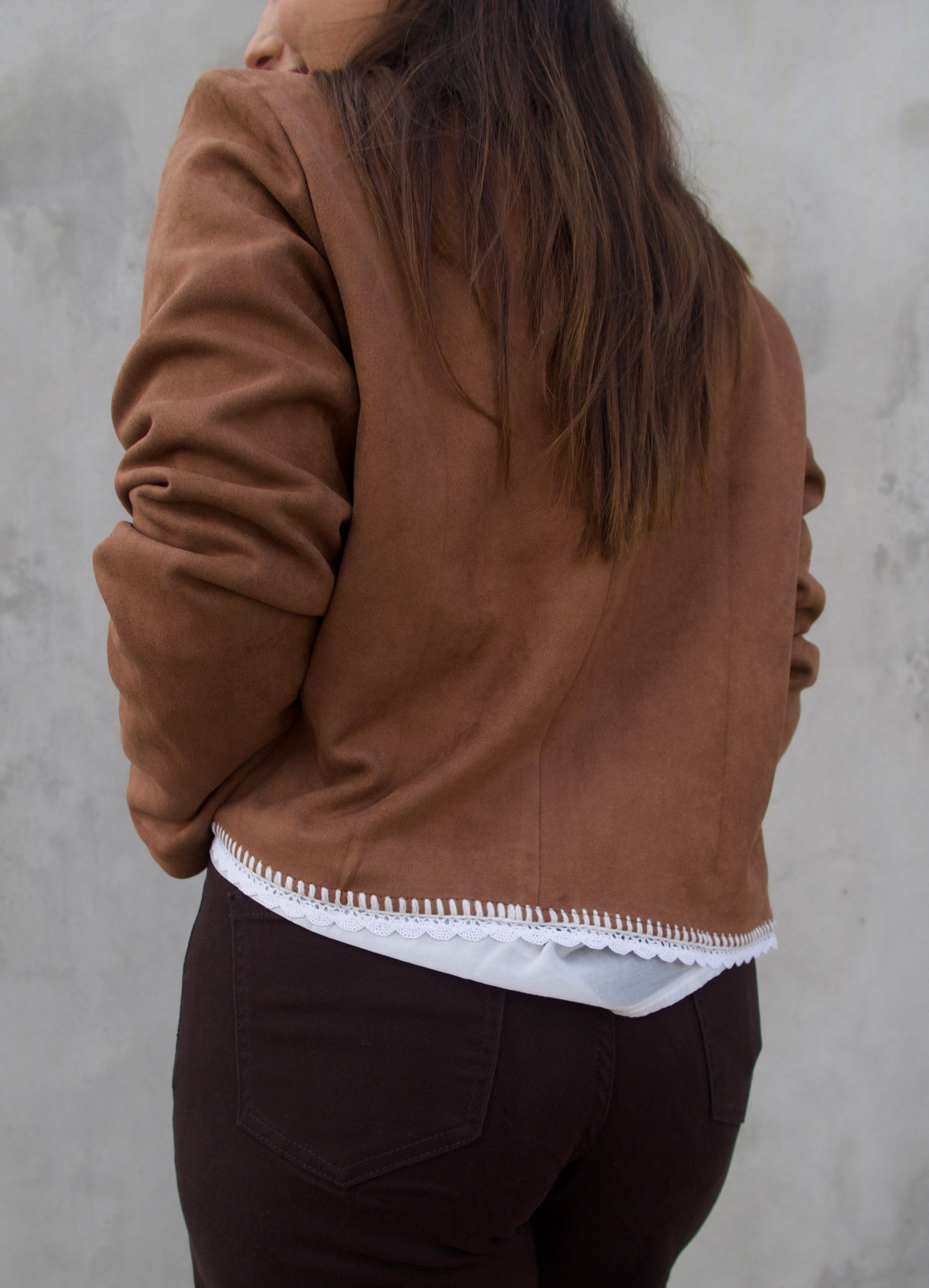 Casaco em camurça com acabamento em crochet branco em pequenos detalhes. Um modelo versátil e moderno que une estilo boho chic e conforto. Possui bolsos e botões de pressão. Ideal para compor looks casuais com um toque sofisticado.
