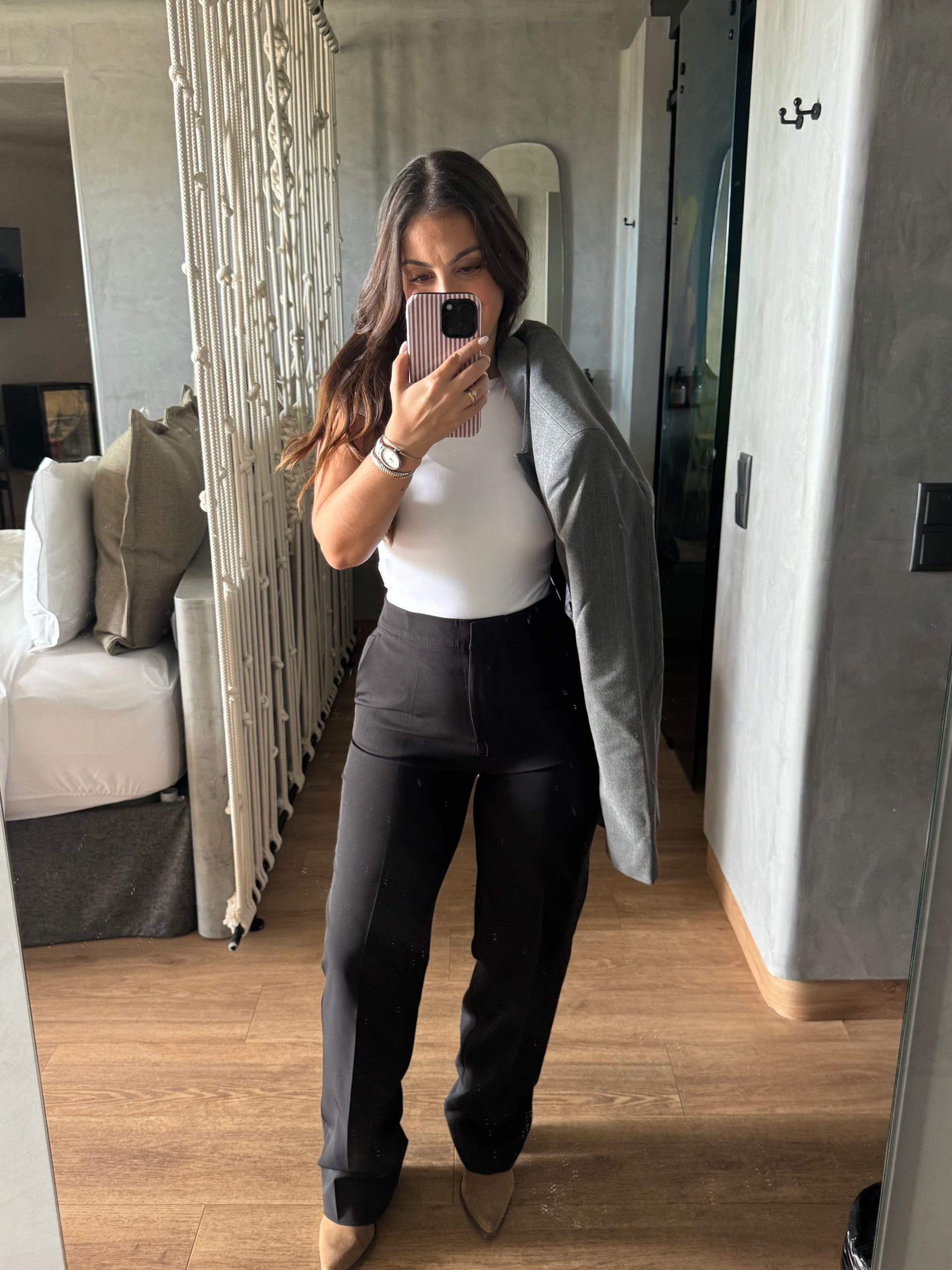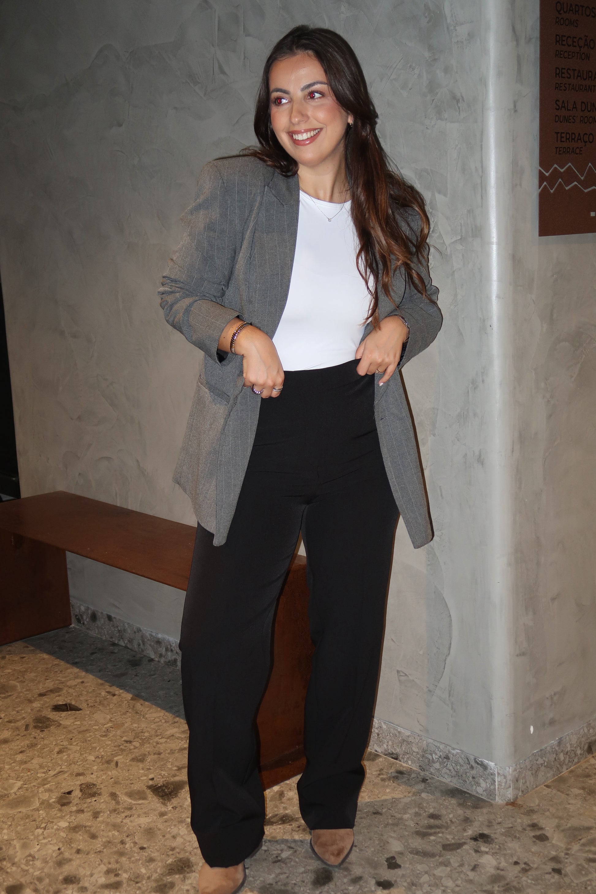 Estas calças de alfaiataria apresentam um corte reto e sofisticado, ideal para quem procura elegância com conforto. O design clean, com cintura subida e acabamento minimalista, cria uma silhueta alongada e moderna. Confeccionadas em tecido leve e estruturado, oferecem um excelente caimento e versatilidade, perfeitas tanto para looks profissionais quanto para composições casuais mais refinadas. Um essencial atemporal para qualquer guarda-roupa.
