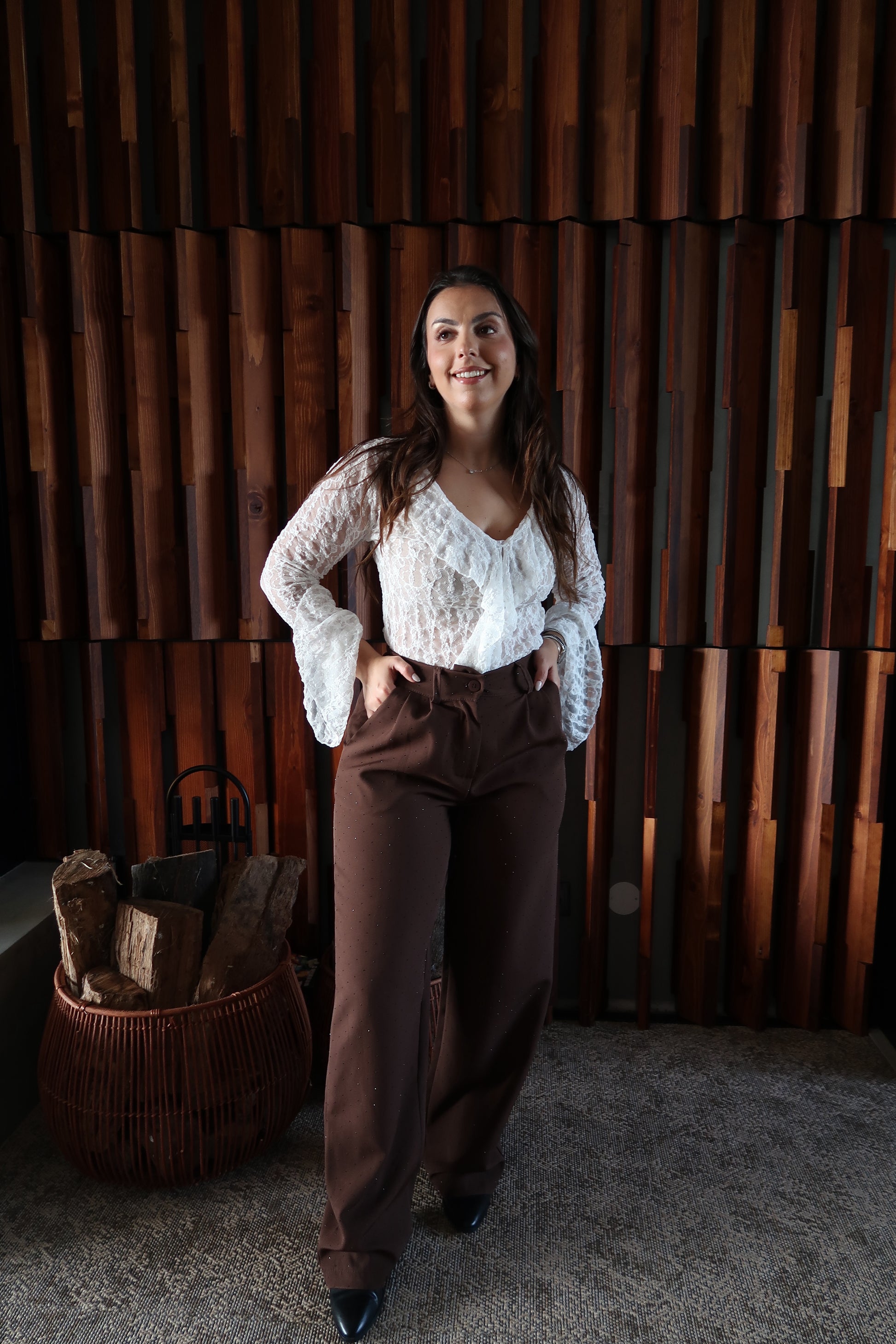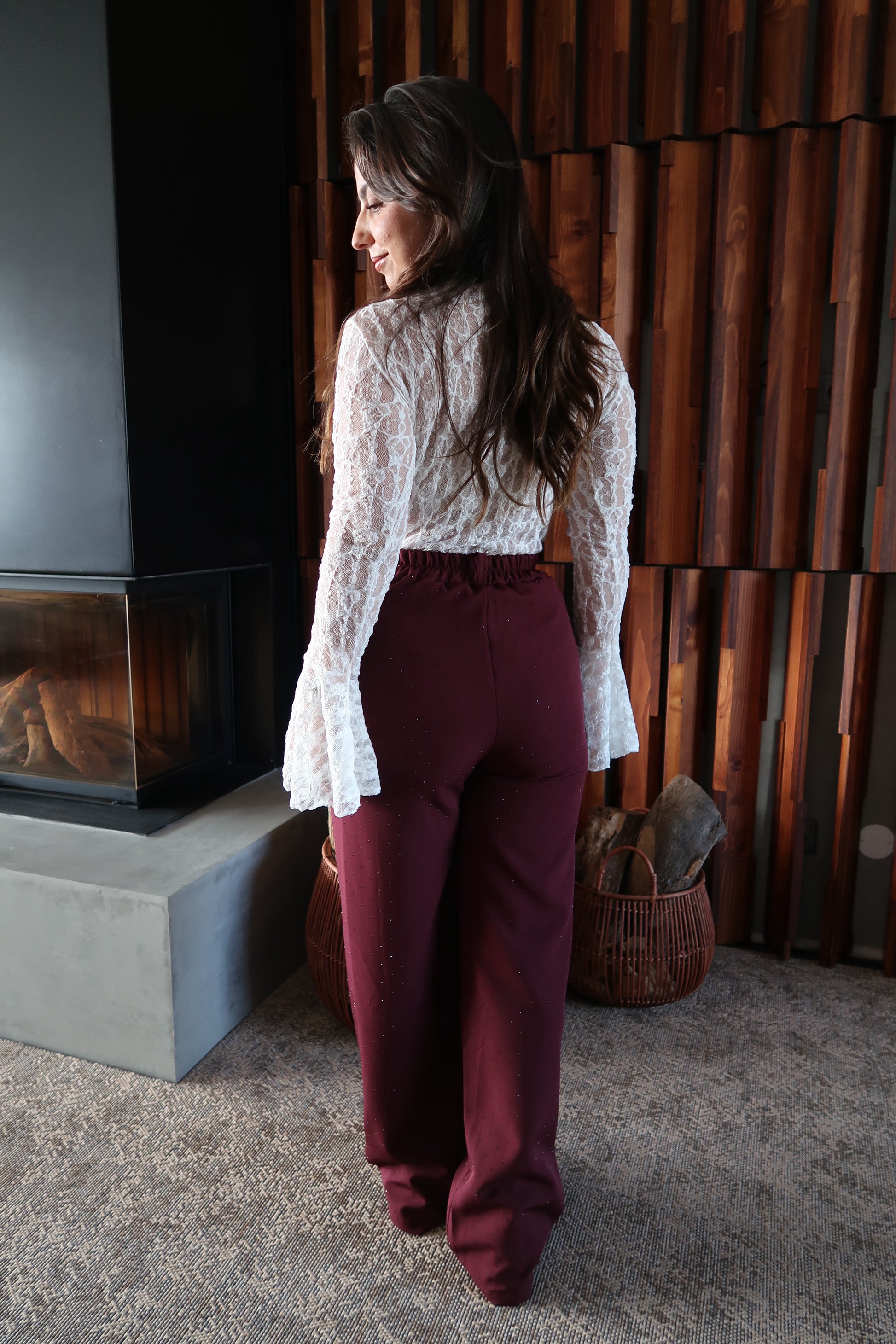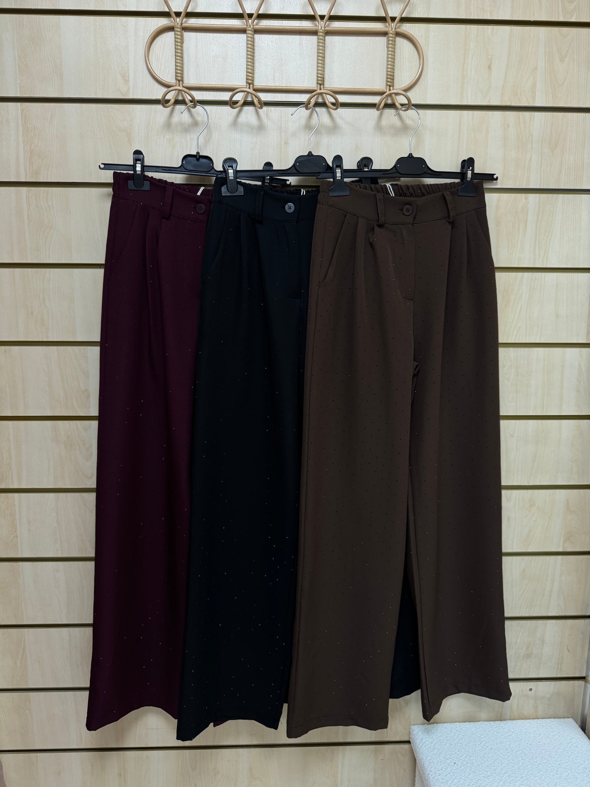Calças de corte elegante e sofisticado, com cintura subida que define a silhueta e alonga a perna. O elástico na cintura confere mais conforto e os brilhos trazem um ar luxuoso e intemporal, perfeito tanto para looks de festa como para combinações mais clássicas e refinadas.