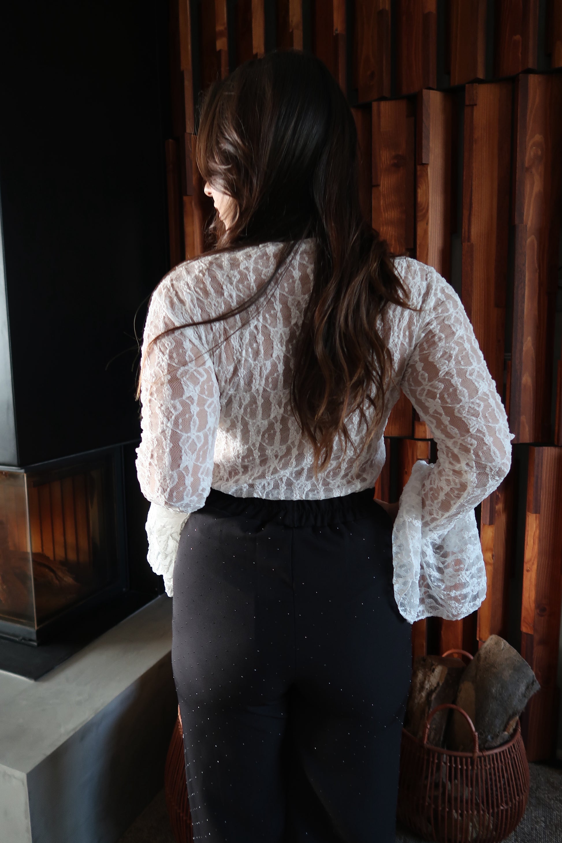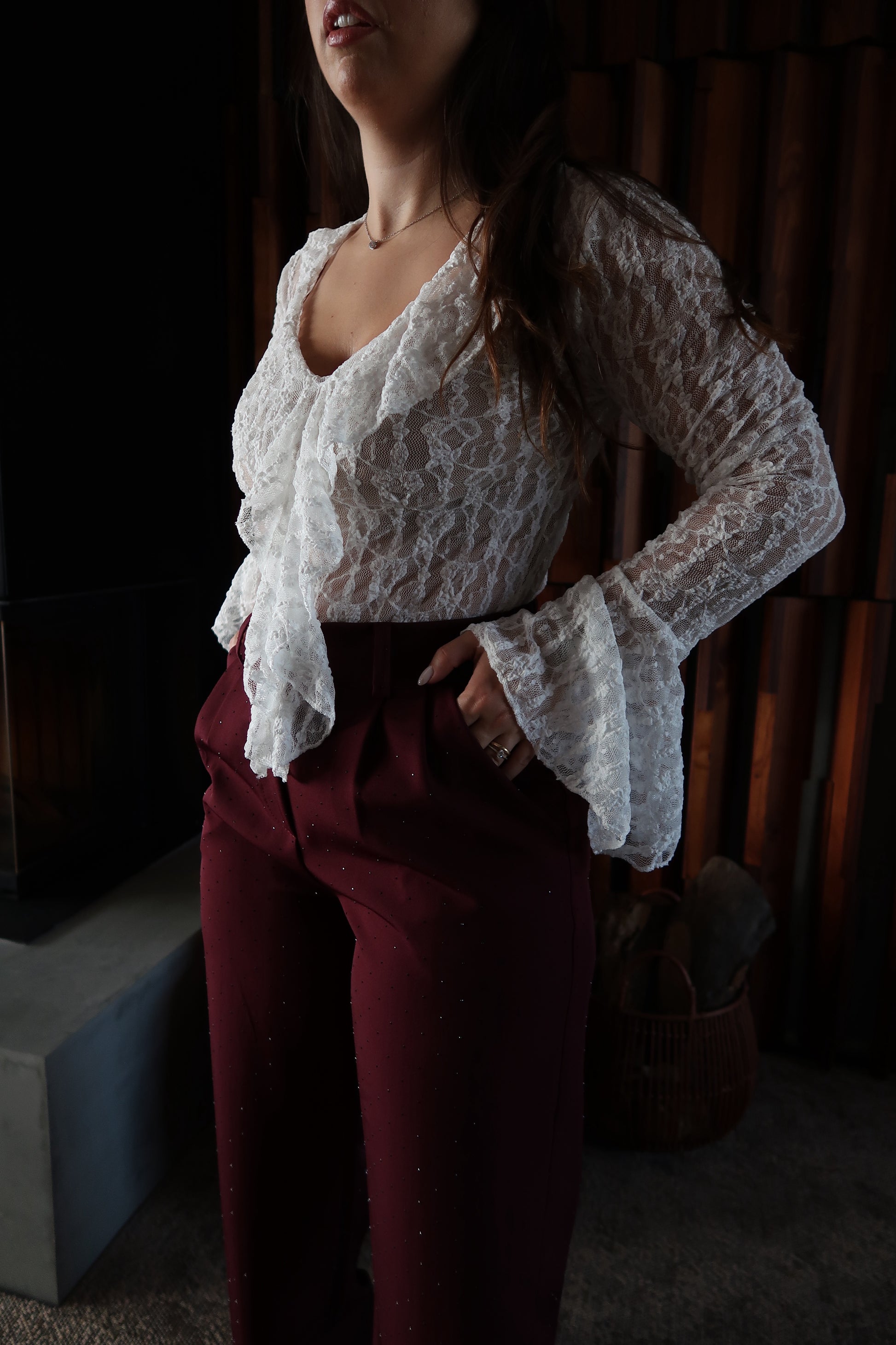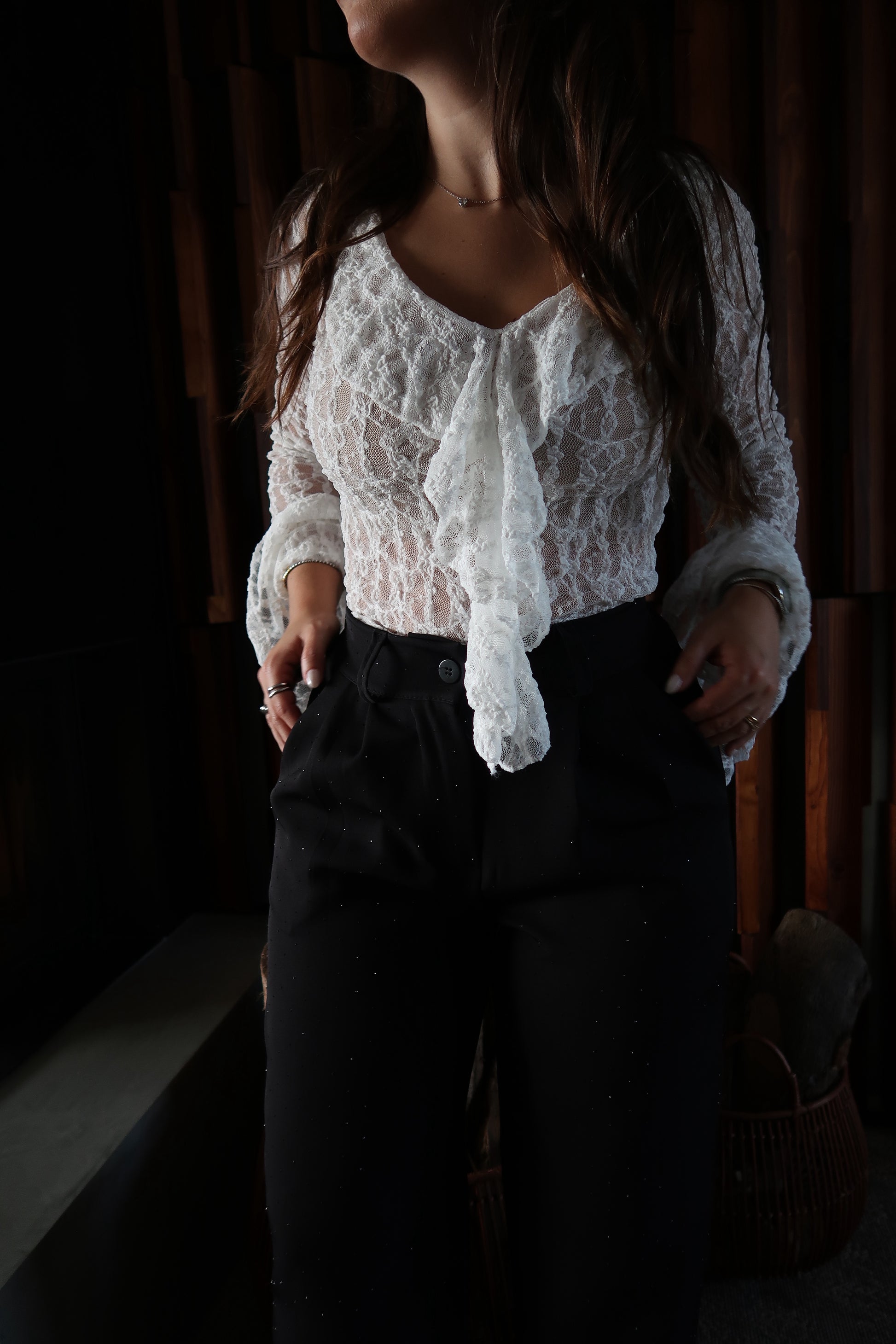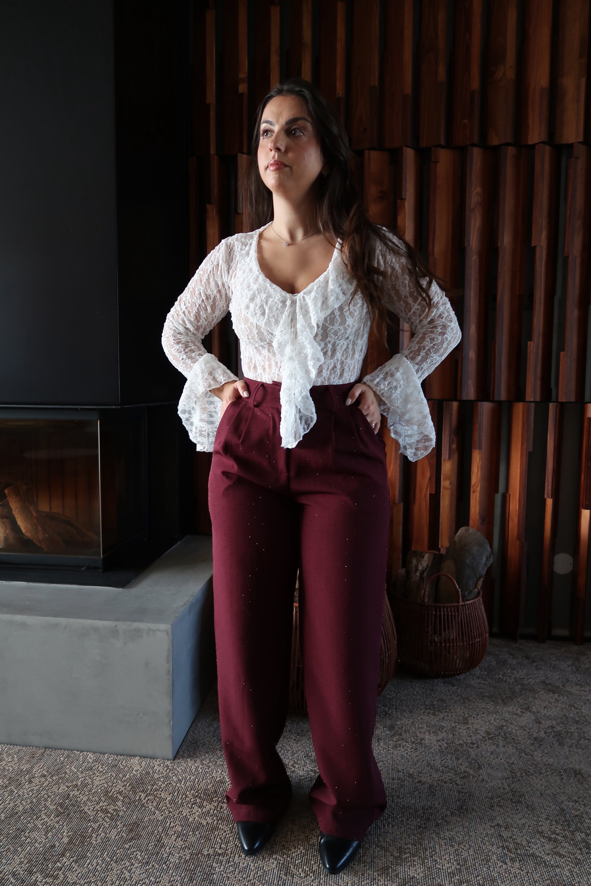 Calças de corte elegante e sofisticado, com cintura subida que define a silhueta e alonga a perna. O elástico na cintura confere mais conforto e os brilhos trazem um ar luxuoso e intemporal, perfeito tanto para looks de festa como para combinações mais clássicas e refinadas.