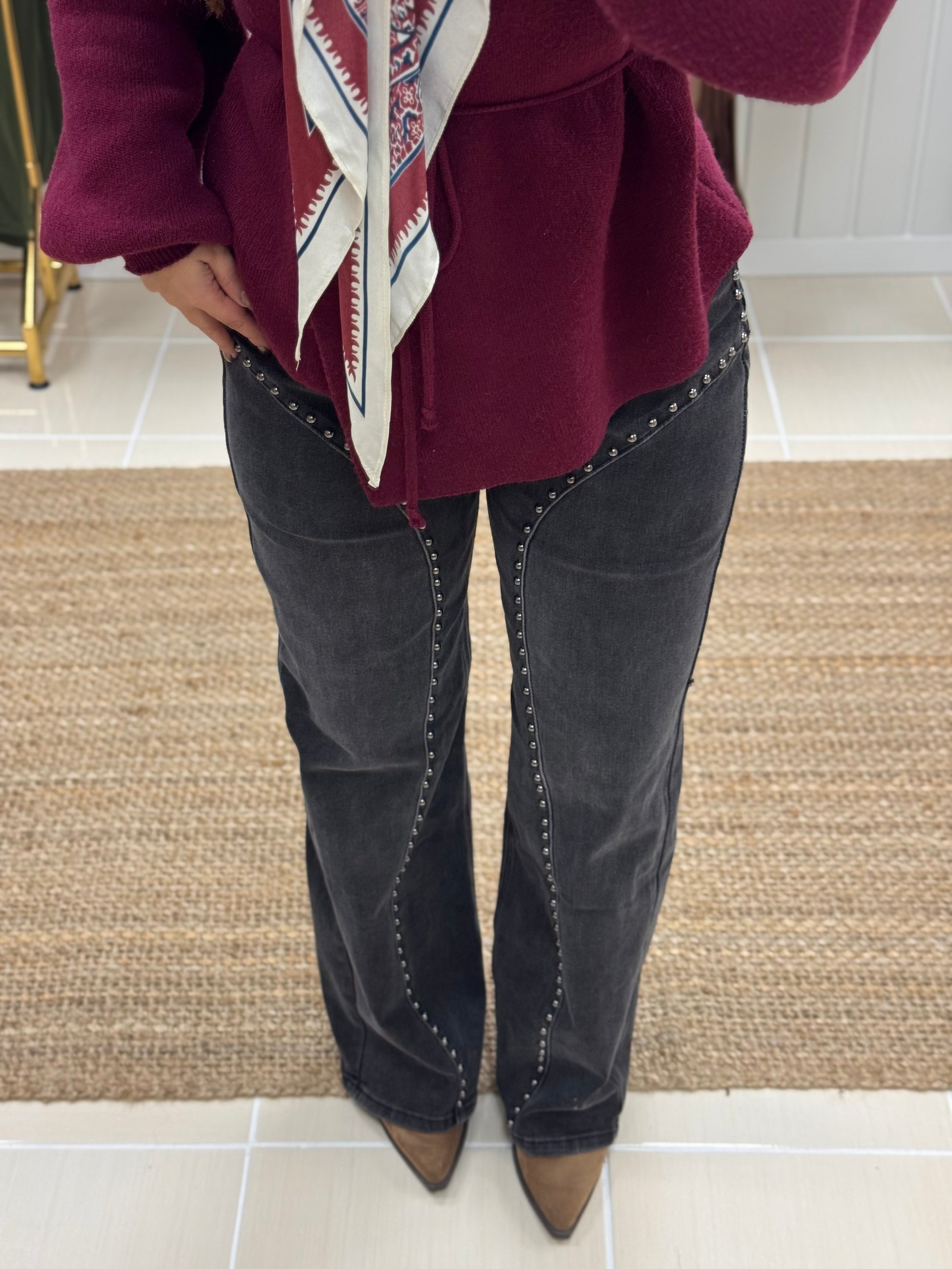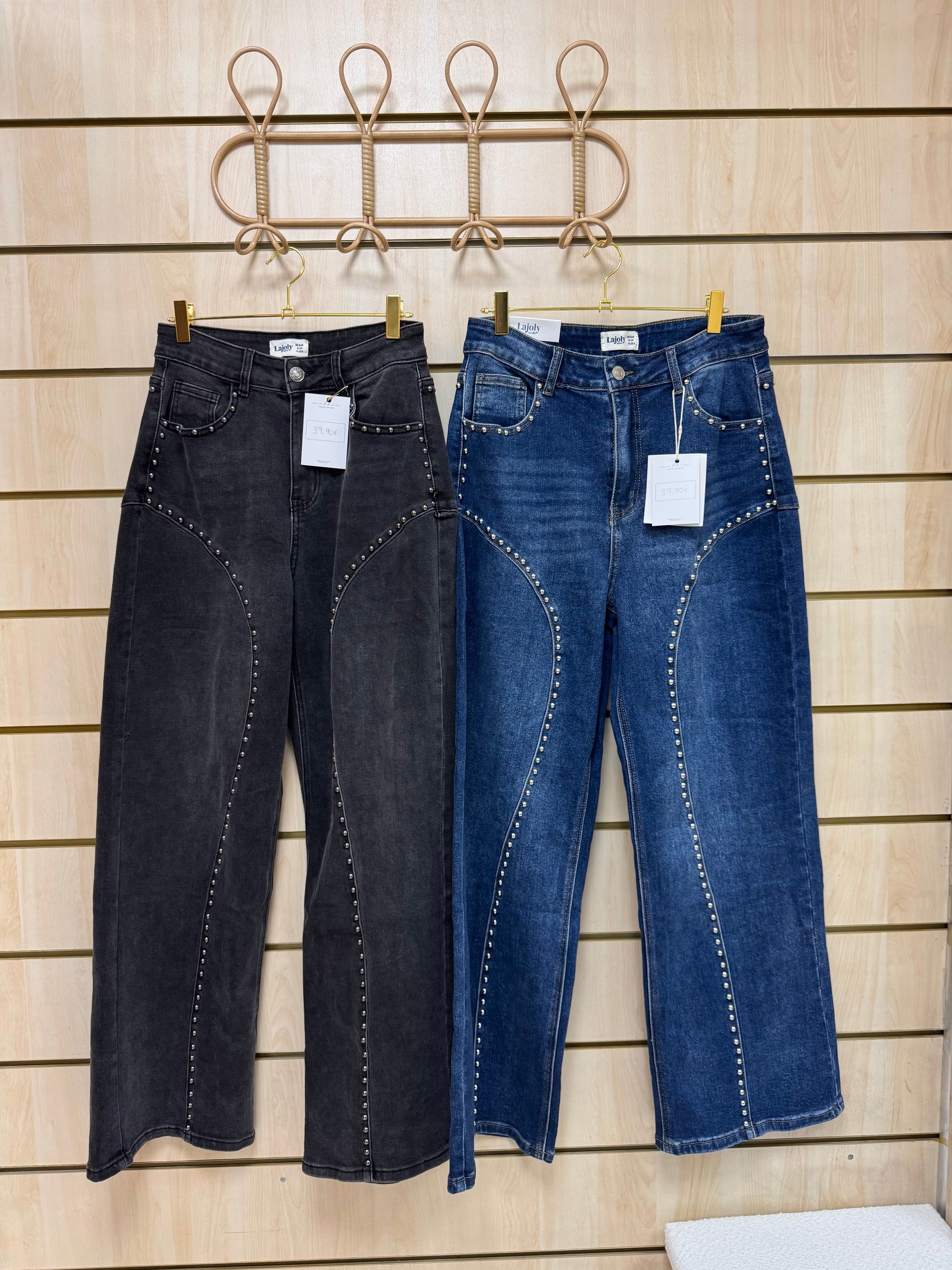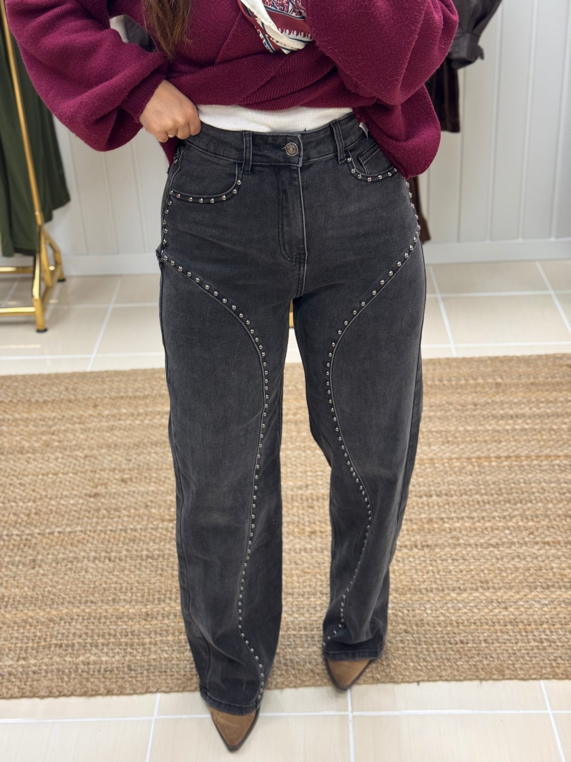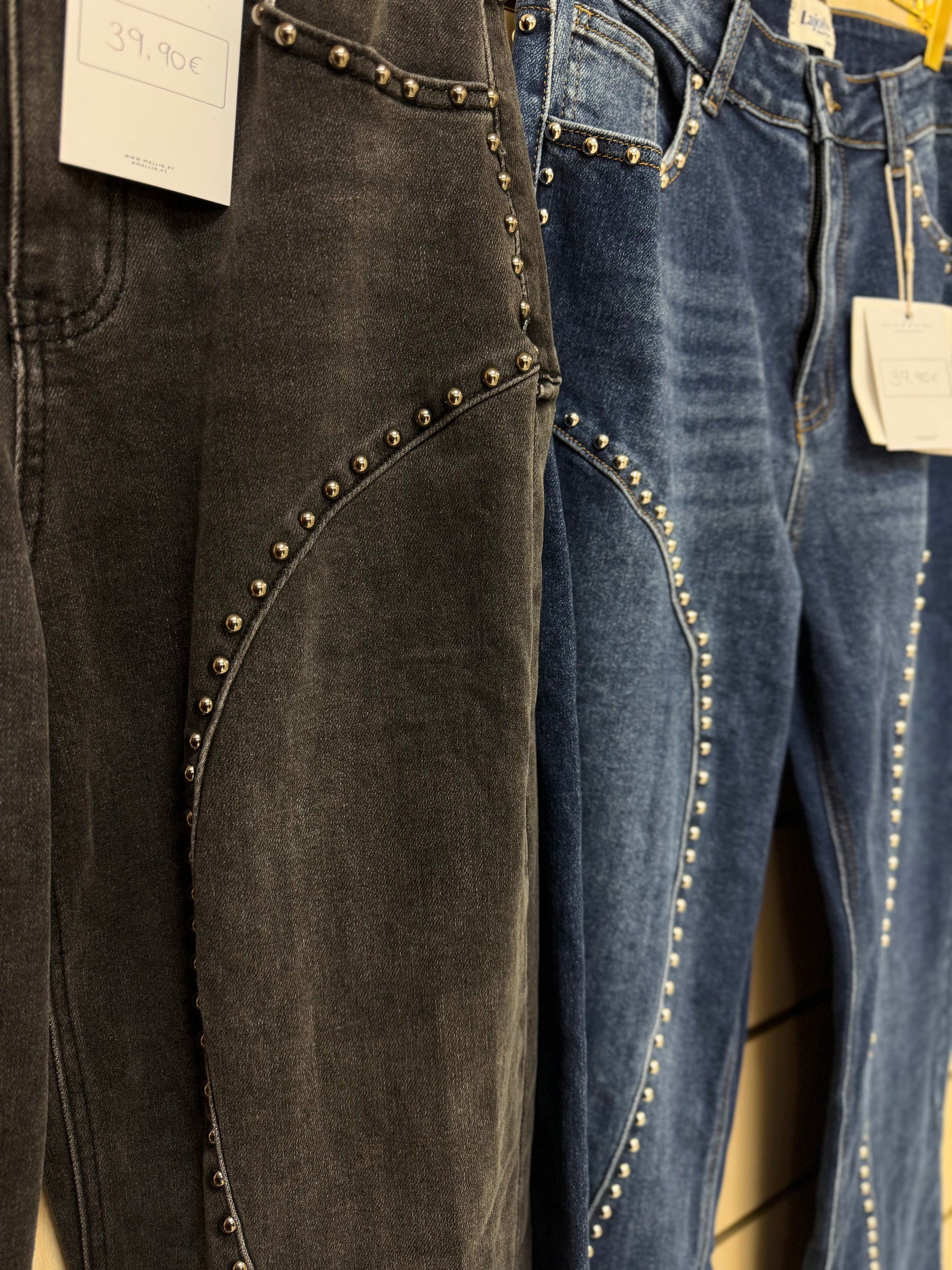 Calças de ganga com tachas decorativas, de cintura subida e lavagem escura. O design destaca-se pelas linhas curvas com aplicações metálicas ao longo da perna, criando um efeito moderno e sofisticado com inspiração western. Corte direito e confortável, ideal para alongar a silhueta e dar um toque irreverente a qualquer look. Perfeitas para conjugar com malhas, camisas ou botas para um visual urbano e cheio de personalidade.