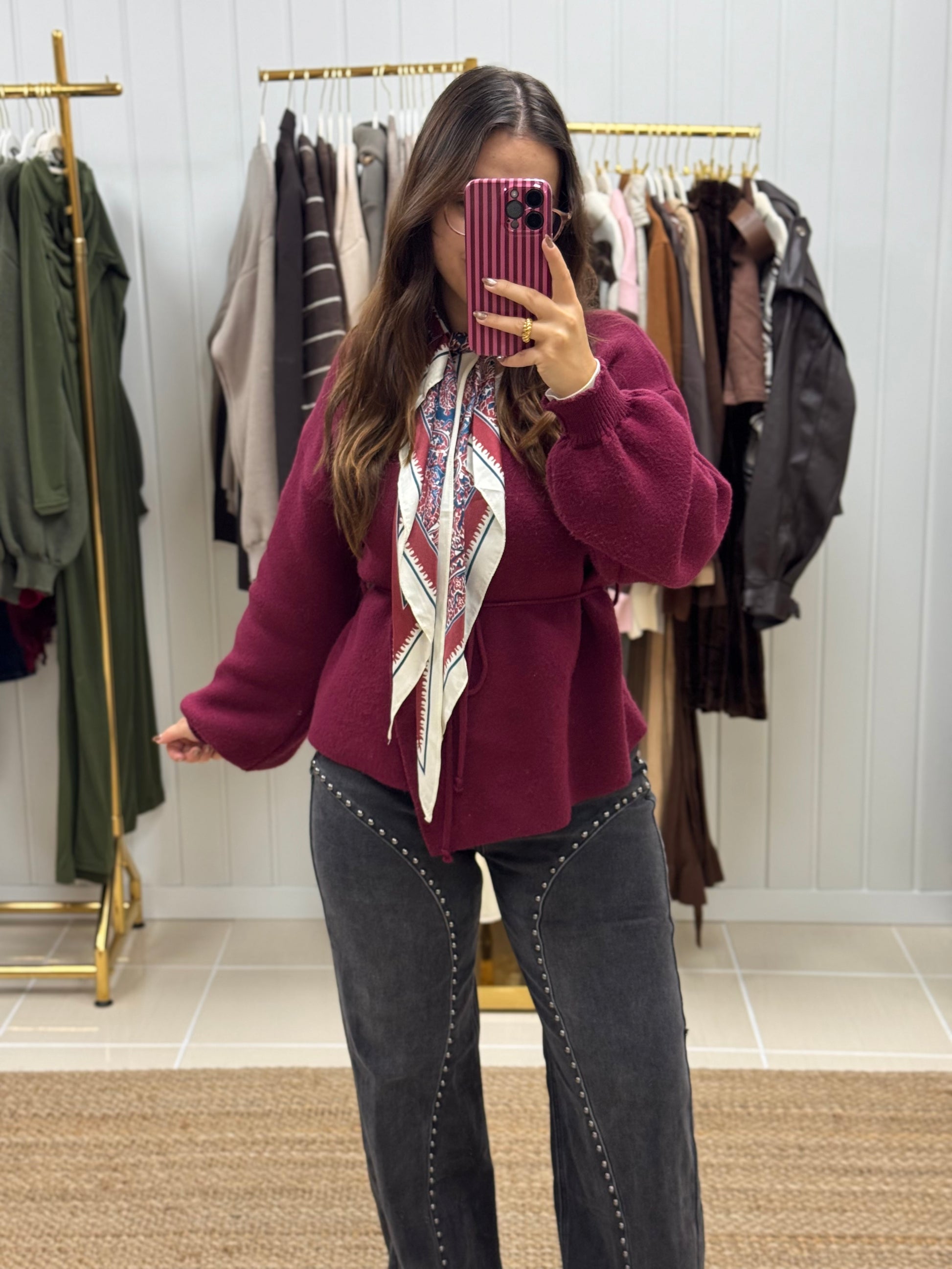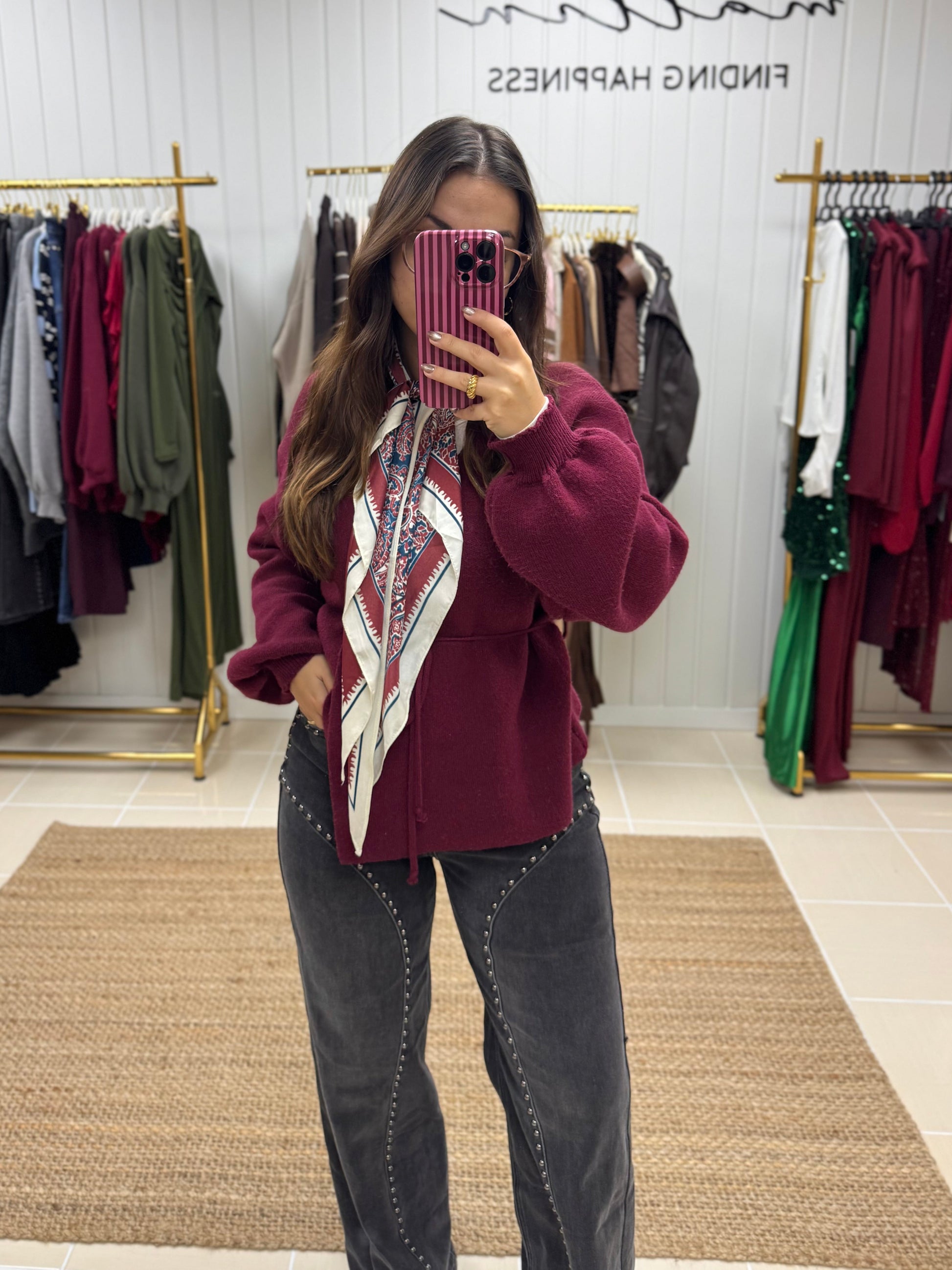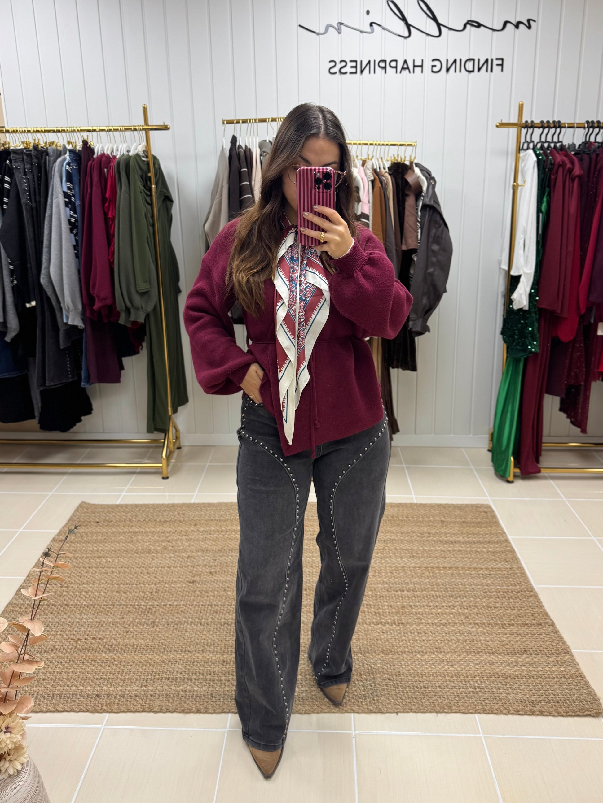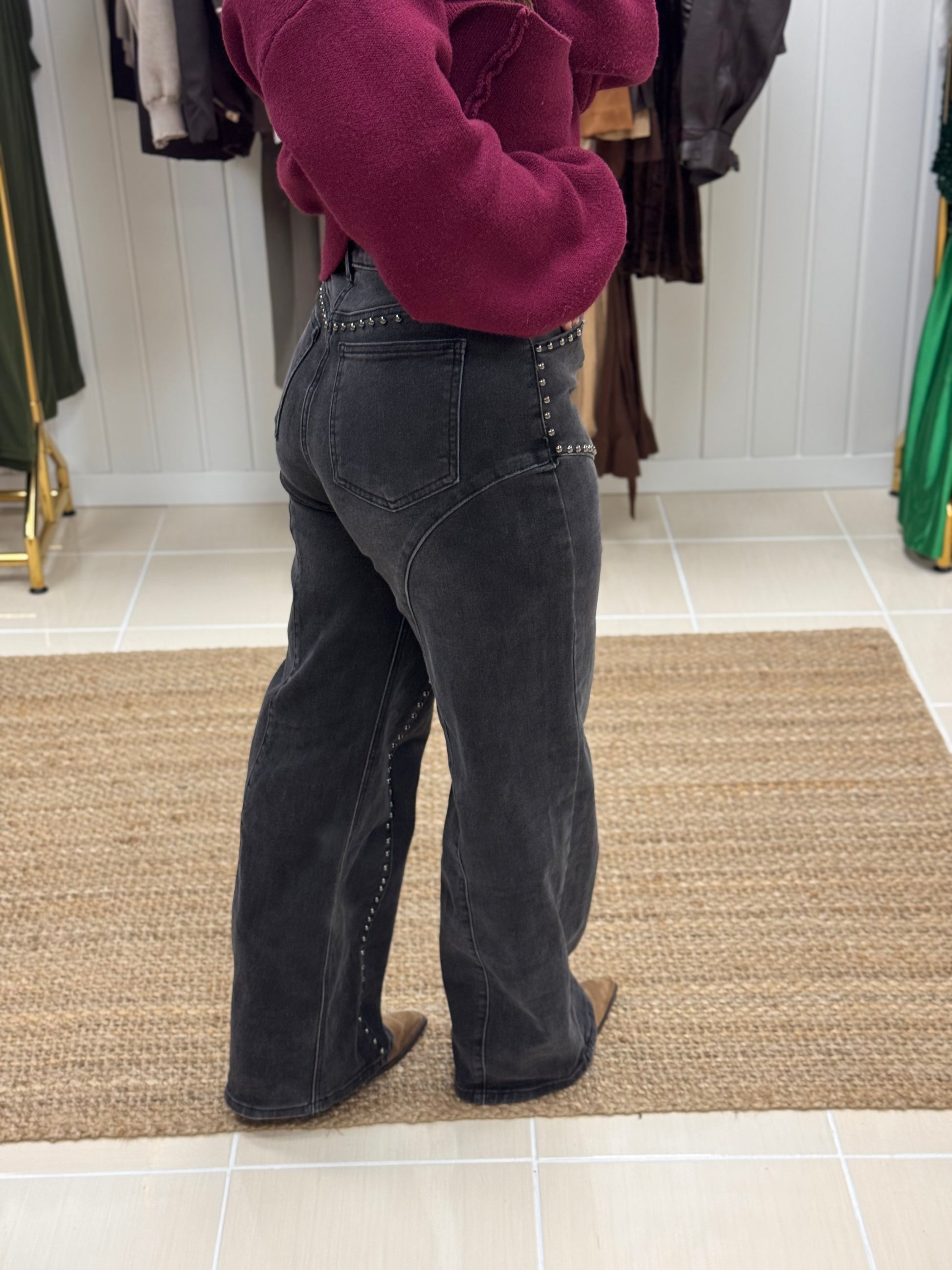 Calças de ganga com tachas decorativas, de cintura subida e lavagem escura. O design destaca-se pelas linhas curvas com aplicações metálicas ao longo da perna, criando um efeito moderno e sofisticado com inspiração western. Corte direito e confortável, ideal para alongar a silhueta e dar um toque irreverente a qualquer look. Perfeitas para conjugar com malhas, camisas ou botas para um visual urbano e cheio de personalidade.
