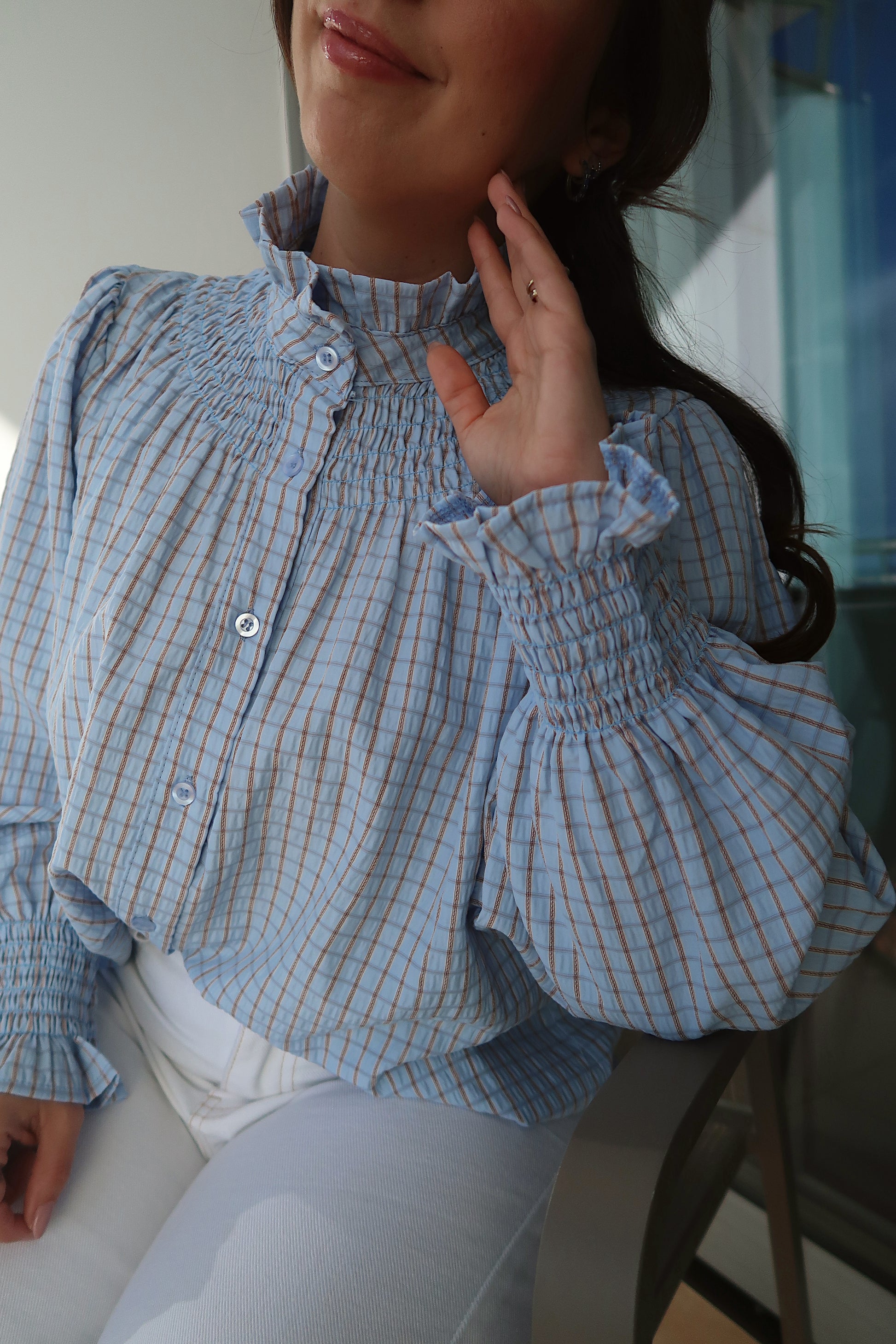 Esta camisa combina elegância e conforto num design feminino e versátil. Confeccionada em tecido leve com padrão xadrez subtil, destaca-se pelas mangas compridas com efeito franzido e punhos elásticos, que acrescentam volume e um toque romântico à peça. O decote em V com colarinho clássico e o fecho frontal com botões conferem-lhe um visual intemporal, perfeito para transitar entre looks casuais e mais sofisticados. O corte fluido adapta-se facilmente à silhueta, garantindo conforto ao longo do dia.
