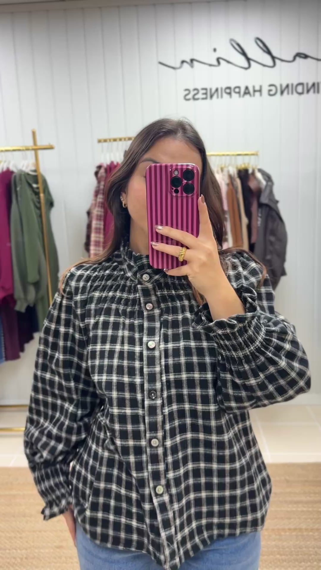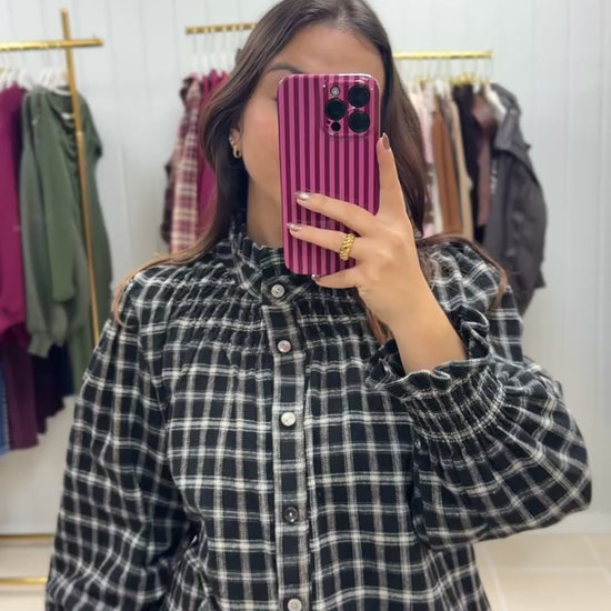 Camisa em padrão xadrez preto e cru, intemporal e fácil de conjugar. O detalhe de franzido na gola subida e nos punhos confere um toque feminino e sofisticado, enquanto o corte confortável garante um cair fluído e elegante.