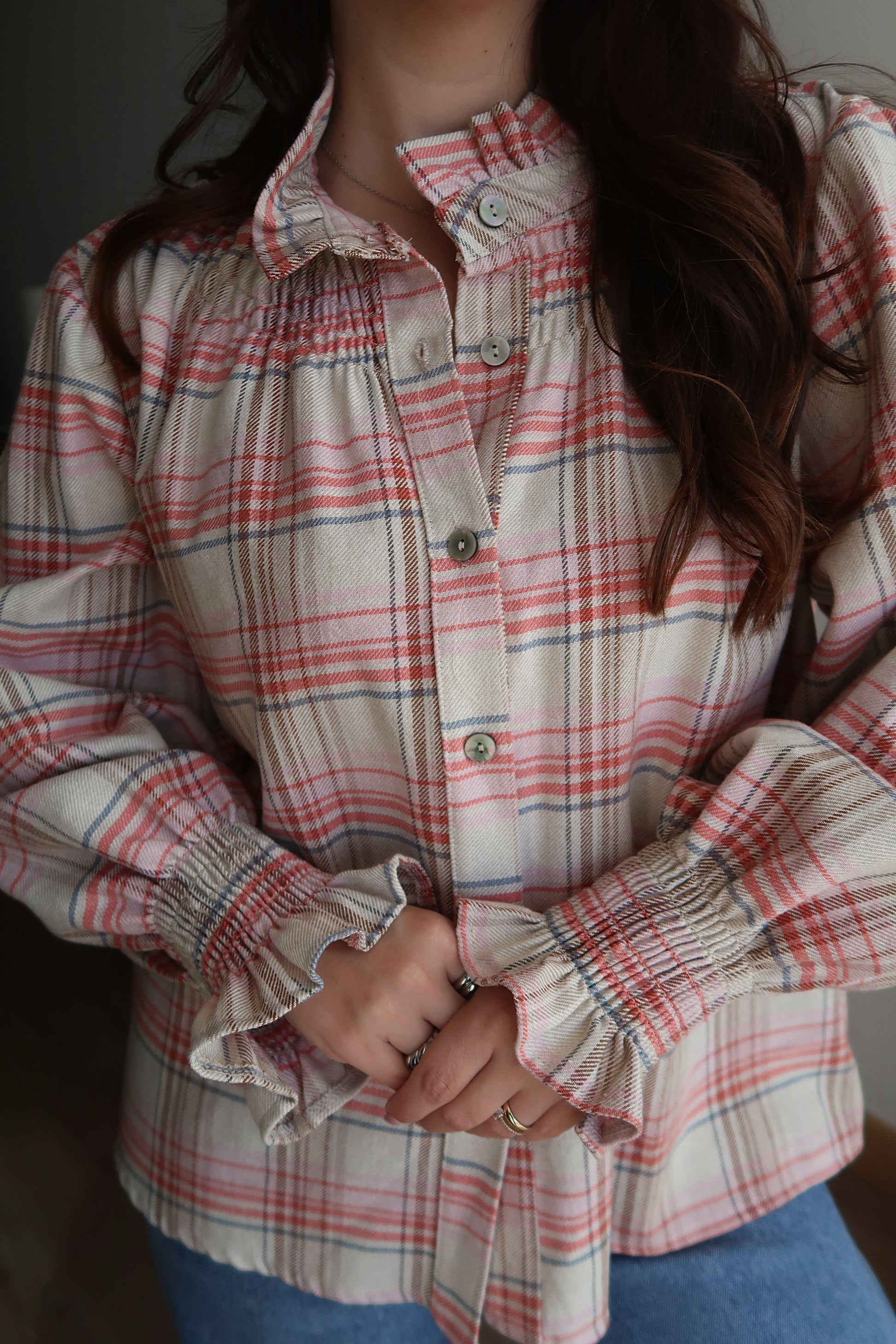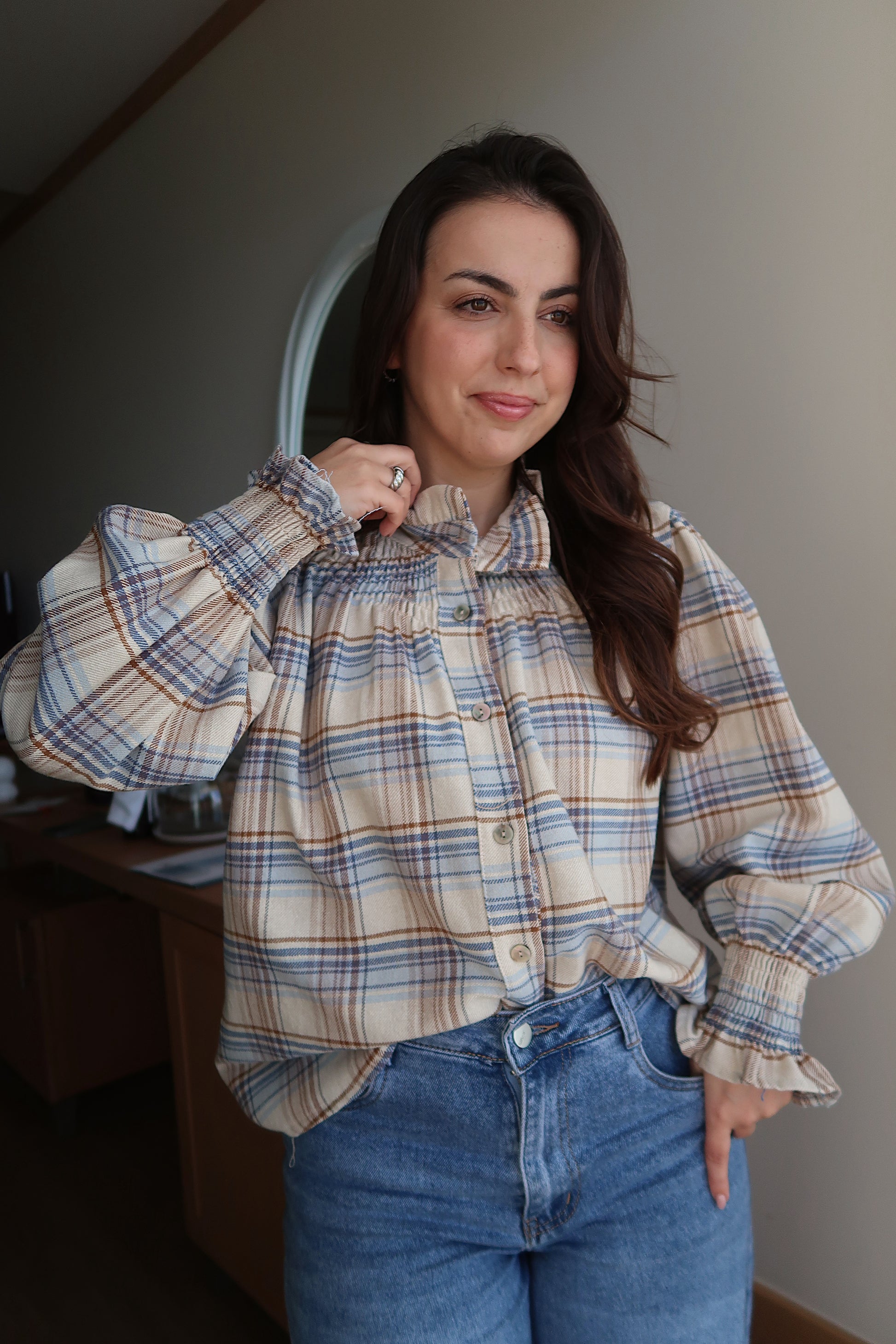 Camisa de padrão xadrez em tons neutros, perfeita para um look casual com um toque sofisticado. Apresenta um corte fluido que garante liberdade de movimentos e um caimento descontraído. Destaca-se pelas mangas compridas com punhos elásticos, que acrescentam volume e um detalhe feminino ao design. O colarinho clássico e o fecho frontal com botões tornam esta peça versátil, ideal para usar tanto aberta como fechada.