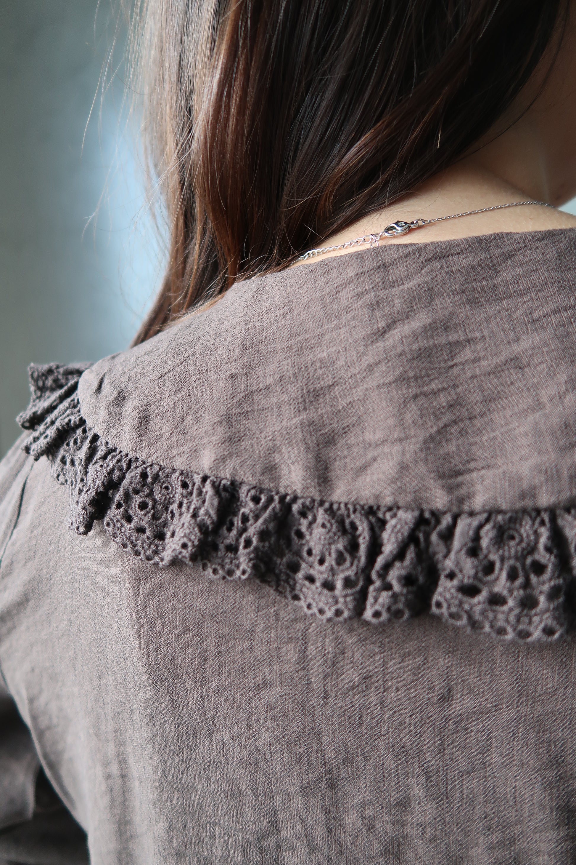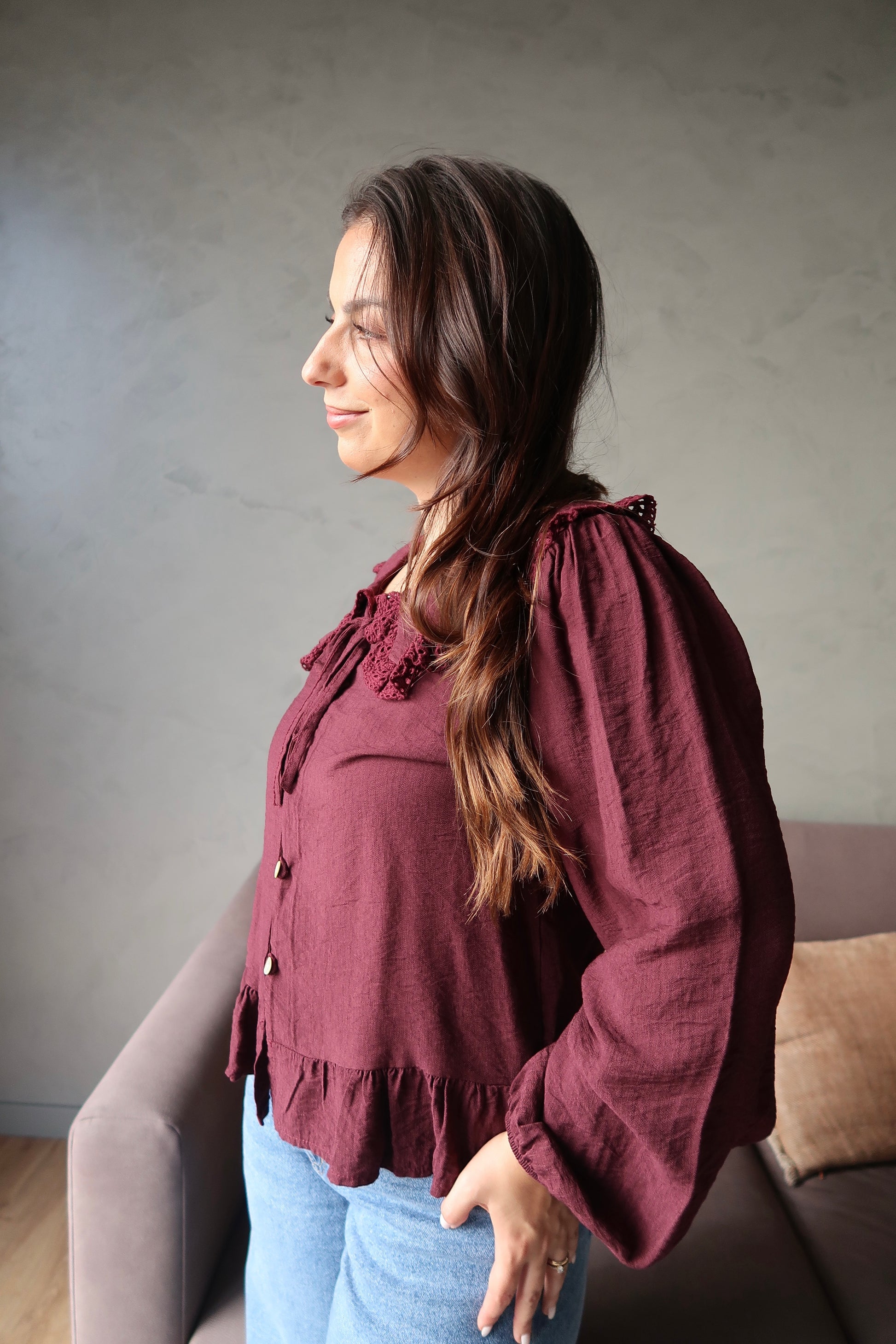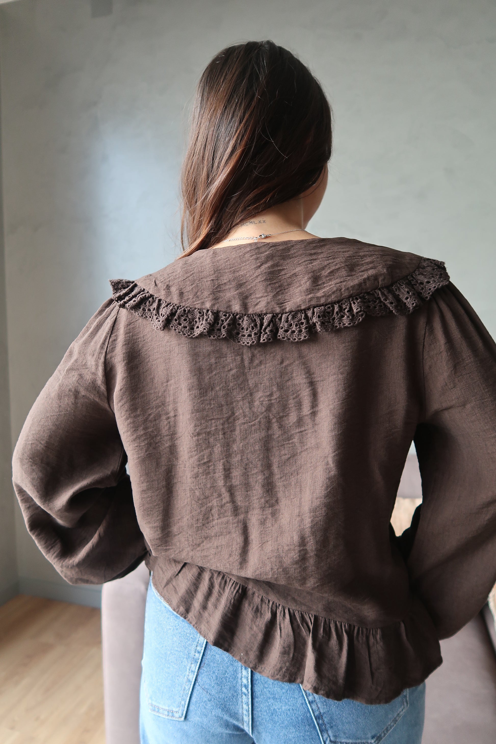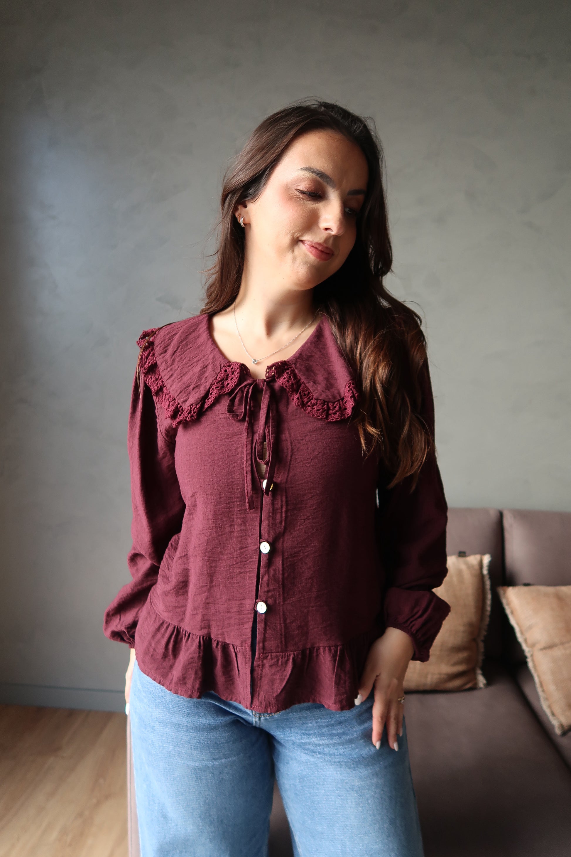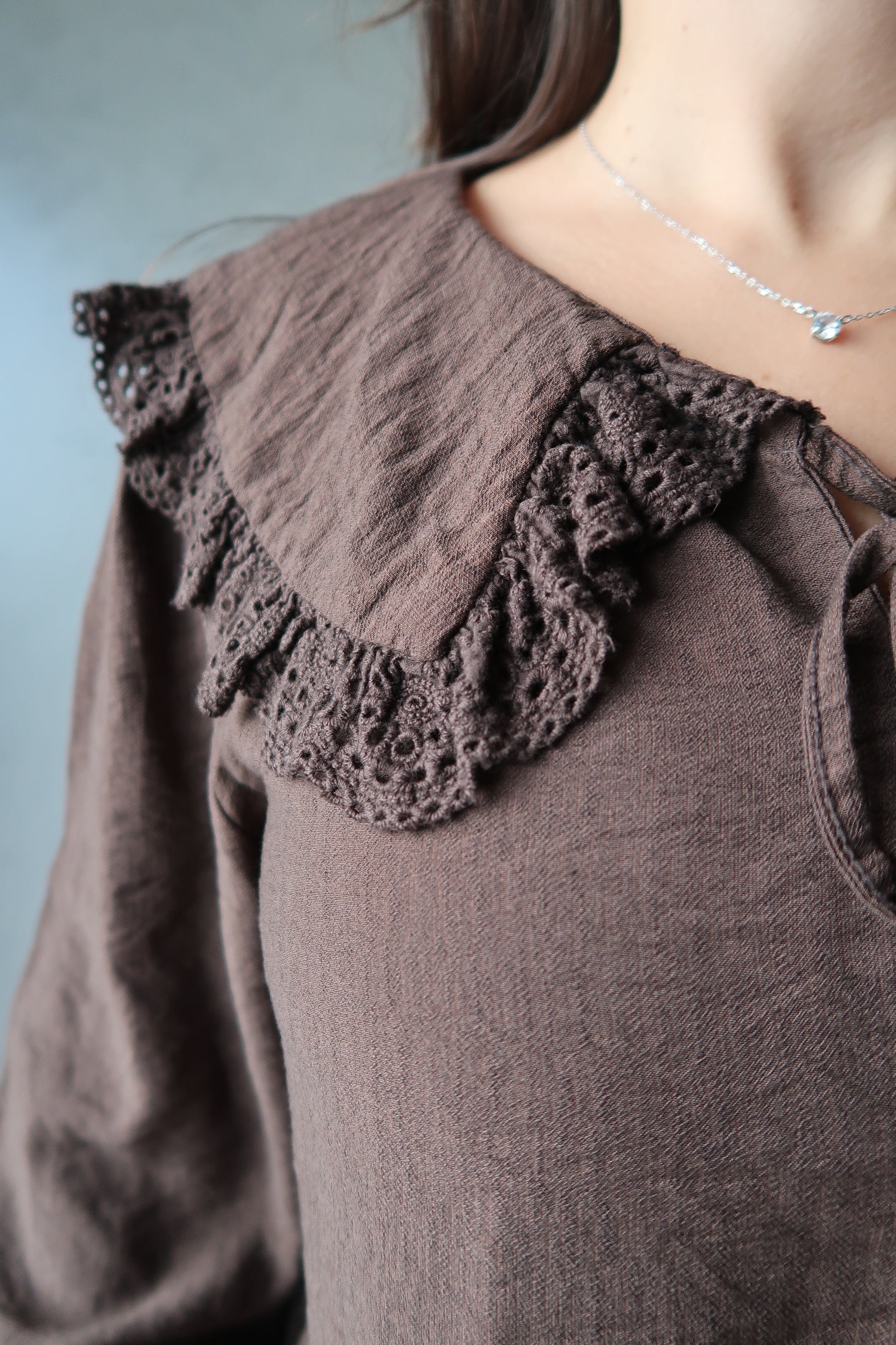 Elegante e feminina, esta camisa destaca-se pela gola ampla em renda delicada, que acrescenta um toque romântico ao look. Confeccionada em tecido leve e texturado, oferece conforto e um caimento descontraído. Possui botões frontais, laço decorativo no decote e acabamento franzido no final para um visual ainda mais especial.