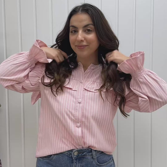 Delicada e cheia de charme, esta camisa em tons pastéis às riscas brancas é a peça perfeita para um look feminino e elegante no dia a dia. Com folhos marcados na zona dos ombros e peito, acrescenta um toque romântico sem perder a sofisticação. O corte é fluido e confortável, com manga comprida e punho elástico franzido que cria um efeito subtilmente abalonado. Aperta à frente com botões forrados no mesmo tecido, para um acabamento cuidado e harmonioso.