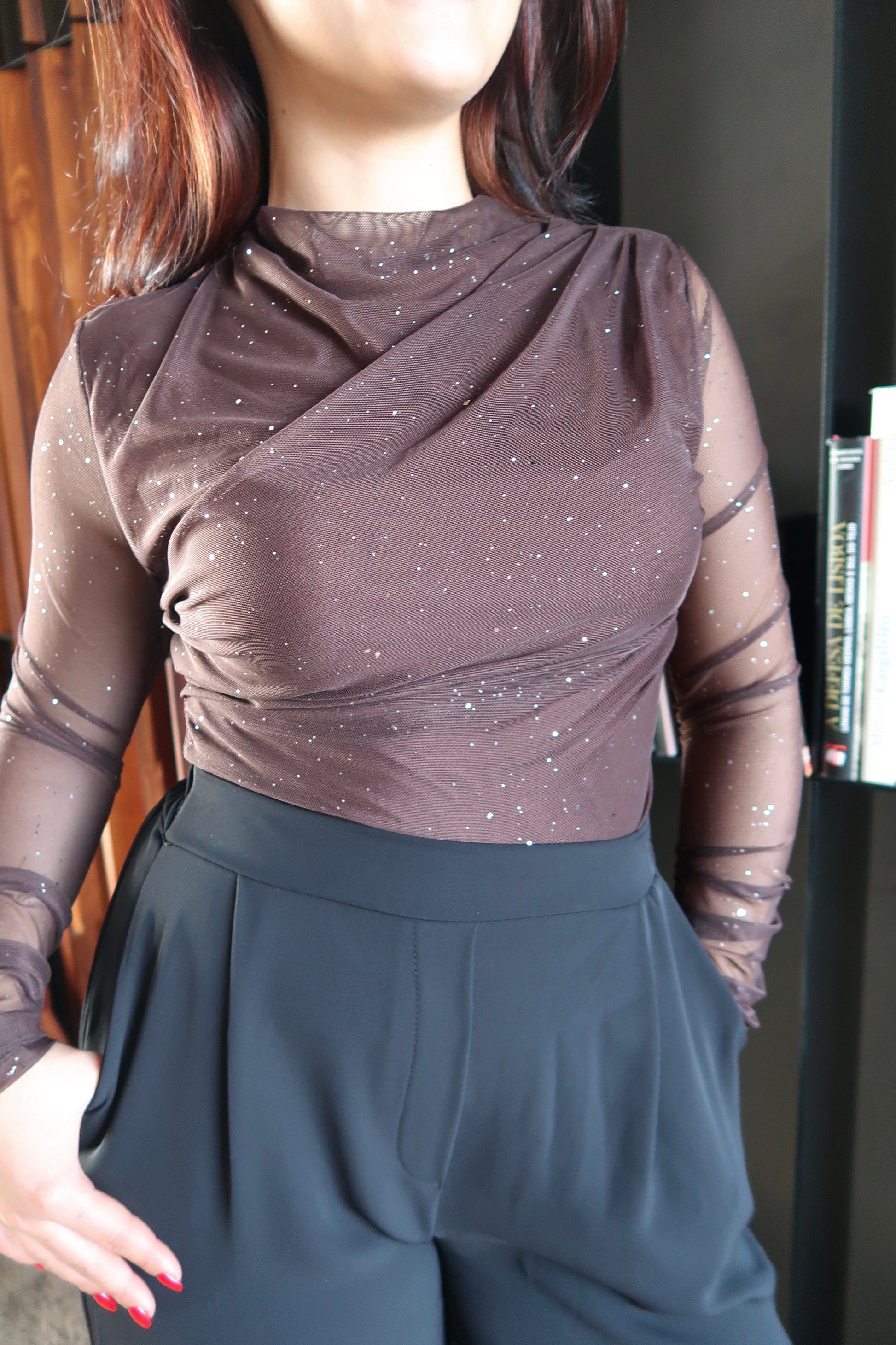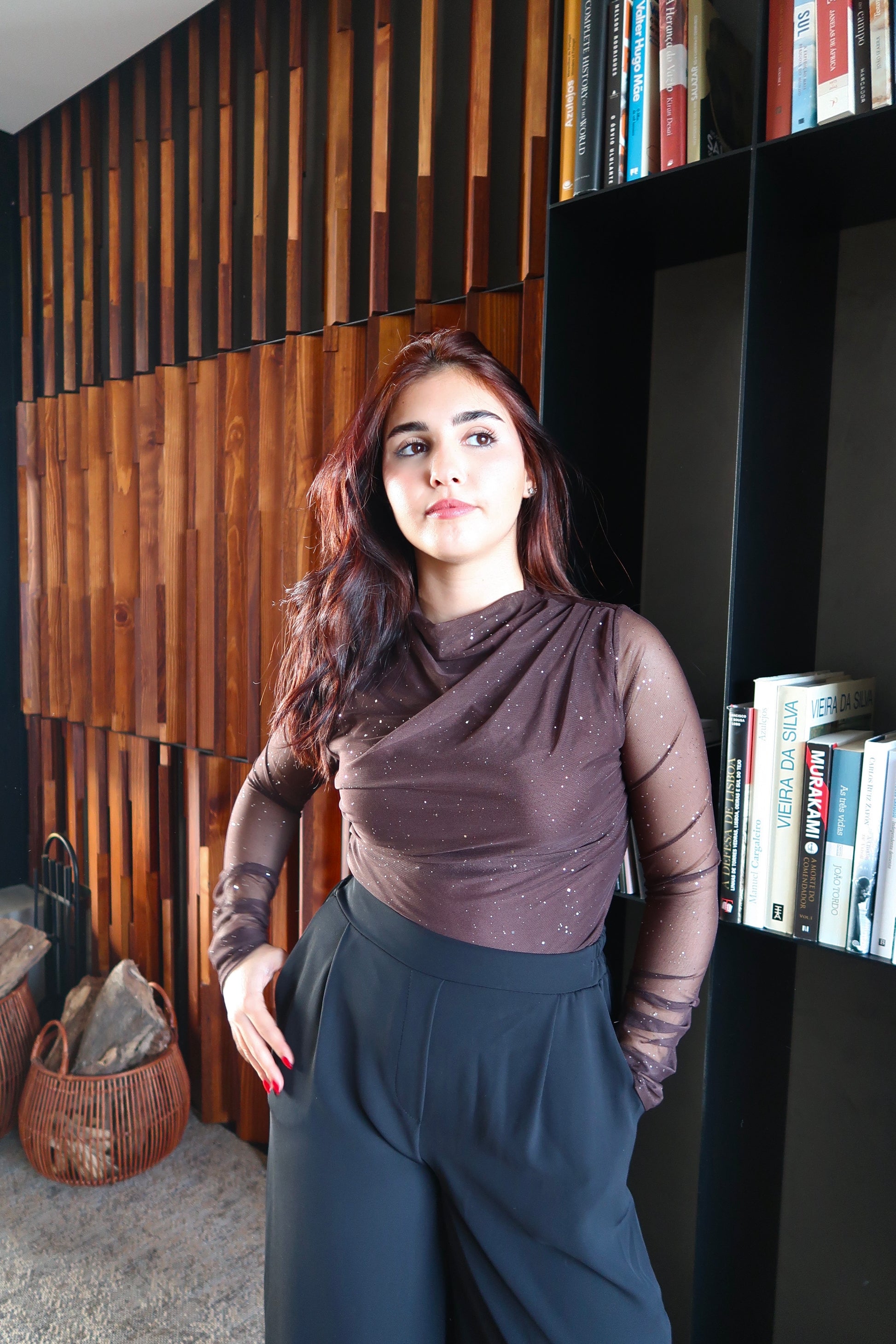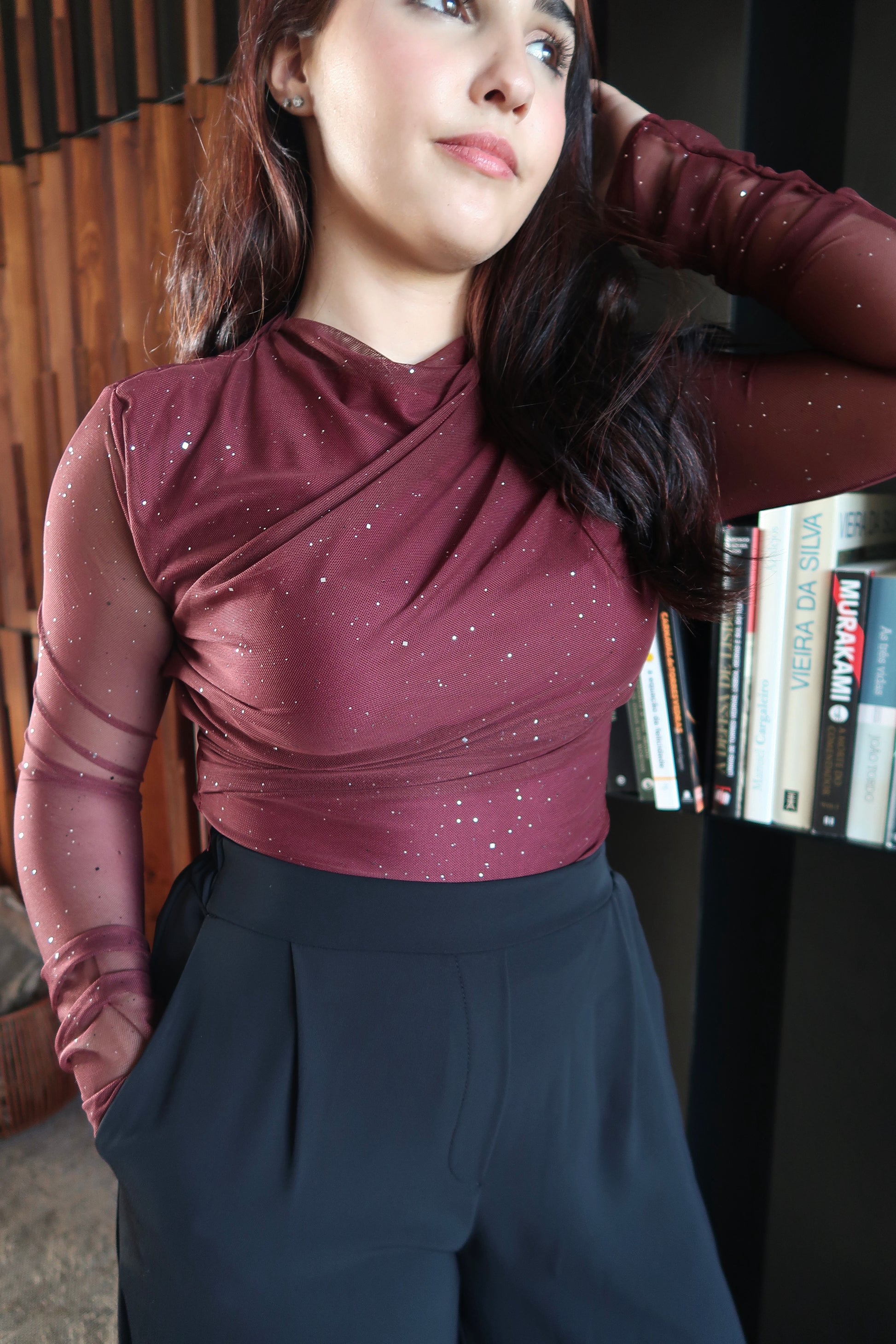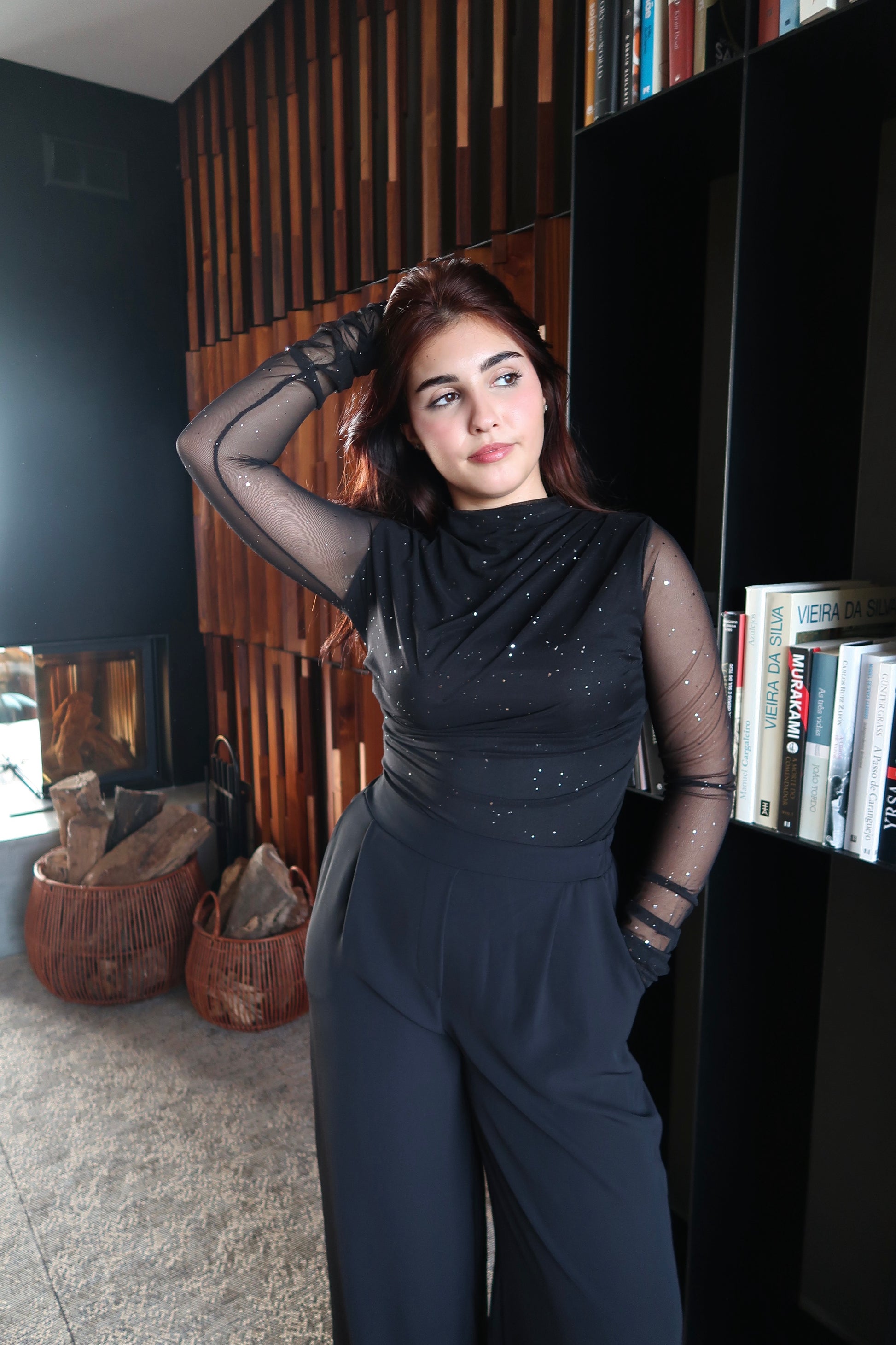 Camisola em tule delicado, com transparência suave e aplicação de micro brilhos que conferem um toque sofisticado e feminino. O drapeado frontal valoriza o decote e cria um efeito elegante no tronco, enquanto o tecido elástico garante conforto e um ajuste perfeito ao corpo.