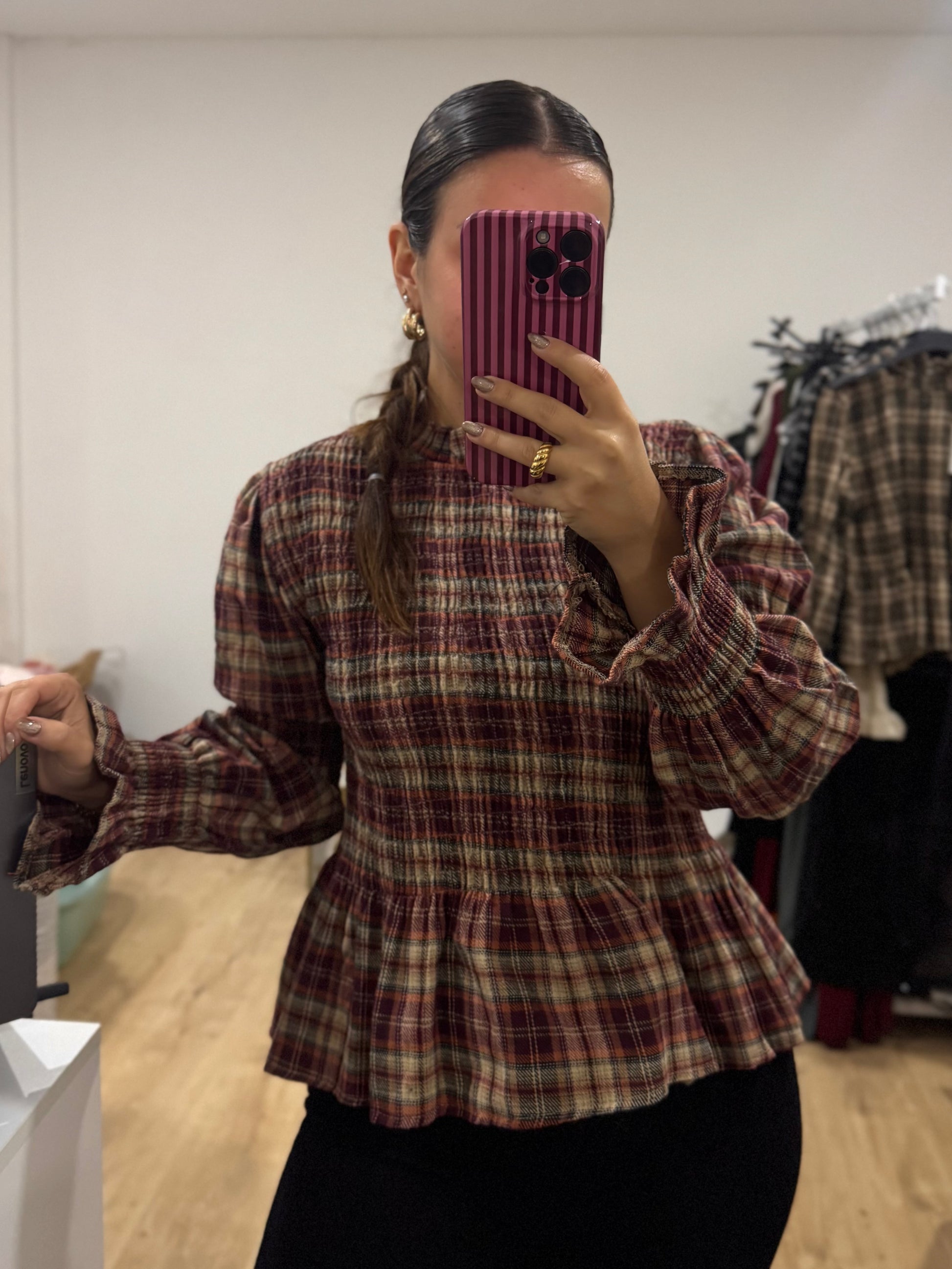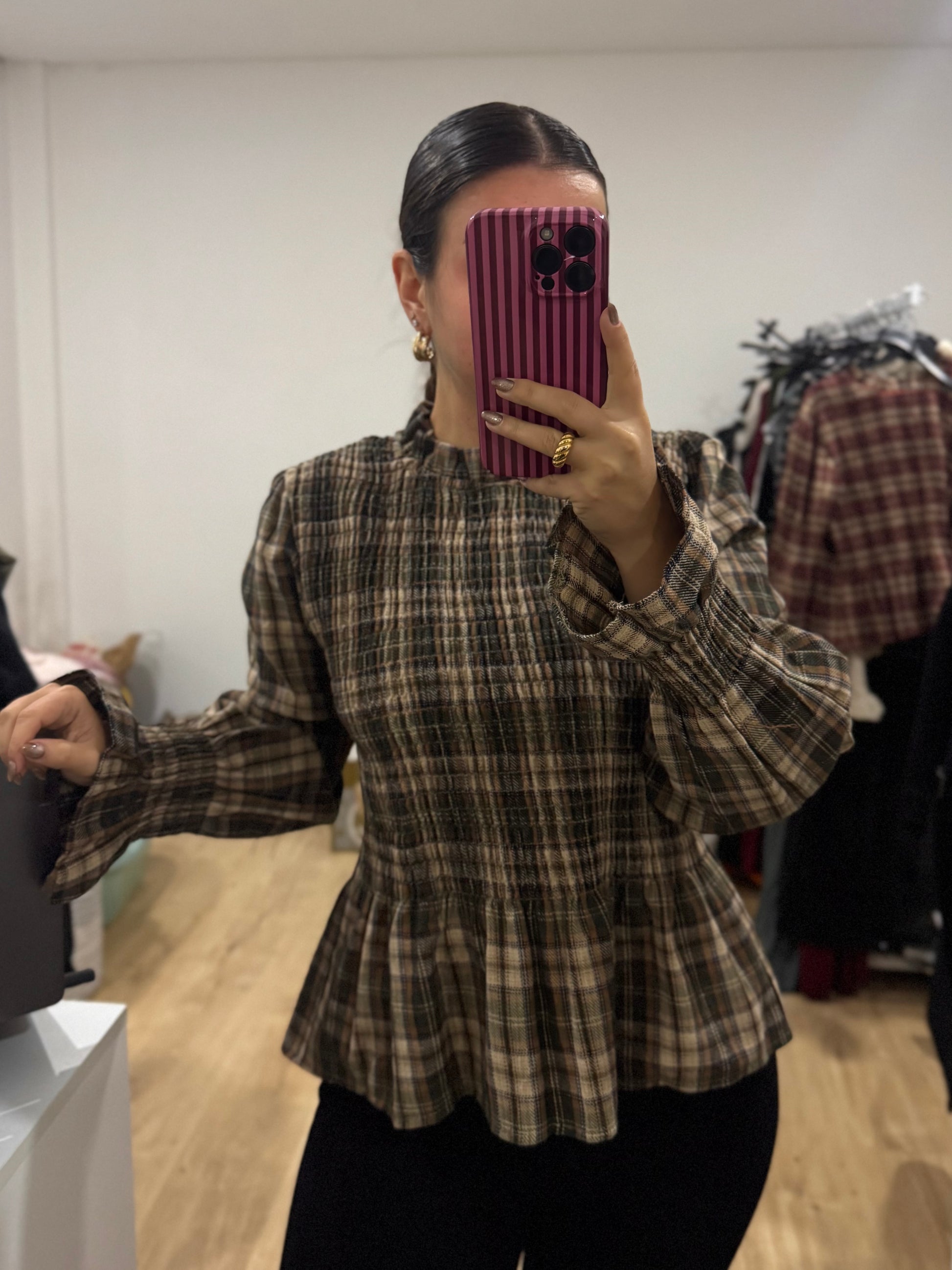 Blusa em padrão xadrez, com um toque romântico e sofisticado. Apresenta gola subida com franzido delicado, mangas compridas com punho elástico e um corte peplum que valoriza a silhueta. O tecido tem textura suave e confortável, perfeita para looks de outono/inverno, tanto em combinações mais casuais como em visuais mais arranjados.
