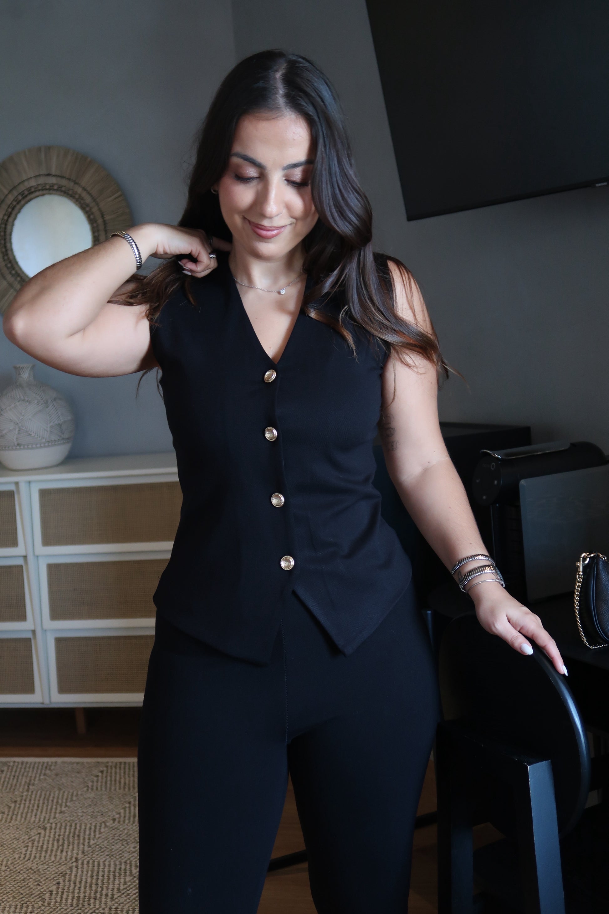 Colete preto sem mangas, com corte reto e estrutura minimalista que valoriza a silhueta. O modelo apresenta decote em V e fecho frontal com botões dourados, que acrescentam um toque sofisticado e contemporâneo ao visual. Confeccionado em tecido encorpado, oferece um caimento impecável e versátil, ideal para compor looks casuais ou mais formais, tanto usado sozinho como sobreposto a outras peças.