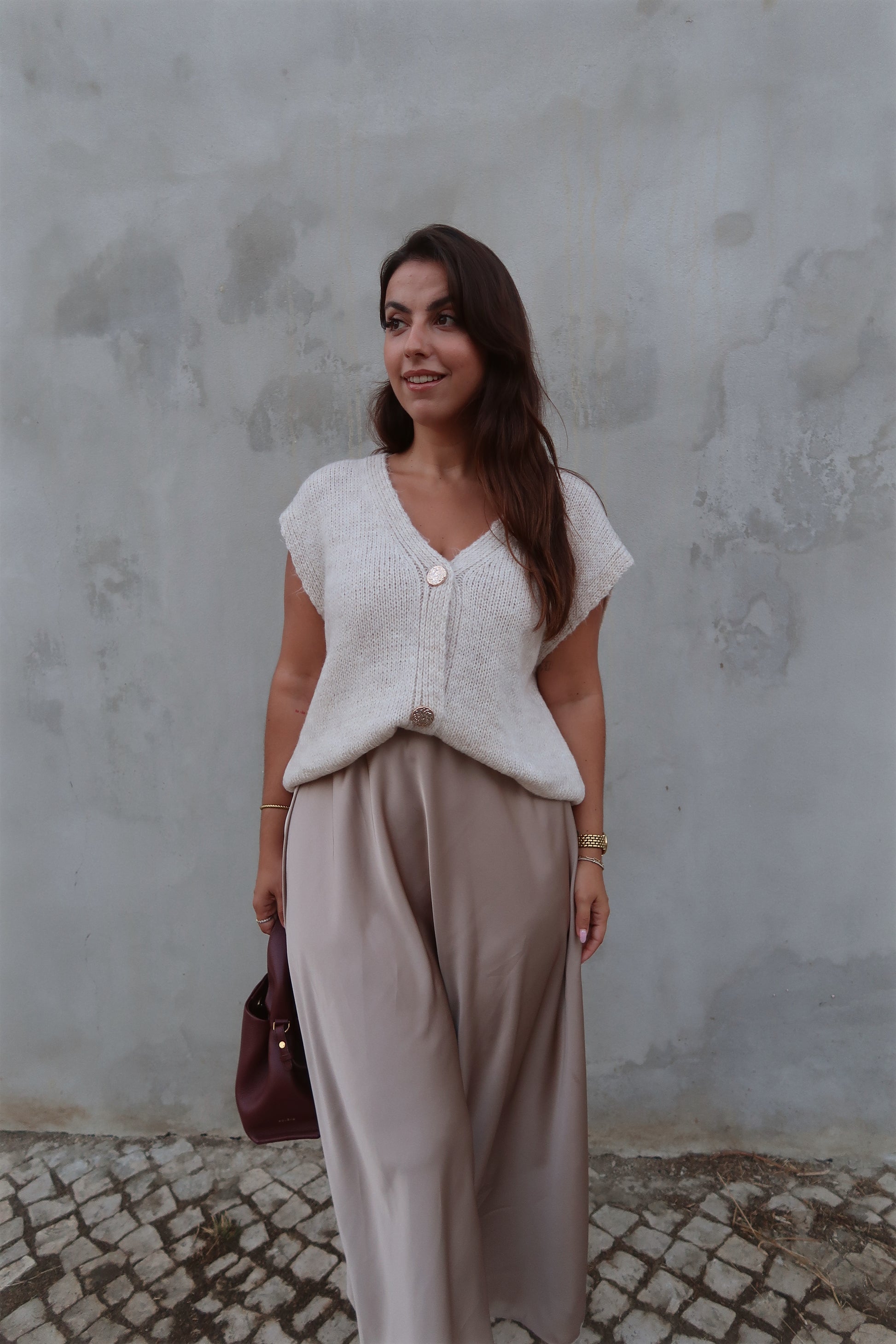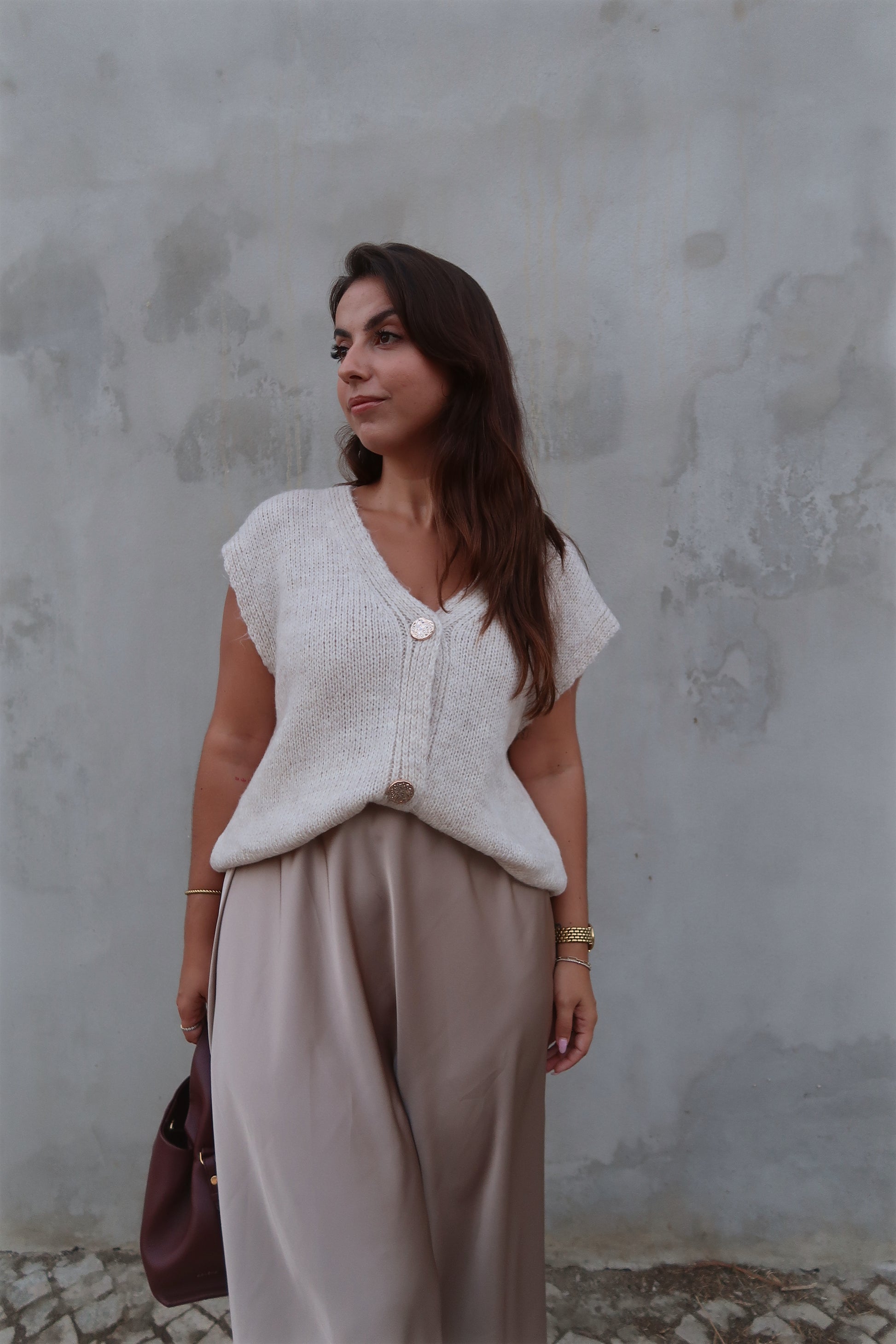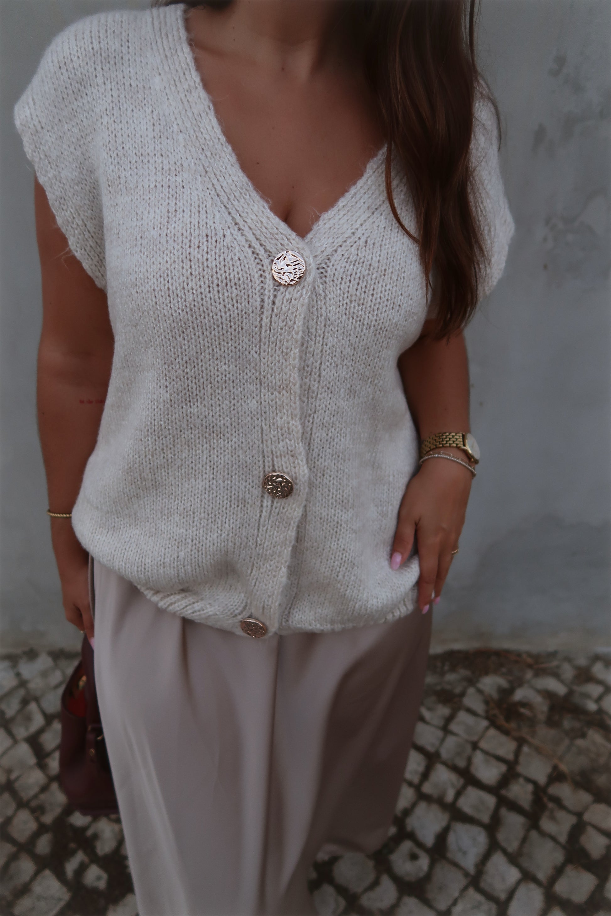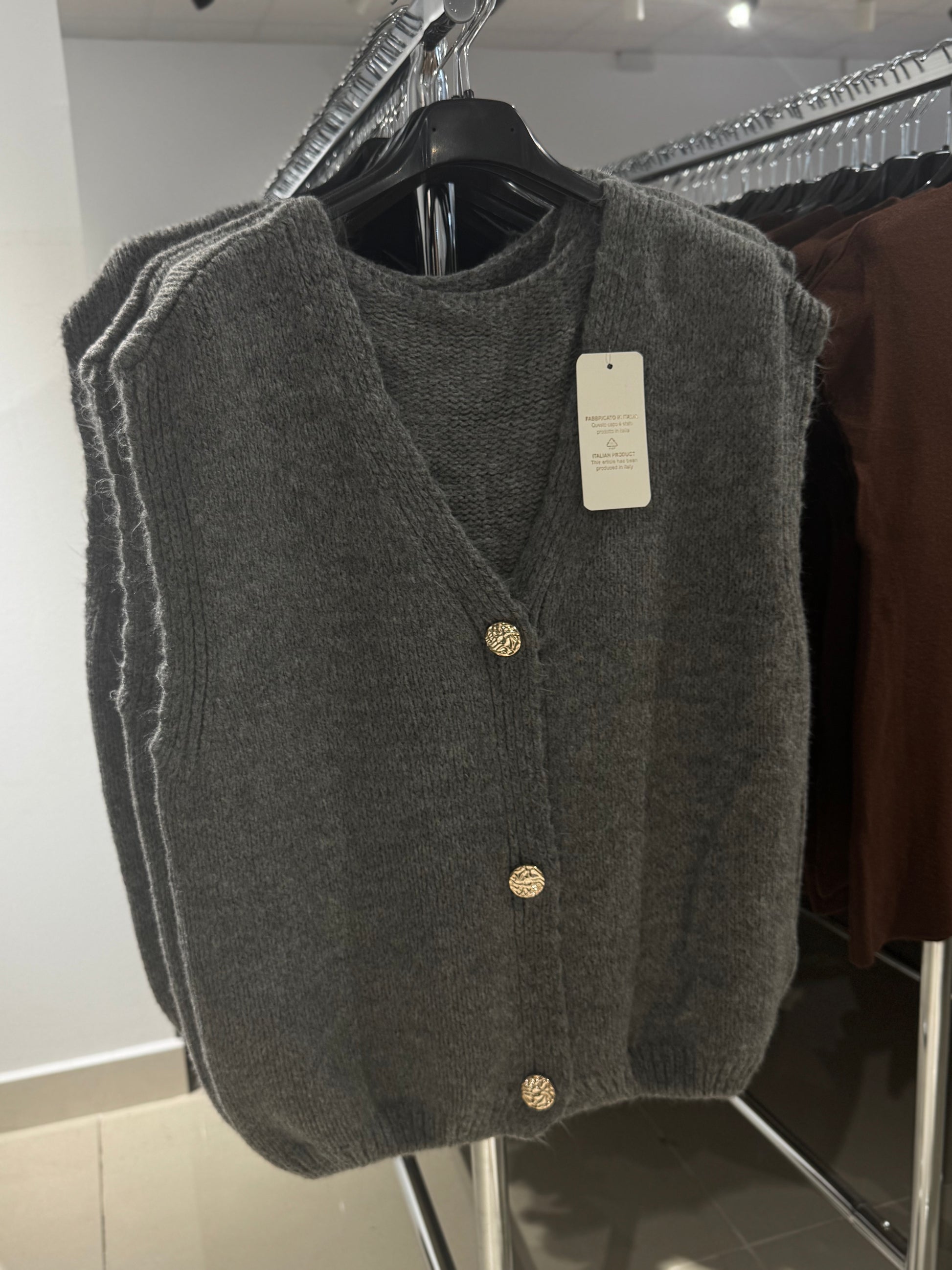 Um essencial versátil e elegante, perfeito para todas as estações. Confeccionado em tricot macio, este colete apresenta um decote em V delicado e dois botões dourados que adicionam um toque sofisticado. Com corte fluido e confortável, pode ser usado sozinho ou combinado com camisas e blusas para um look mais composto.
