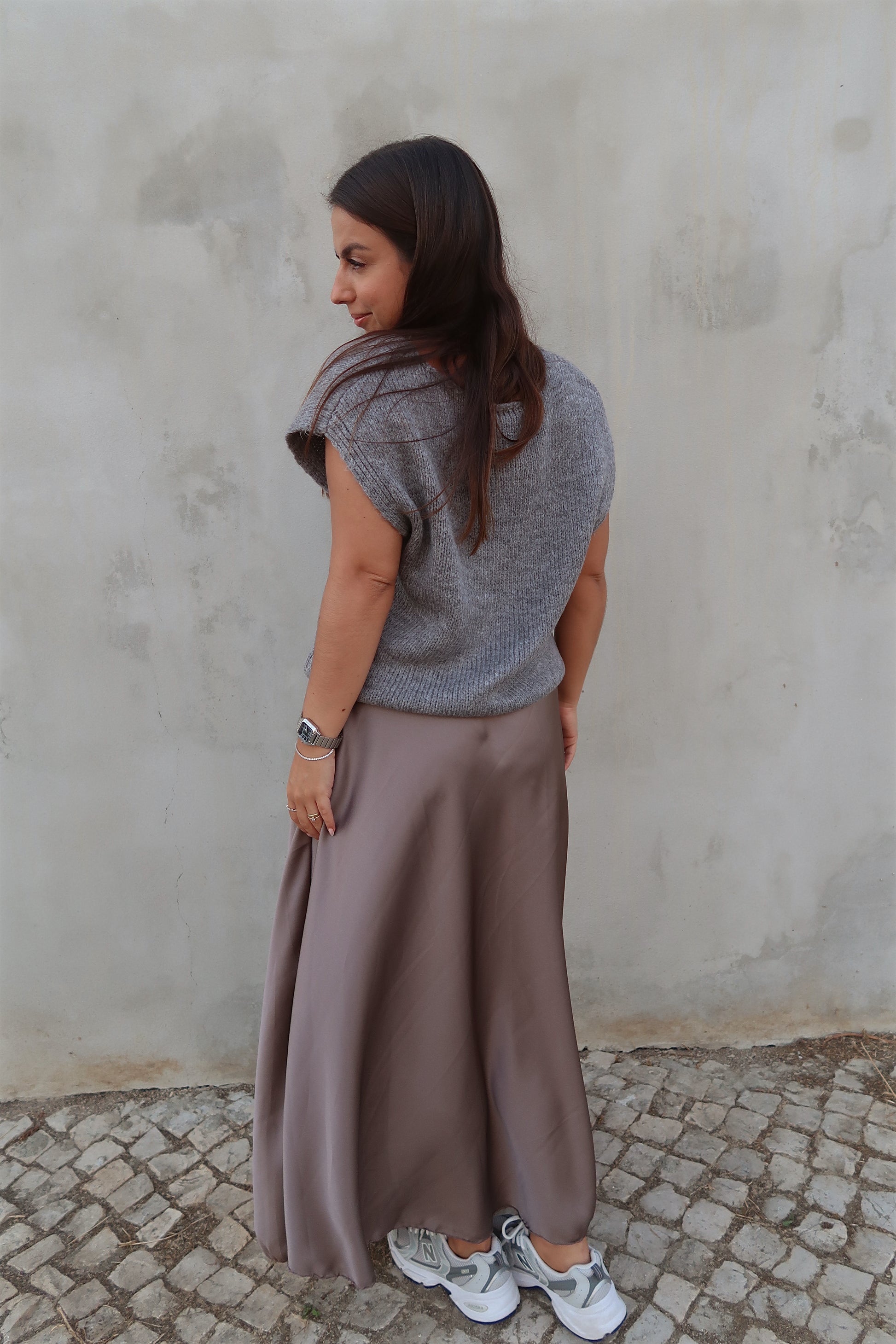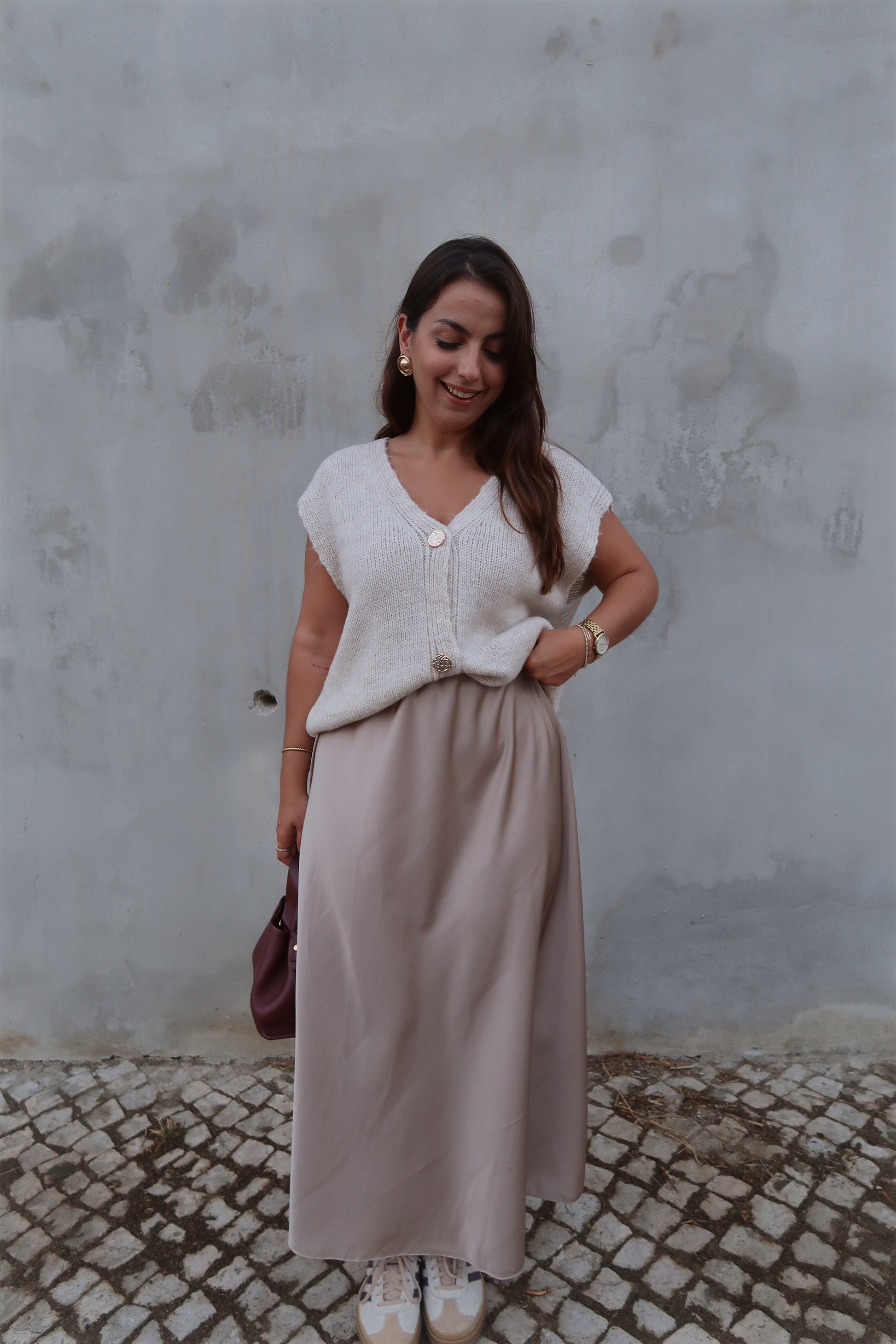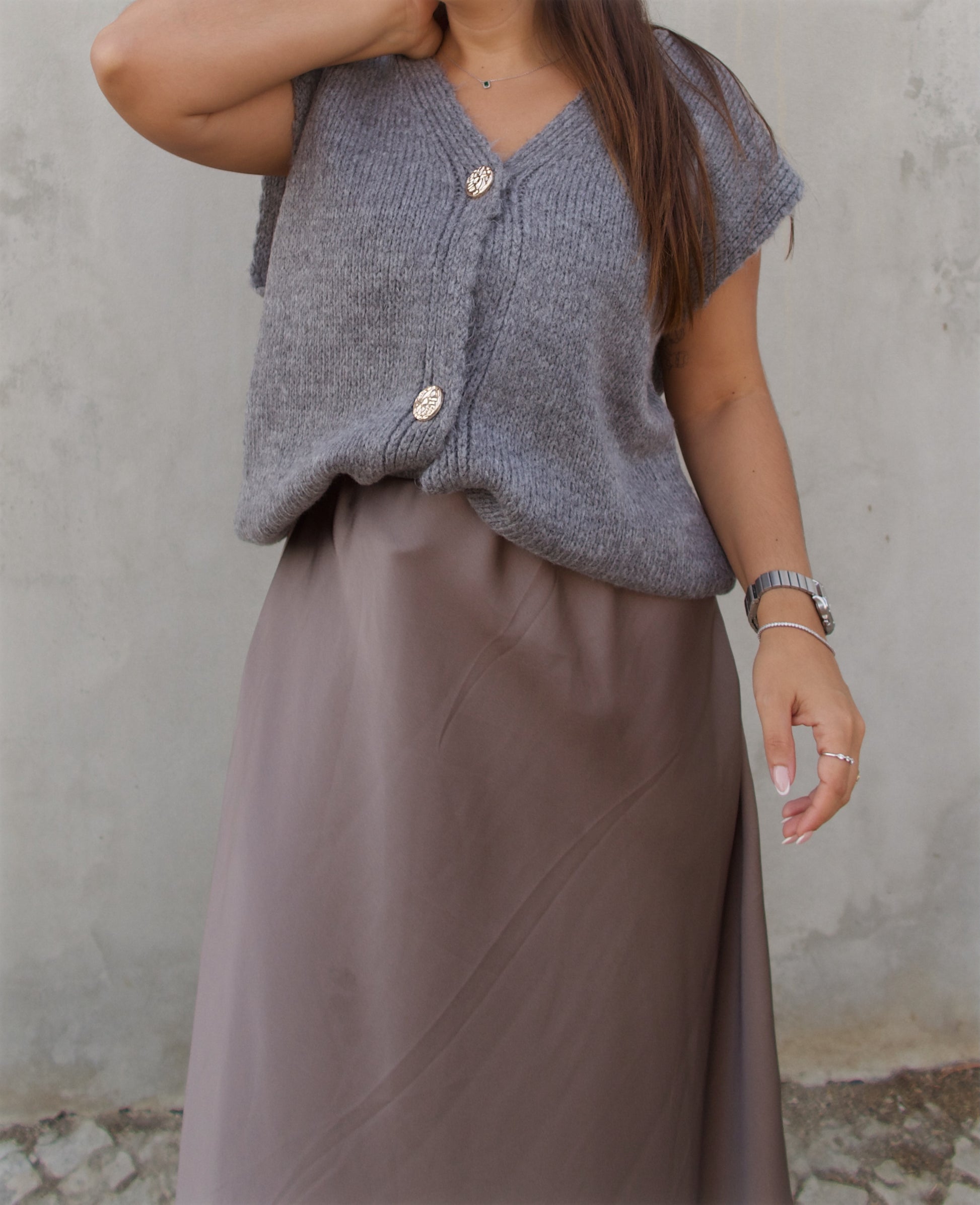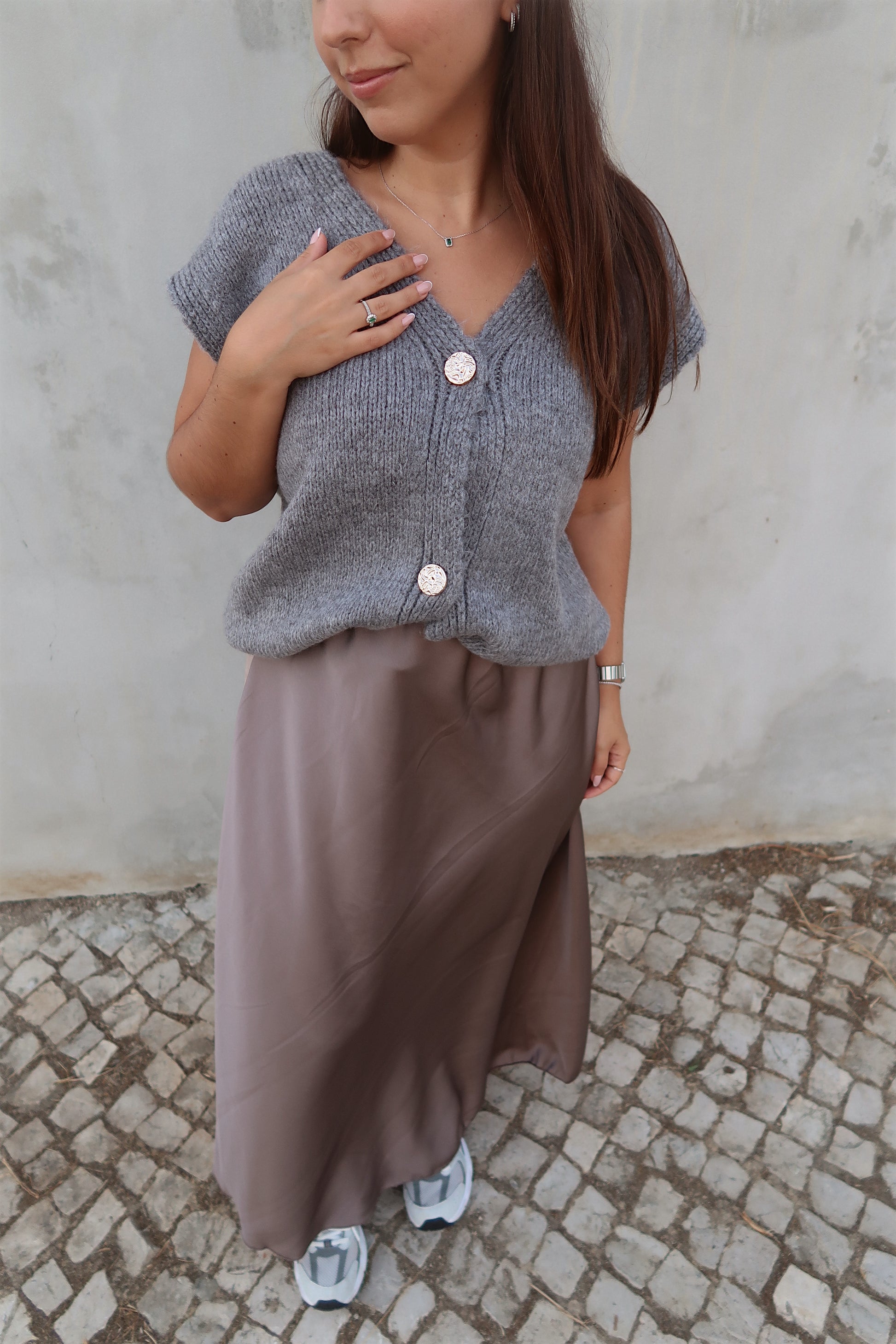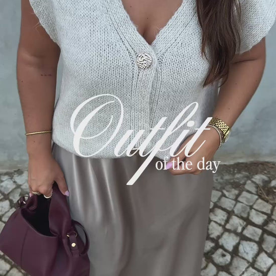 Um essencial versátil e elegante, perfeito para todas as estações. Confeccionado em tricot macio, este colete apresenta um decote em V delicado e dois botões dourados que adicionam um toque sofisticado. Com corte fluido e confortável, pode ser usado sozinho ou combinado com camisas e blusas para um look mais composto.