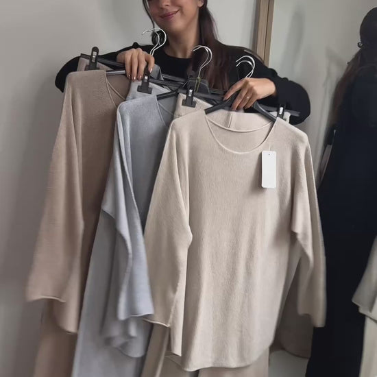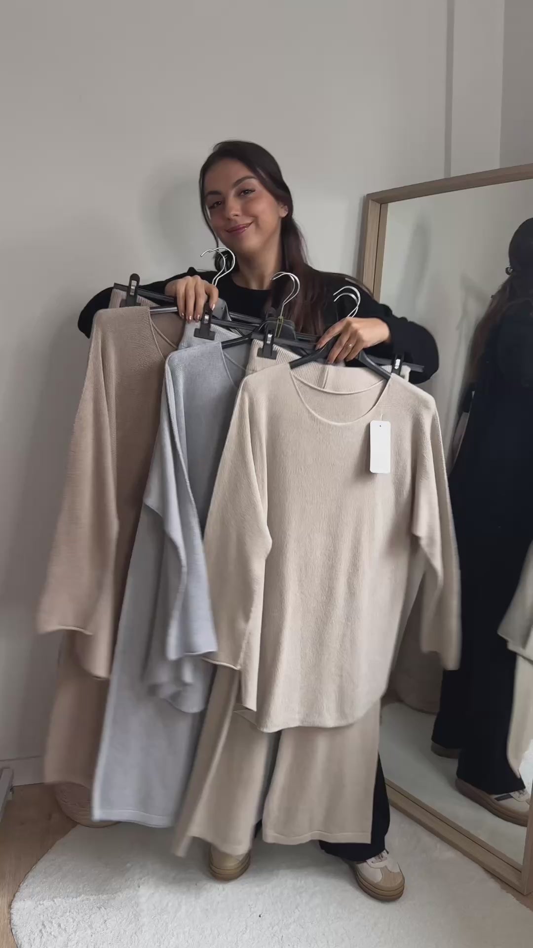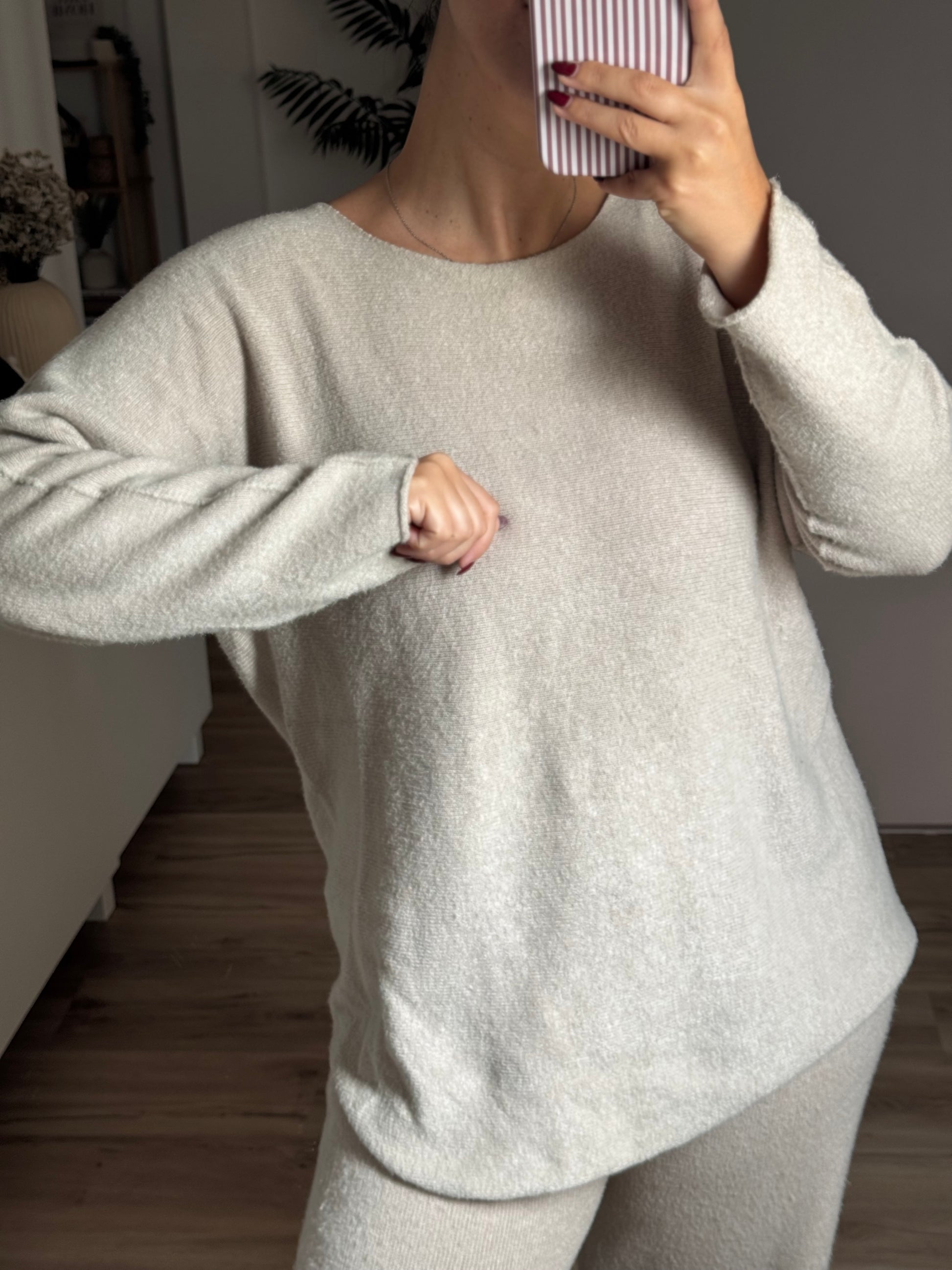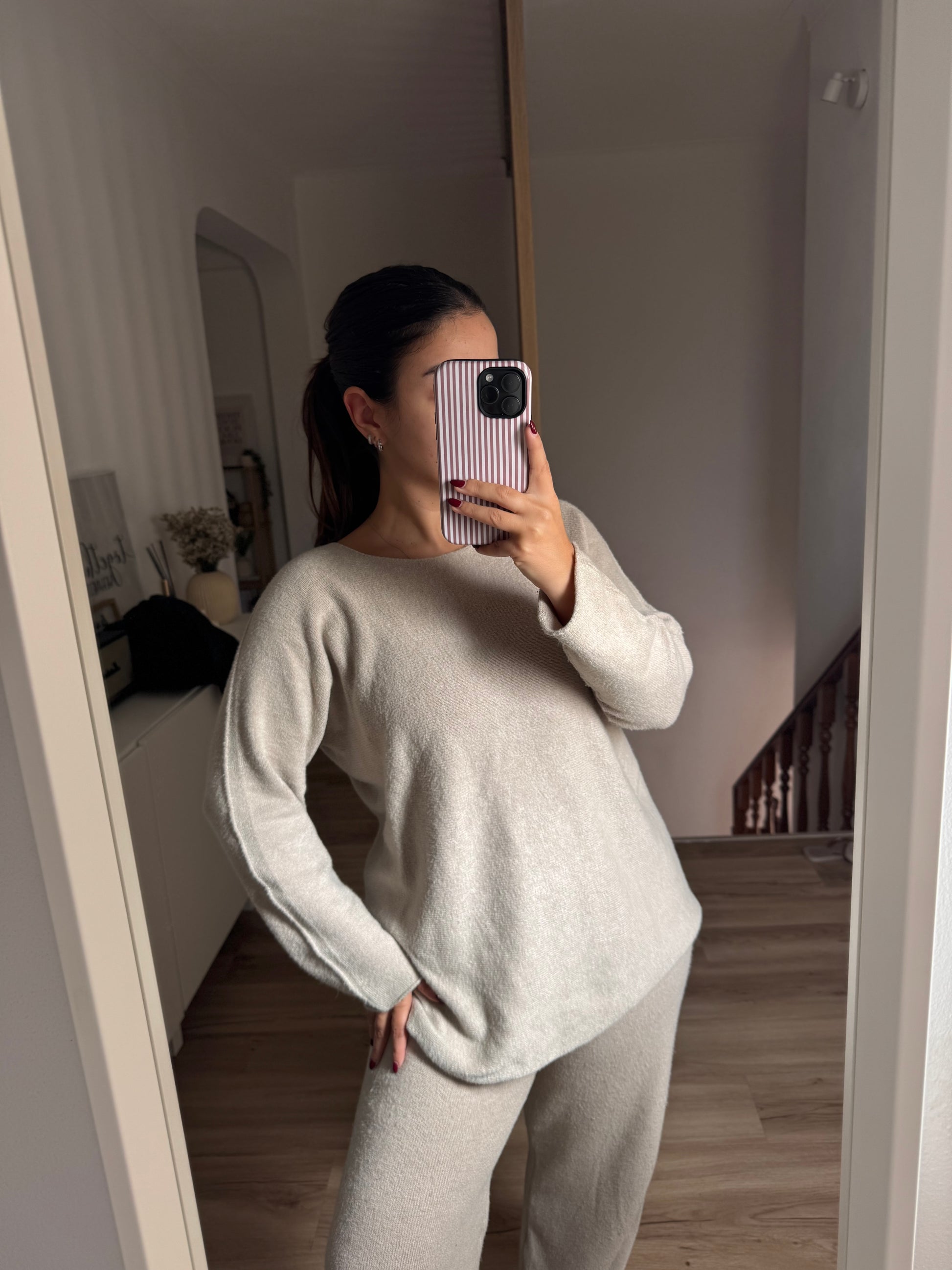 Produzido em malha macia, apresenta uma camisola de corte direito e ligeiramente fluido, acompanhada de calças com cintura subida e de perna ampla que garantem liberdade de movimento e um visual descontraído, mas cuidado.