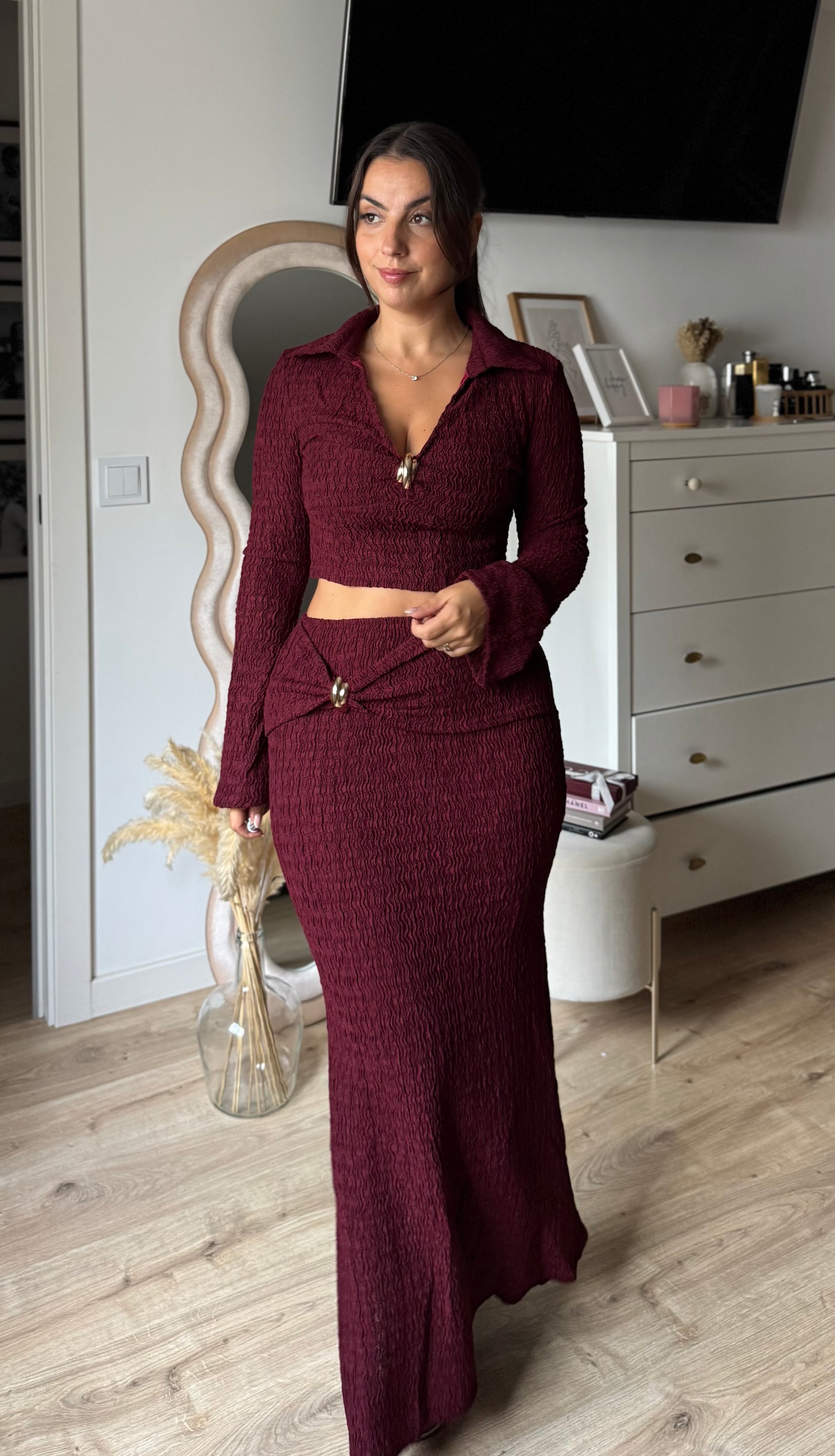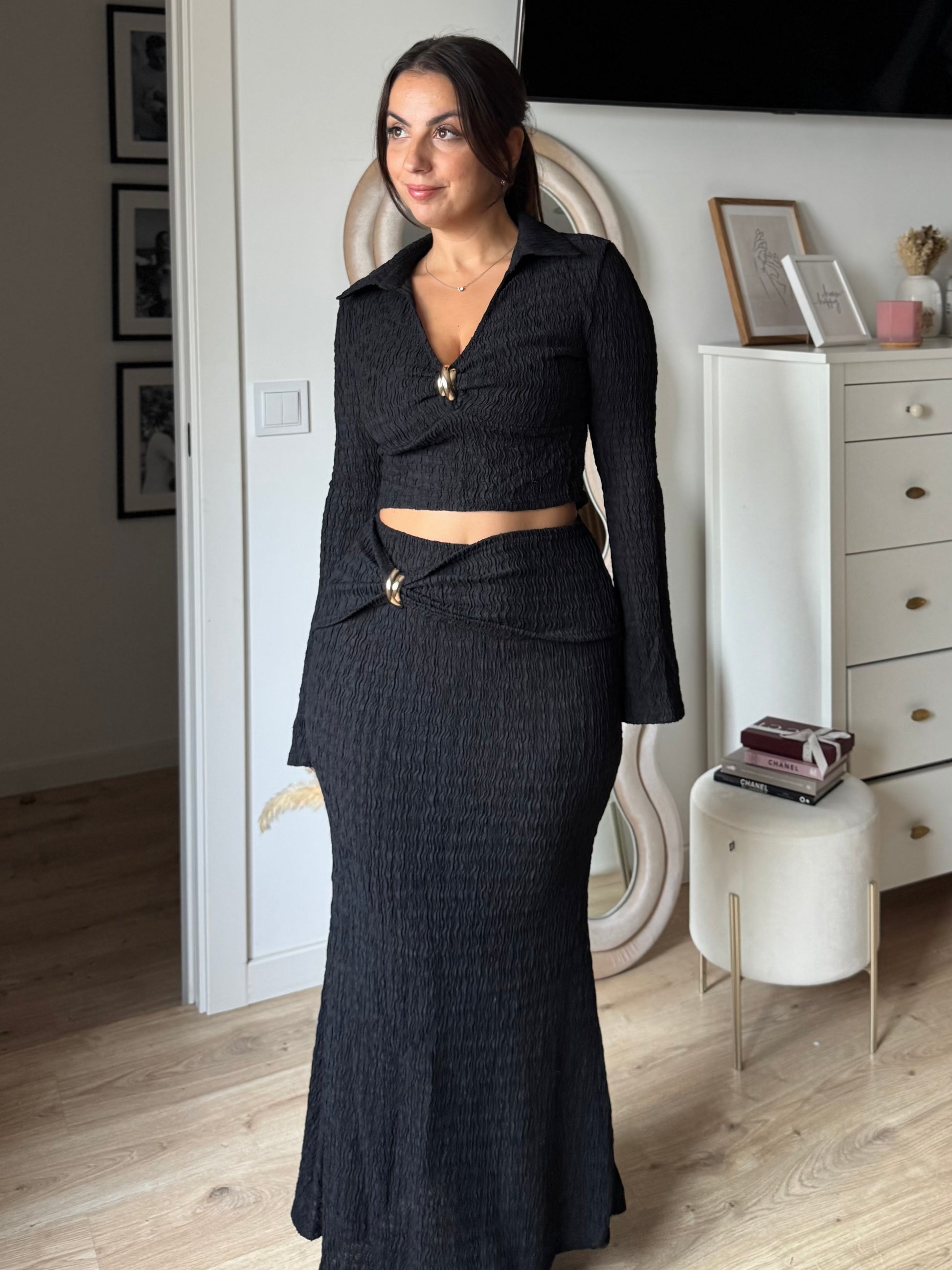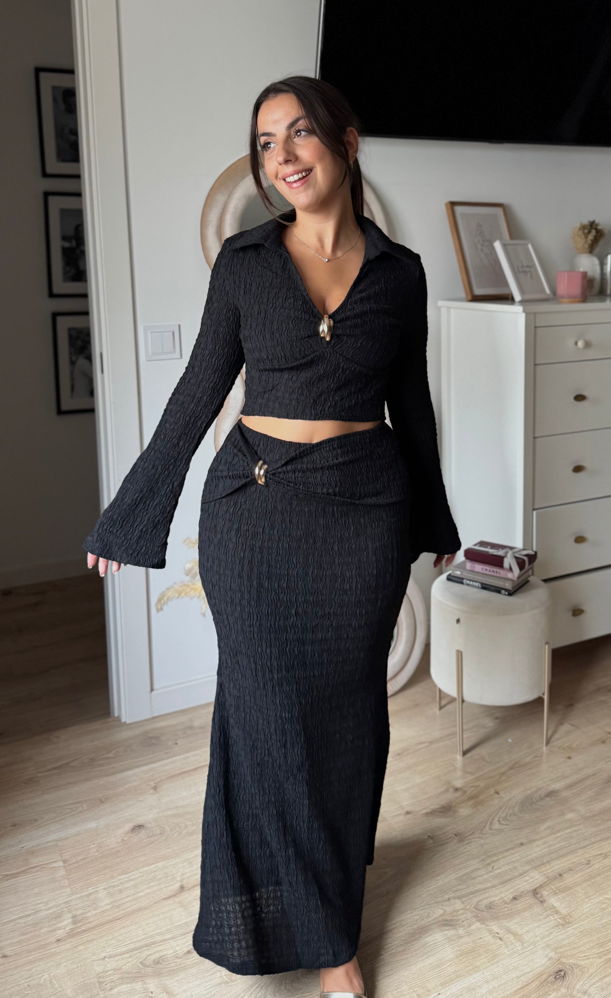 Conjunto composto por top de manga comprida com decote em V e detalhe metálico e saia comprida de cintura subida com drapeado e aplicação dourada. Confeccionado em malha texturizada com elasticidade, adapta-se ao corpo com conforto e sofisticação. Ideal para ocasiões especiais ou um look elegante no dia a dia.