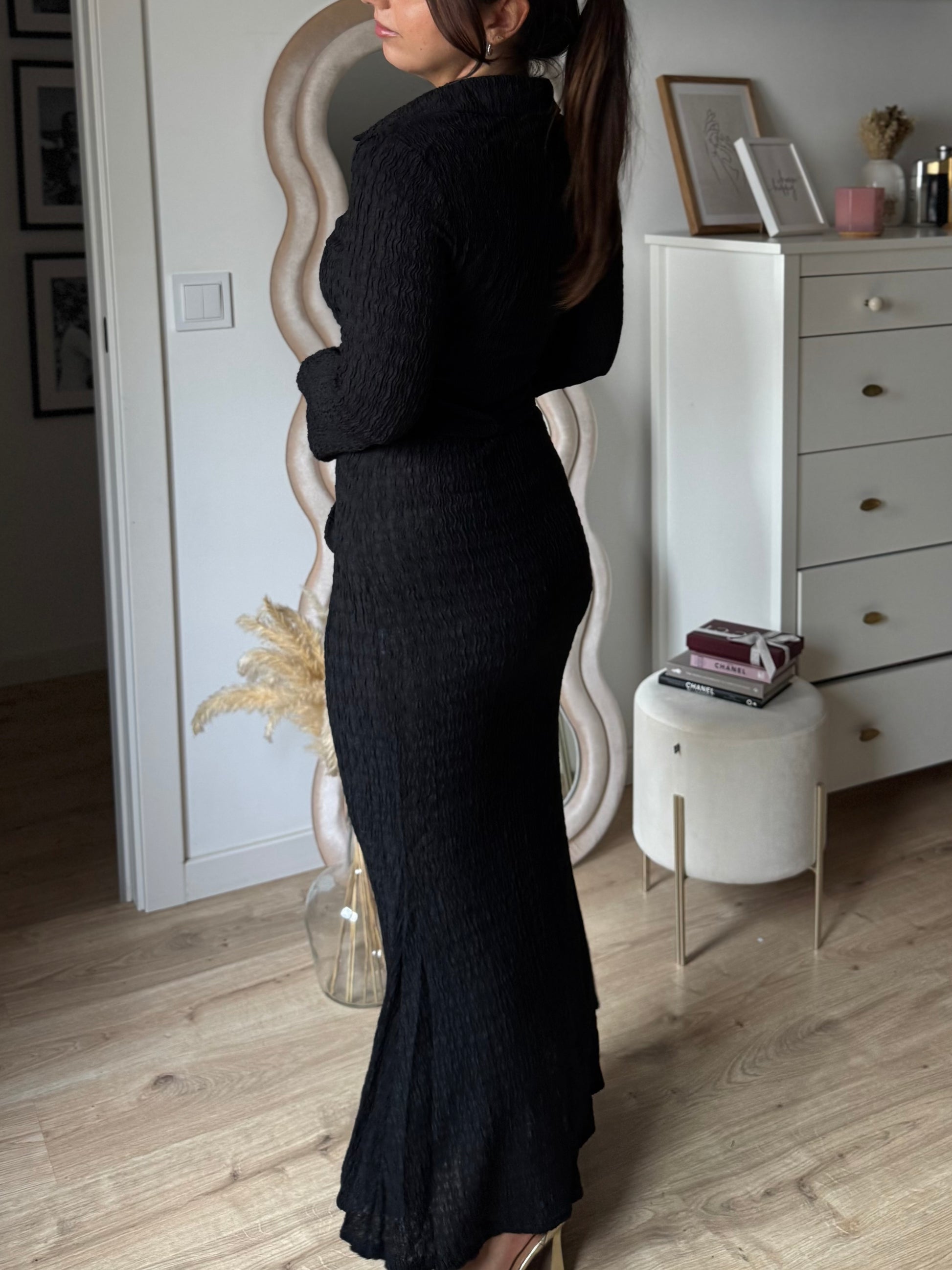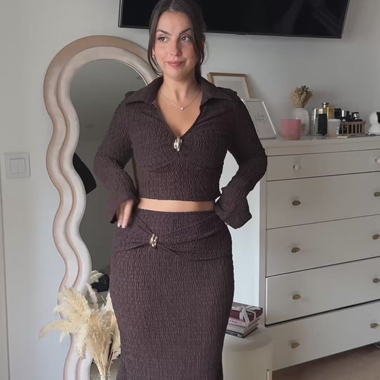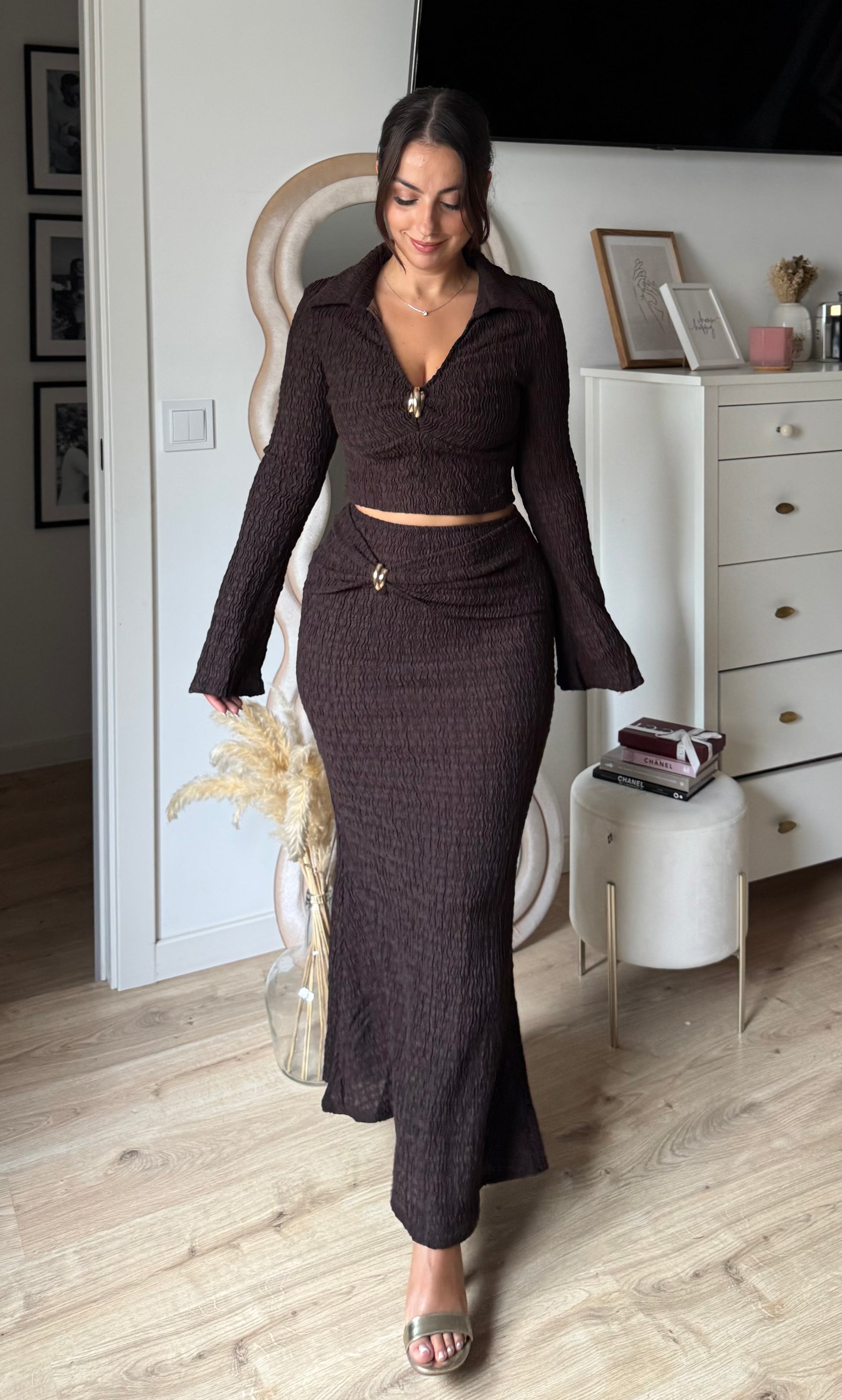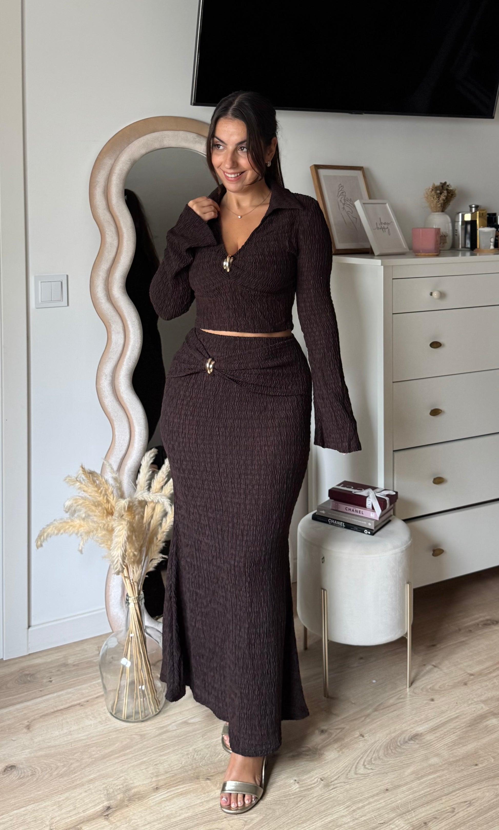 Conjunto composto por top de manga comprida com decote em V e detalhe metálico e saia comprida de cintura subida com drapeado e aplicação dourada. Confeccionado em malha texturizada com elasticidade, adapta-se ao corpo com conforto e sofisticação. Ideal para ocasiões especiais ou um look elegante no dia a dia.