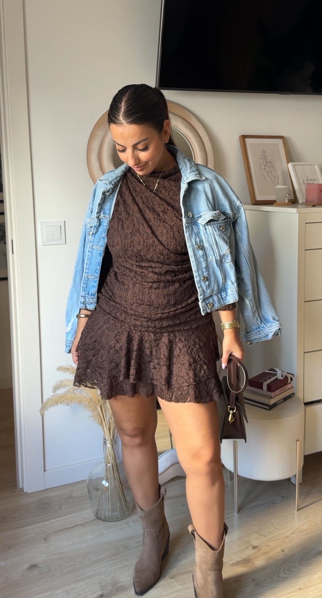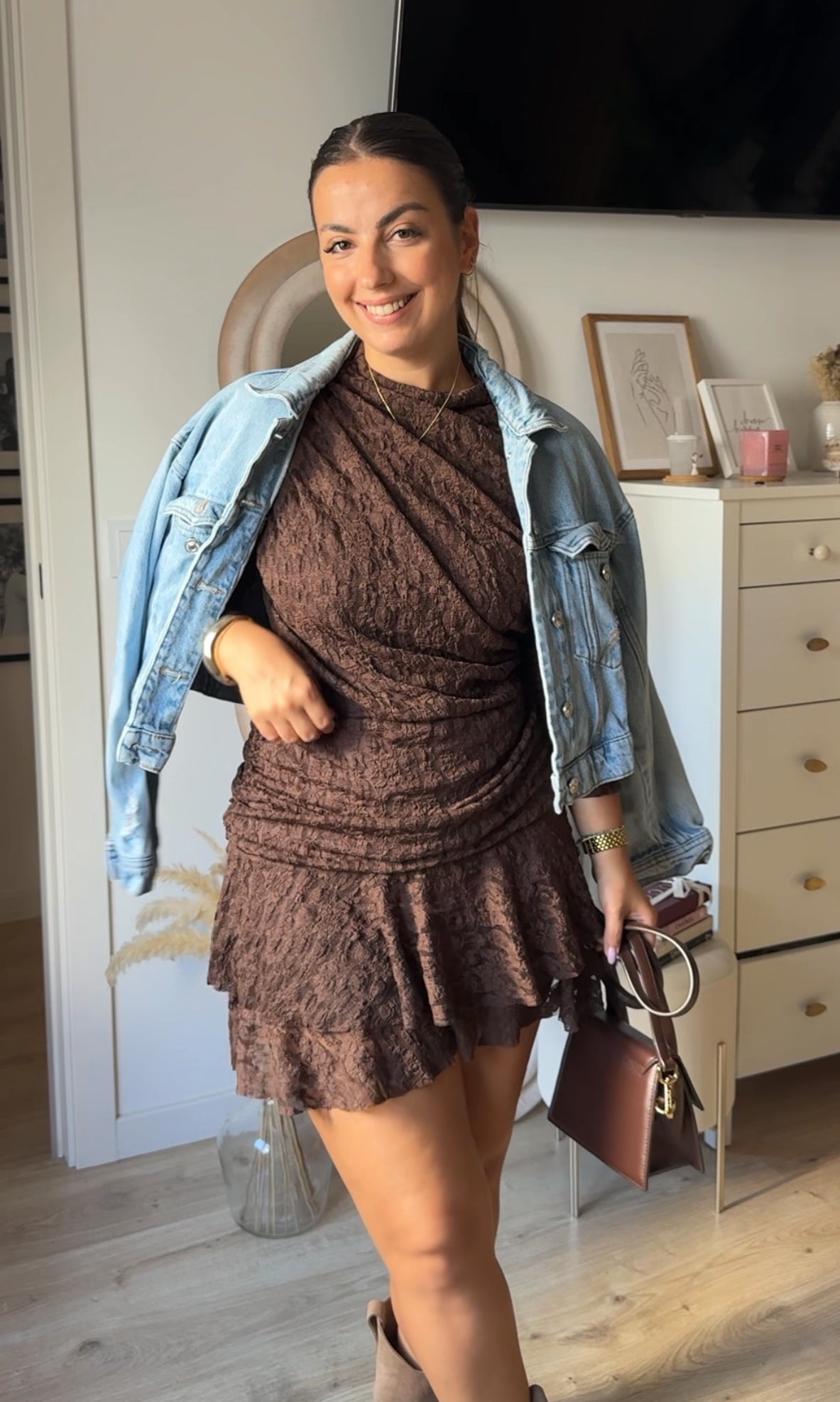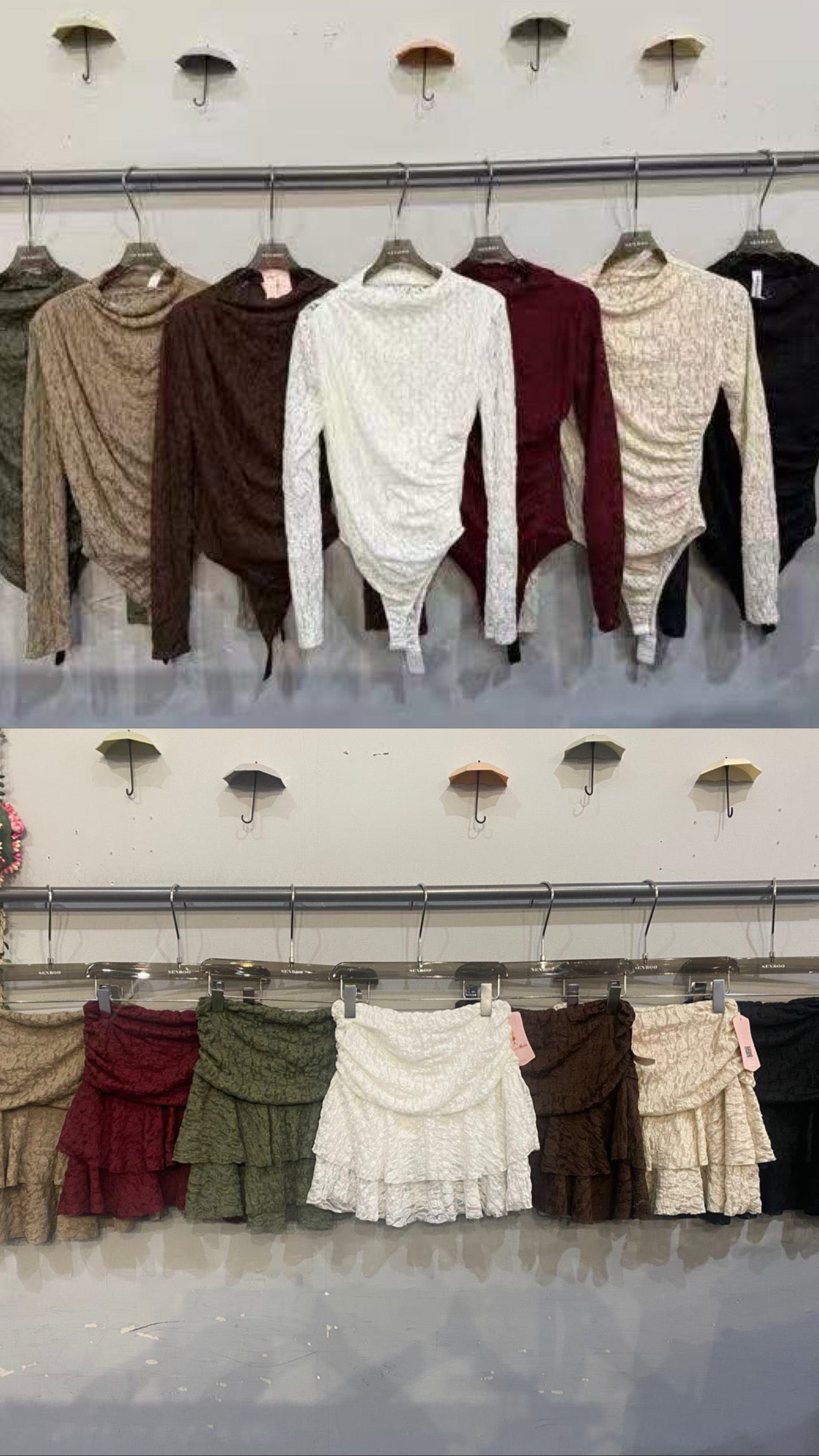 Conjunto feminino composto por body de manga comprida em renda elástica e saia mini com camadas fluídas, ambos com detalhe drapeado que valoriza a silhueta. Perfeito para usar em conjunto, criando o efeito de vestido, ou em separado para looks versáteis.