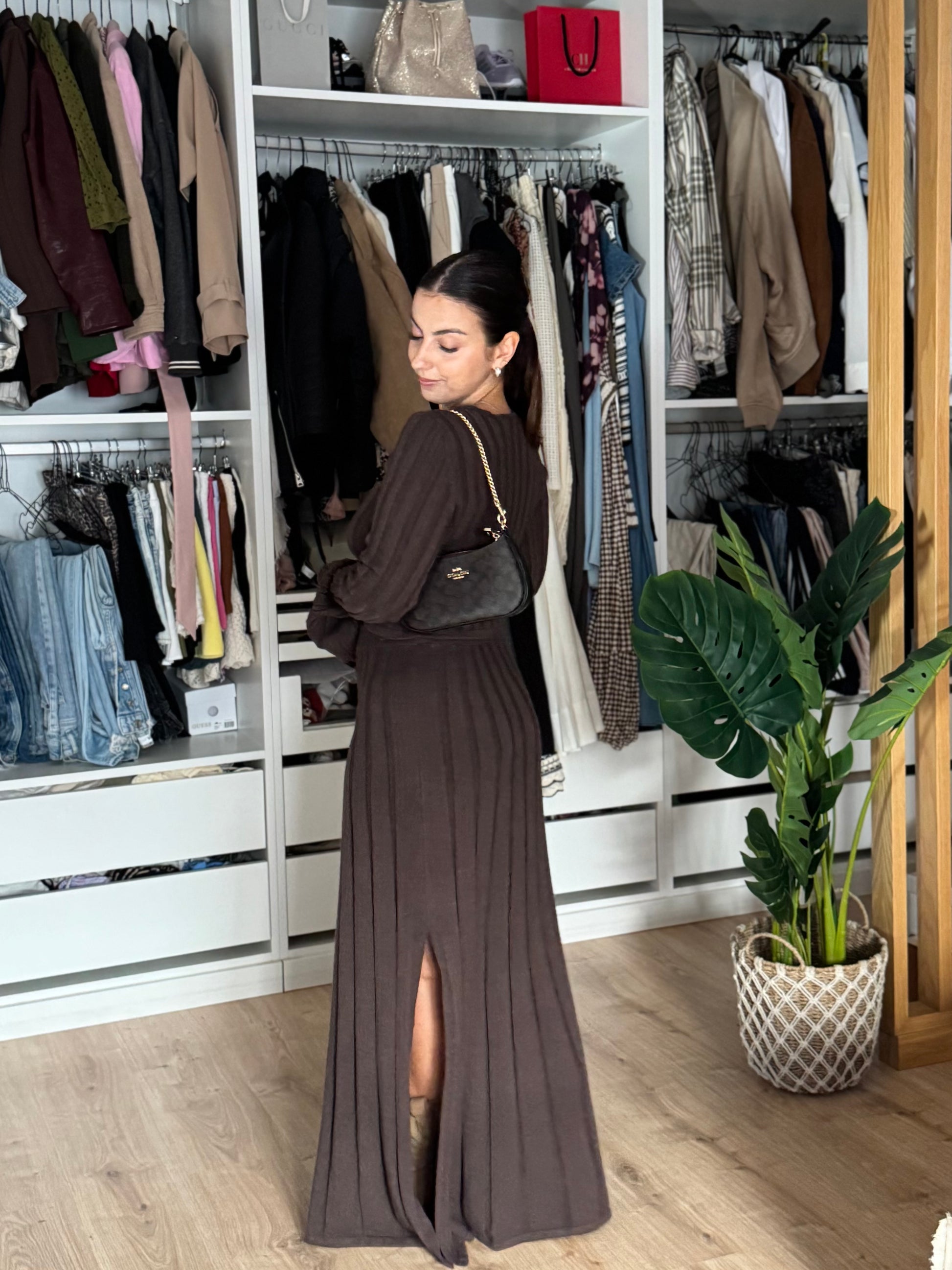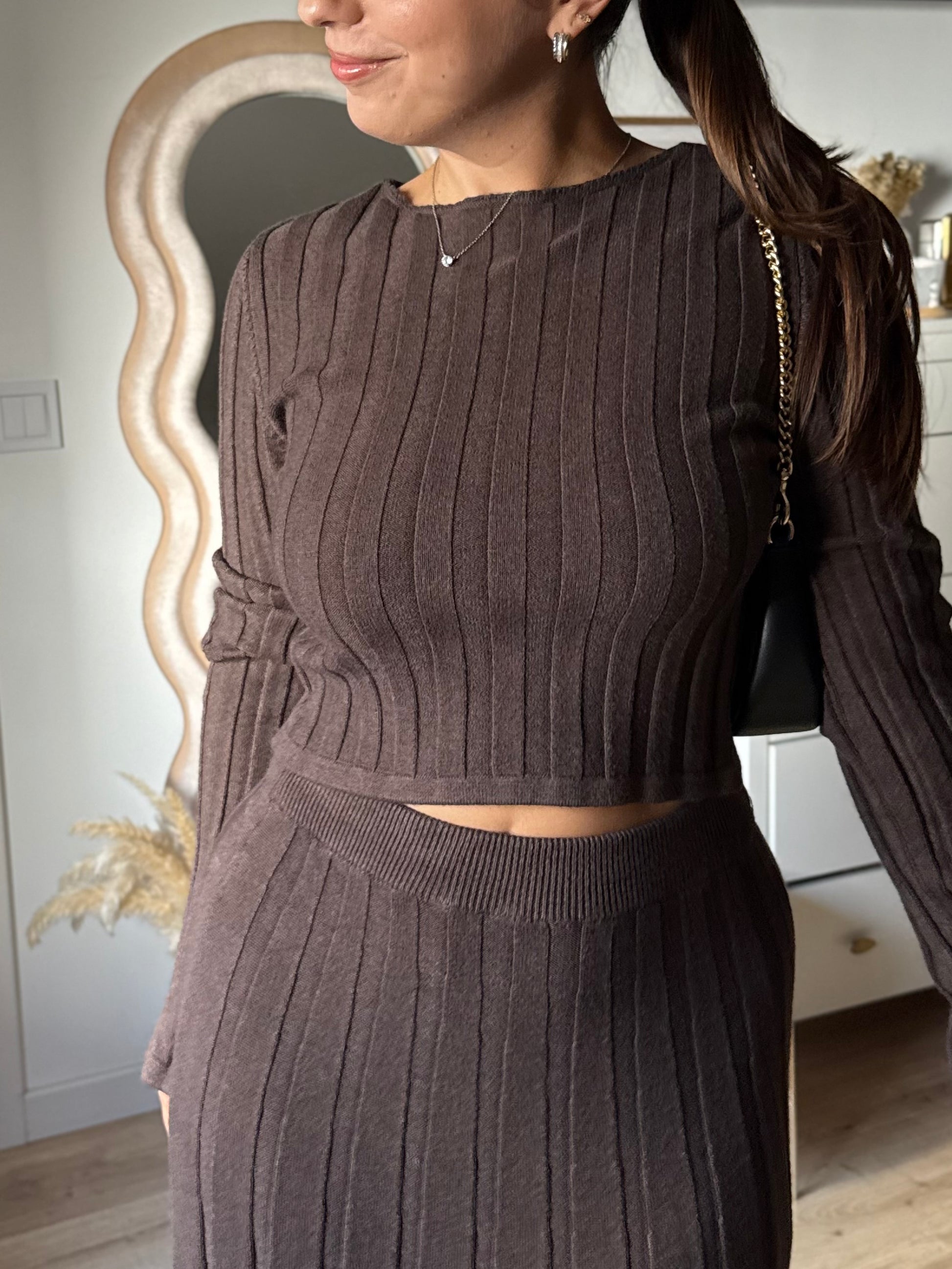 O conjunto perfeito para quem procura conforto sem perder o estilo. Feito em malha canelada elástica e suave ao toque, compõe-se por top cropped de manga comprida com detalhe de punho largo e saia comprida com racha atrás, que garante liberdade de movimento e um toque elegante.