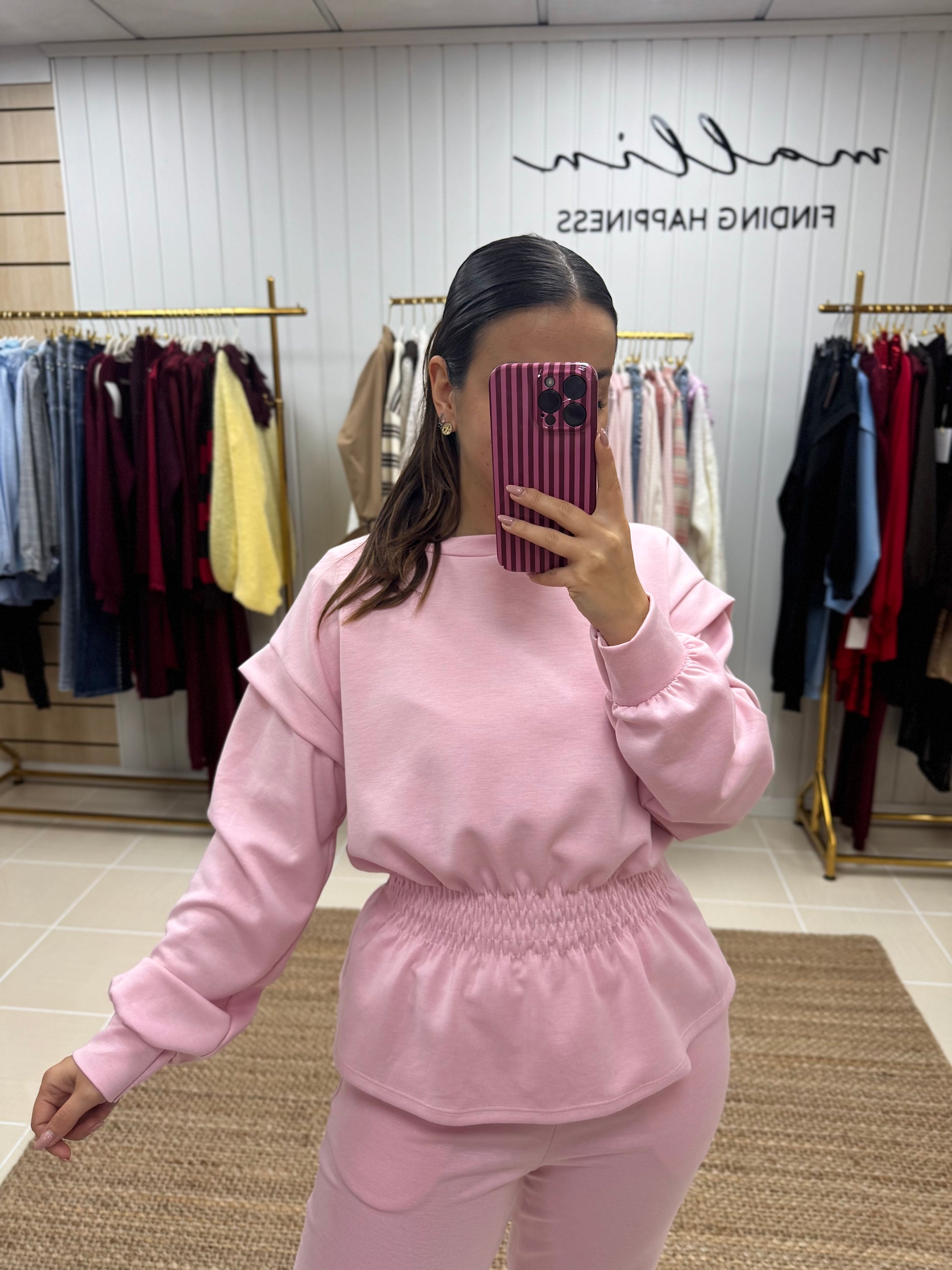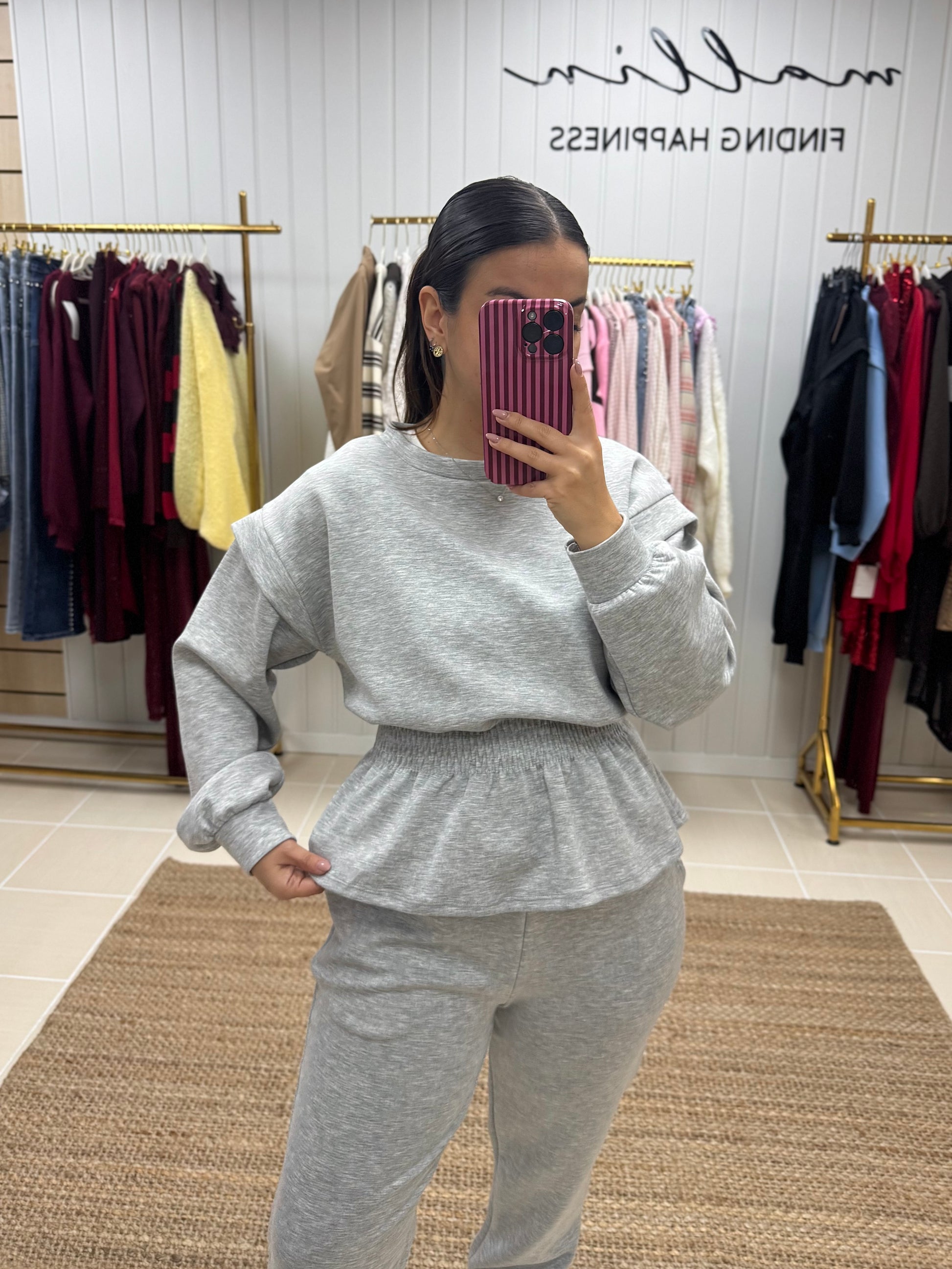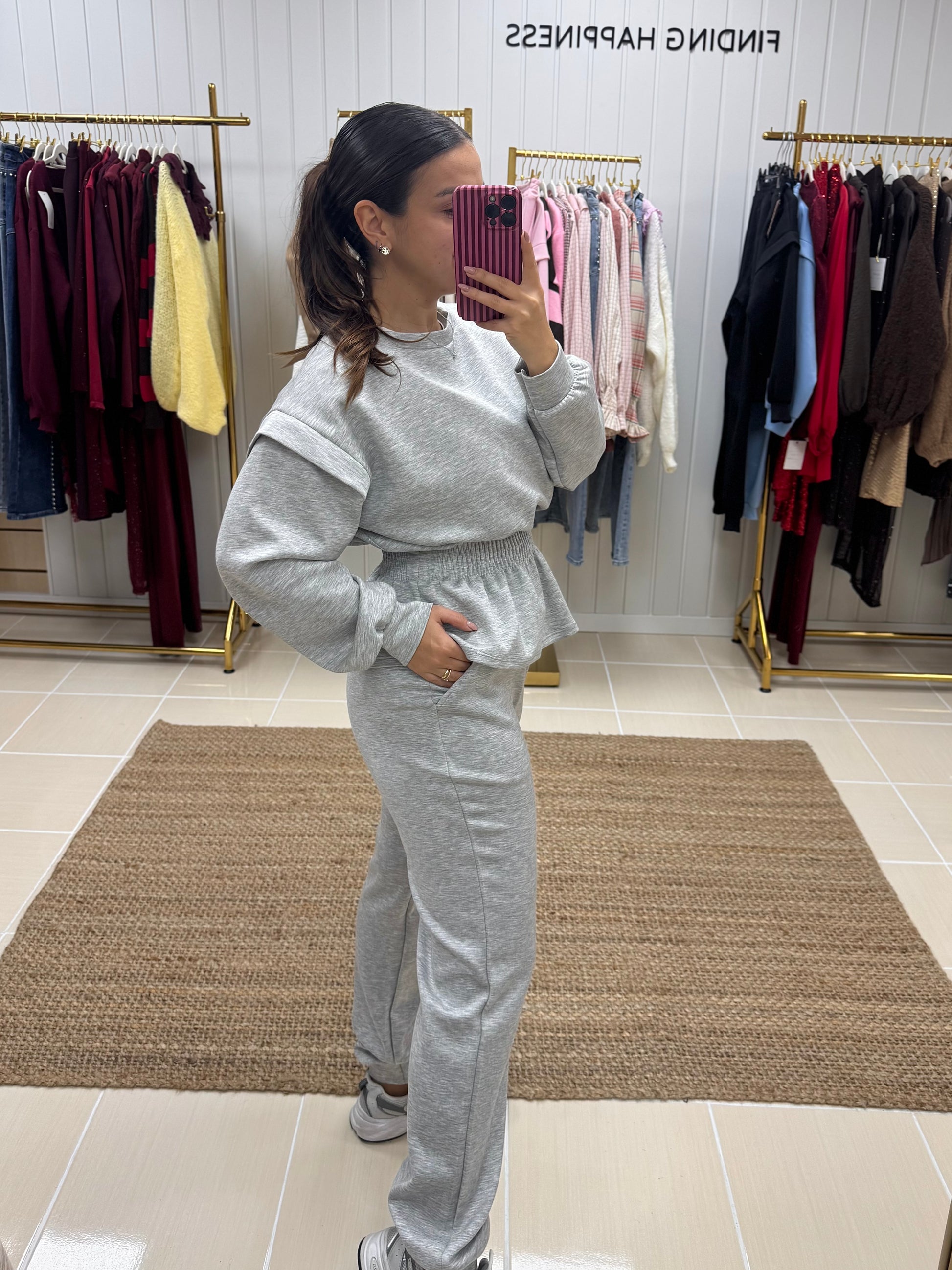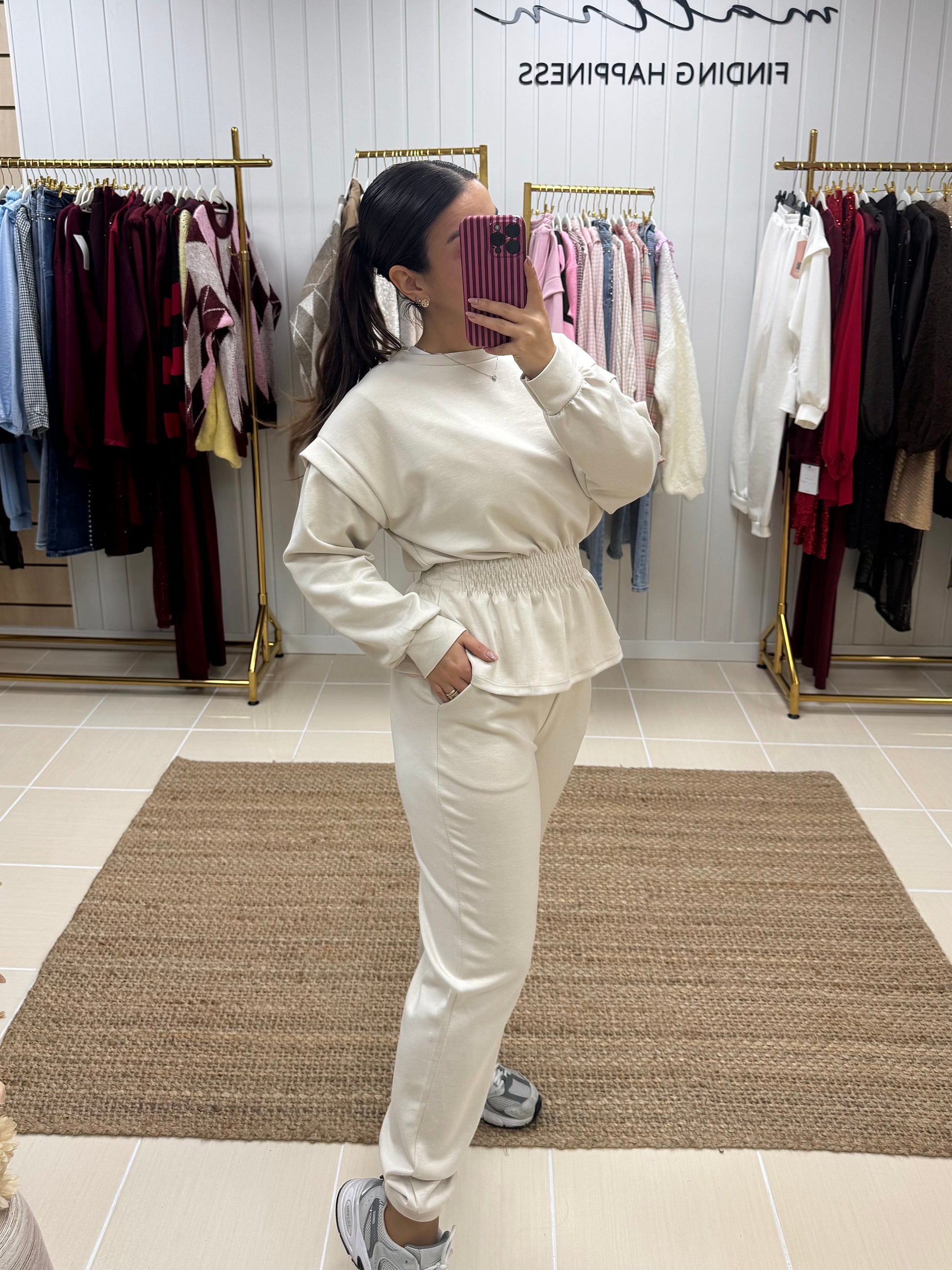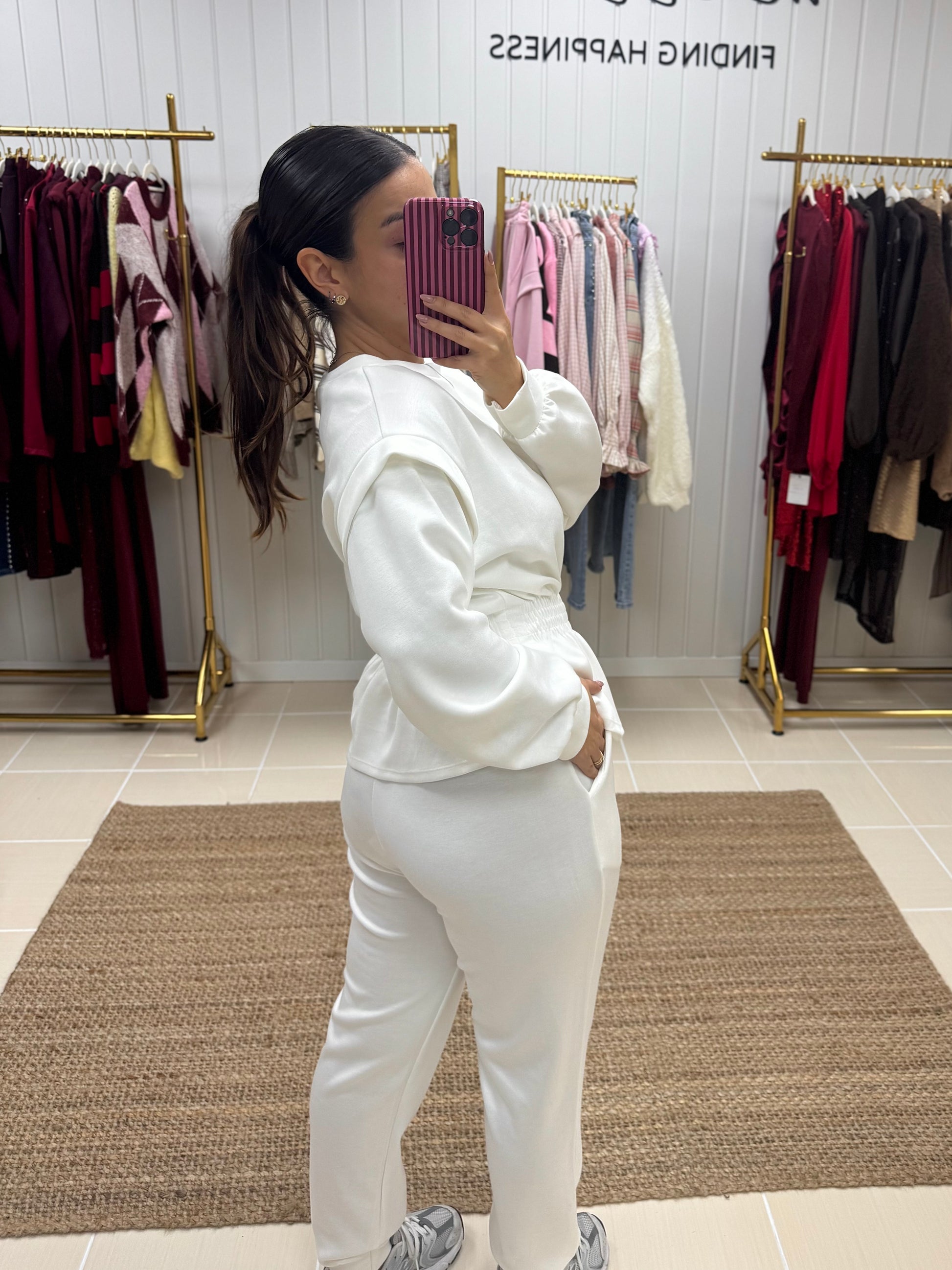 Fato de treino pensado para quem procura conforto sem abdicar de estilo. Composto por sweatshirt de corte fluido, mangas compridas e detalhe de franzido elástico na cintura, que valoriza a silhueta de forma subtil. As calças de cintura subida apresentam um corte direito, garantindo um ajuste confortável e elegante ao longo do dia.
