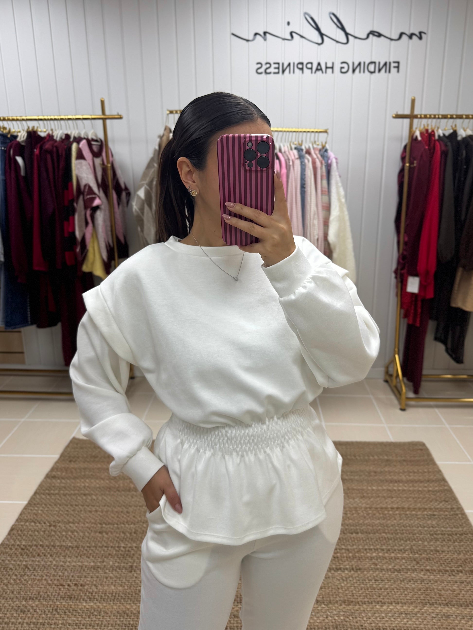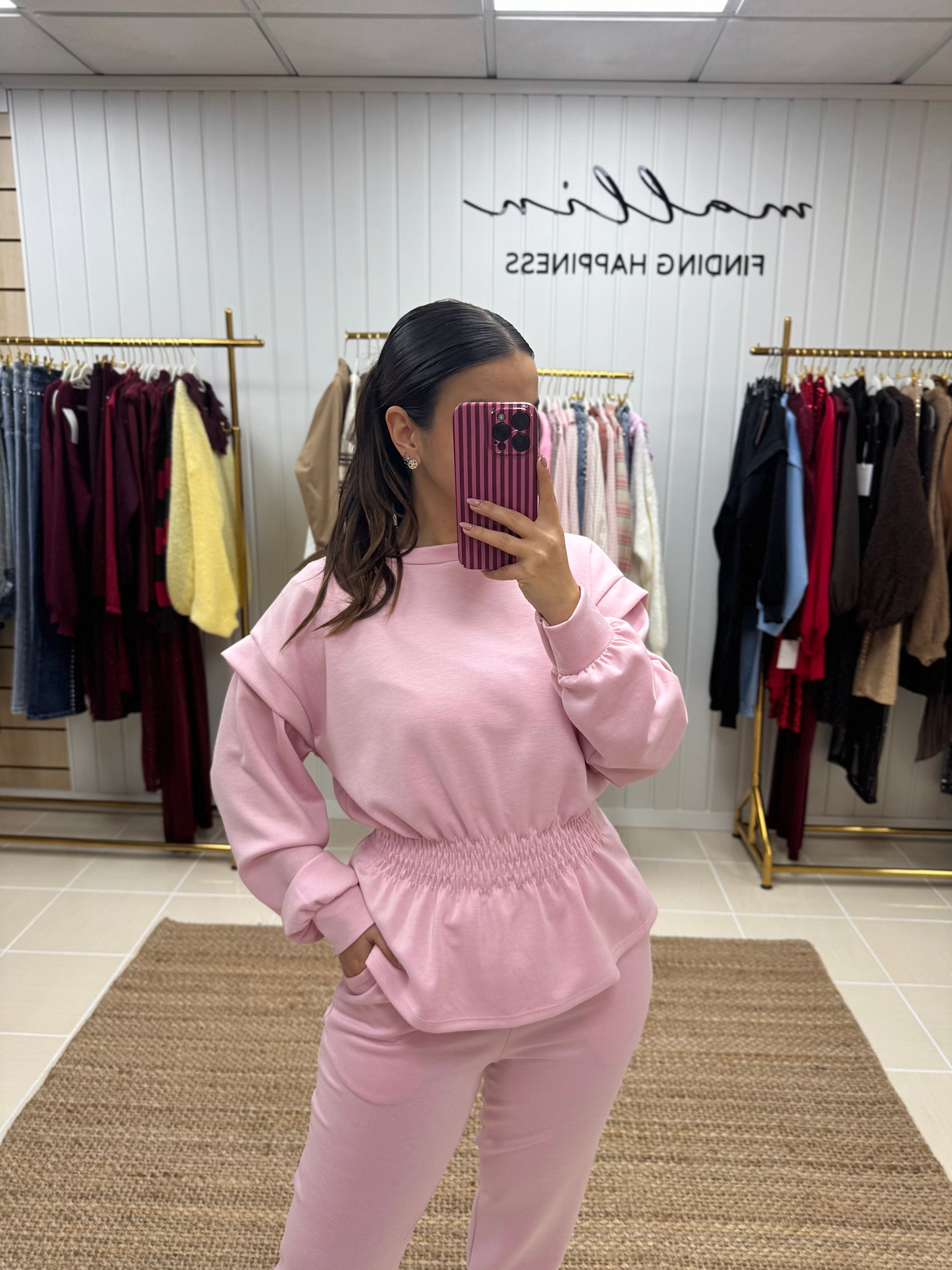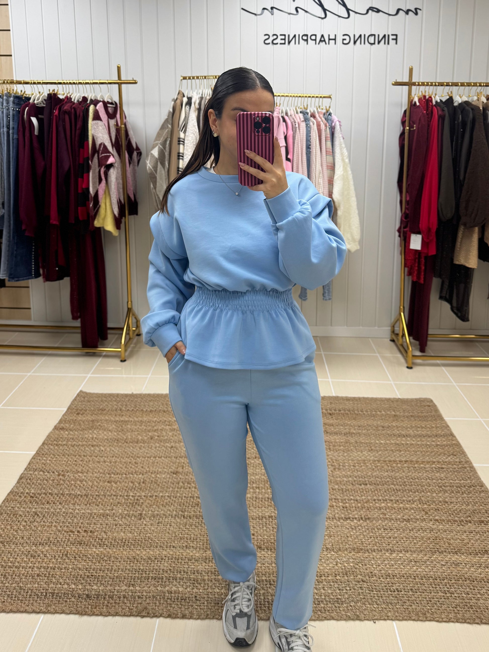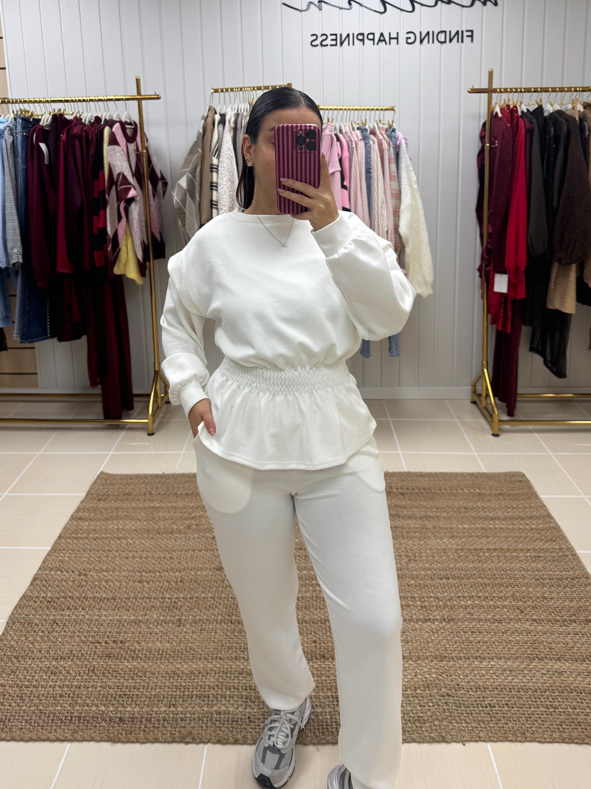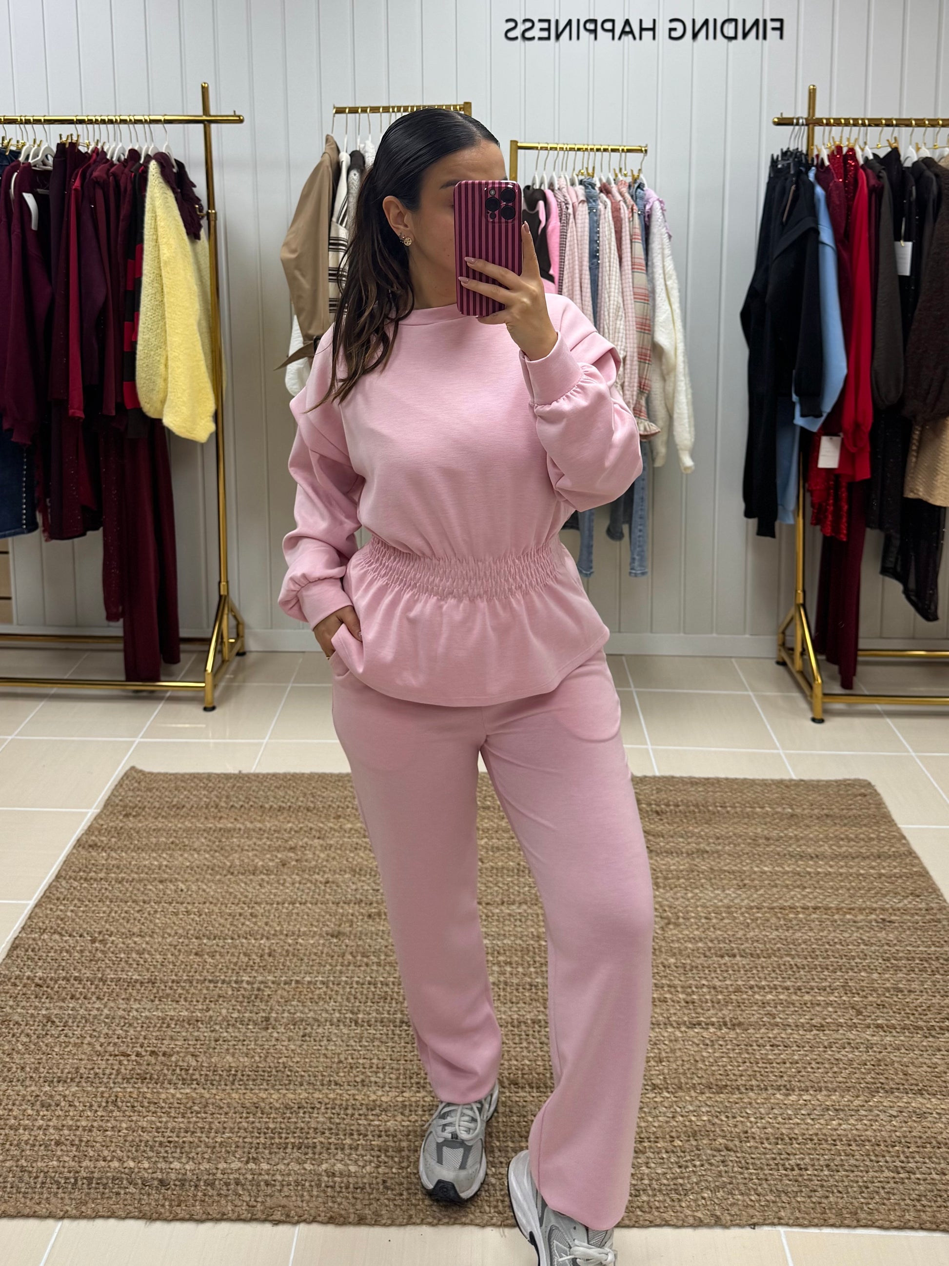 Fato de treino pensado para quem procura conforto sem abdicar de estilo. Composto por sweatshirt de corte fluido, mangas compridas e detalhe de franzido elástico na cintura, que valoriza a silhueta de forma subtil. As calças de cintura subida apresentam um corte direito, garantindo um ajuste confortável e elegante ao longo do dia.
