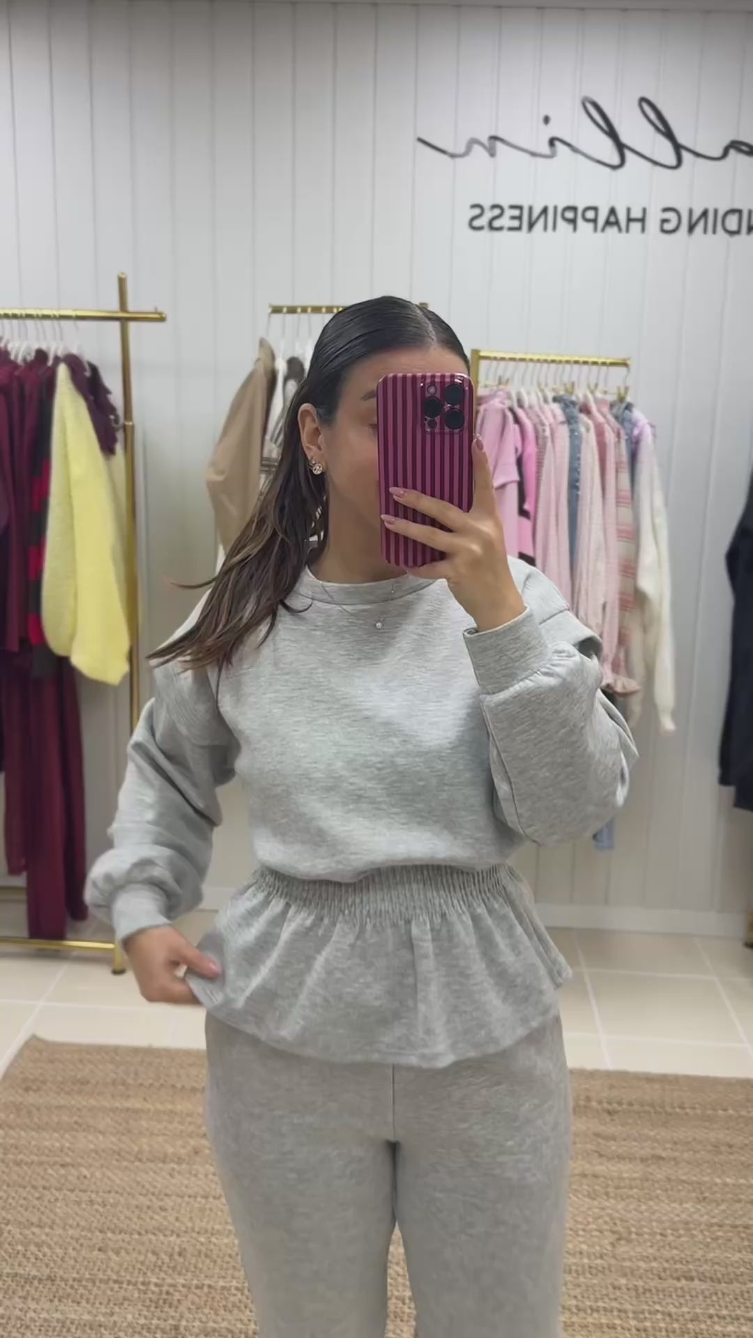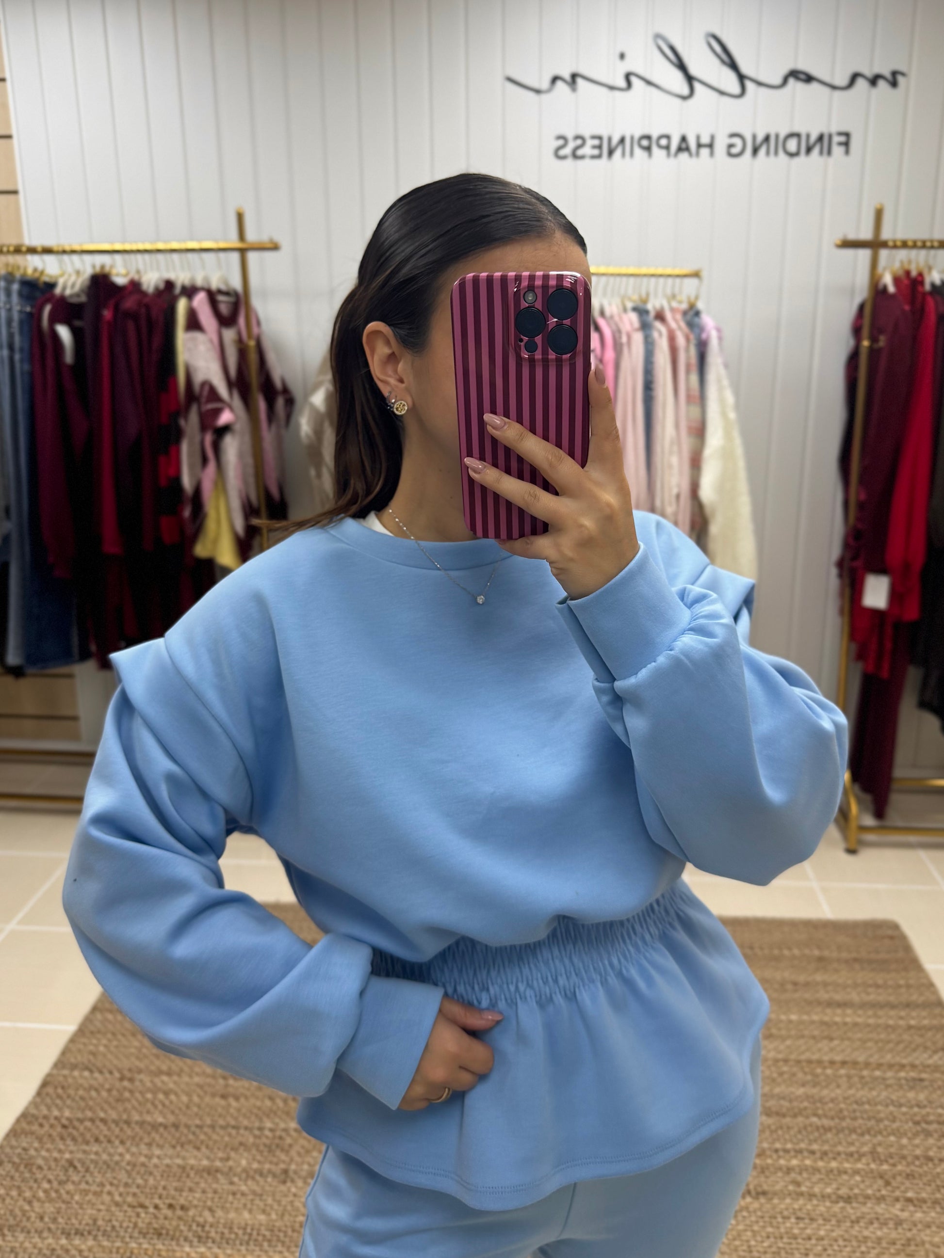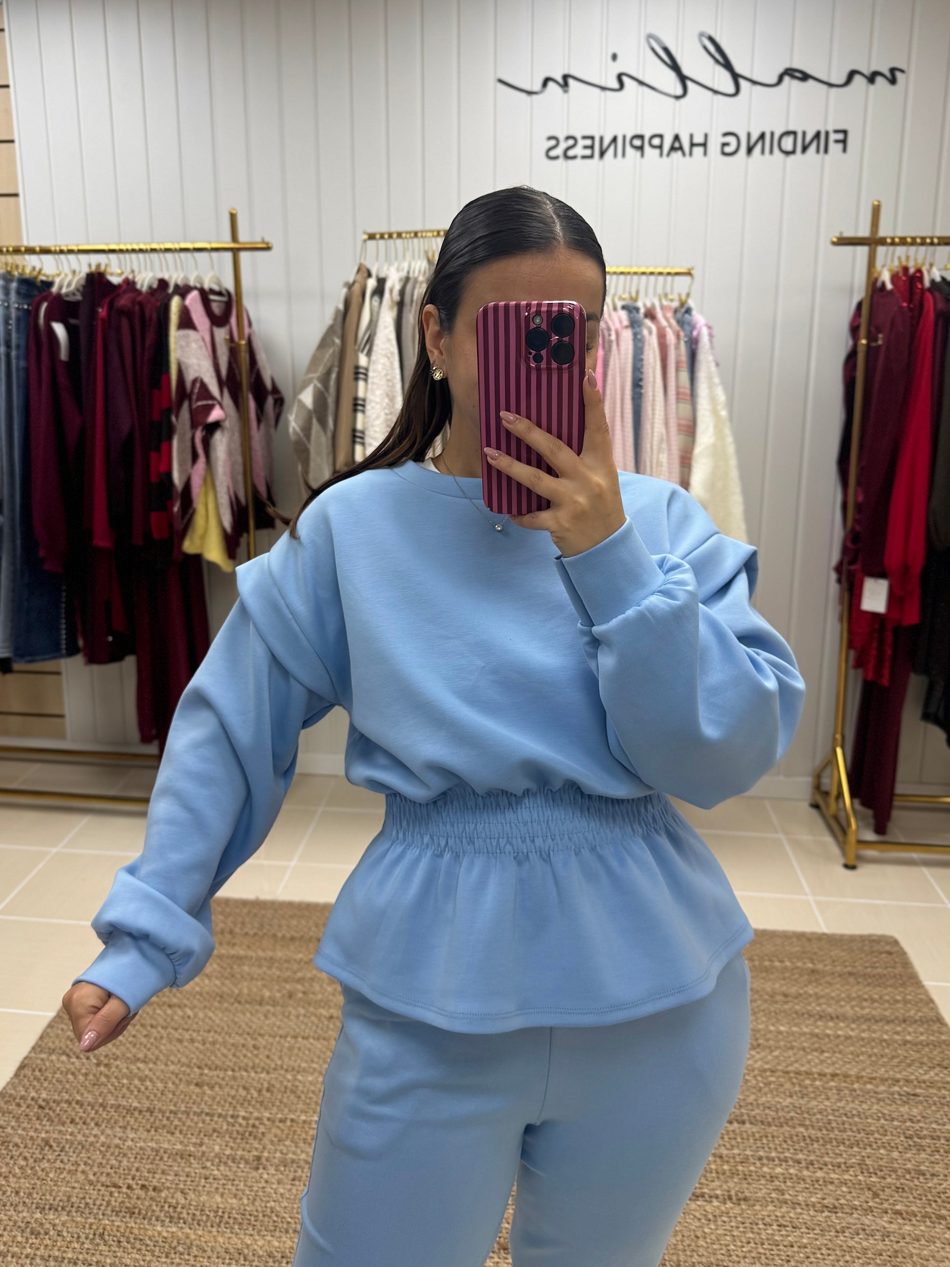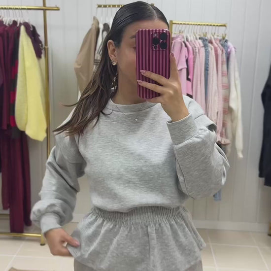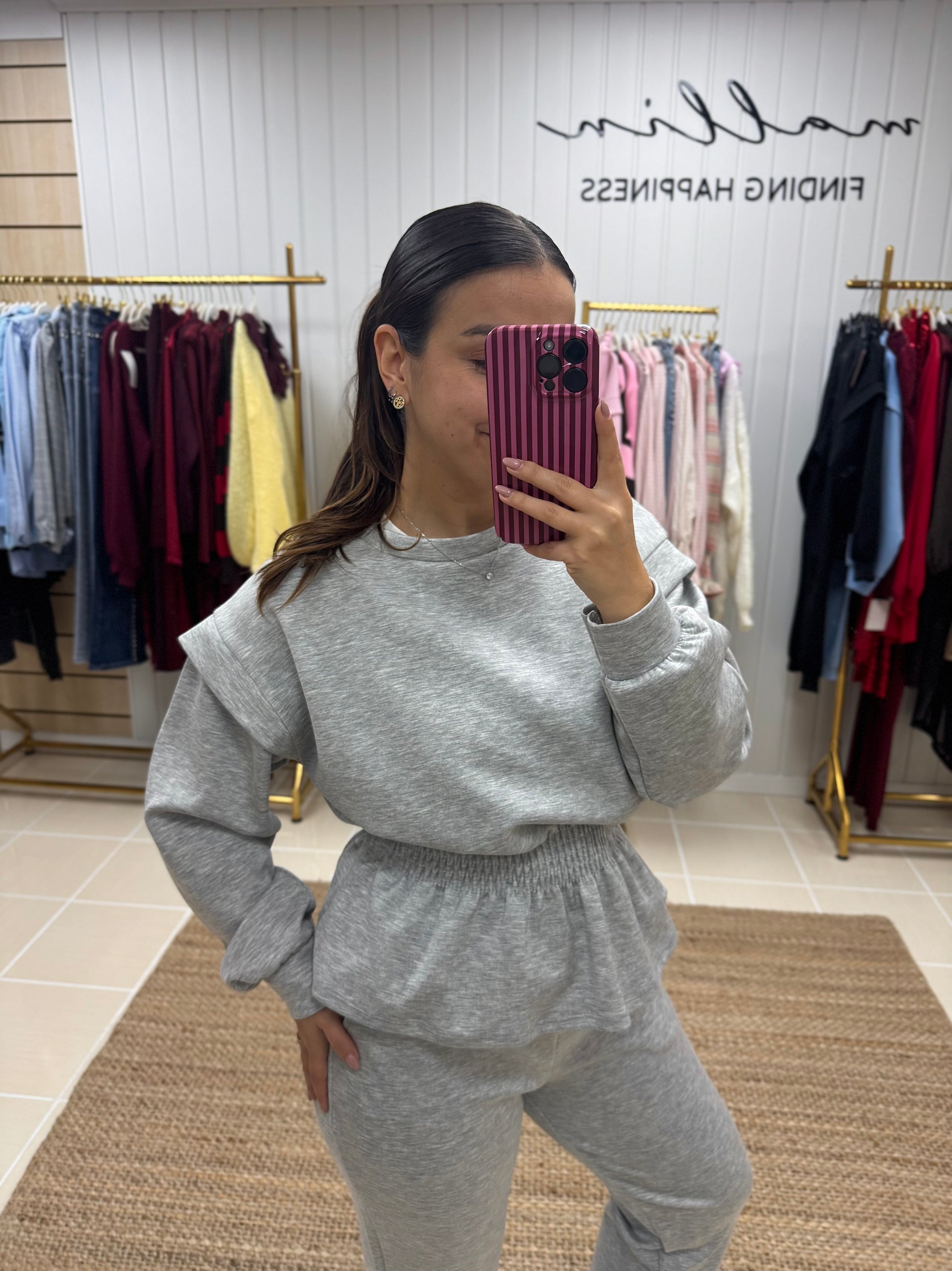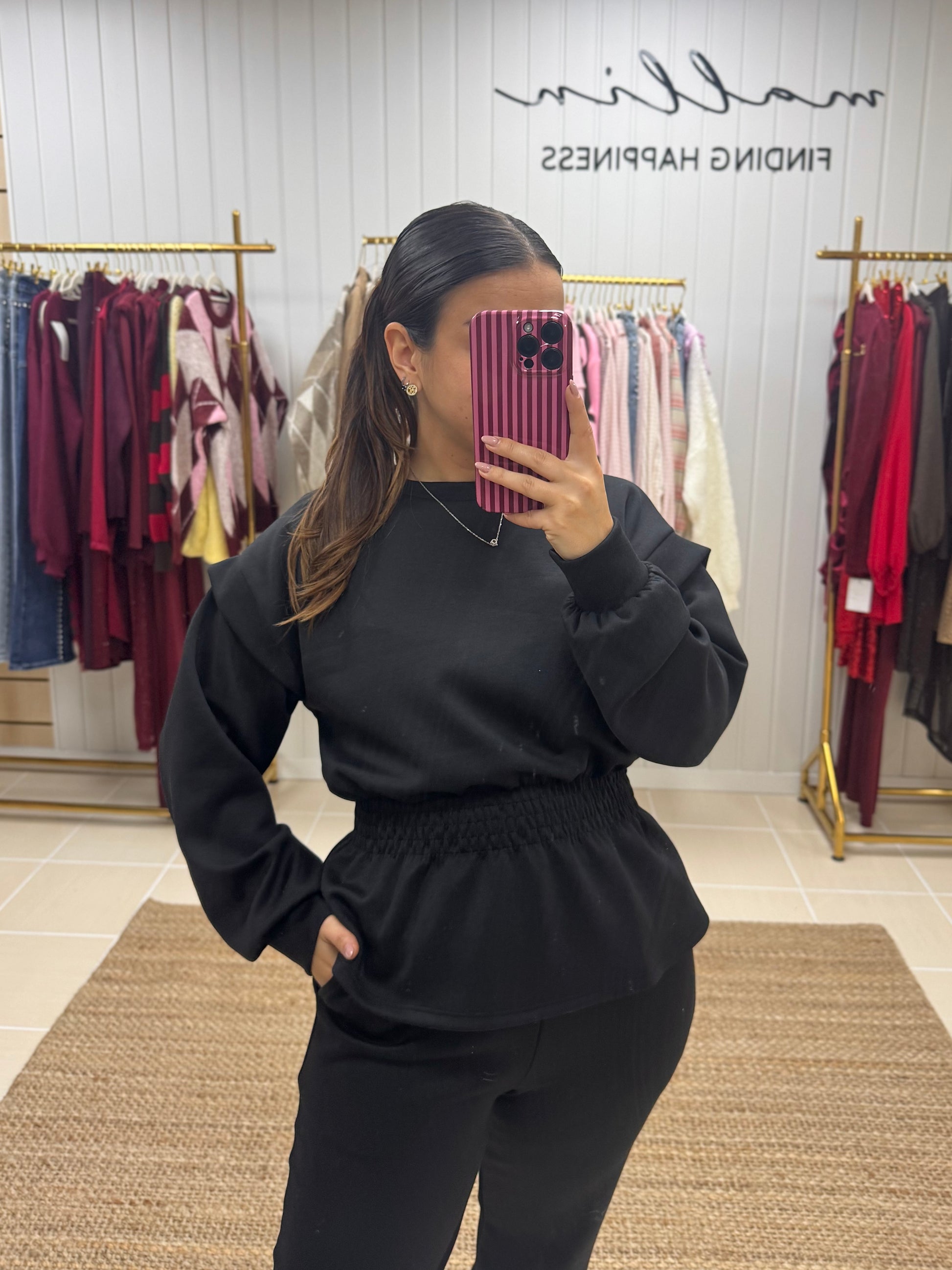 Fato de treino pensado para quem procura conforto sem abdicar de estilo. Composto por sweatshirt de corte fluido, mangas compridas e detalhe de franzido elástico na cintura, que valoriza a silhueta de forma subtil. As calças de cintura subida apresentam um corte direito, garantindo um ajuste confortável e elegante ao longo do dia.
