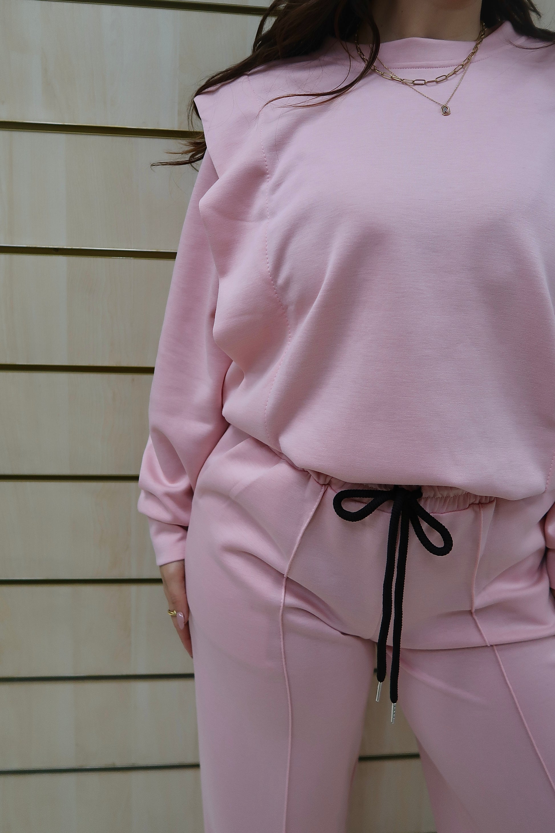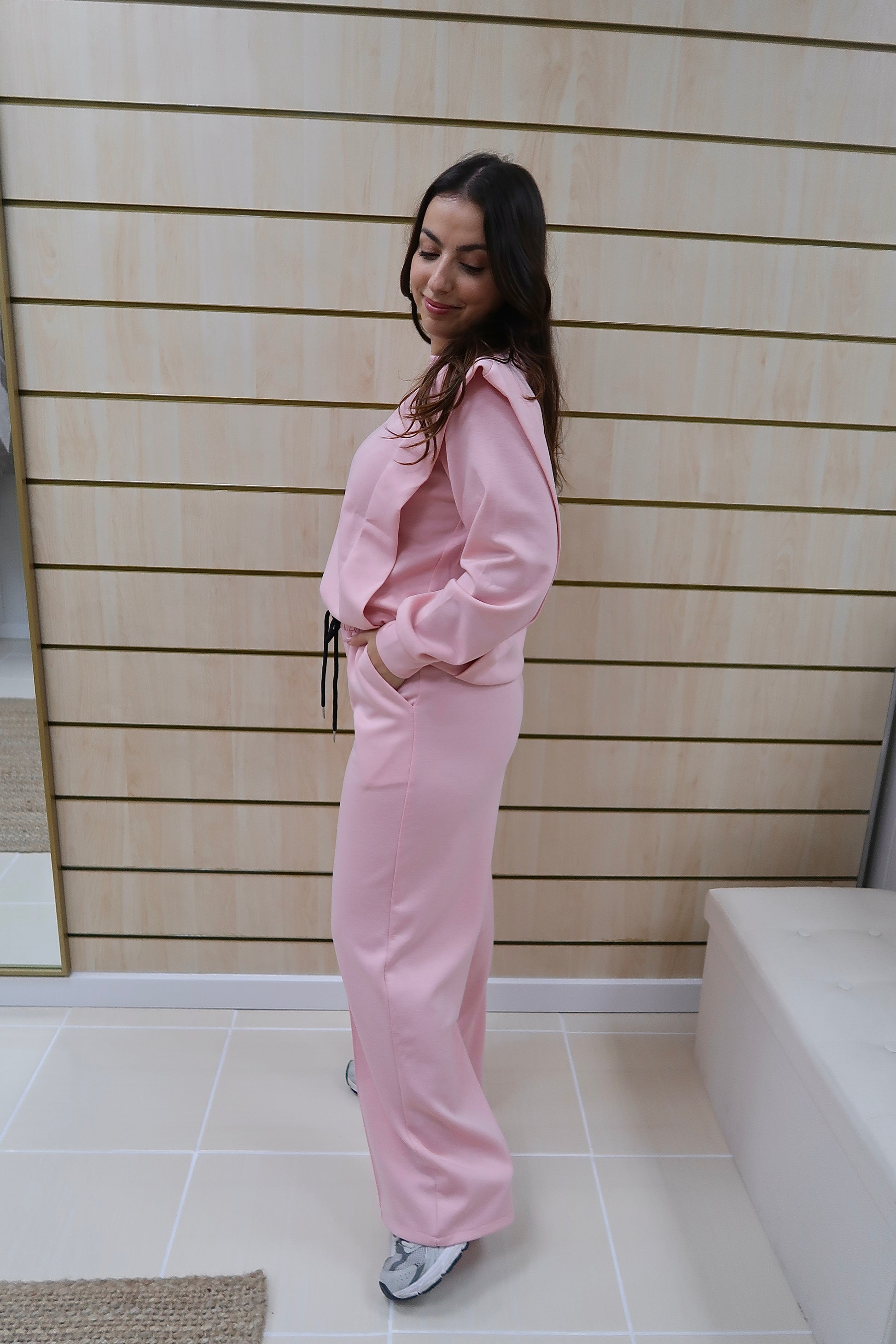 Combina conforto e elegância num design moderno e feminino. Composto por sweatshirt de manga comprida e calças de corte direito. A sweatshirt apresenta um corte solto e minimalista, garantindo conforto ao longo do dia. As calças de cintura elástica com cordão ajustável e bolsos laterais oferecem praticidade, enquanto o corte direito alonga a silhueta. Ideal para o dia a dia, viagens ou momentos de lazer, sem abdicar de sofisticação.