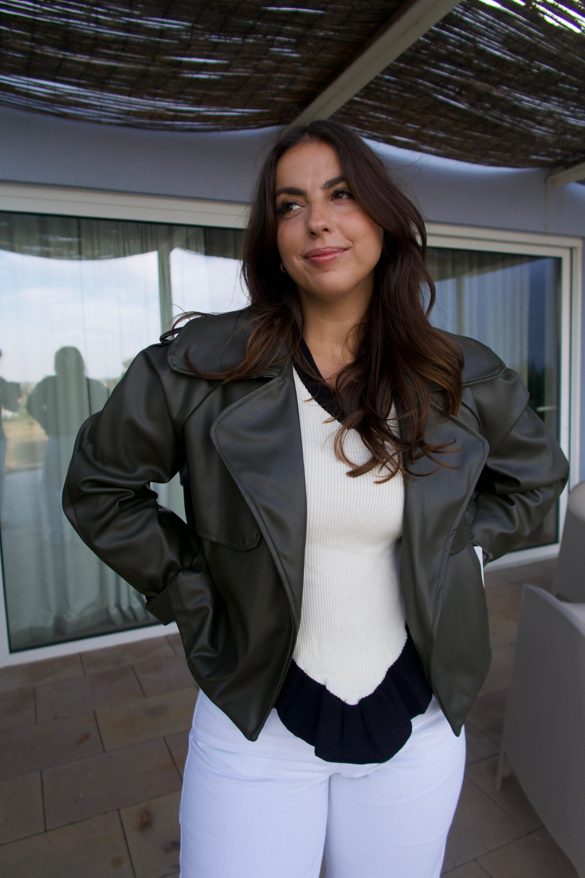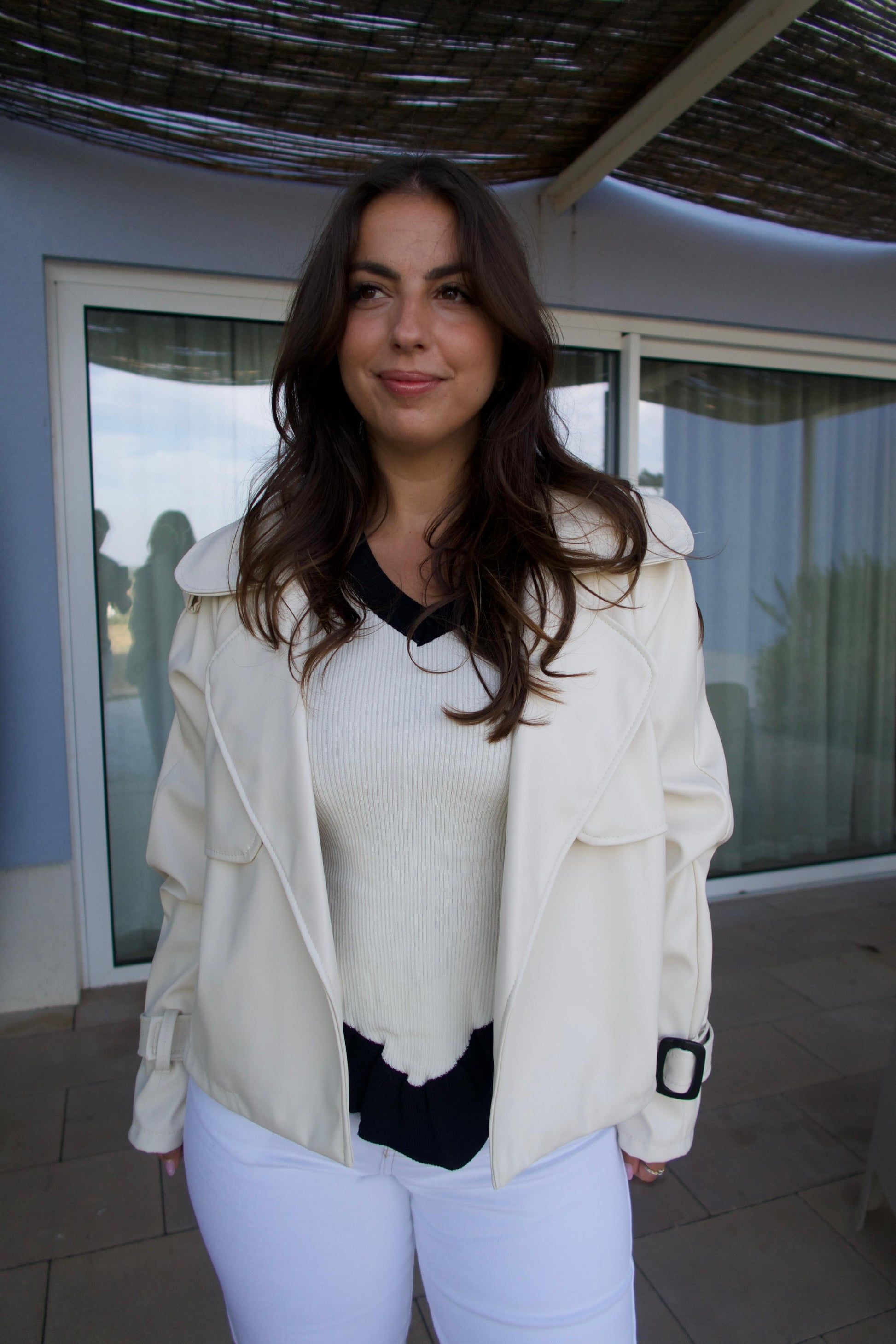 Elegante, versátil e intemporal: assim descrevemos a nossa gabardine com um corte moderno e comprimento curto. O acabamento em polipele confere um toque sofisticado e trendy, perfeito para a meia-estação ou dias mais frescos.