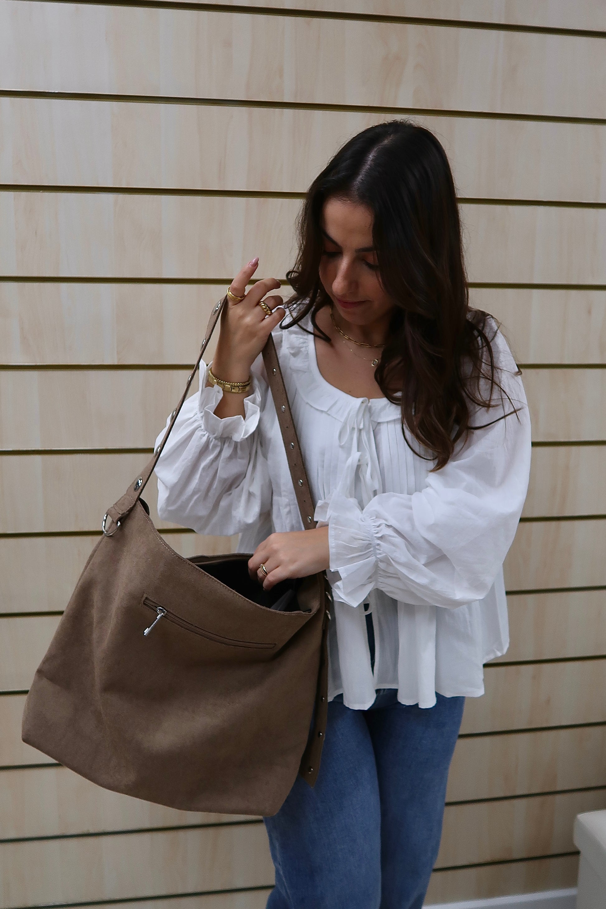 Mala de ombro em camurça, com um design moderno e sofisticado que alia estilo e funcionalidade. Destaca-se pela alça larga ajustável, adornada com aplicações metálicas decorativas, que conferem um toque contemporâneo e diferenciador. O interior espaçoso permite transportar todos os essenciais do dia a dia com conforto, enquanto o fecho garante maior segurança. Uma peça versátil, ideal para complementar looks casuais ou elevar produções mais elegantes.