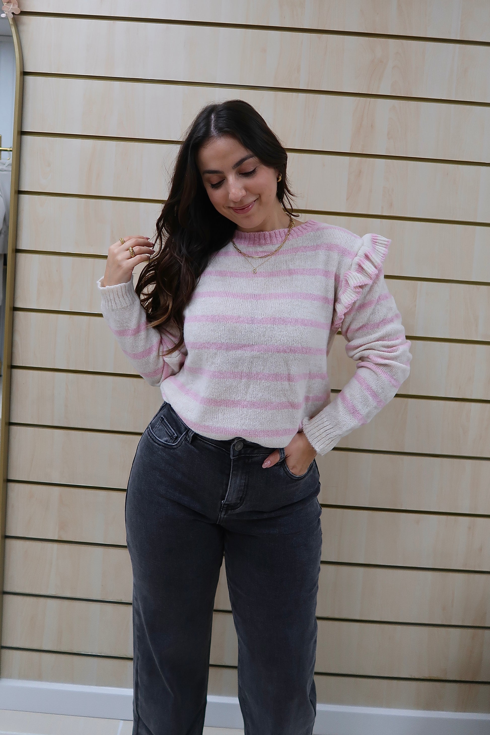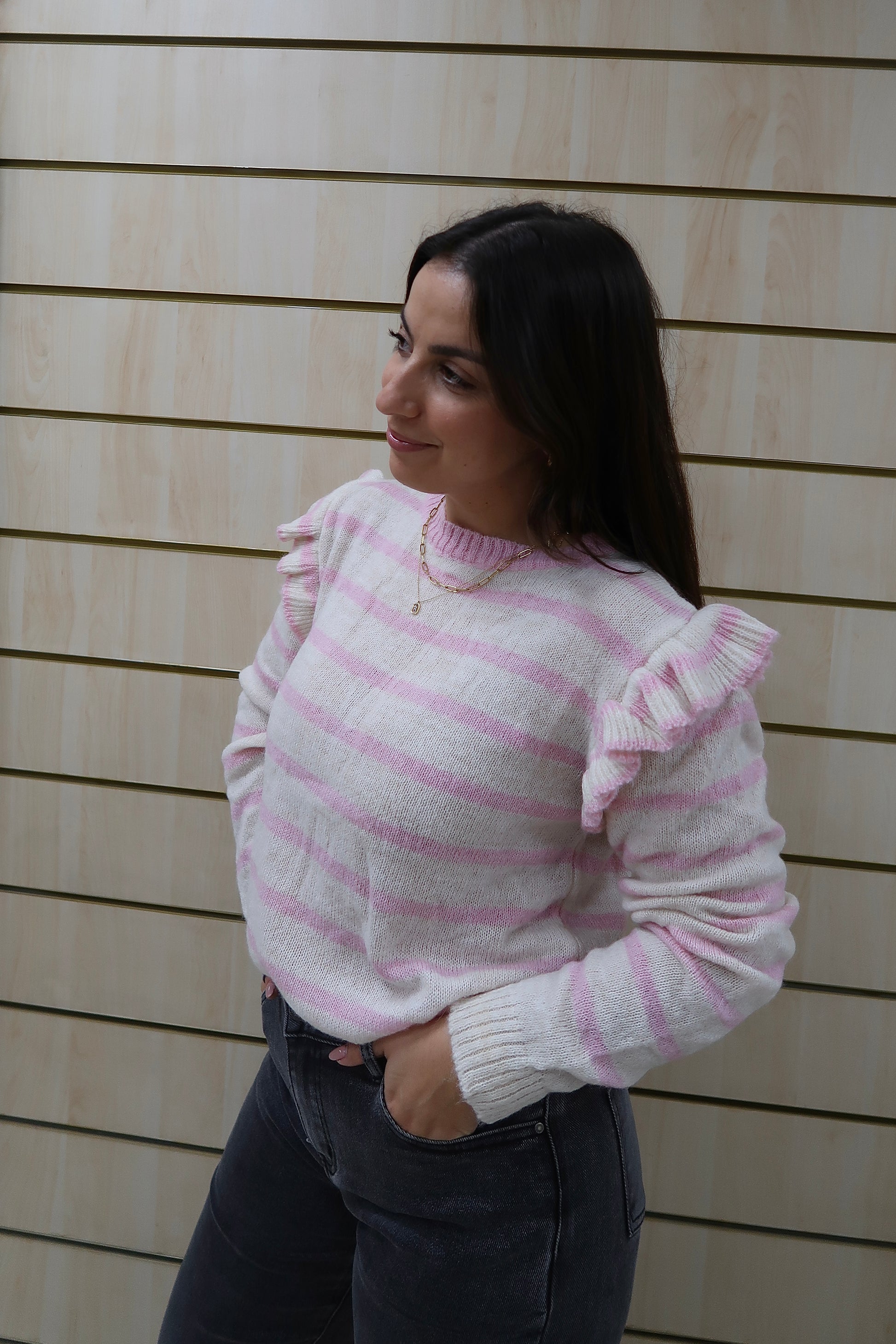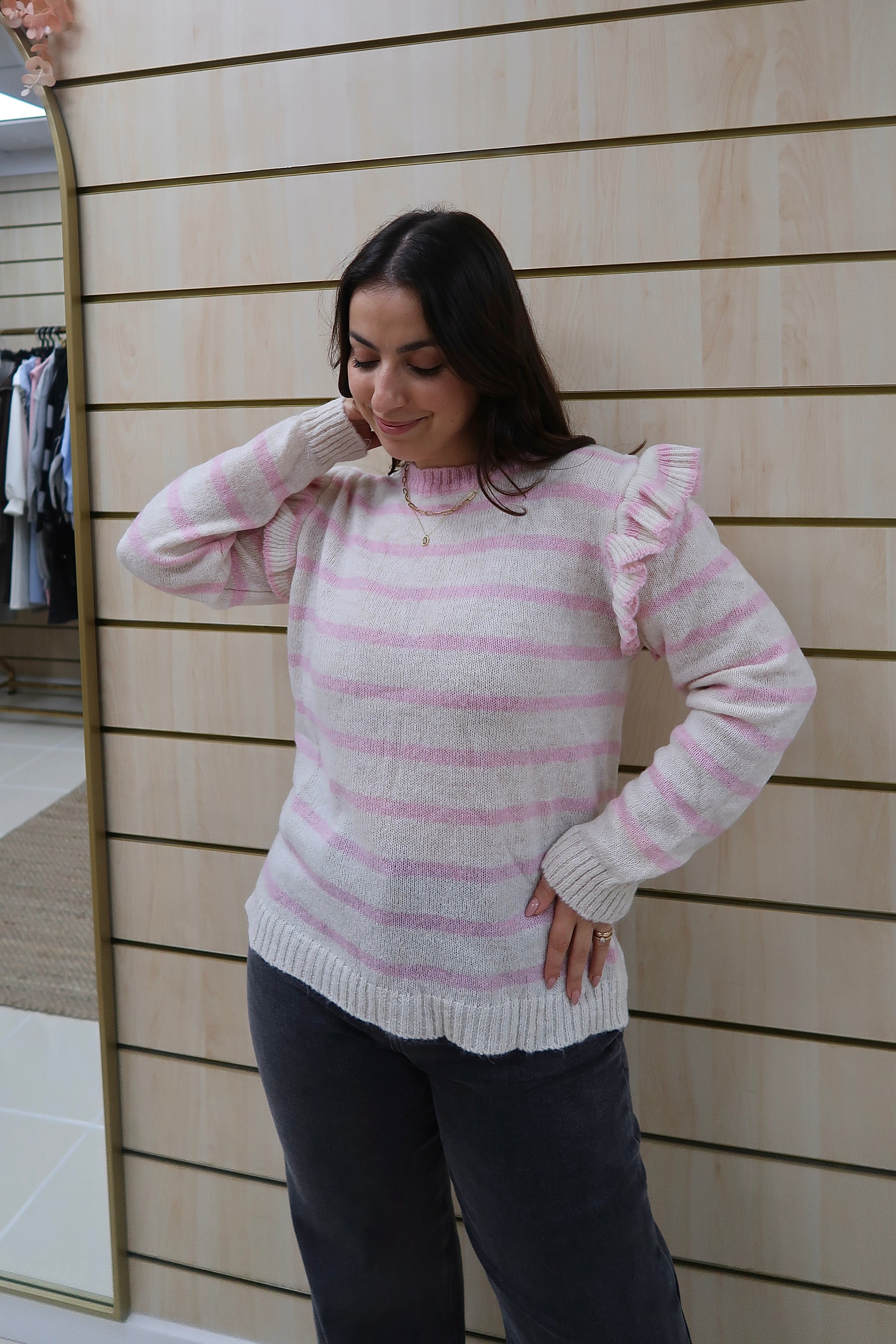 O detalhe de folhos nos ombros acrescenta um toque romântico e delicado, elevando a peça e tornando-a especial sem perder versatilidade. O decote redondo, os punhos e a bainha canelados garantem um acabamento cuidado e um ajuste confortável.