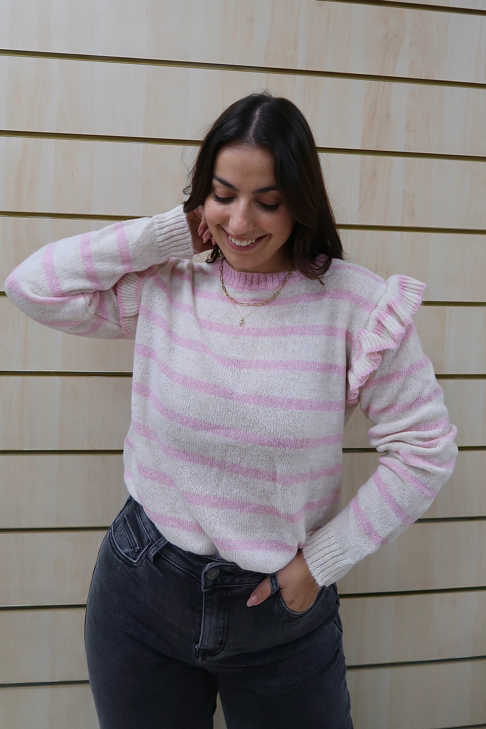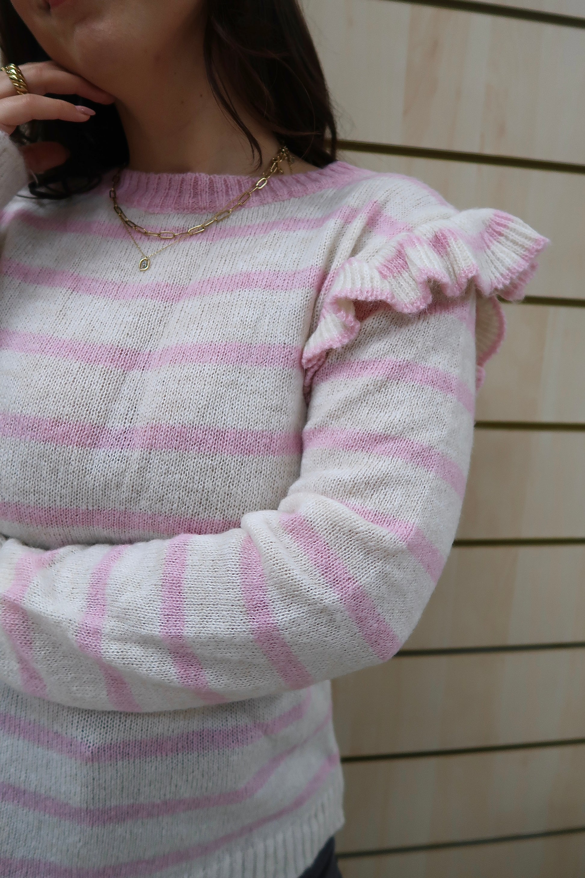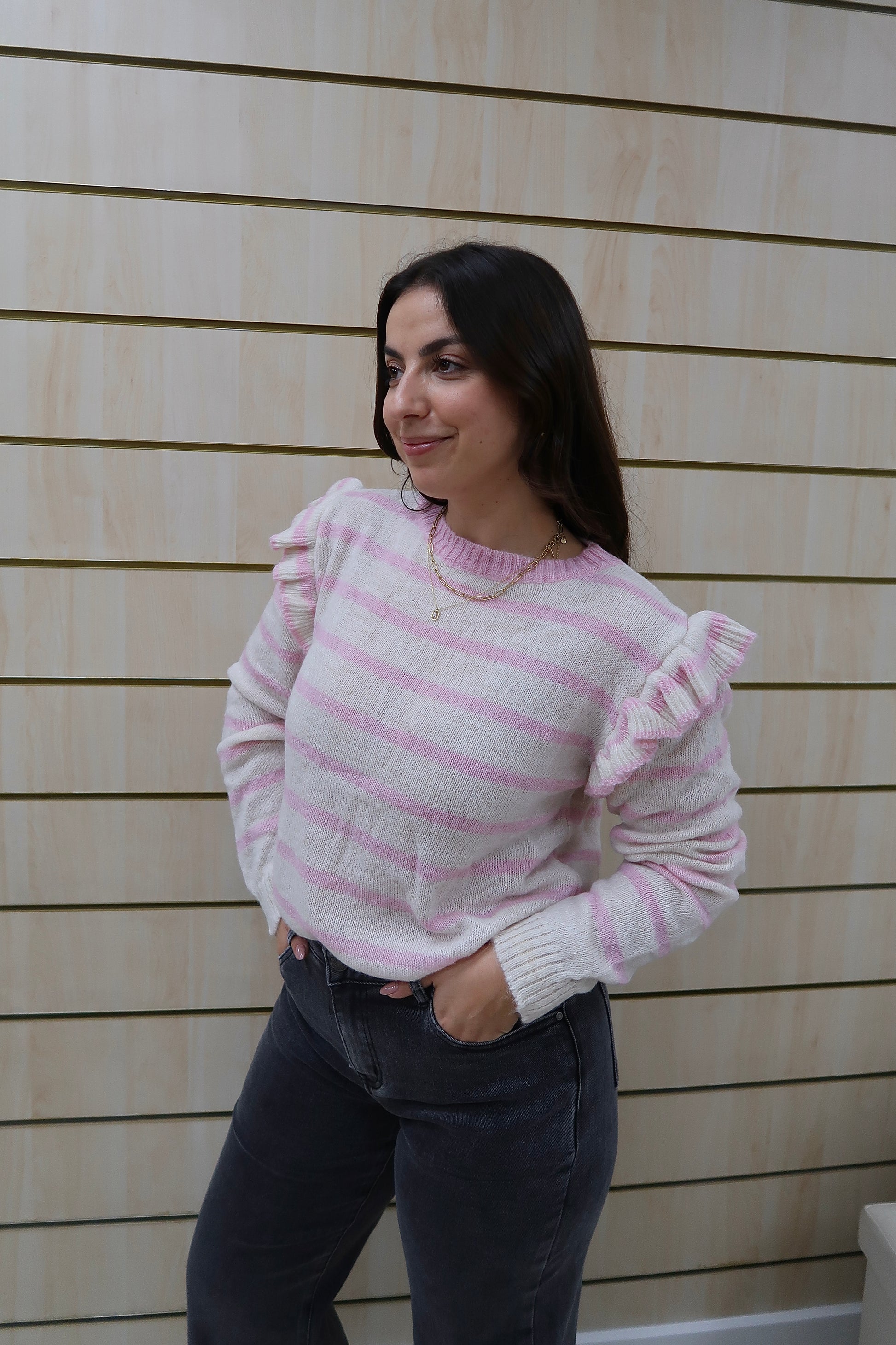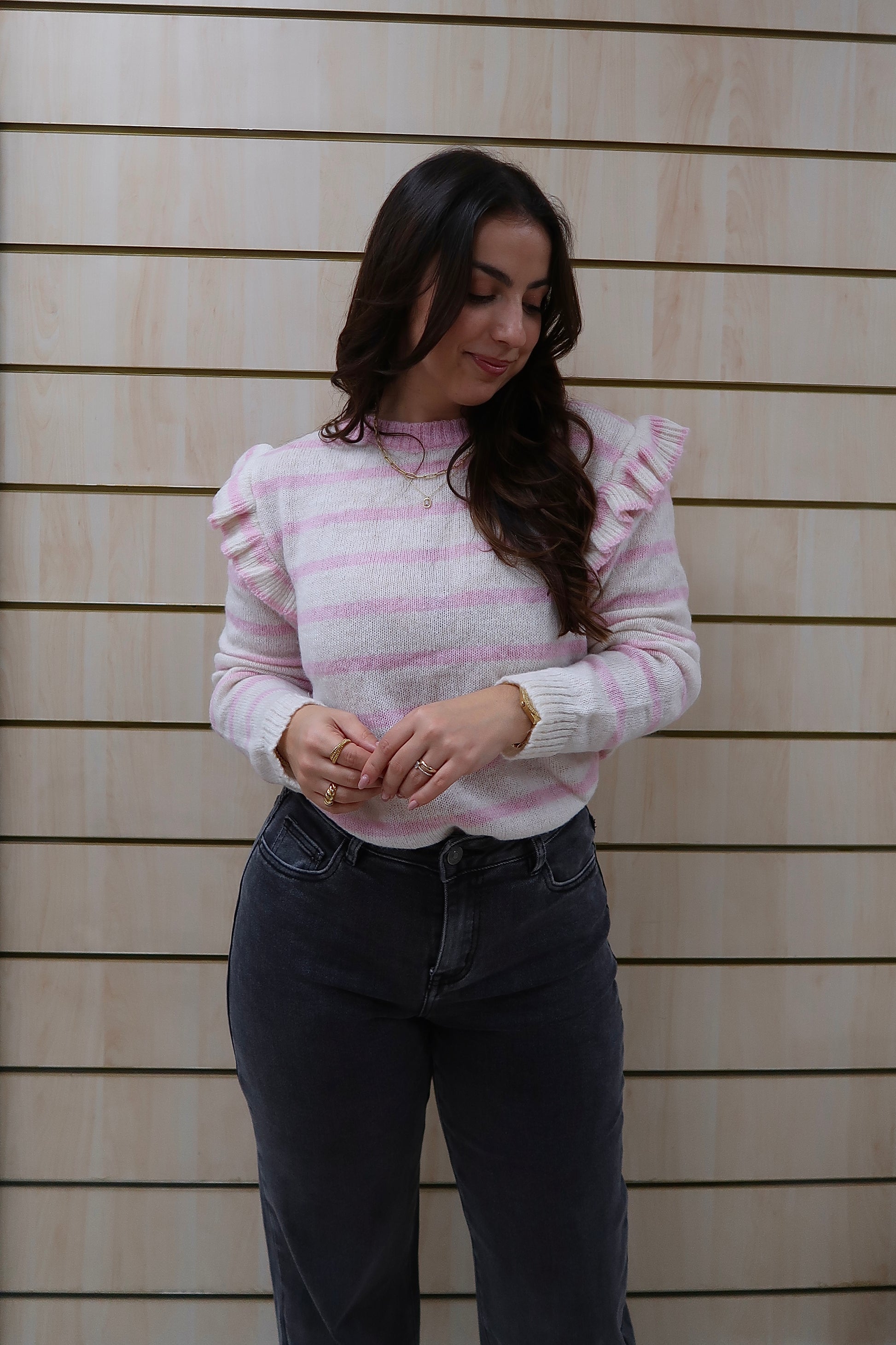 O detalhe de folhos nos ombros acrescenta um toque romântico e delicado, elevando a peça e tornando-a especial sem perder versatilidade. O decote redondo, os punhos e a bainha canelados garantem um acabamento cuidado e um ajuste confortável.