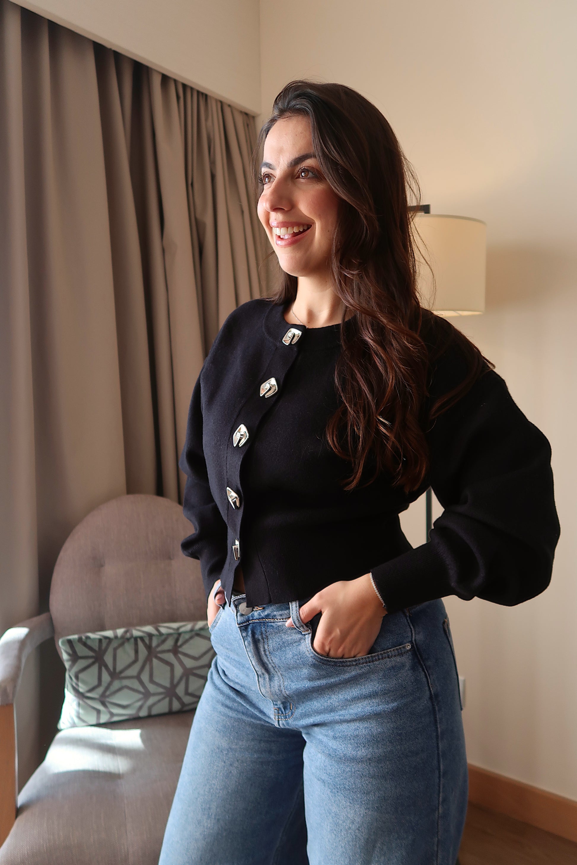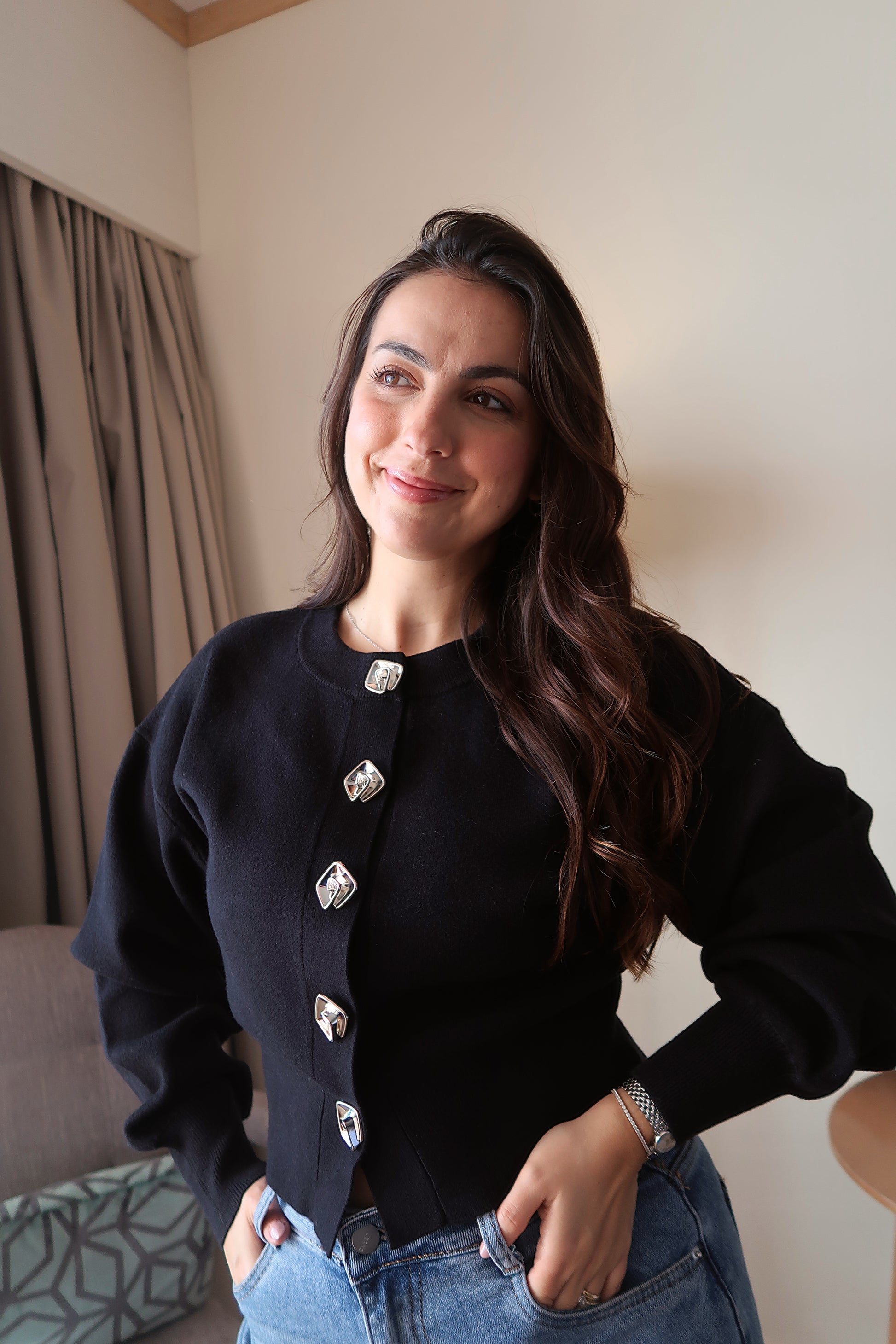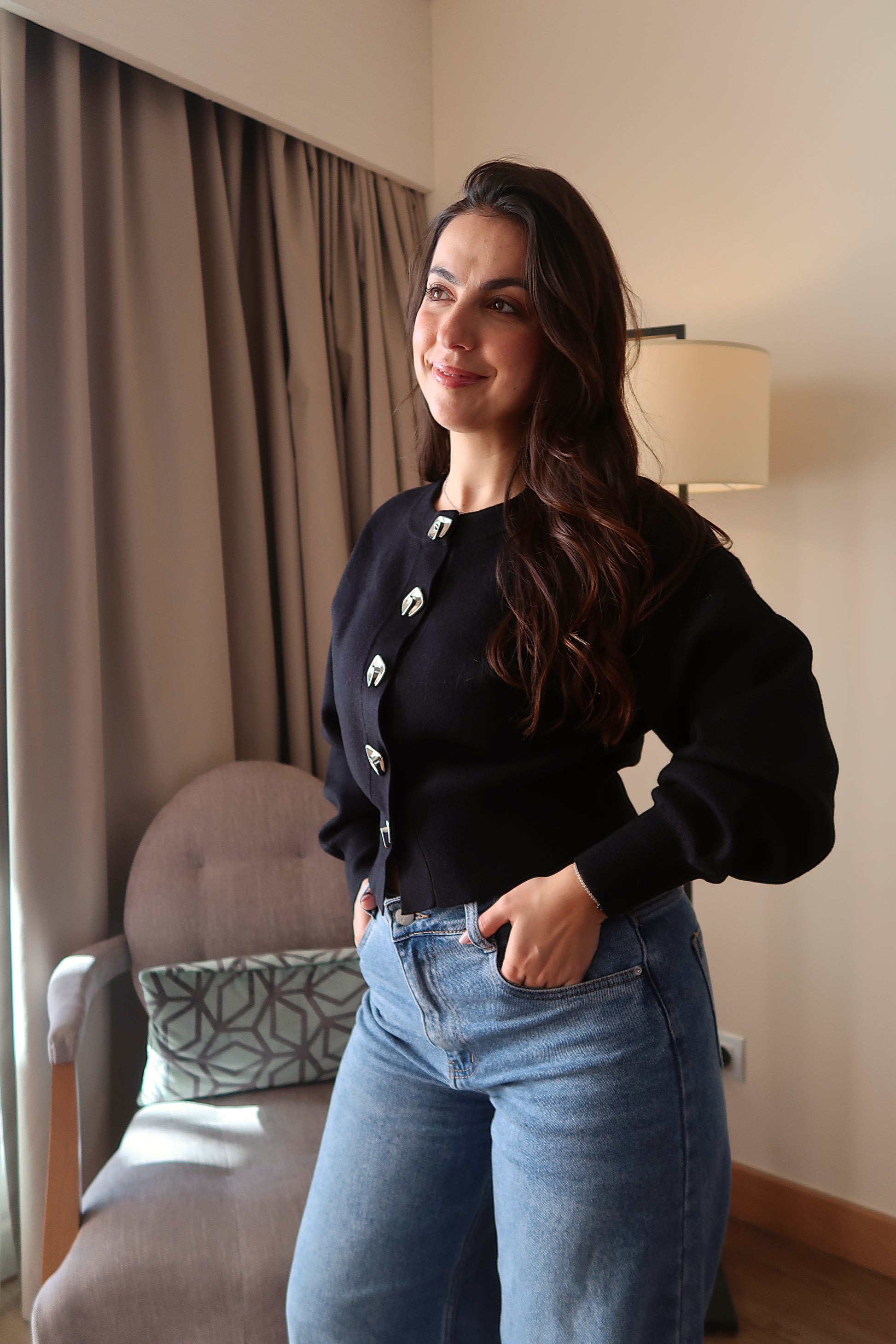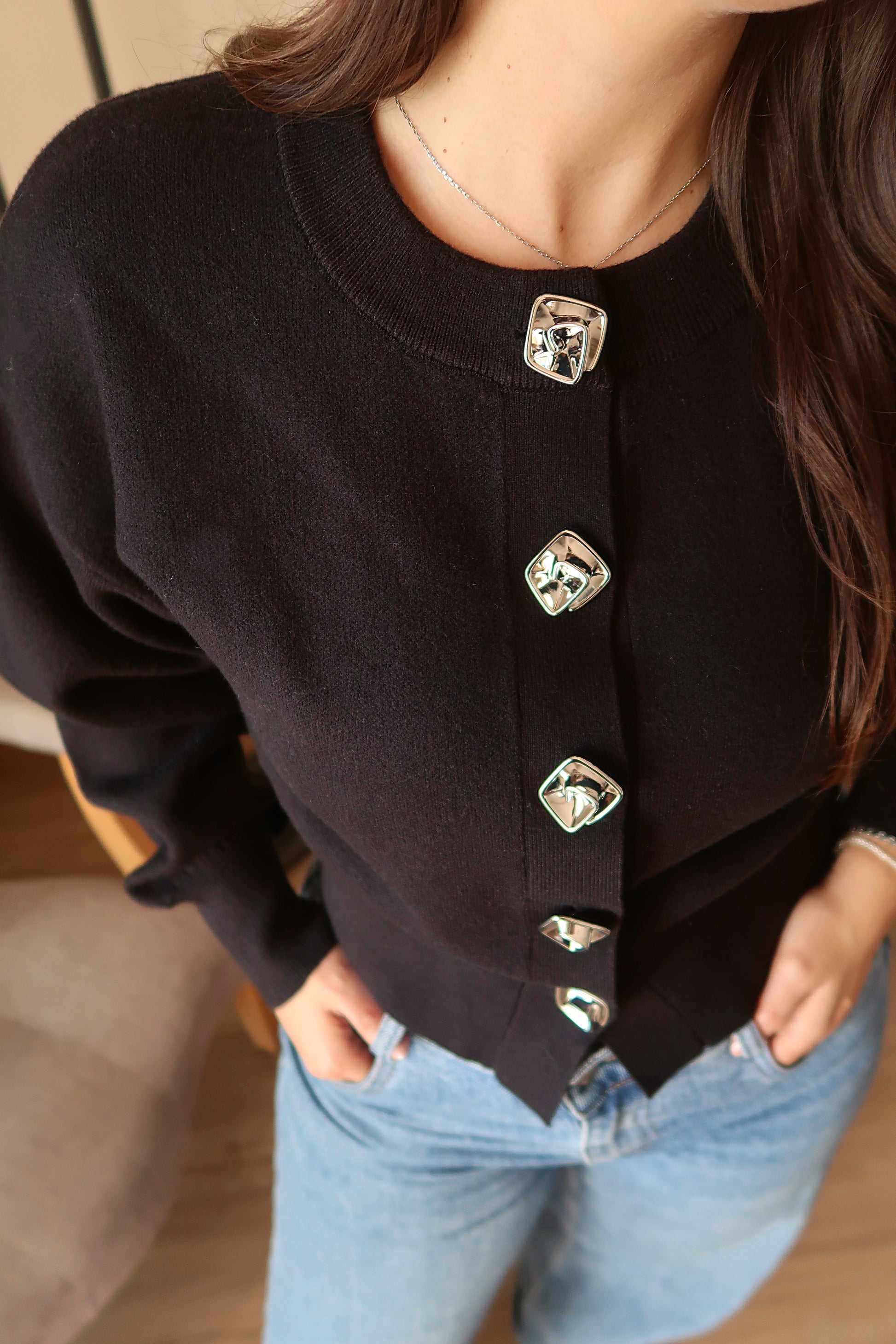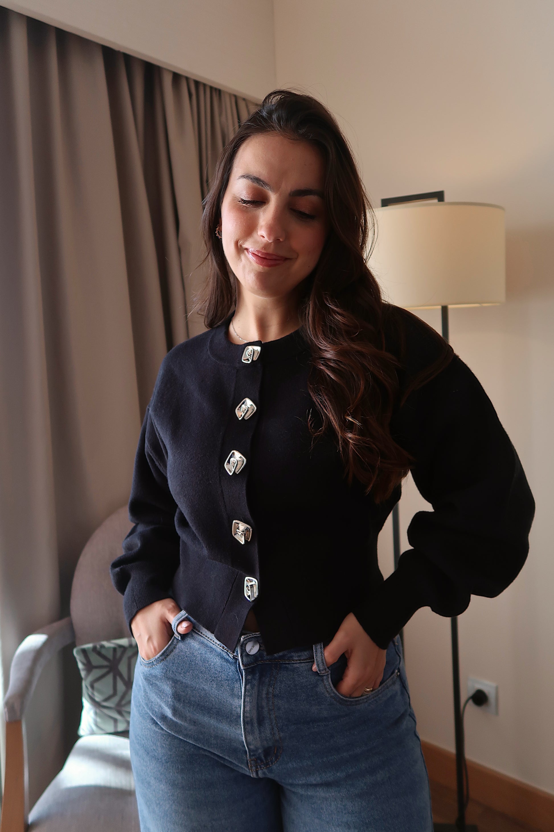 Confeccionada numa malha estruturada de toque macio, garante conforto ao longo do dia e um caimento firme que mantém a forma da peça. Esta malha afirma-se pelos seus detalhes cuidadosamente pensados e pela estética contemporânea. Os botões decorativos em metal conferem personalidade à peça, criando um equilíbrio perfeito entre simplicidade e sofisticação.