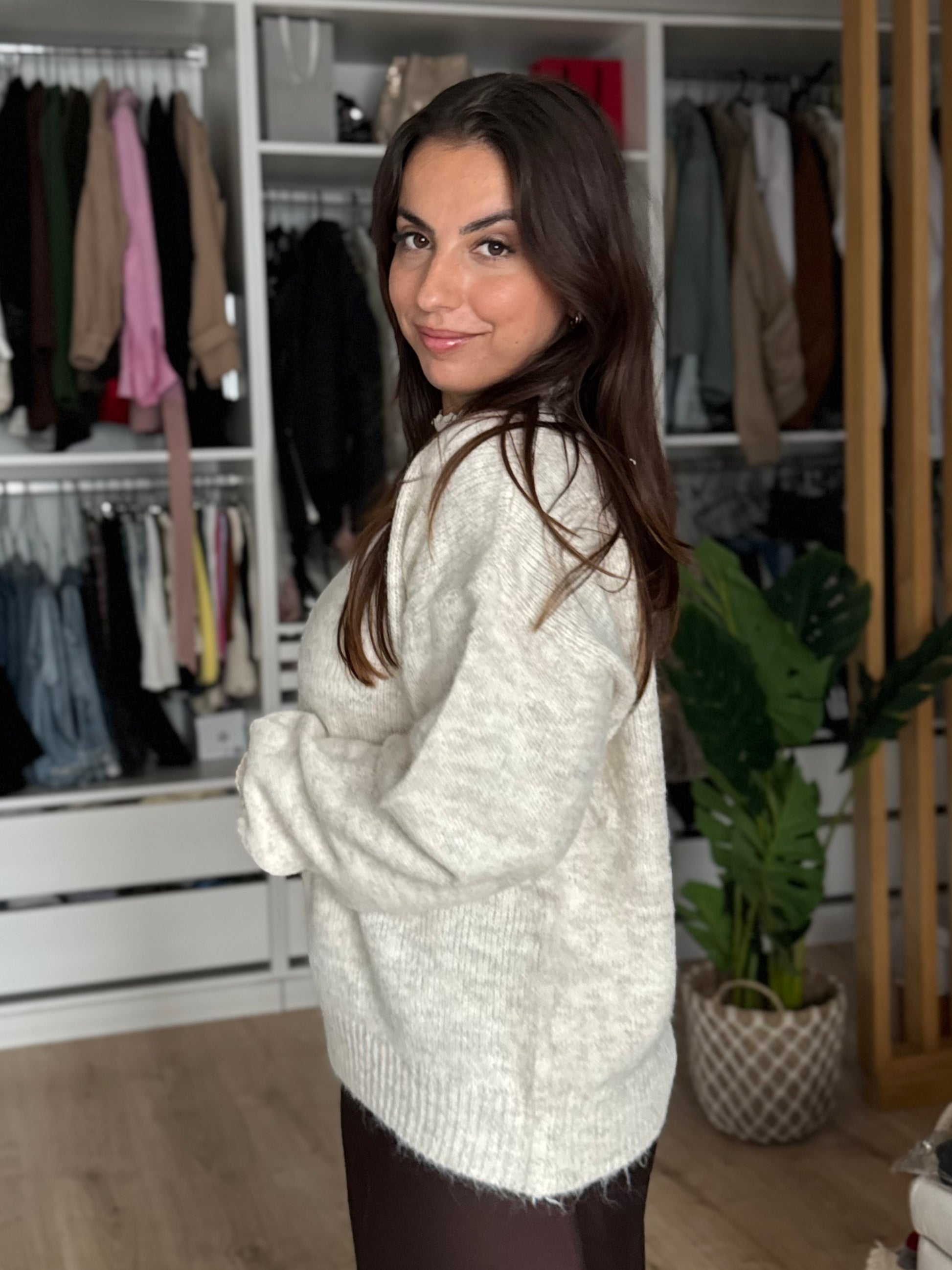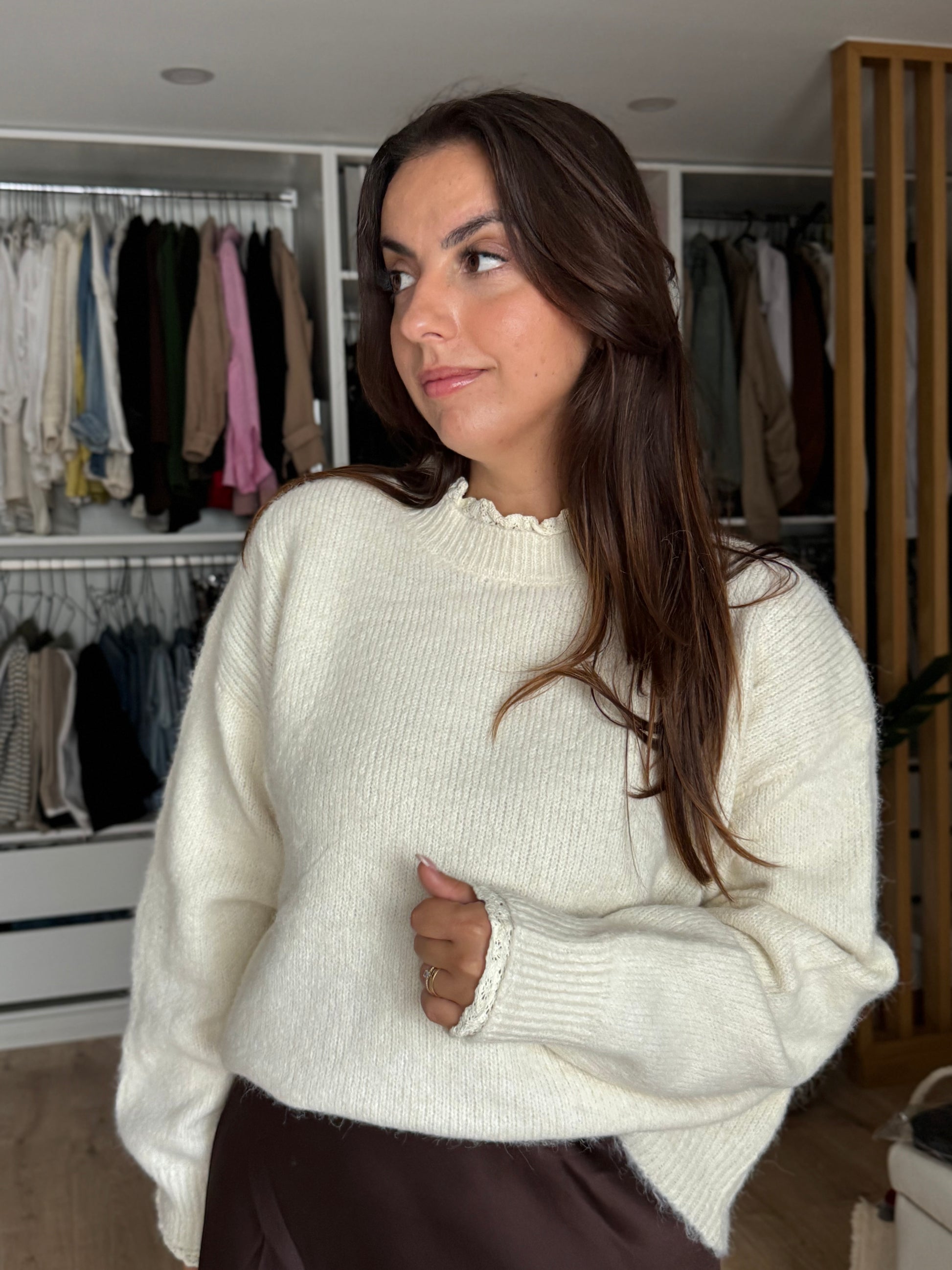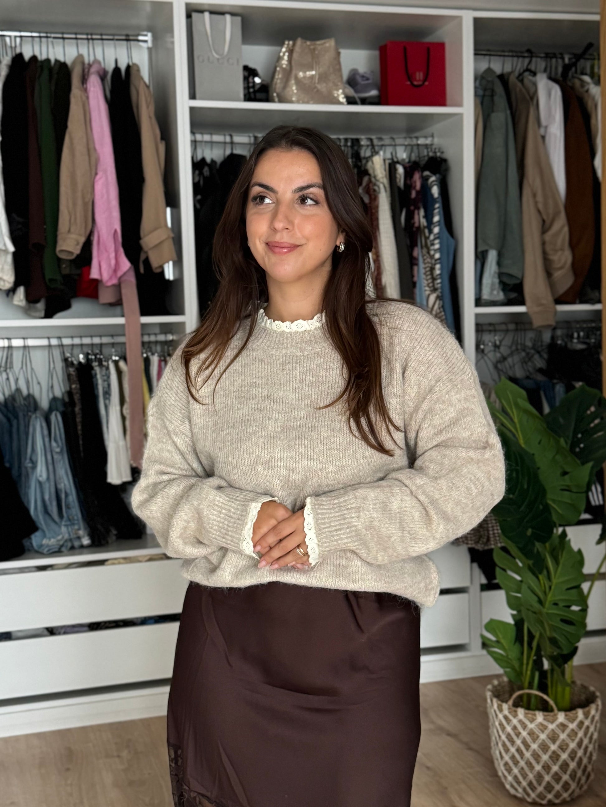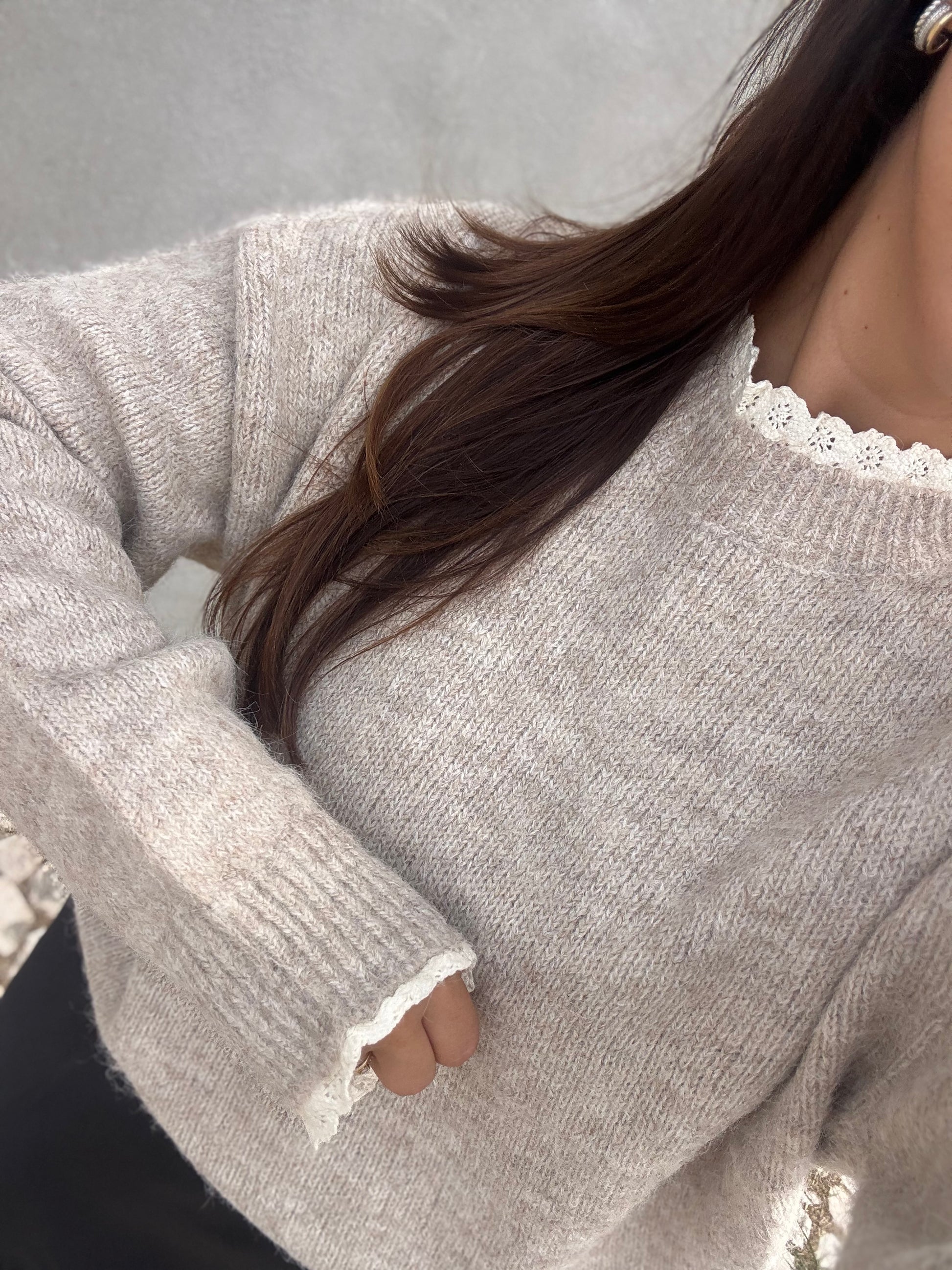Confortável, quente e com um toque sofisticado: esta malha é perfeita para a nova estação. Com um acabamento texturado suave, gola e manga com detalhes rendados e corte ligeiramente oversized, adapta-se a qualquer estilo e ocasião. Ideal para conjugar com saias, calças de ganga ou peças em tons outonais.