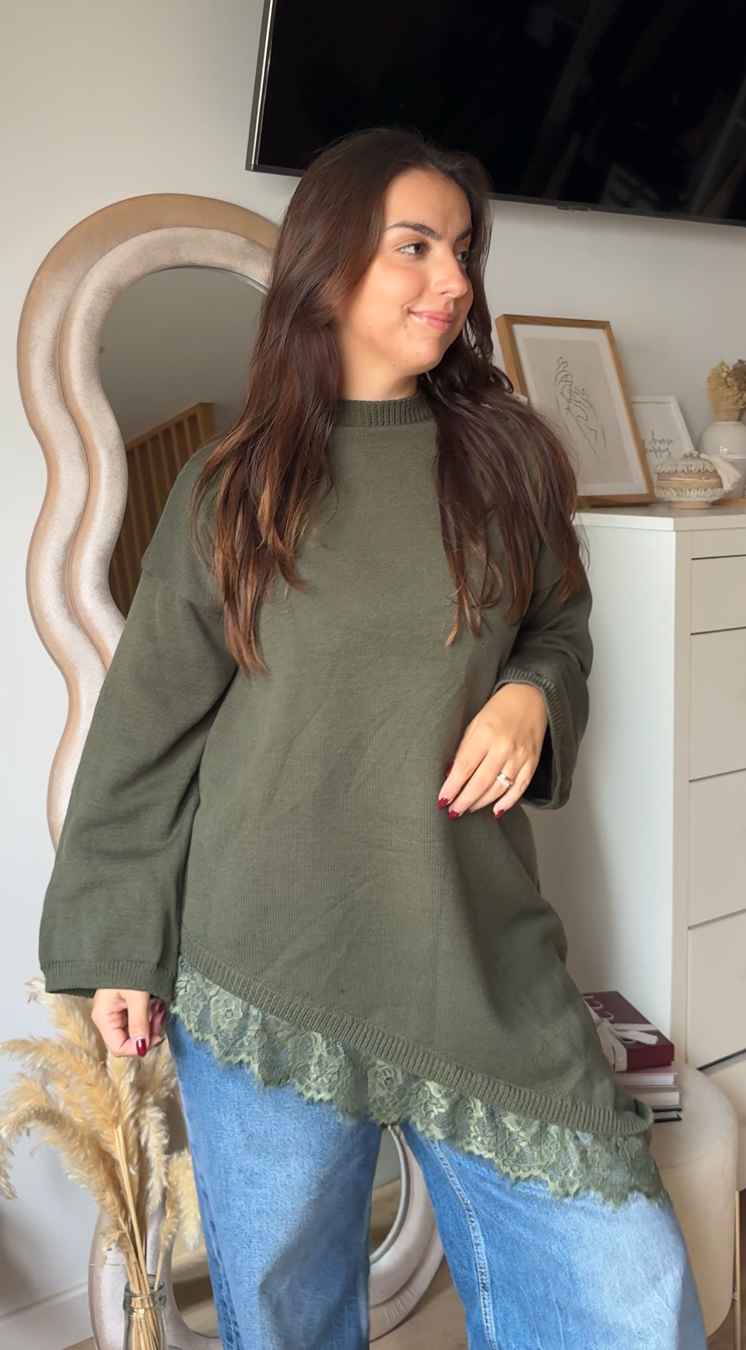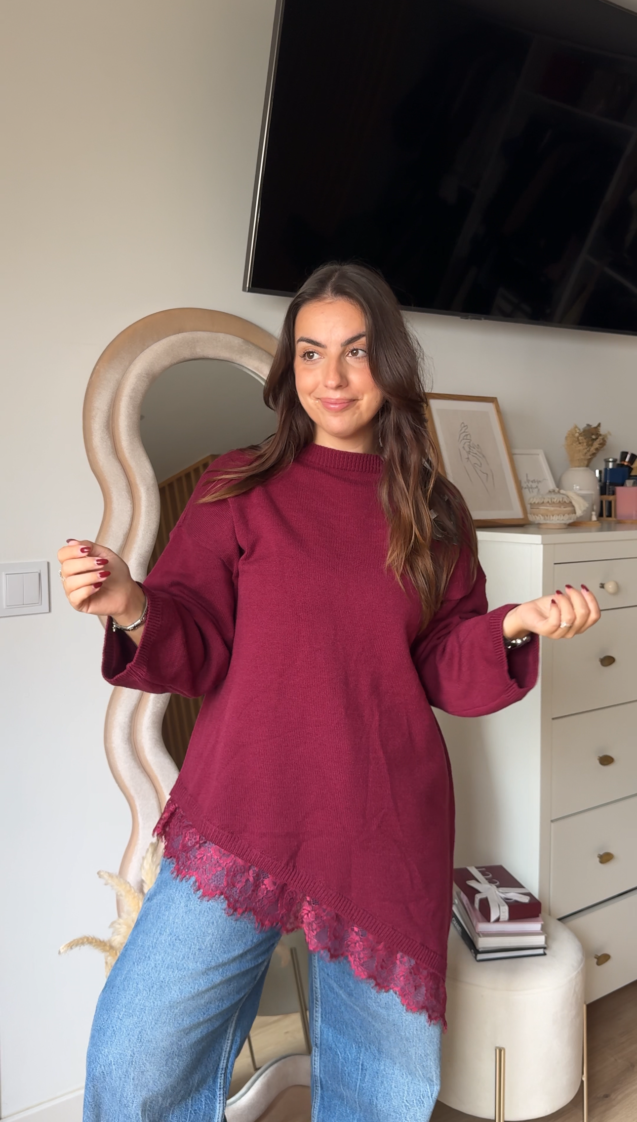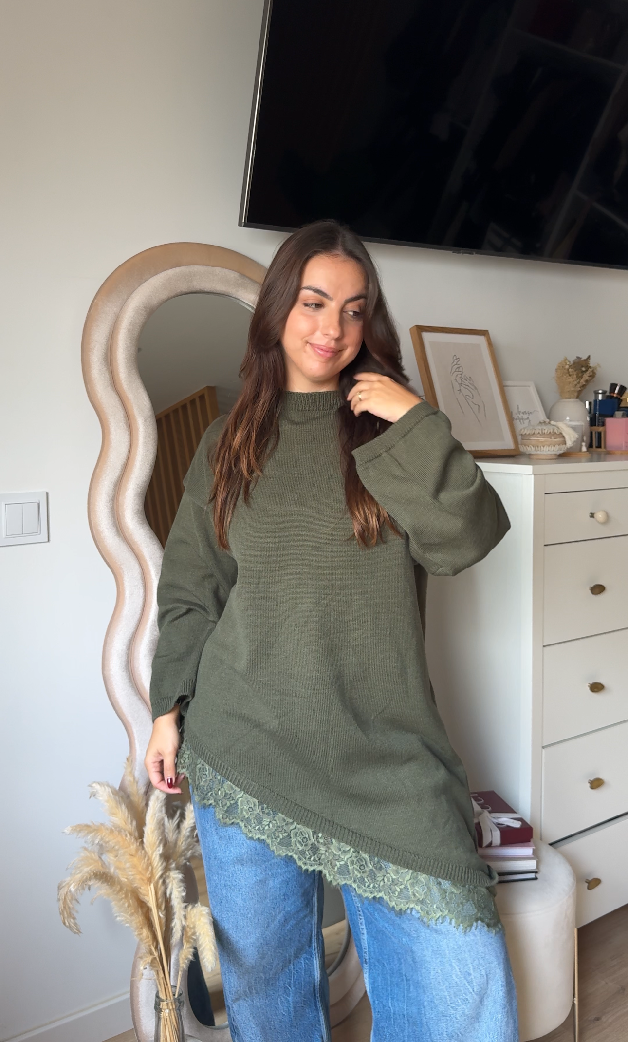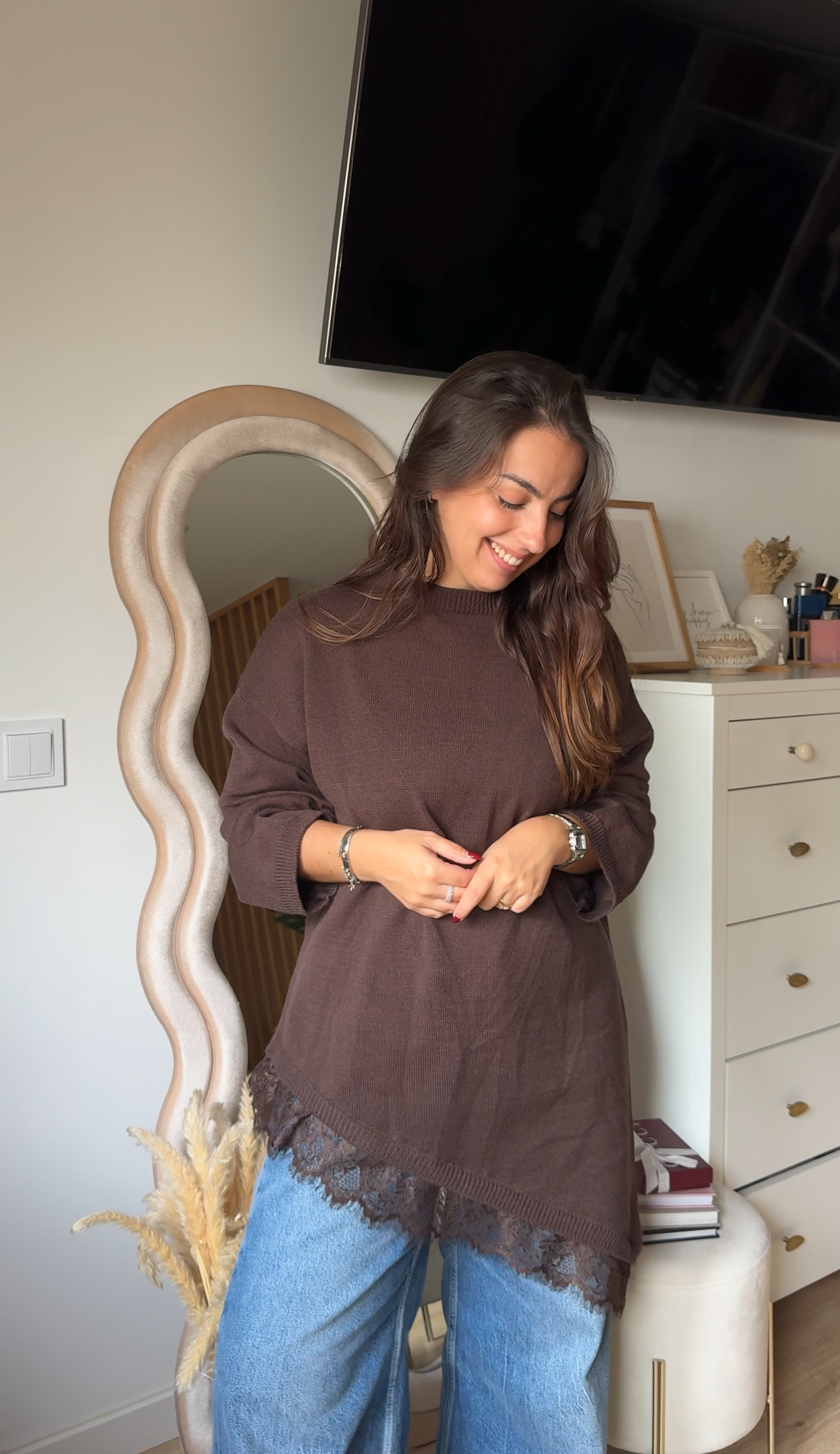 Uma peça delicada e feminina que eleva qualquer look. Esta malha destaca-se pelo detalhe de renda no acabamento, que acrescenta um toque romântico e sofisticado sem perder o conforto. Com textura suave e um corte que assenta na perfeição, é ideal para combinares com jeans, saias ou calças de cintura subida. Um essencial versátil para looks do dia a dia ou momentos especiais.