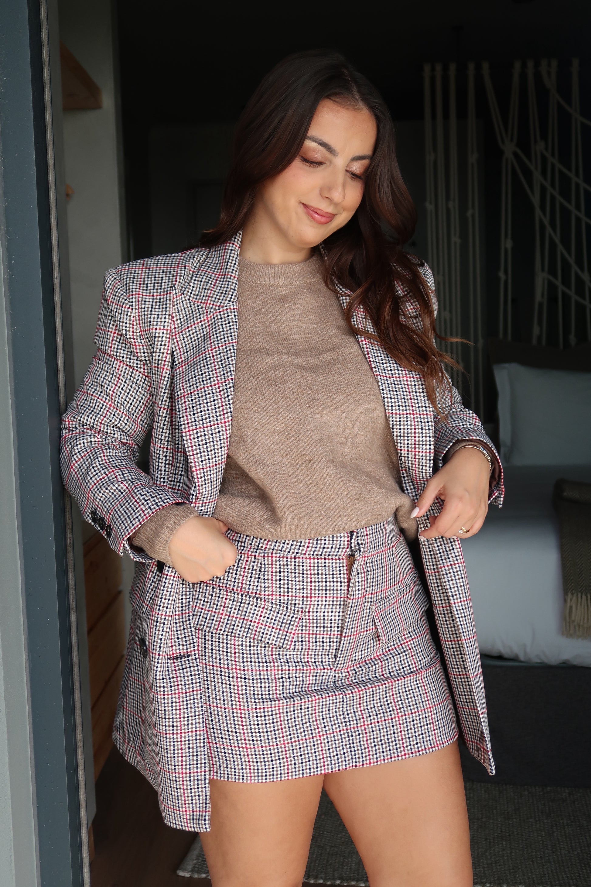 A saia-calção xadrez combina elegância atemporal com um toque urbano. Confeccionada em tecido estruturado, apresenta um padrão xadrez sofisticado em tons neutros com linhas vermelhas que destacam o desenho da peça. O detalhe do bolso decorativo com lapela adiciona charme e estilo, oferecendo um visual mais moderno e fashionista.