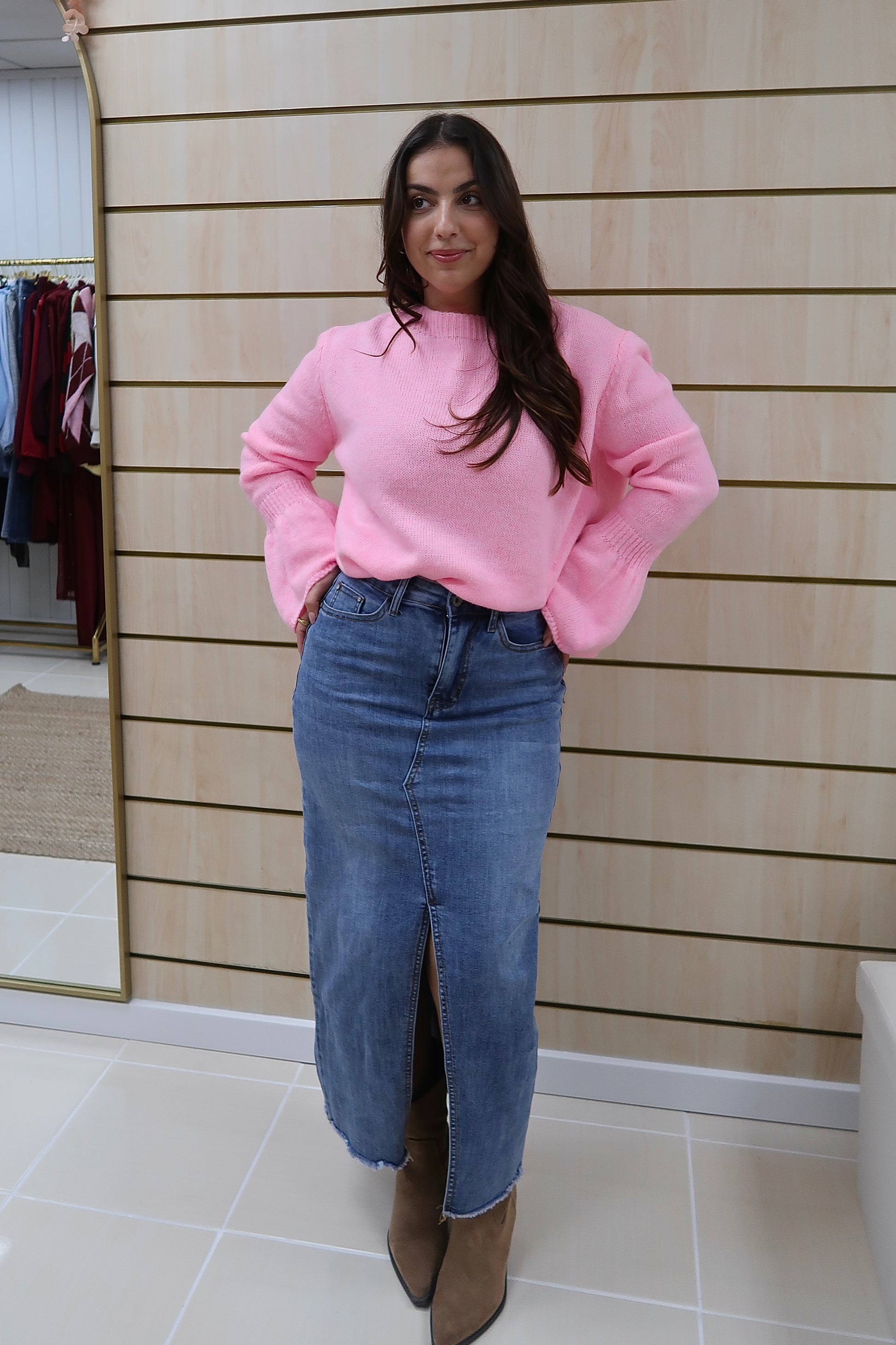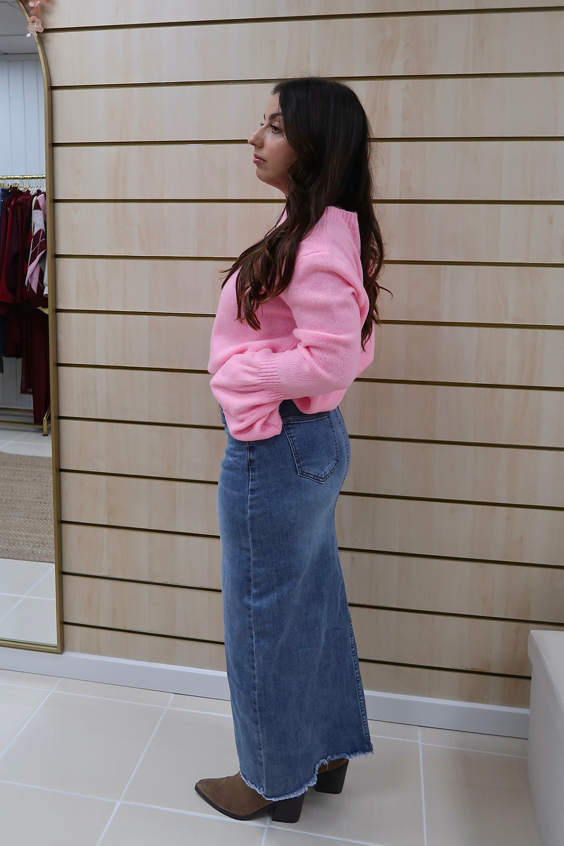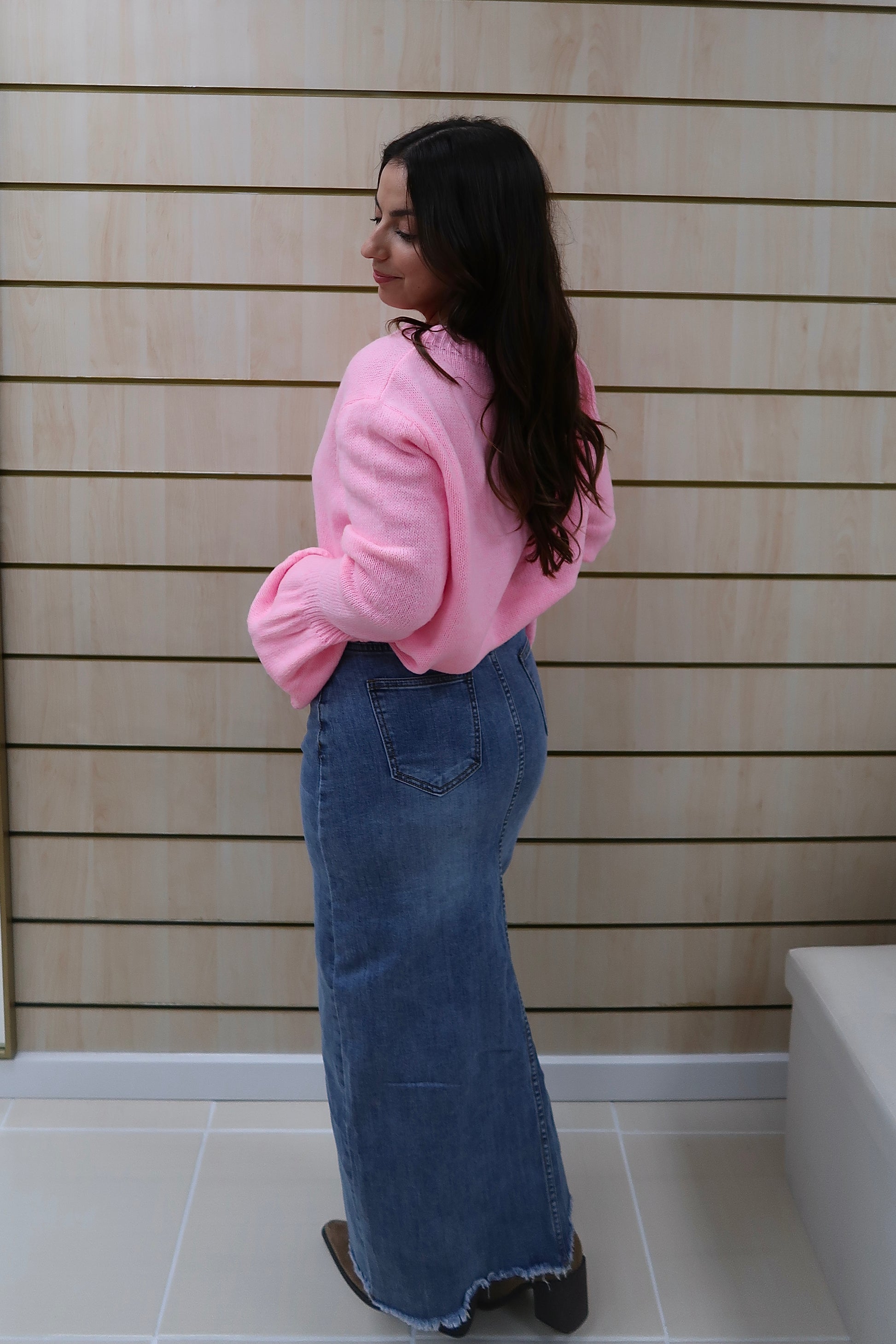 Saia de ganga de cintura subida, com corte reto que alonga a silhueta e garante um fitting elegante. O destaque vai para a abertura frontal discreta, que acrescenta conforto e um toque moderno à peça. Confeccionada em ganga de lavagem média, é uma peça intemporal e fácil de conjugar, perfeita tanto com camisas e blusas mais delicadas como com malhas ou camisolas para um look mais descontraído.