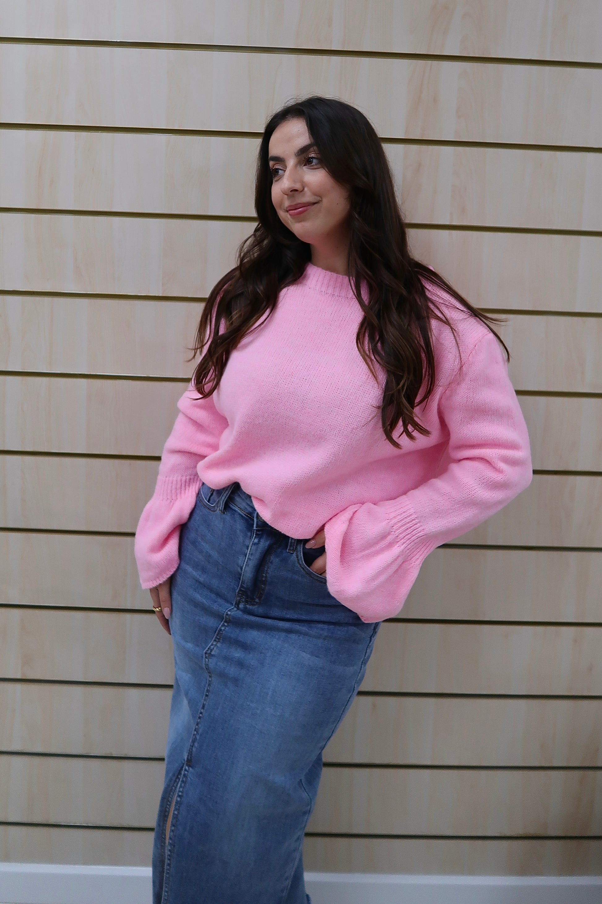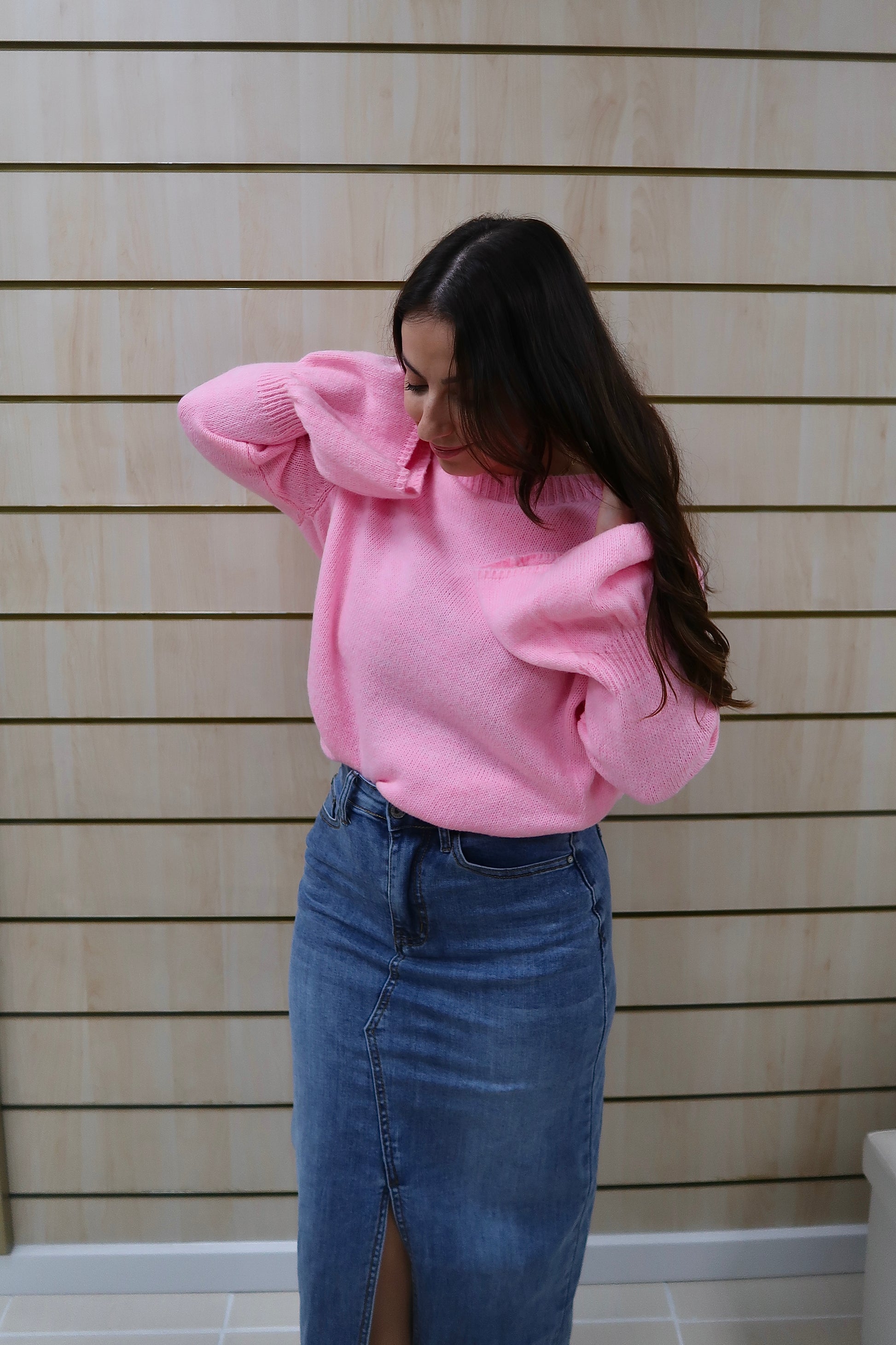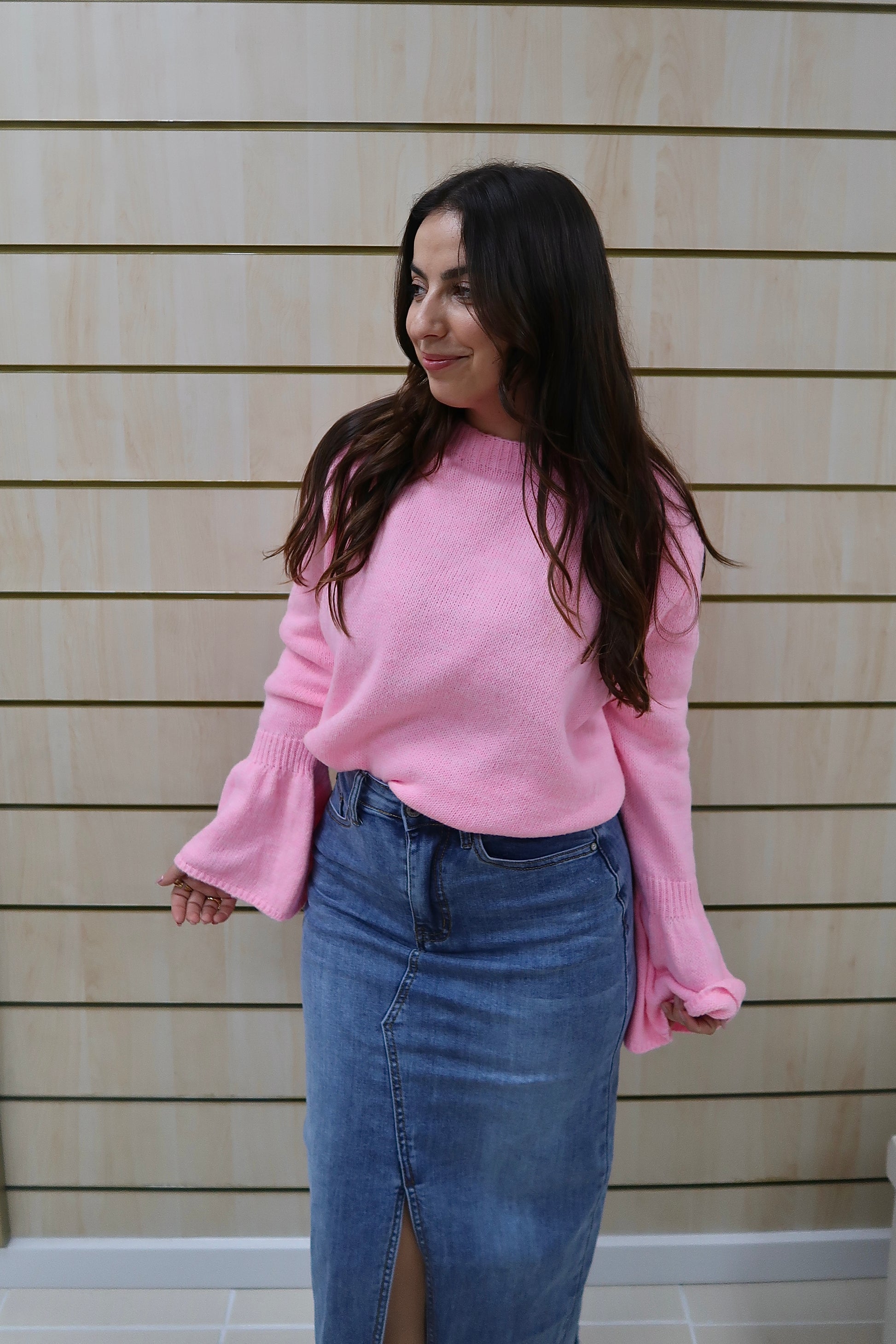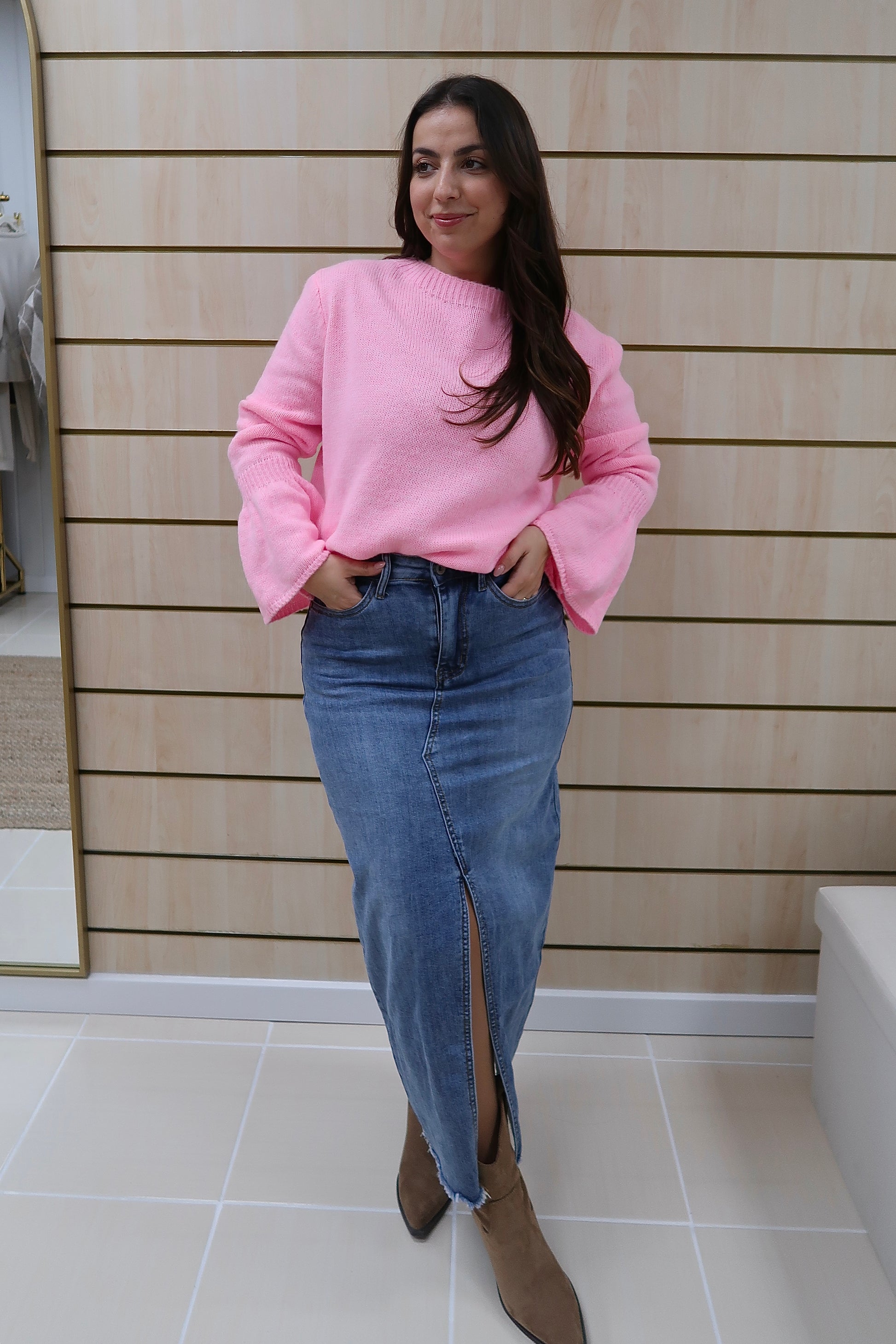 Saia de ganga de cintura subida, com corte reto que alonga a silhueta e garante um fitting elegante. O destaque vai para a abertura frontal discreta, que acrescenta conforto e um toque moderno à peça. Confeccionada em ganga de lavagem média, é uma peça intemporal e fácil de conjugar, perfeita tanto com camisas e blusas mais delicadas como com malhas ou camisolas para um look mais descontraído.