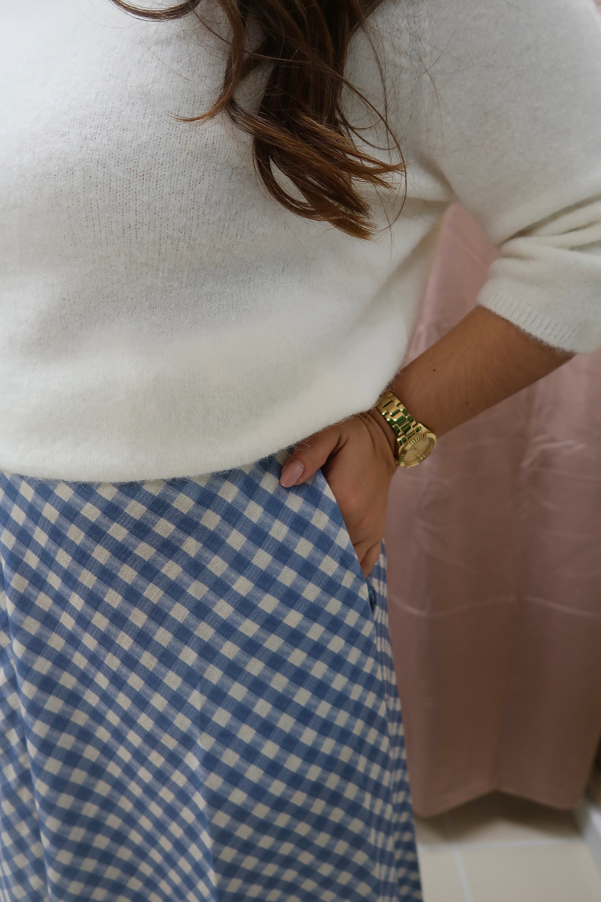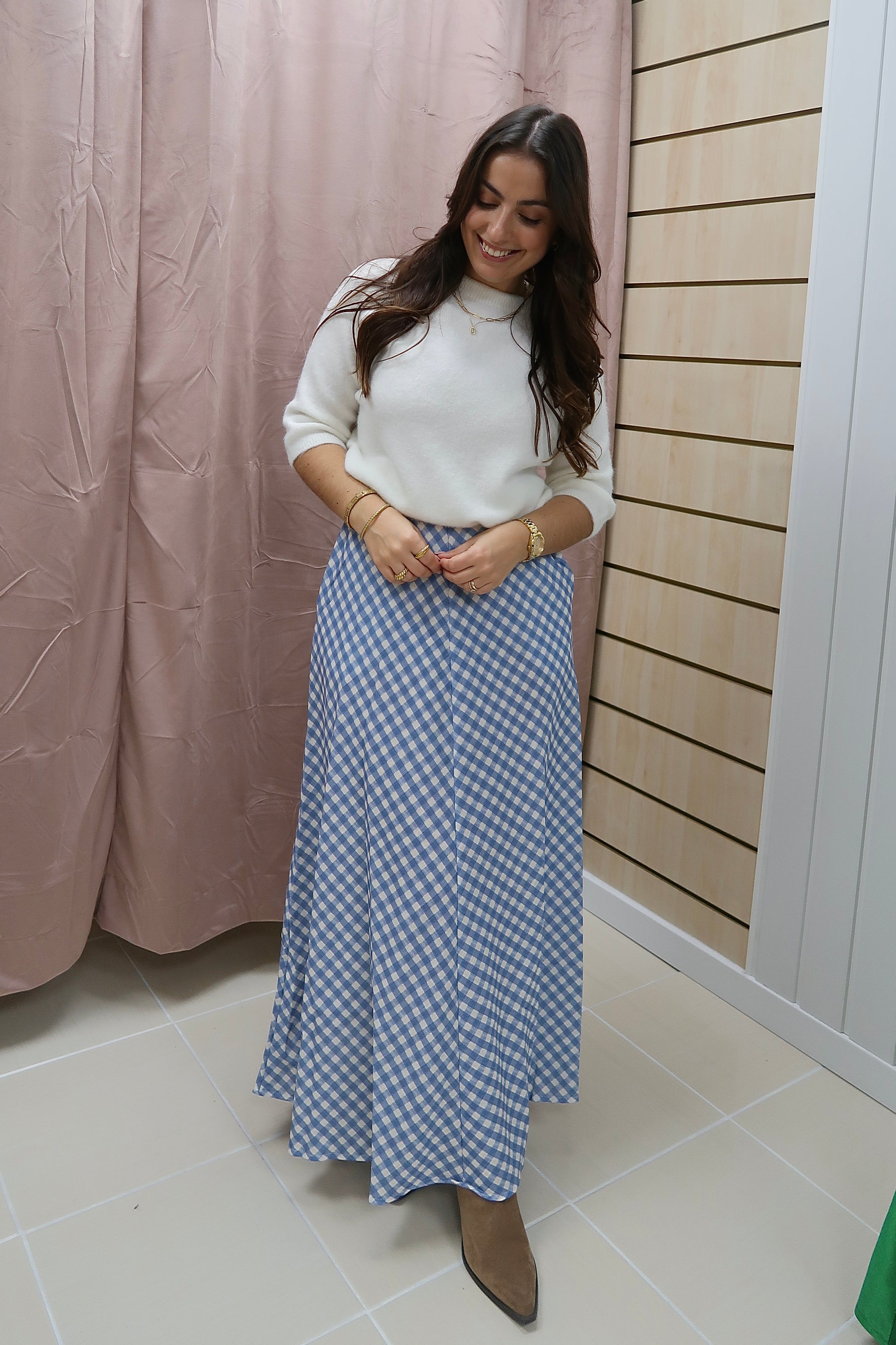 Saia comprida com padrão vichy, ideal para um look feminino e intemporal. Com cintura subida e corte fluido em A, oferece conforto e um movimento elegante ao caminhar. O padrão aos quadrados em tons de azul e branco confere-lhe um toque clássico e versátil, fácil de conjugar com malhas, blusas ou camisas. Os bolsos laterais acrescentam funcionalidade, tornando esta saia uma peça prática e cheia de estilo para o dia a dia ou ocasiões especiais.