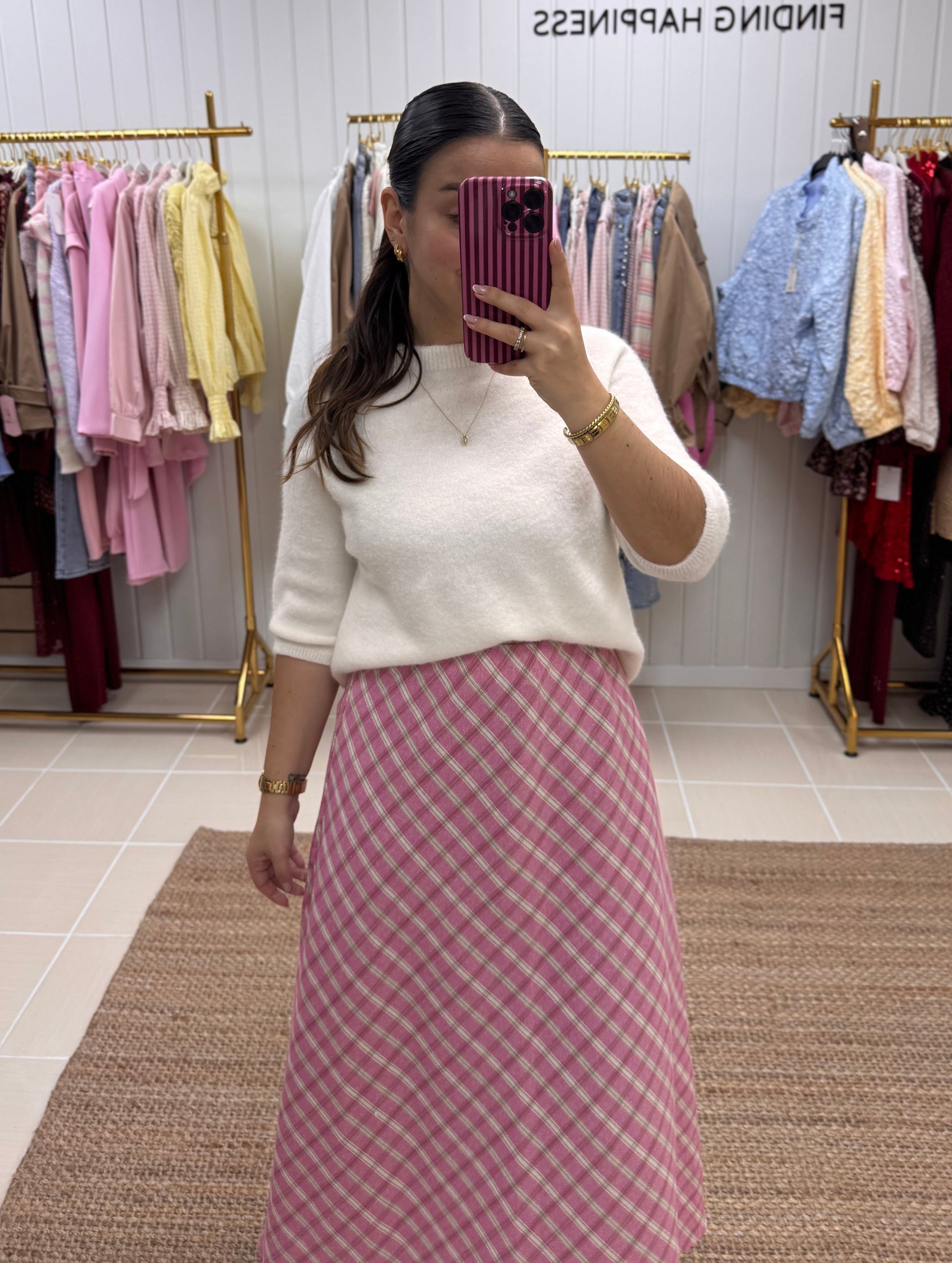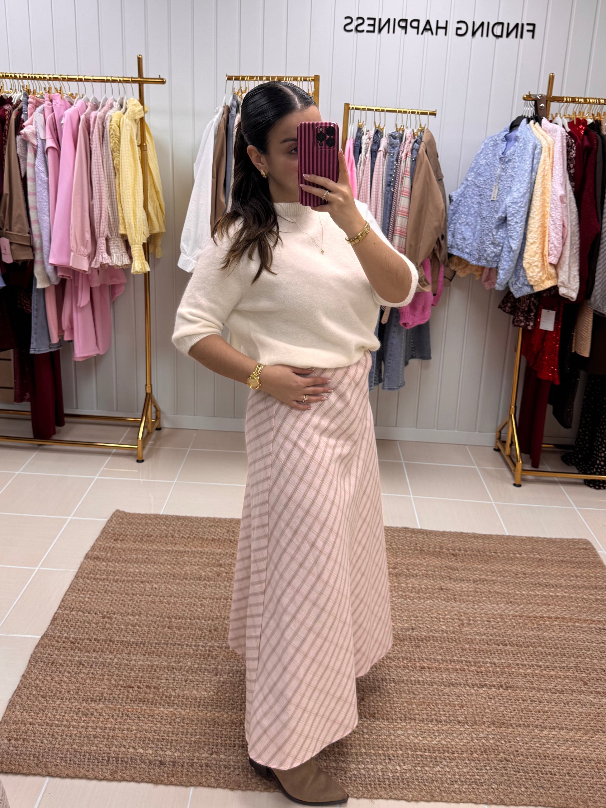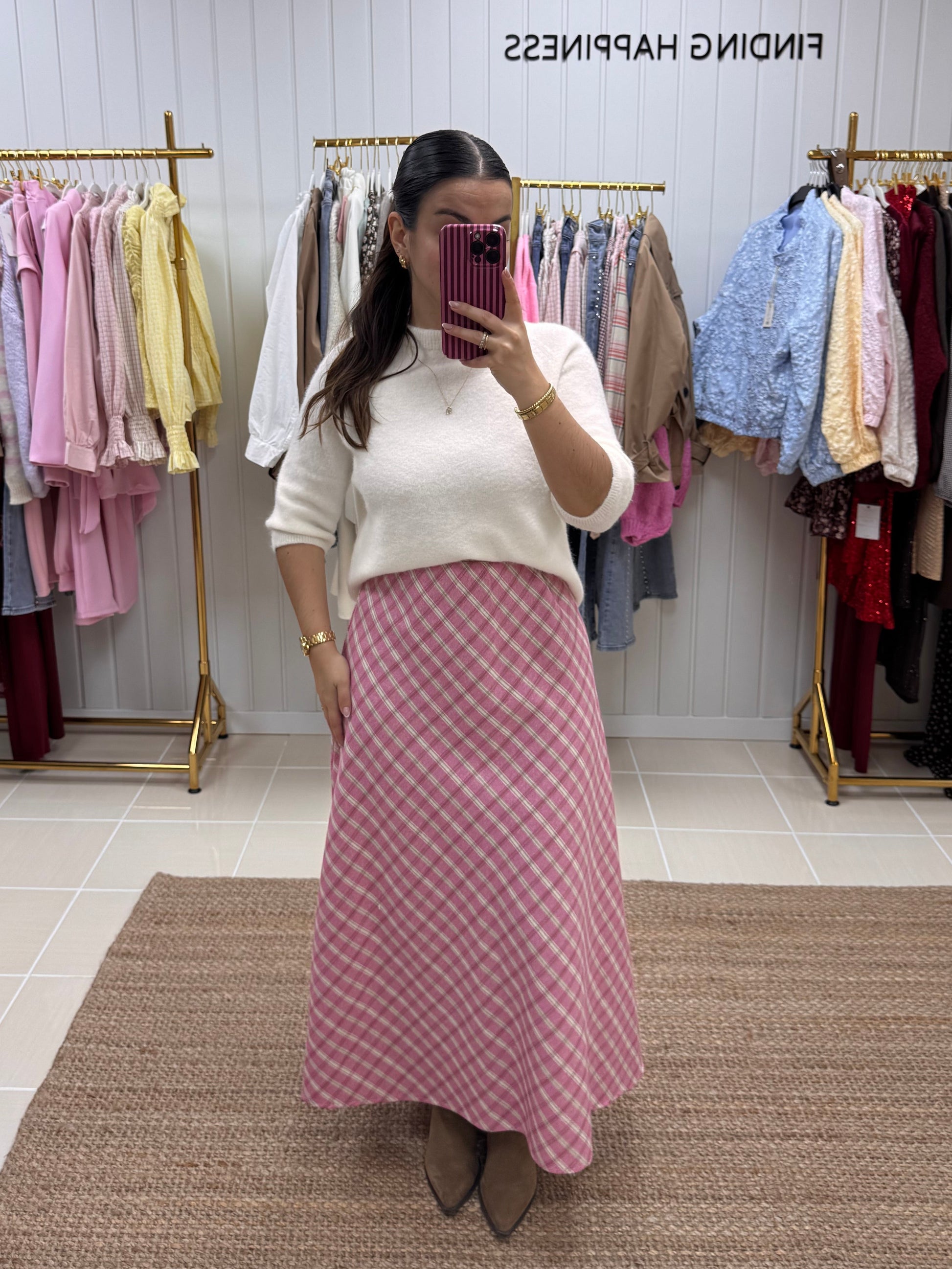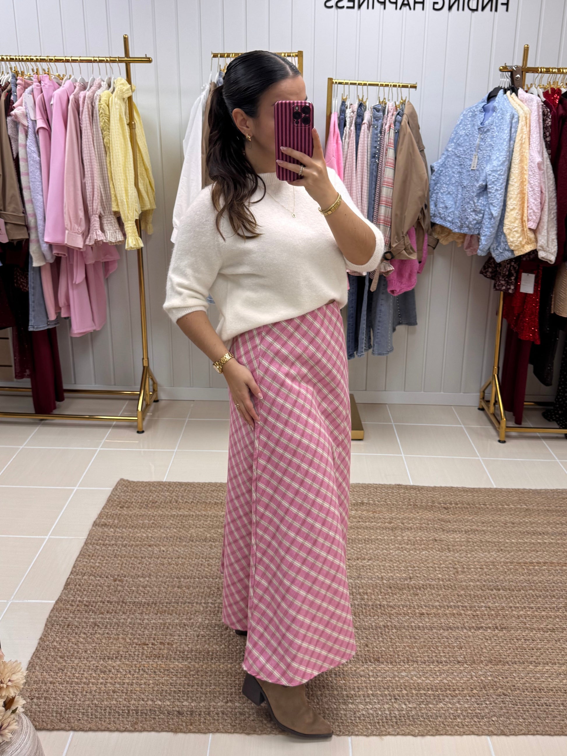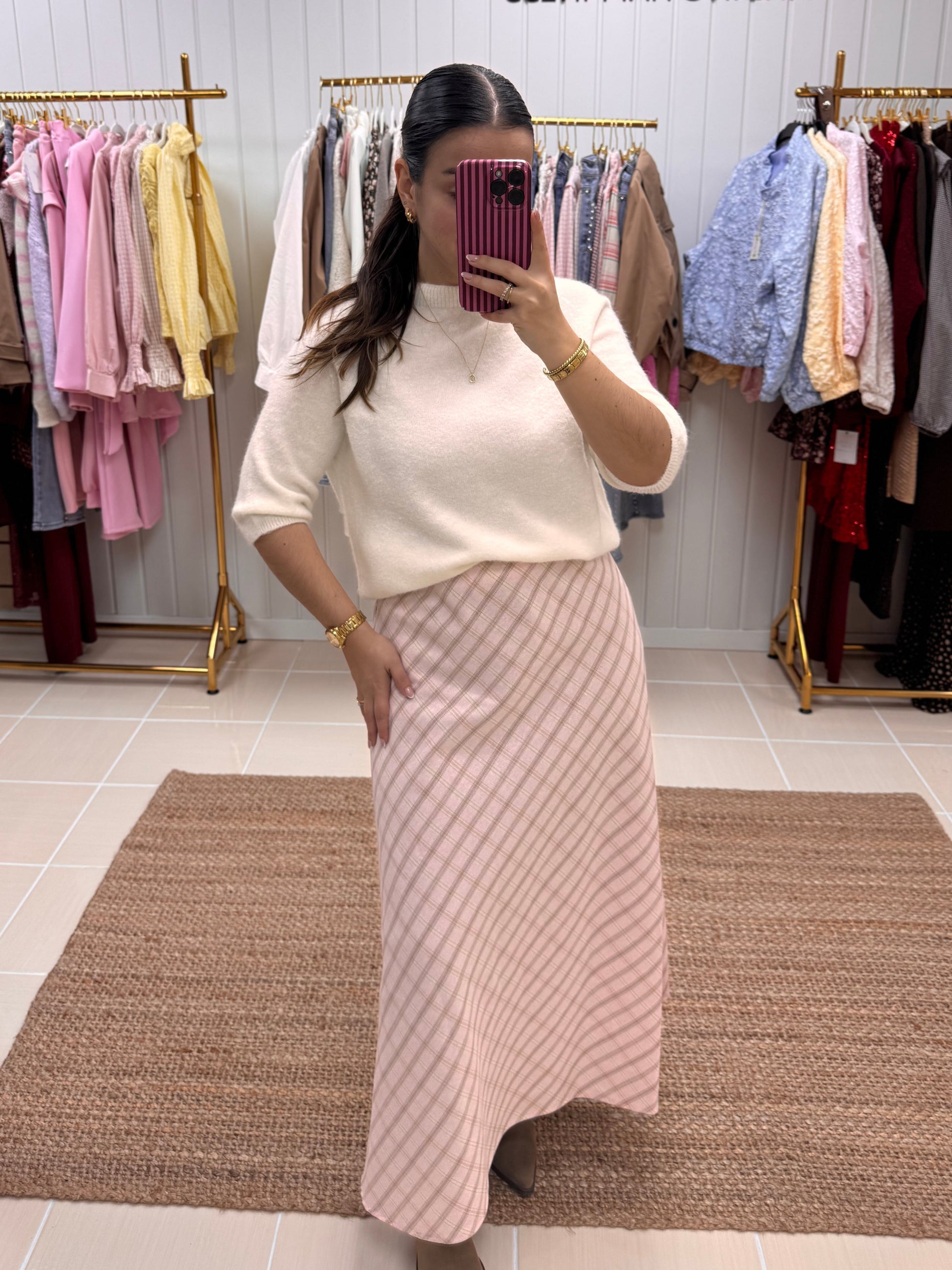 Destaca-se pelo seu padrão aos quadrados em tons suaves de rosa, que traz delicadeza e um toque romântico ao look. Com corte midi e caimento fluido, alonga a silhueta e oferece movimento leve a cada passo. A cintura subida valoriza a silhueta e torna-a perfeita para combinar com malhas, camisas ou tops mais ajustados. É uma peça versátil que funciona tanto para o dia a dia como para ocasiões especiais, dependendo dos acessórios.
