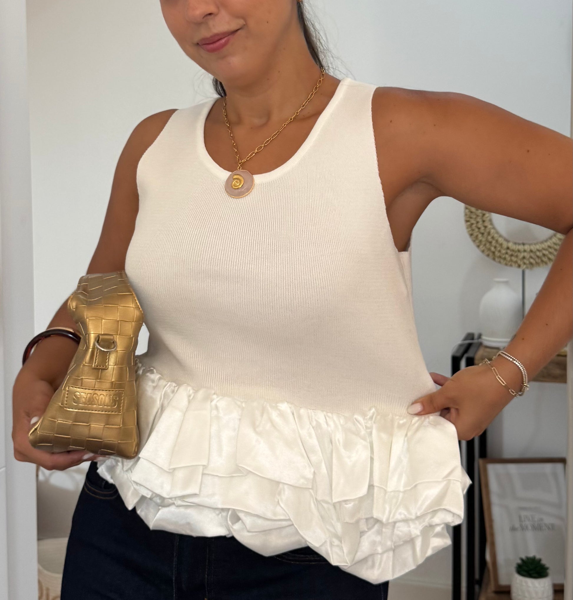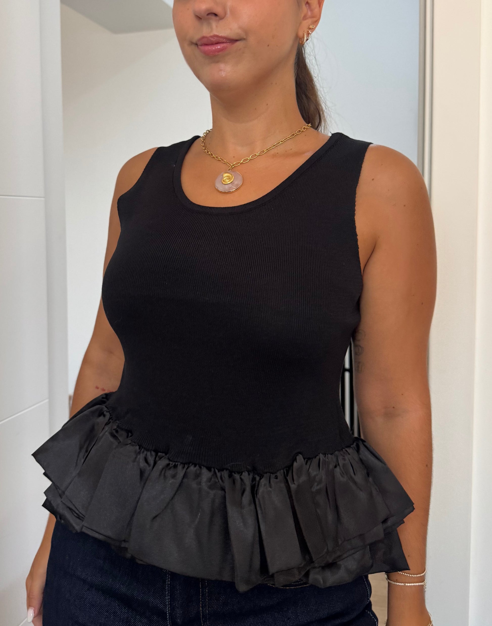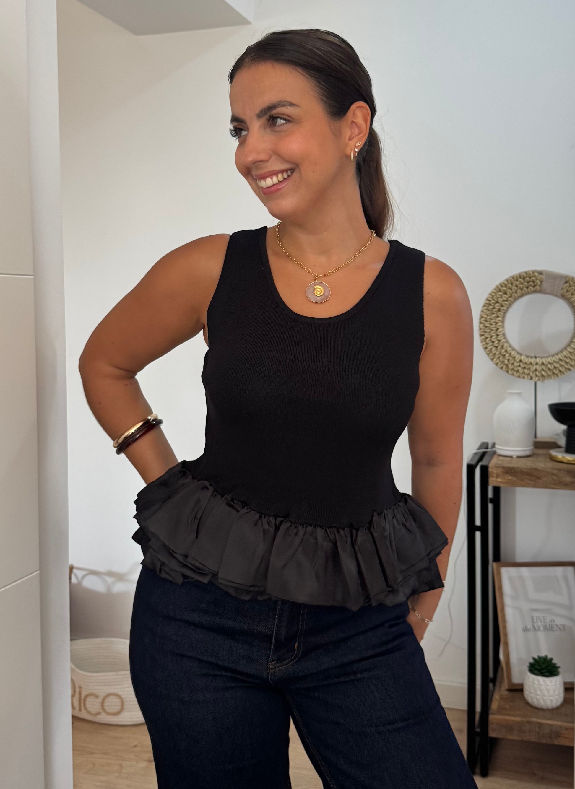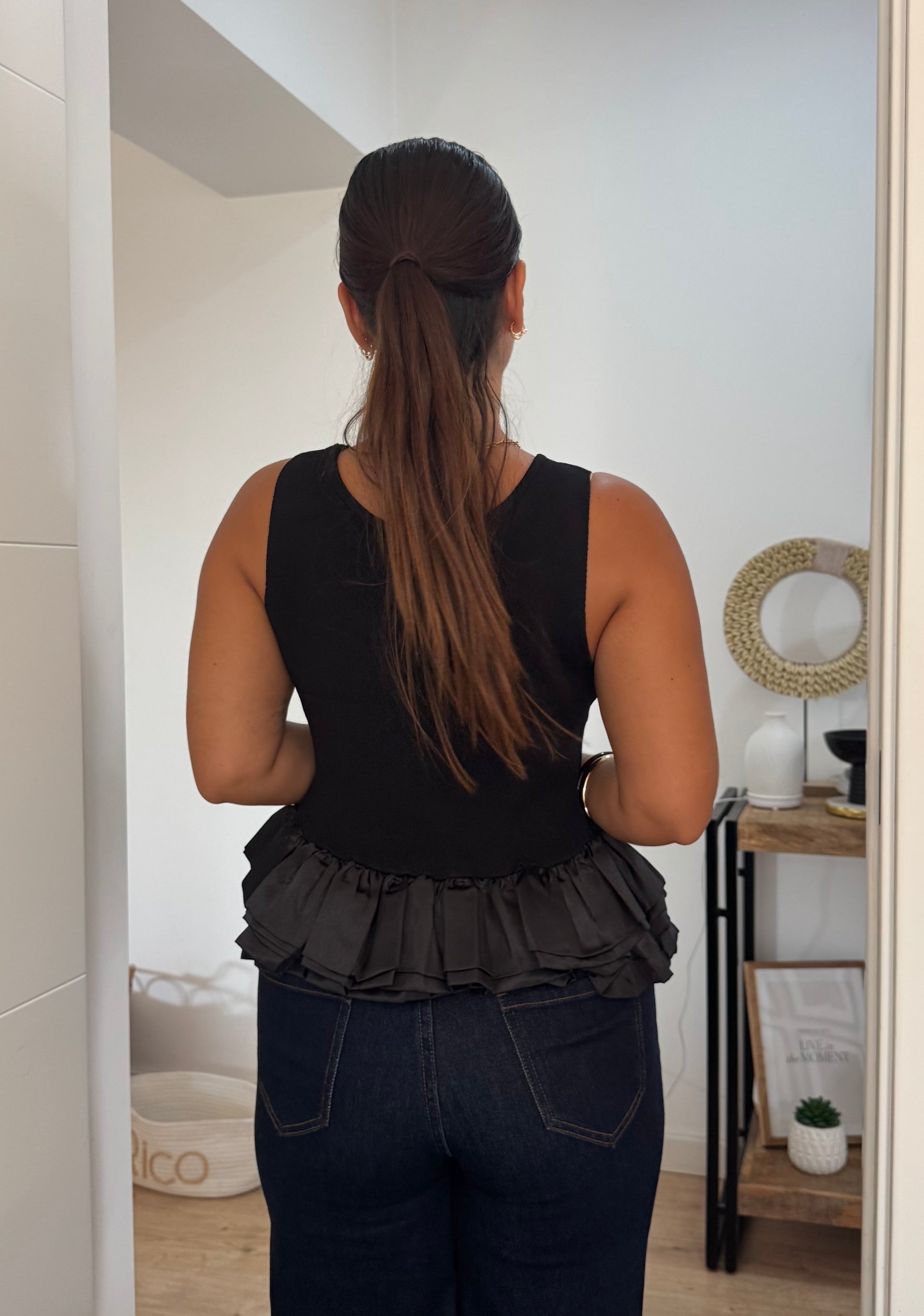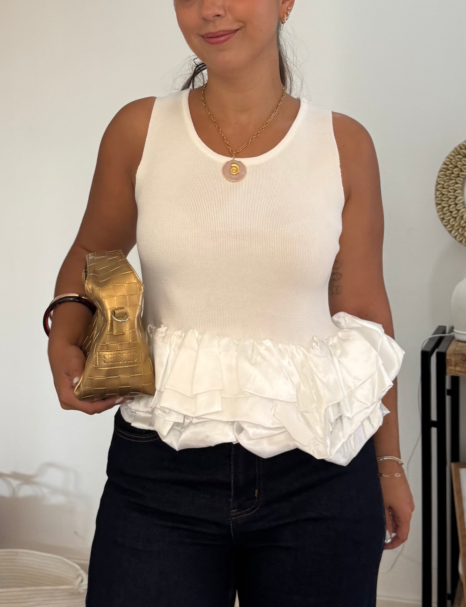 Este top cavado combina simplicidade e sofisticação em cada detalhe. O decote redondo, delicadamente adornado com folho em cetim, acrescenta um toque feminino e requintado à peça. Versátil e leve, é a escolha ideal para criar looks modernos que transitam facilmente do dia para a noite, garantindo conforto sem perder a elegância.