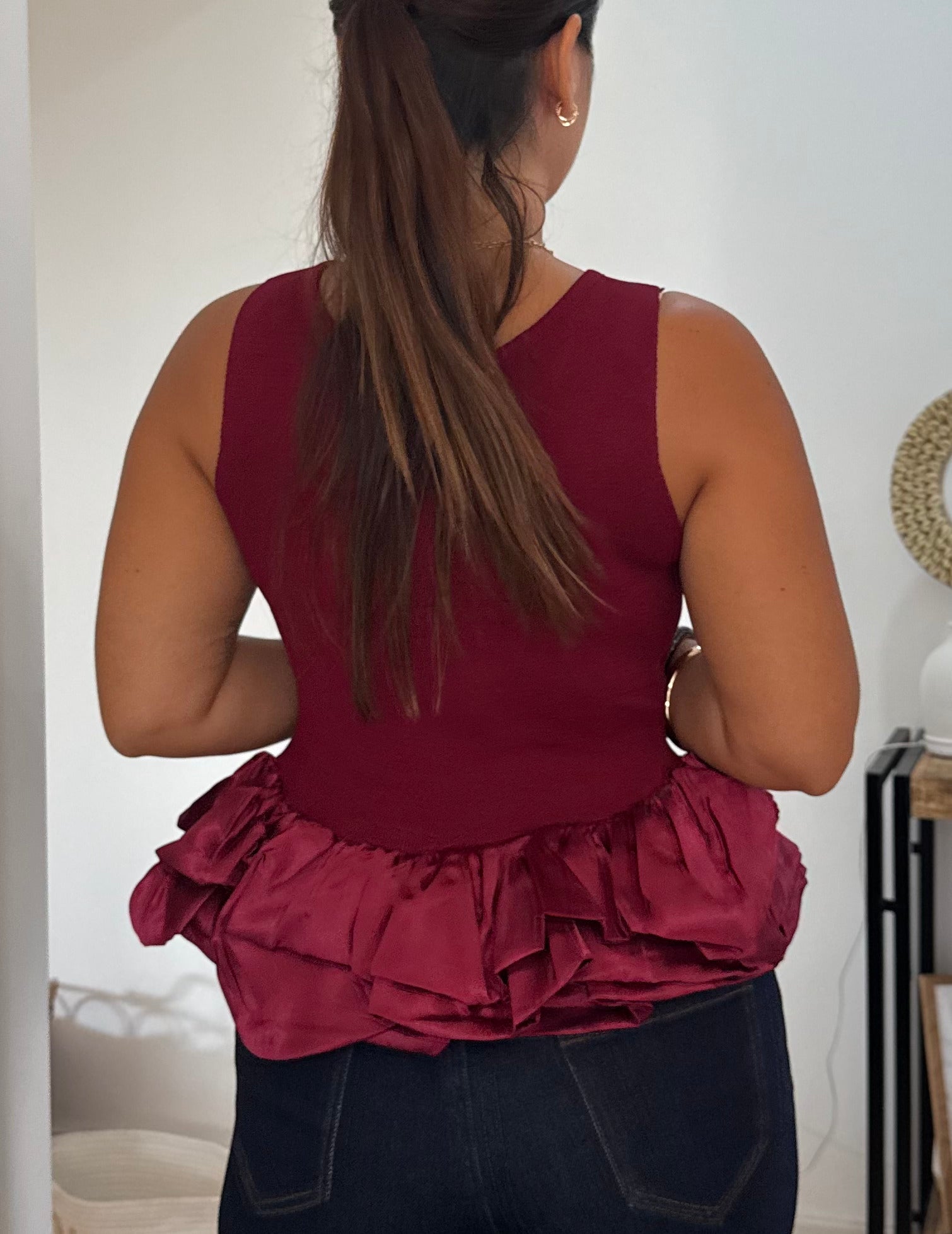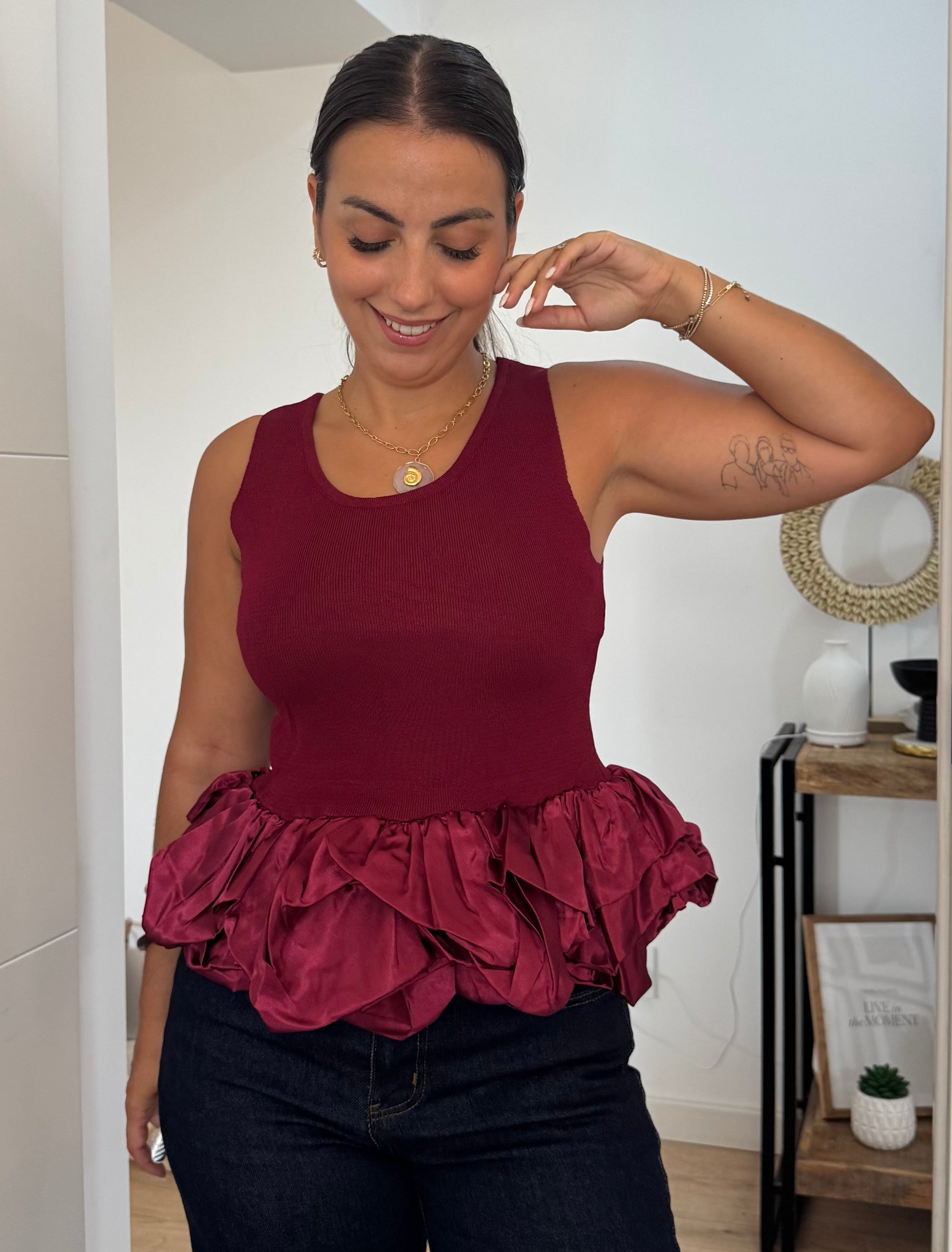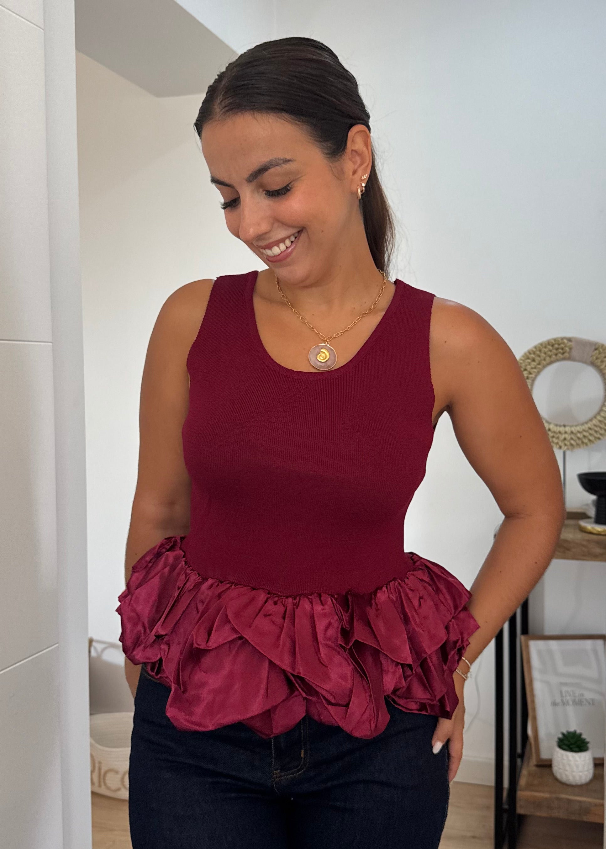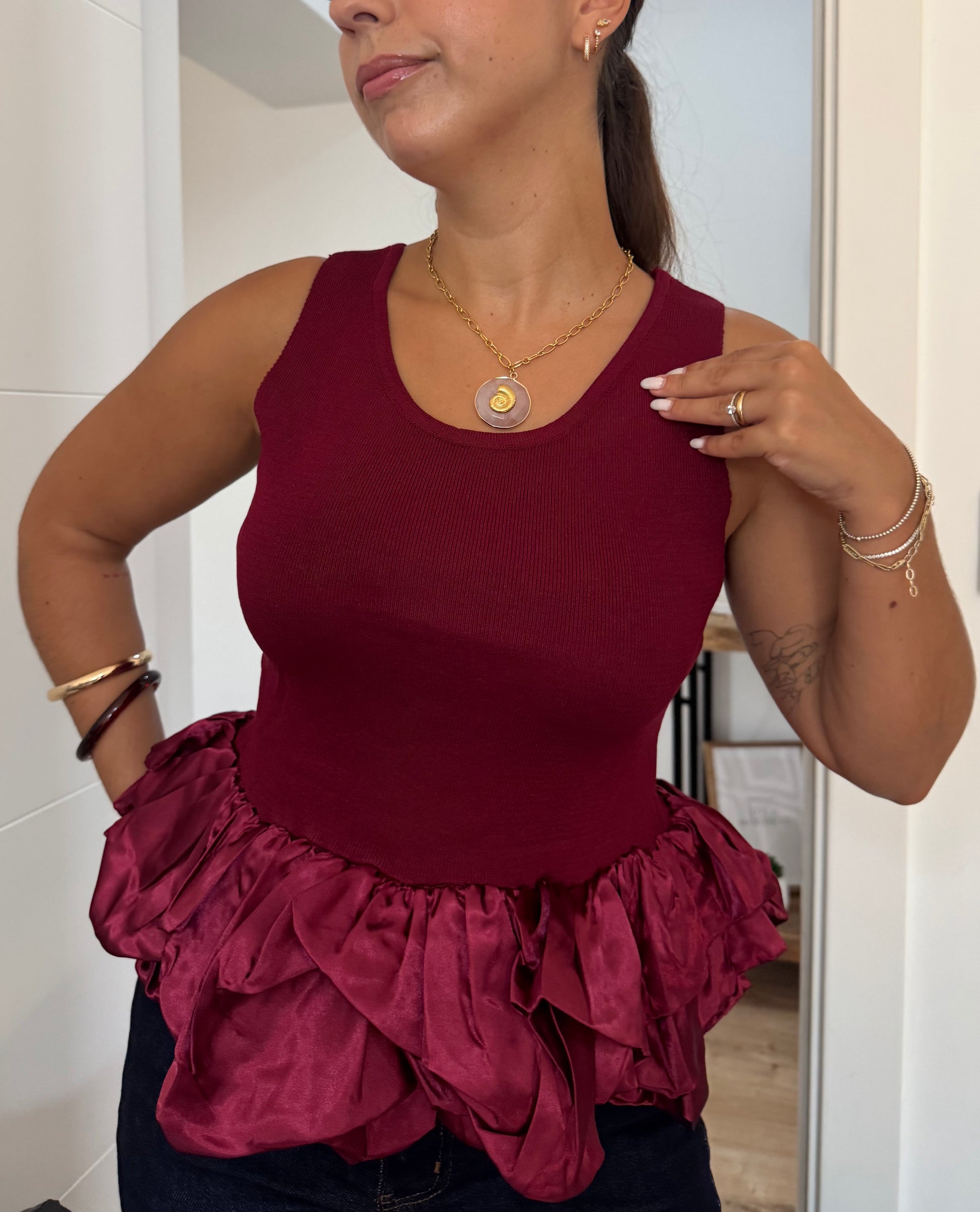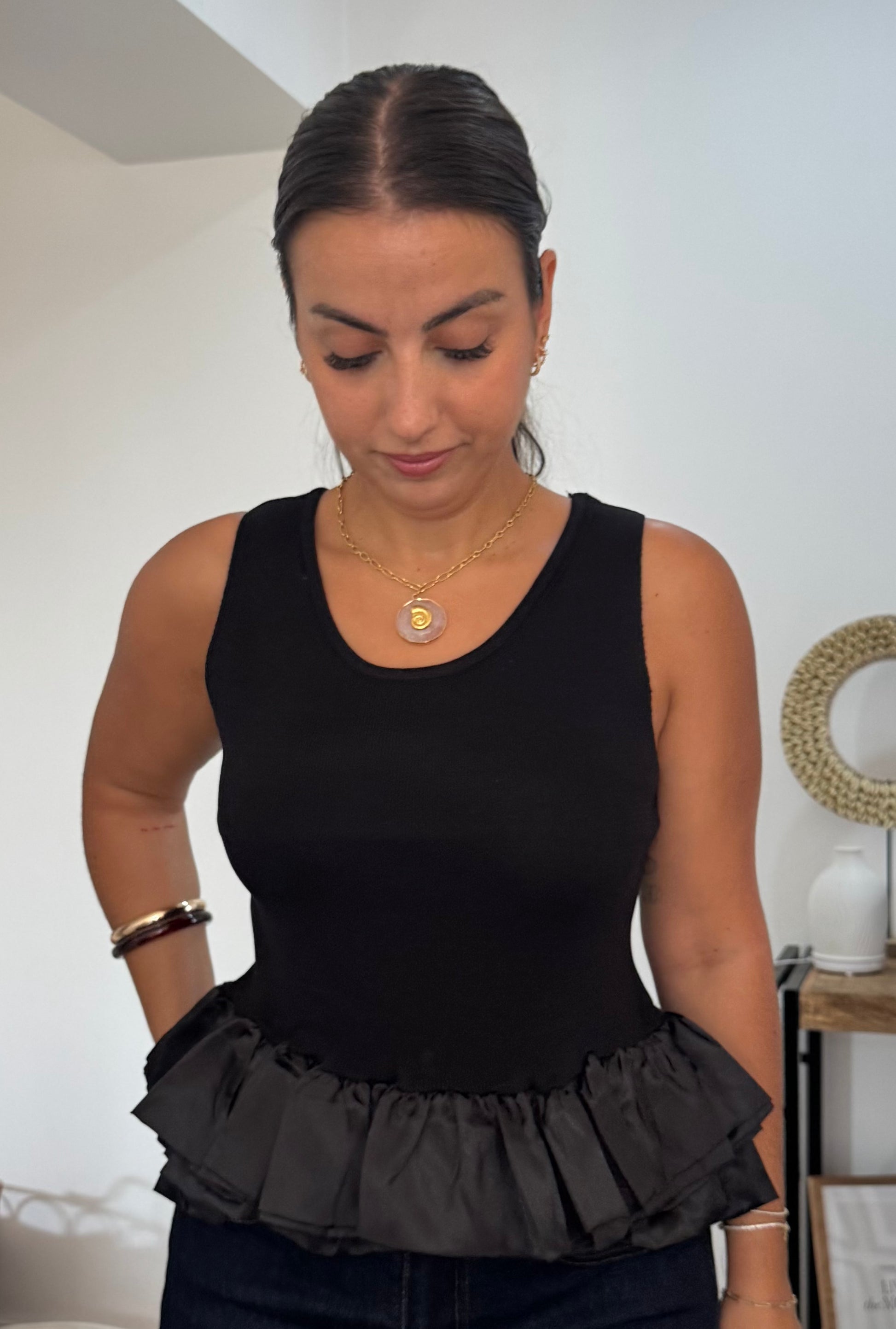 Este top cavado combina simplicidade e sofisticação em cada detalhe. O decote redondo, delicadamente adornado com folho em cetim, acrescenta um toque feminino e requintado à peça. Versátil e leve, é a escolha ideal para criar looks modernos que transitam facilmente do dia para a noite, garantindo conforto sem perder a elegância.