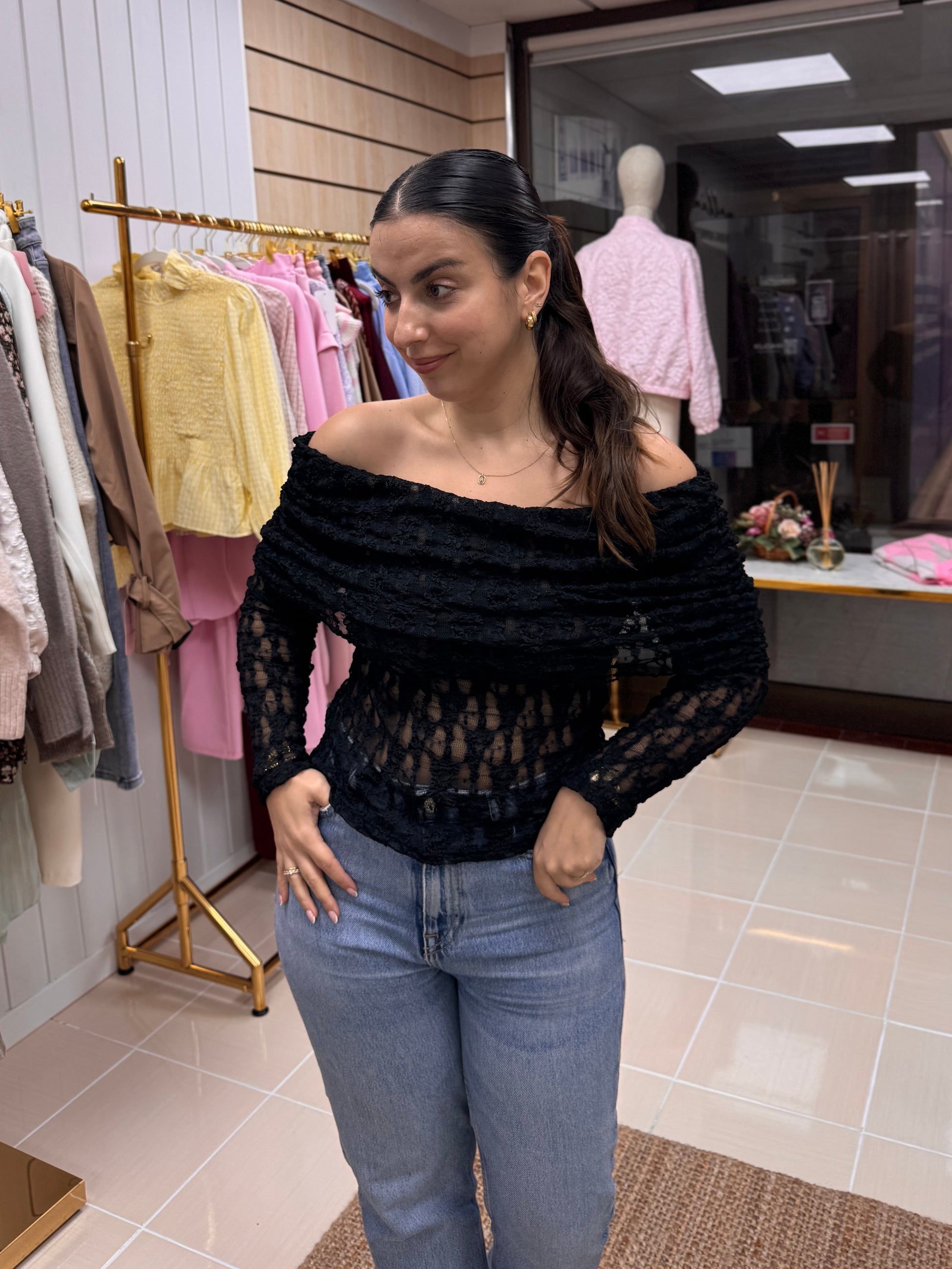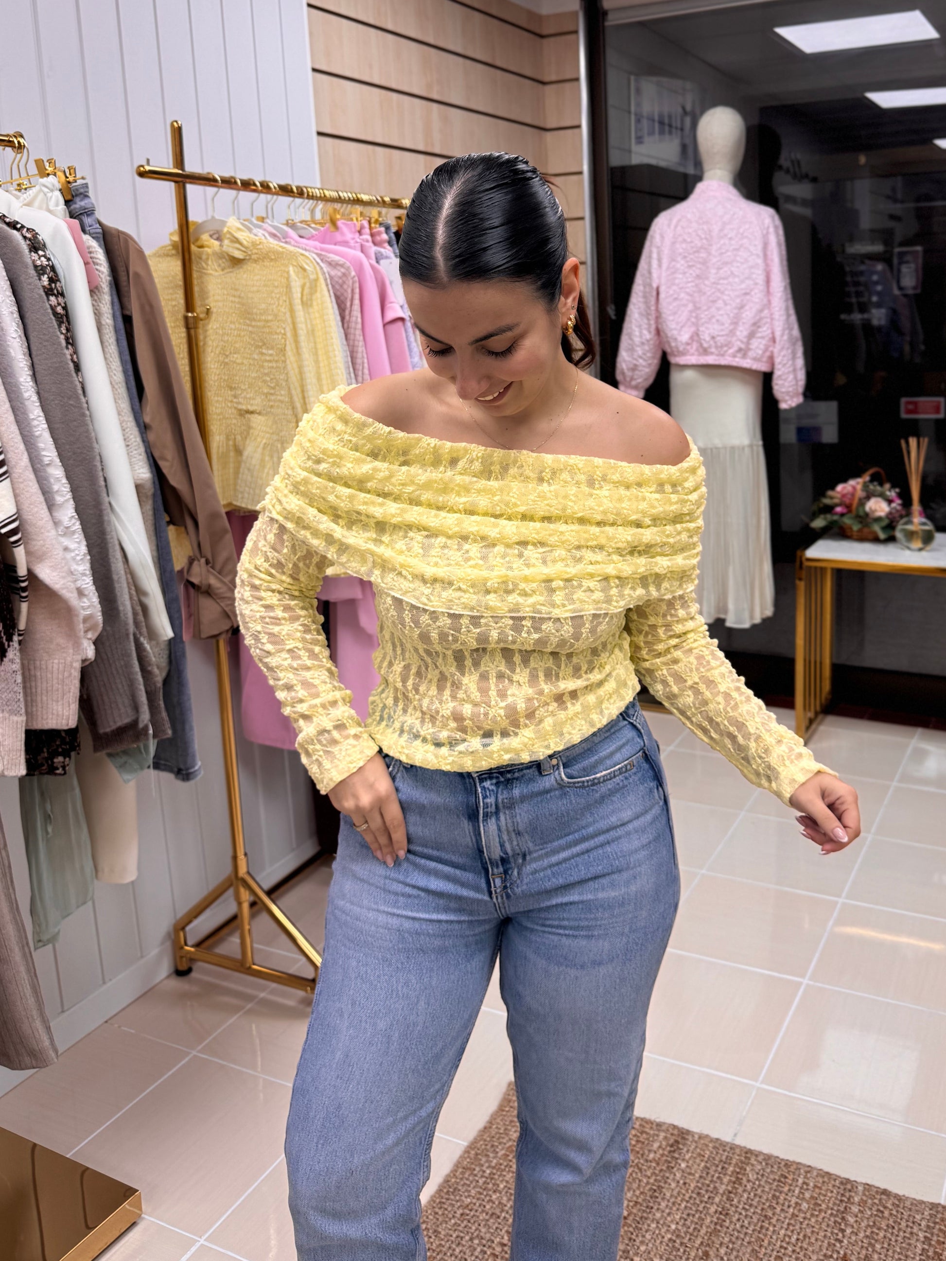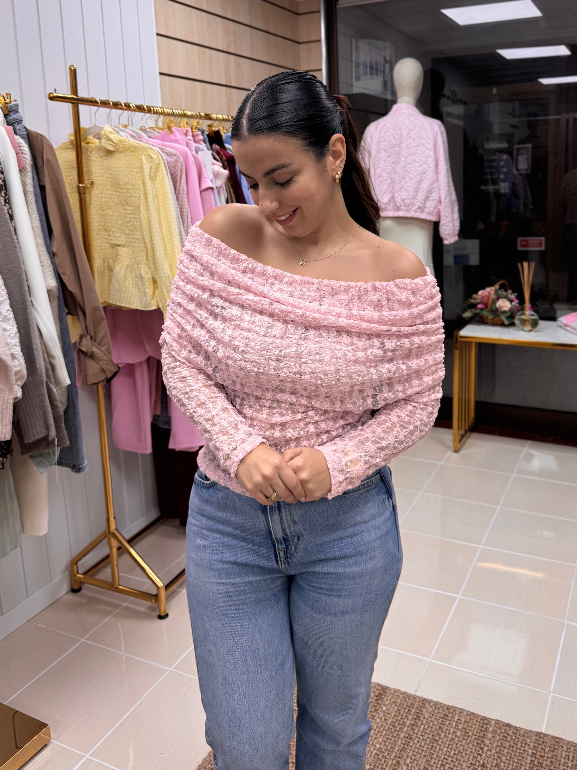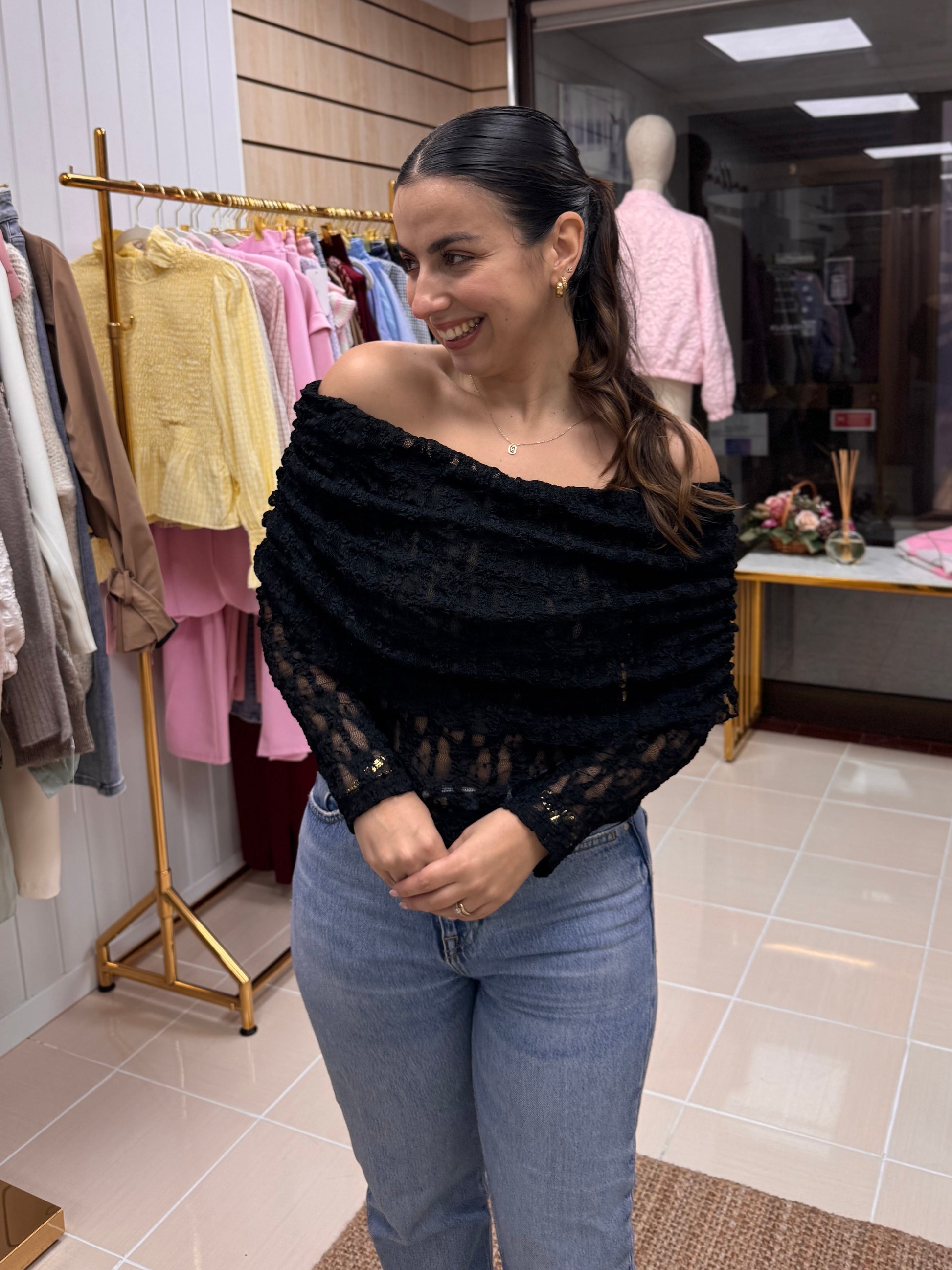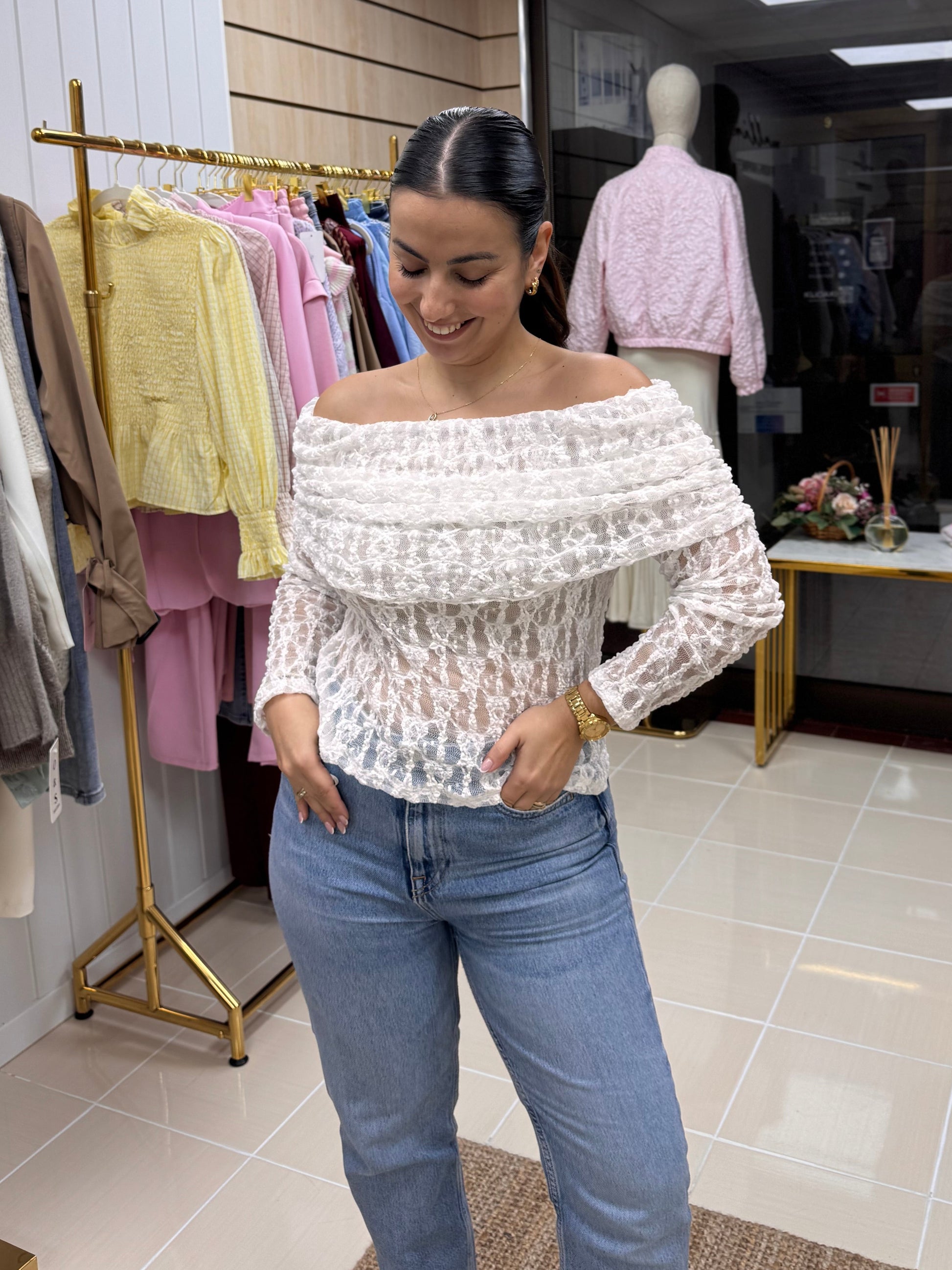 Com textura trabalhada e efeito levemente transparente, este top destaca-se pelo decote amplo dobrado que valoriza os ombros e cria uma silhueta super feminina. A manga comprida equilibra o look e torna-o perfeito tanto para meia-estação como para dias mais frescos.