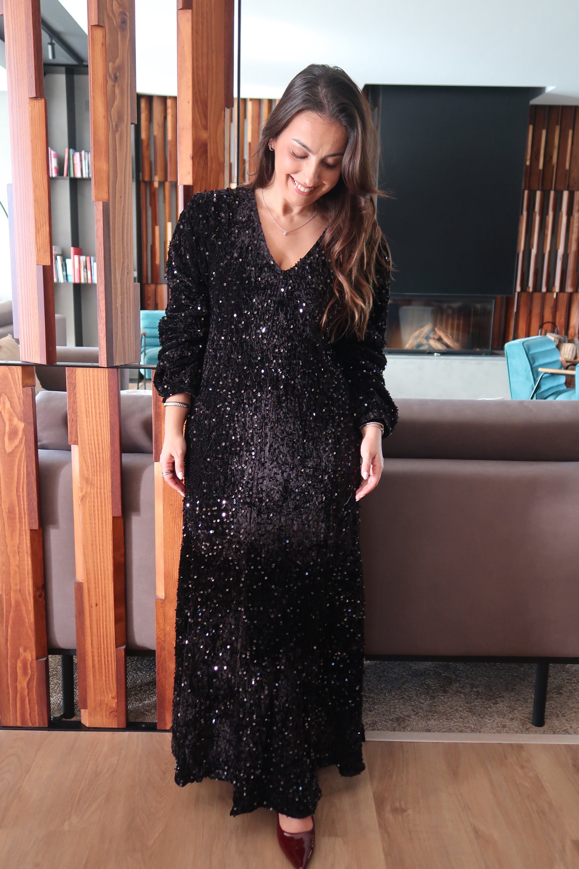 Com um acabamento totalmente em lantejoulas e veludo, este modelo combina elegância e conforto numa silhueta fluida e feminina. O decote em V alonga a figura, enquanto as mangas compridas equilibram o brilho com sofisticação, tornando-o perfeito para jantares, festas, celebrações de Natal ou eventos de inverno. O movimento leve da saia acrescenta um toque romântico e intemporal.