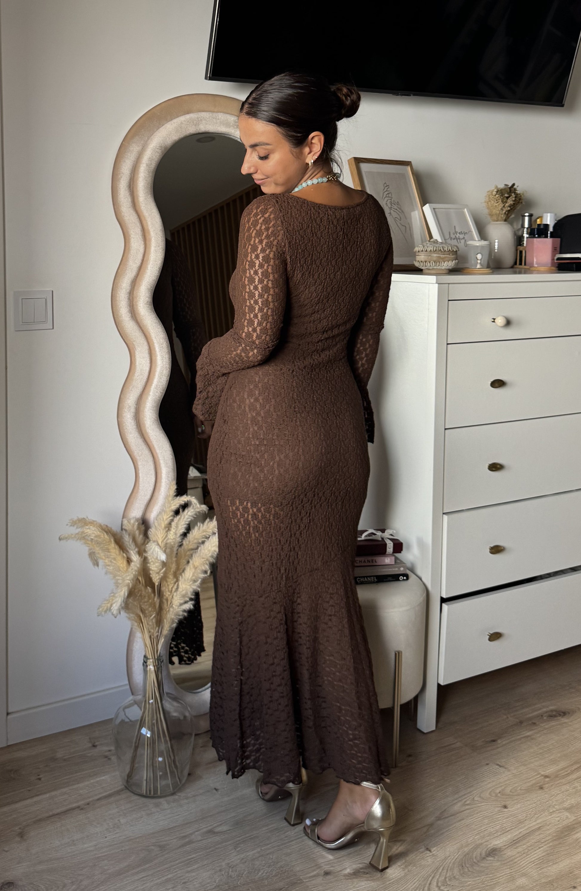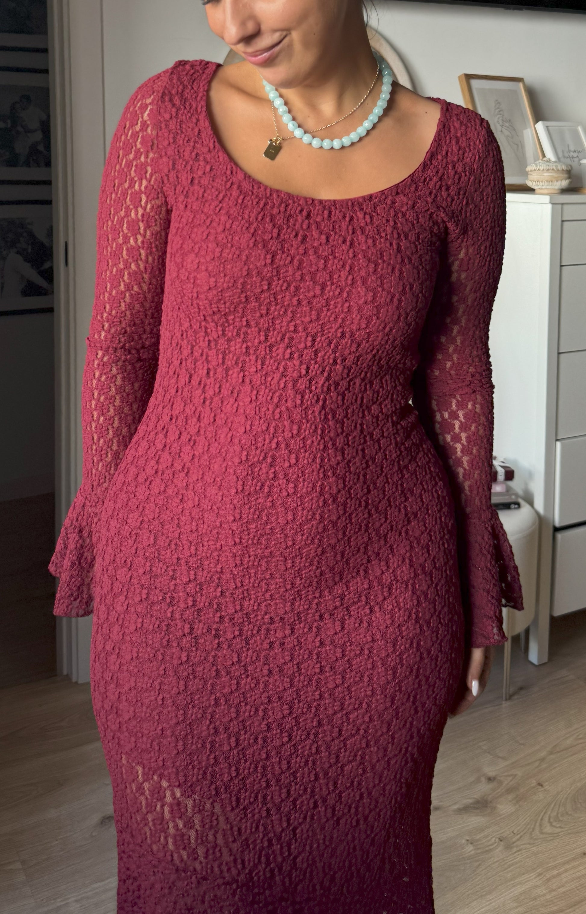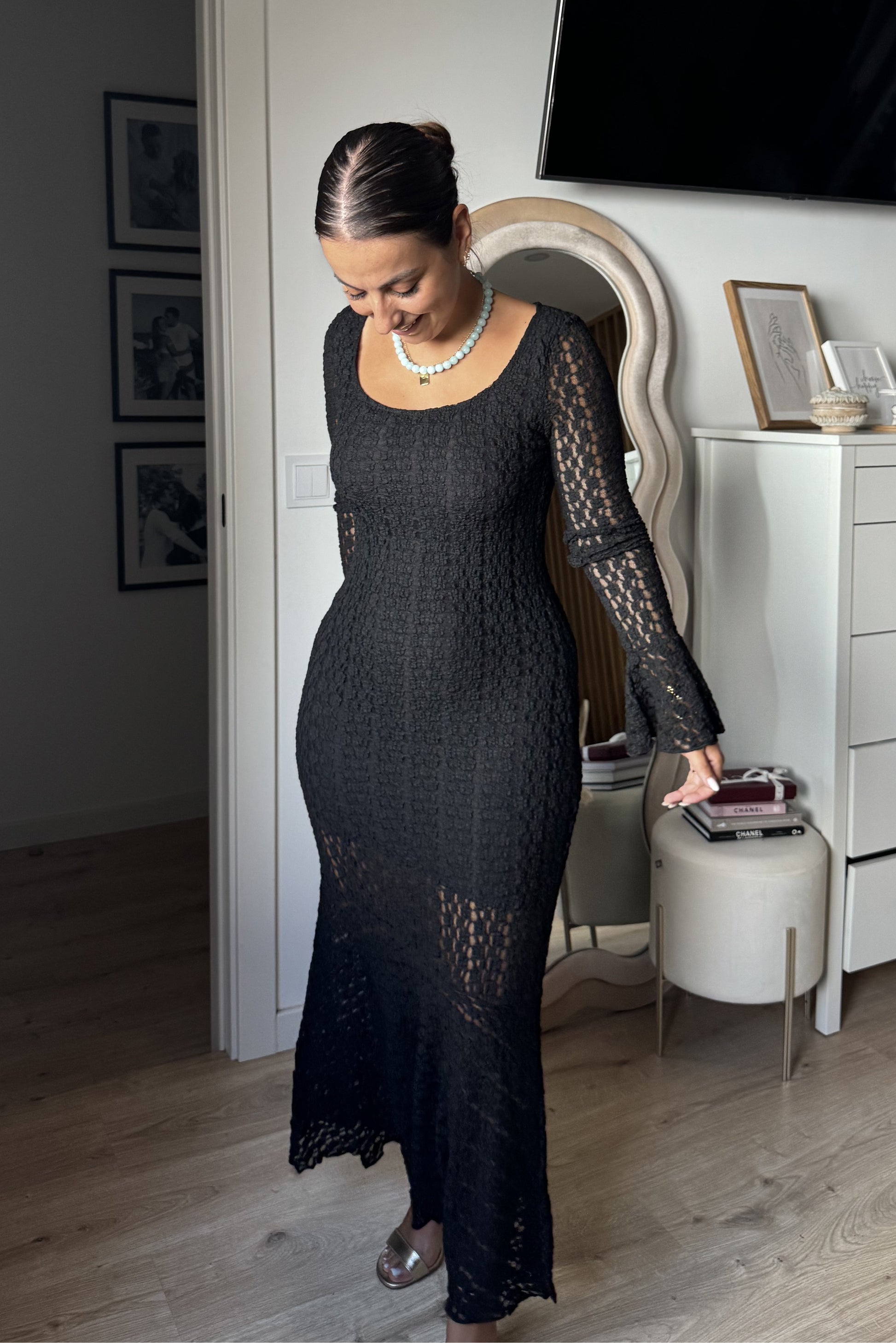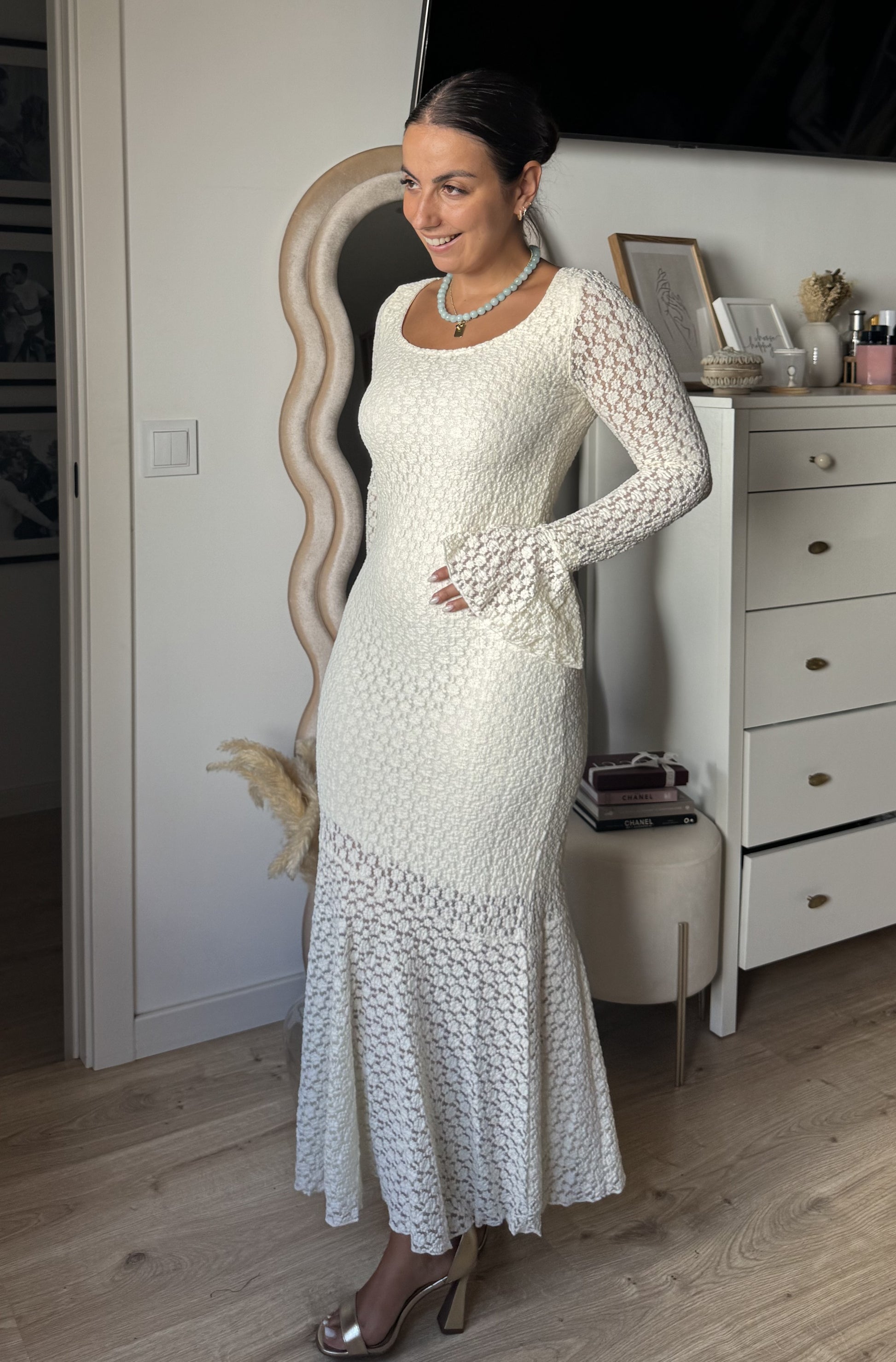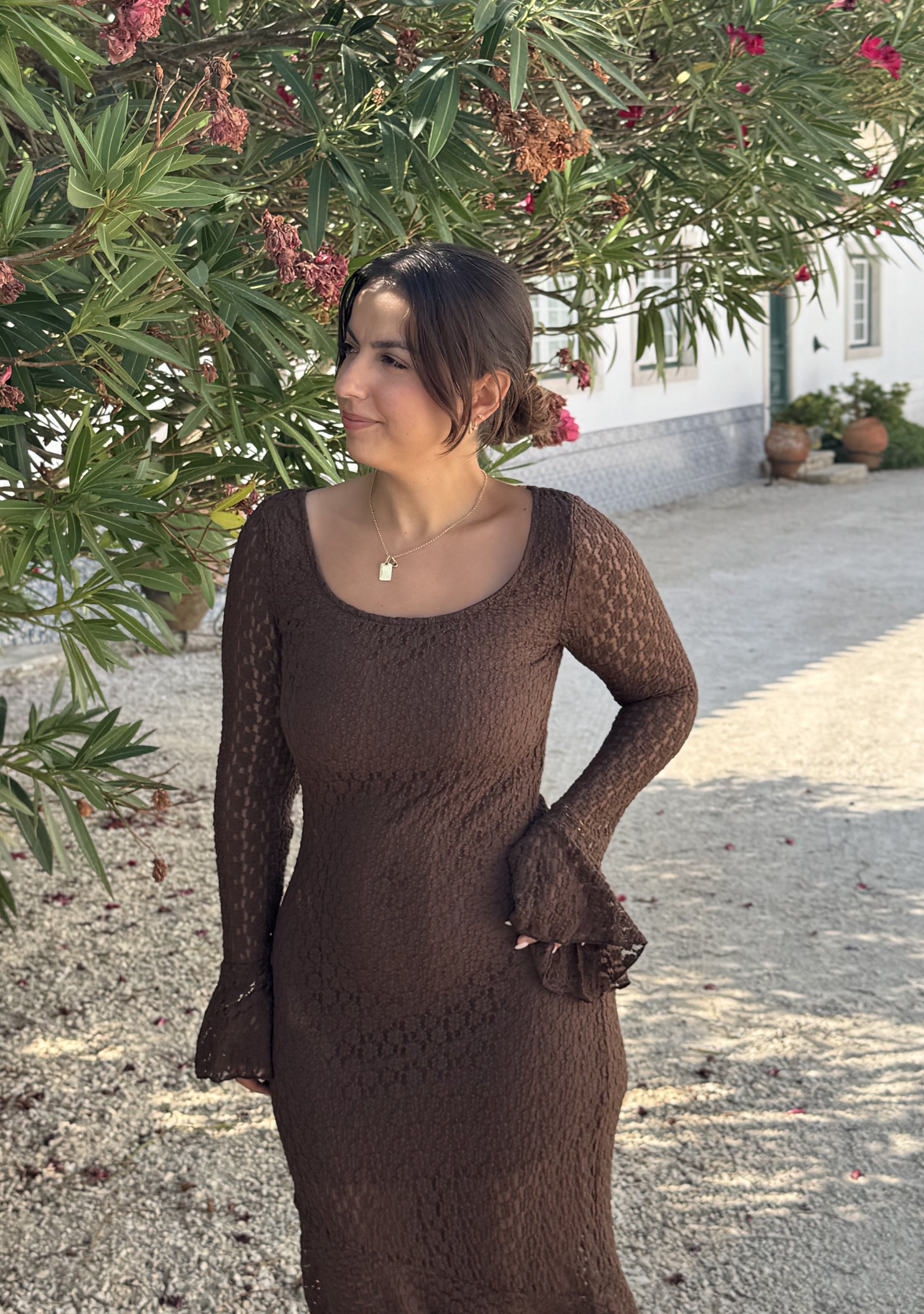 Confeccionado em renda delicada, valoriza a silhueta com um caimento ajustado que realça as curvas de forma elegante.