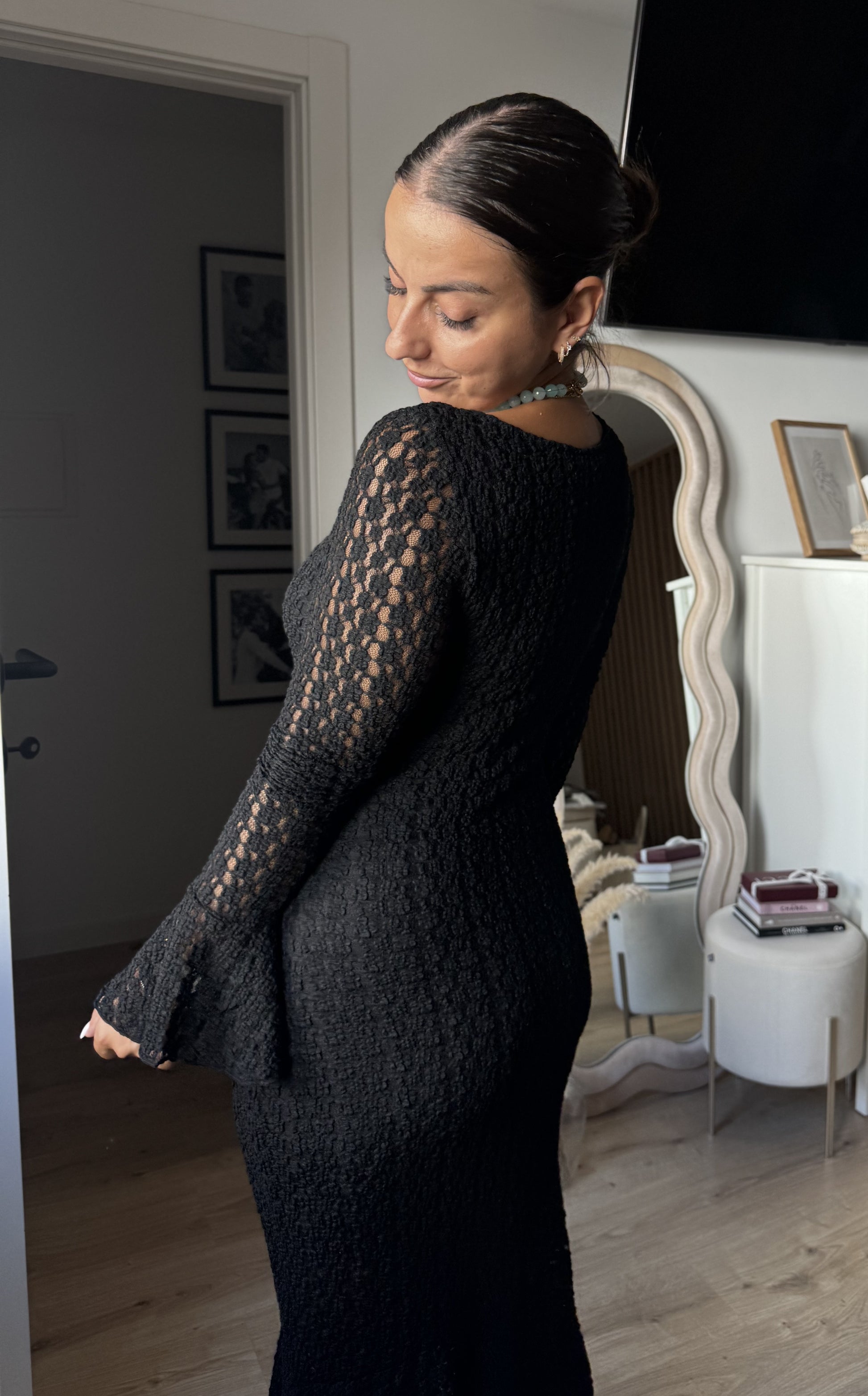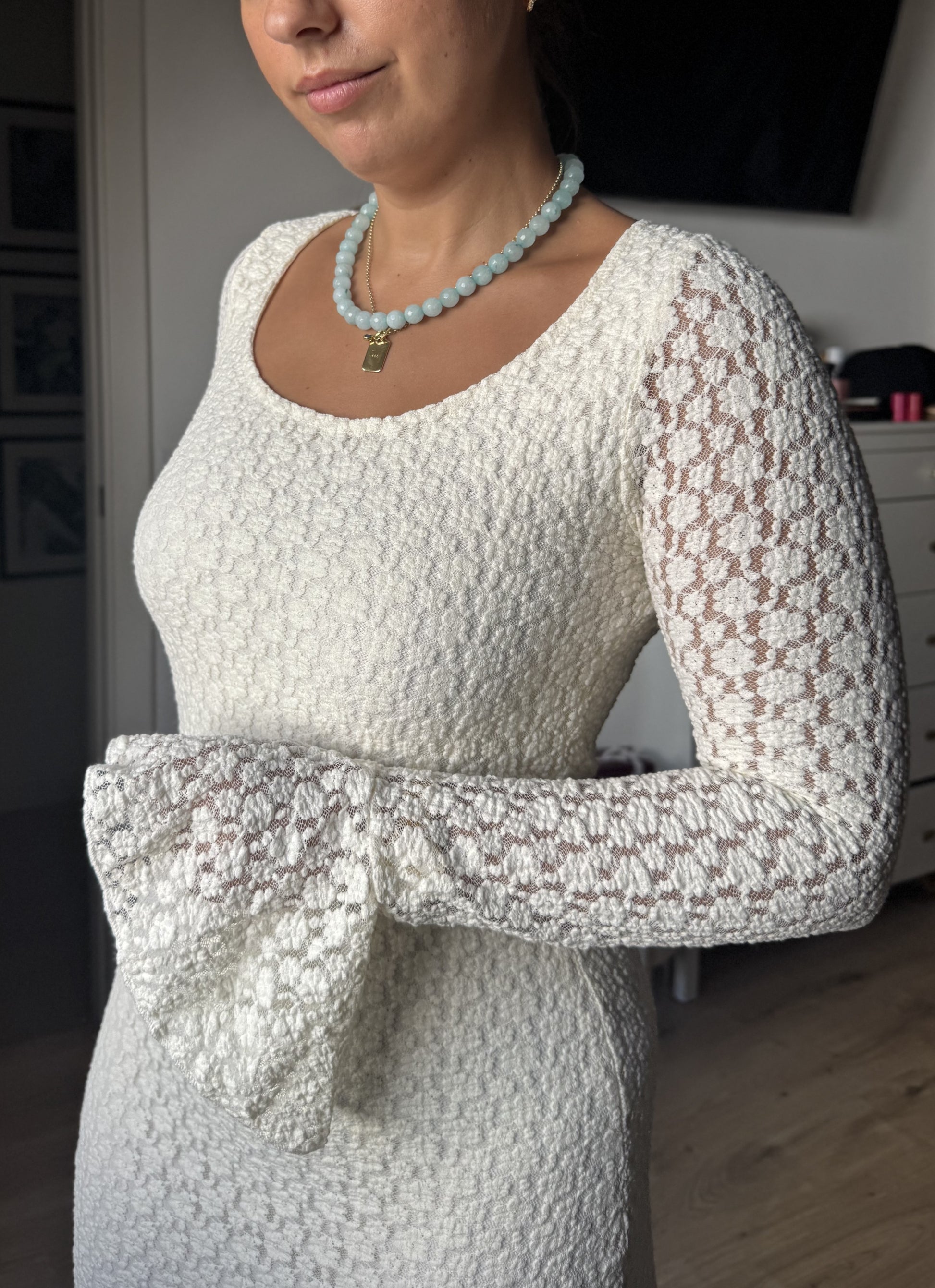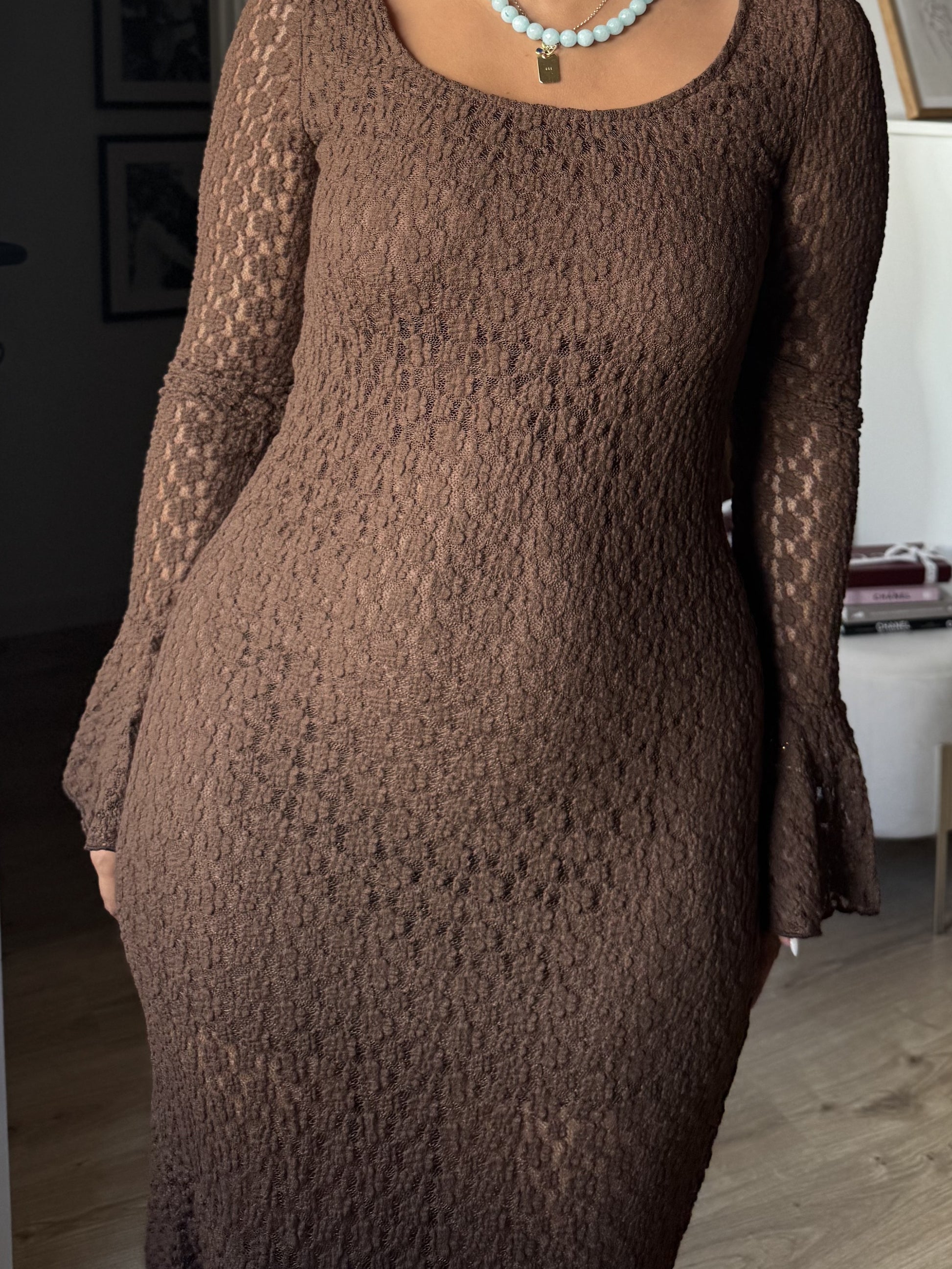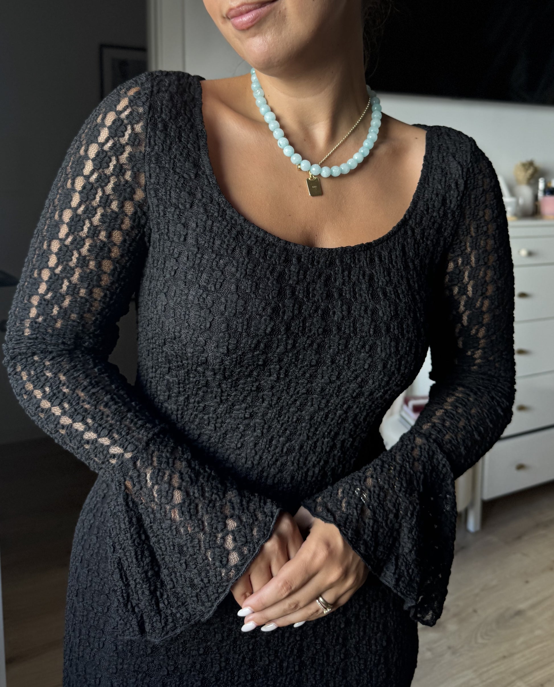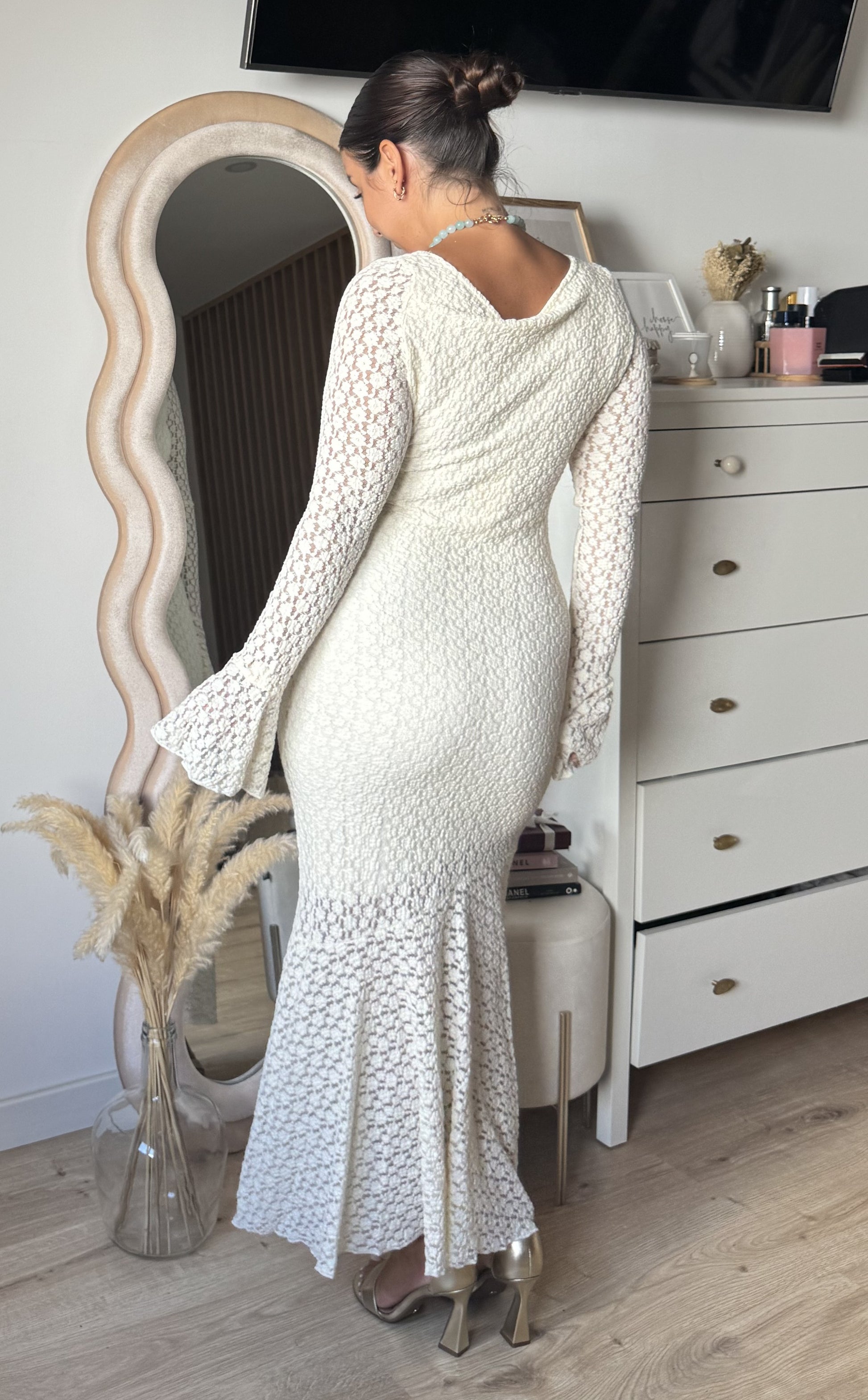 Confeccionado em renda delicada, valoriza a silhueta com um caimento ajustado que realça as curvas de forma elegante.