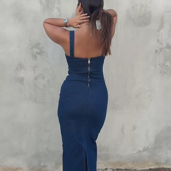 Clássico e moderno na medida certa, o vestido midi jeans é aquela peça versátil que valoriza a silhueta e combina com diferentes ocasiões. Com leve elasticidade, possui modelagem ajustada ao corpo, decote arredondado e alças largas que garantem conforto e sustentação.