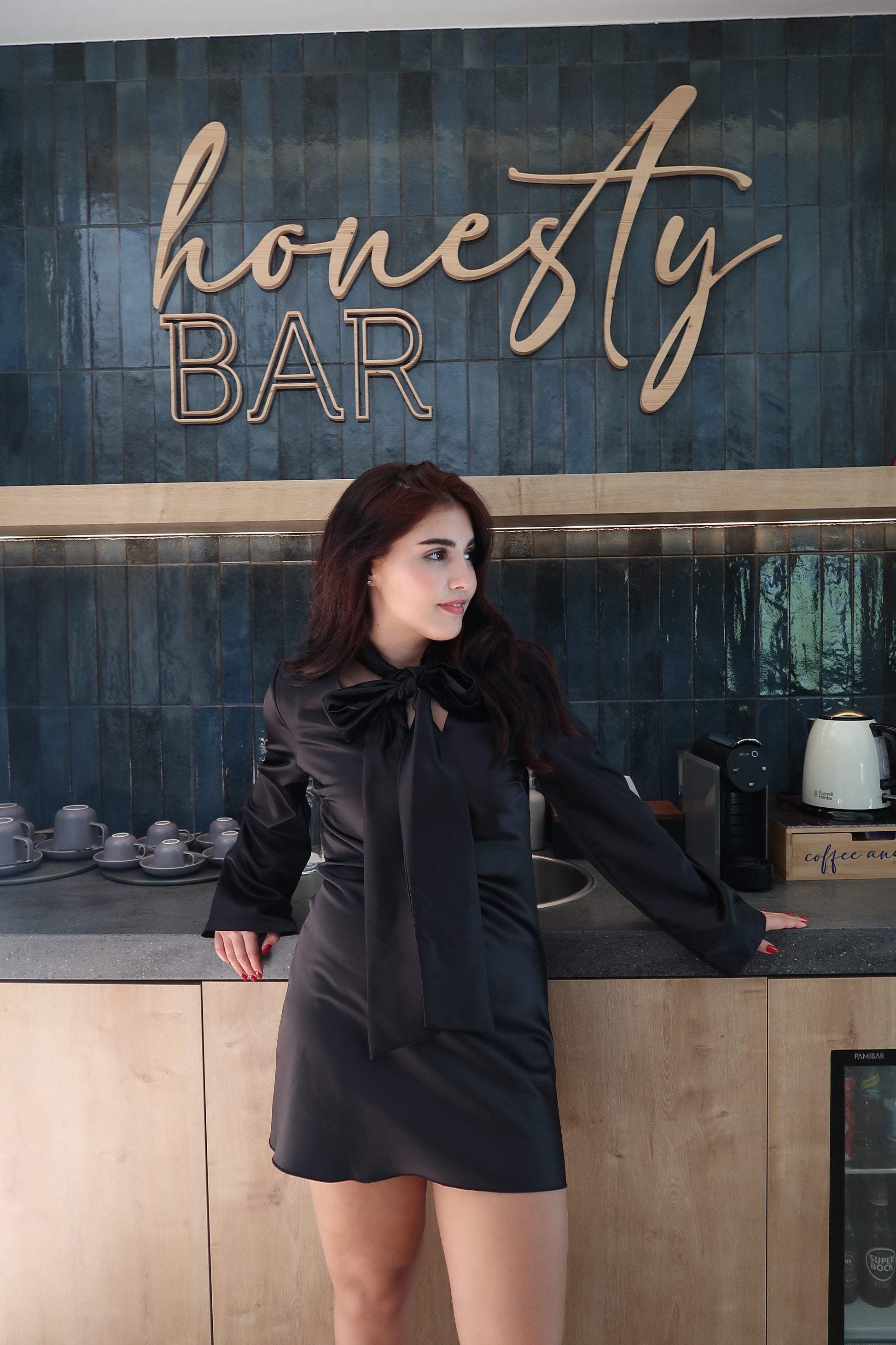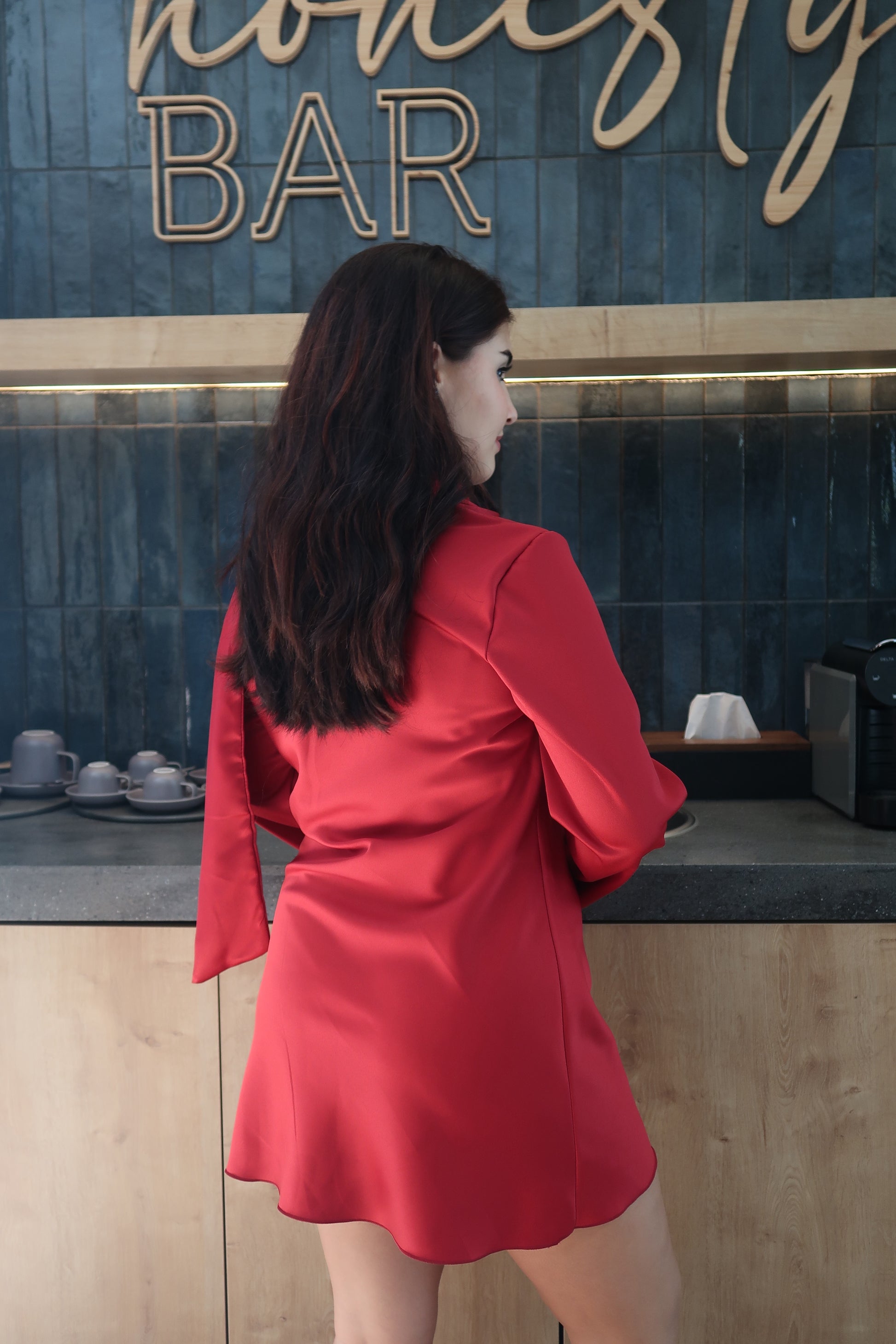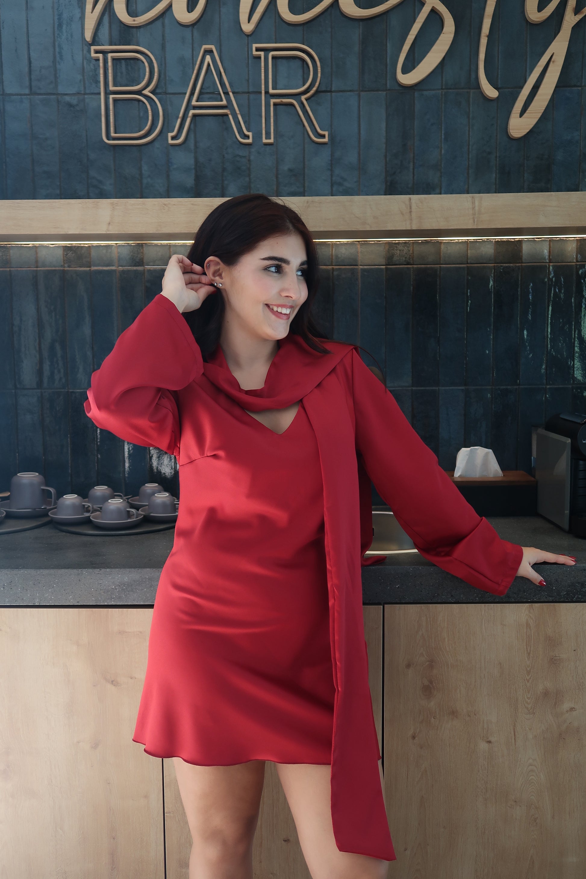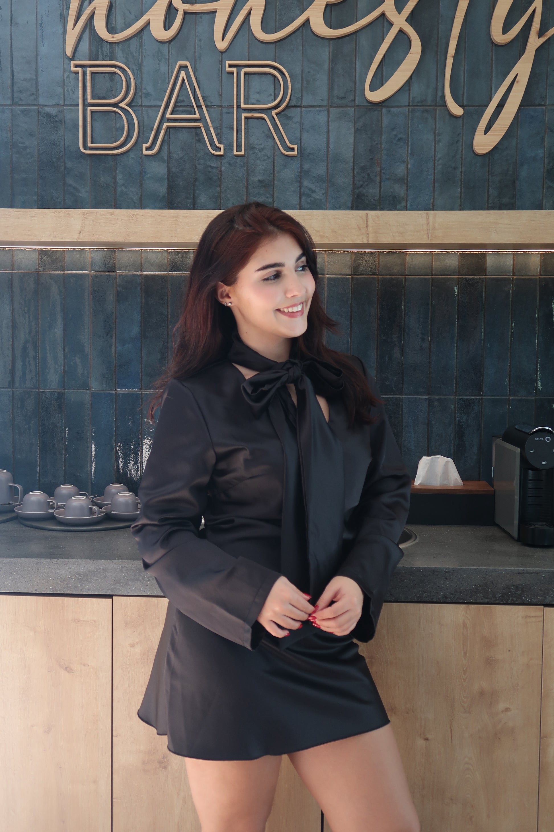 Confeccionado num tecido suave e acetinado, destaca-se pelo seu brilho subtil e toque luxuoso. O design apresenta mangas compridas e um delicado laço no decote, que pode ser utilizado de várias formas. Com um corte fluído que favorece a silhueta e um comprimento acima do joelho, este vestido é perfeito para ocasiões especiais, jantares ou eventos em que pretende um look distinto e cheio de personalidade.