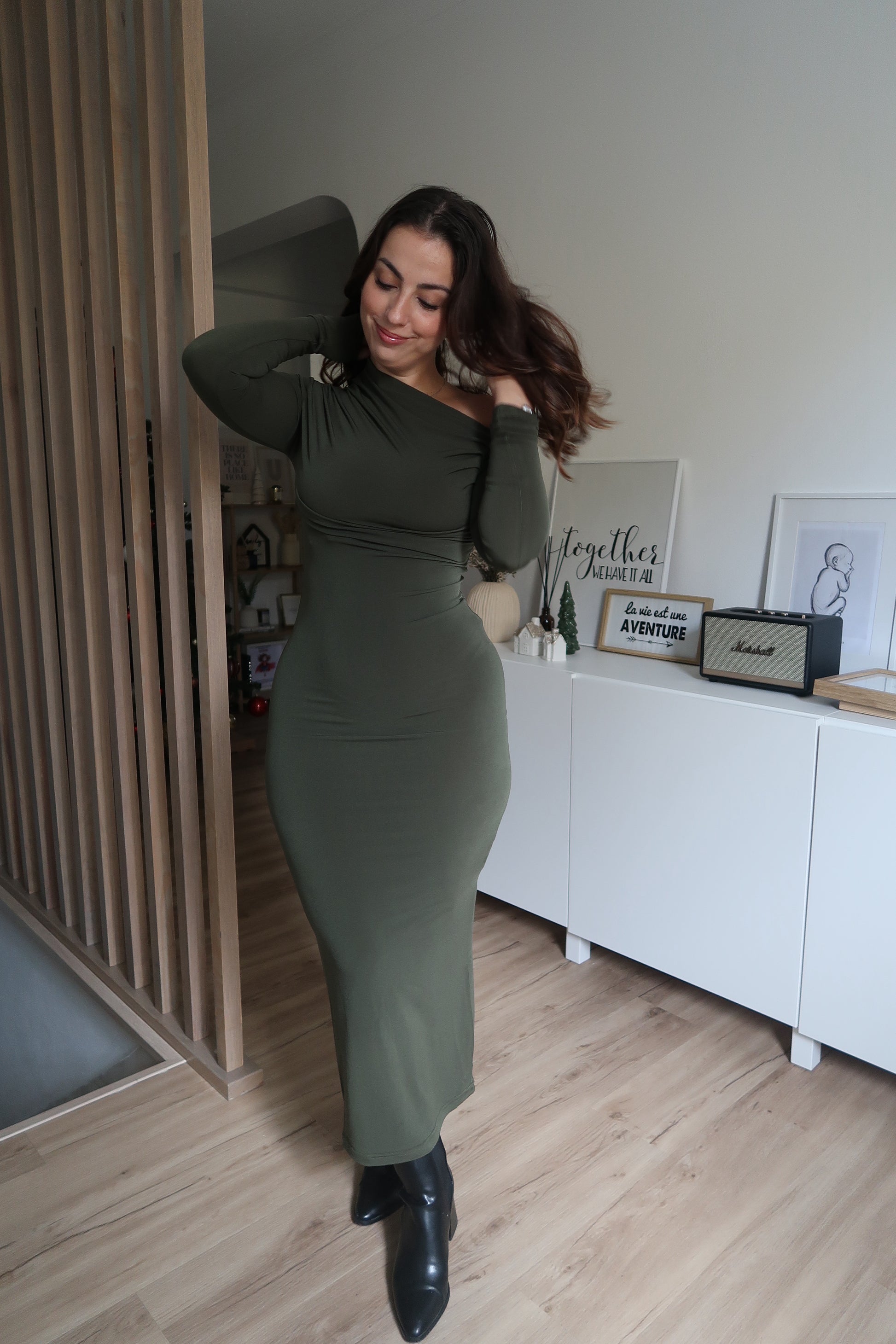 Elegante, feminino e intemporal. Este vestido midi destaca-se pelo seu corte justo que realça a silhueta, aliado a um design assimétrico no decote que lhe confere um toque moderno e sofisticado. Confeccionado em tecido elástico e confortável, adapta-se perfeitamente ao corpo, garantindo liberdade de movimentos sem perder estrutura.