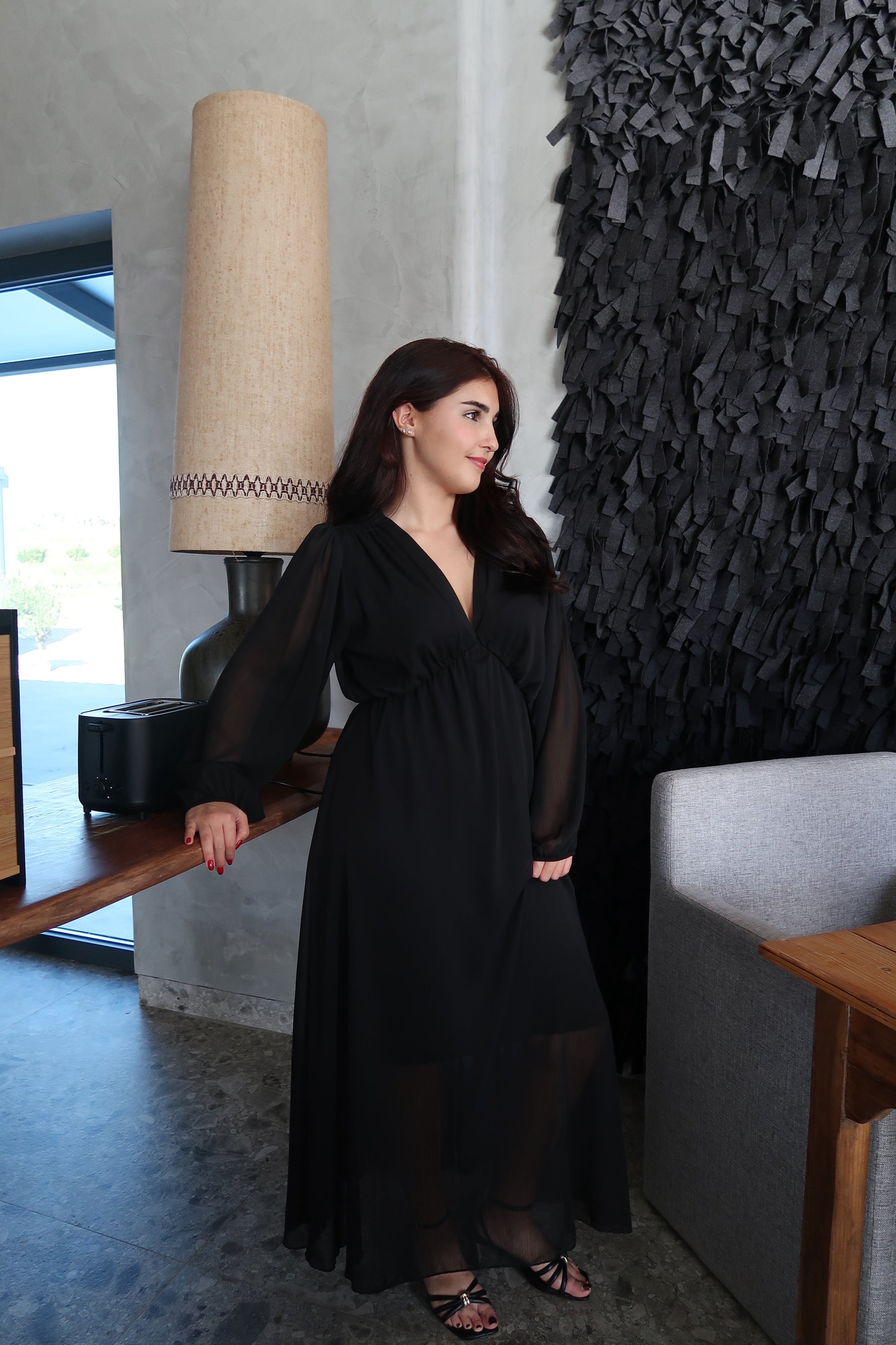 Sofisticado e intemporal, este vestido longo em chiffon é a escolha perfeita para ocasiões especiais. Com decote em V e elástico abaixo do busto, ele alonga a silhueta com leveza e elegância. As mangas longas com transparência e punhos delicadamente ajustados trazem um toque romântico, enquanto a saia fluida garante movimento e conforto. É uma peça versátil que transita com facilidade entre eventos, festas e celebrações mais formais.