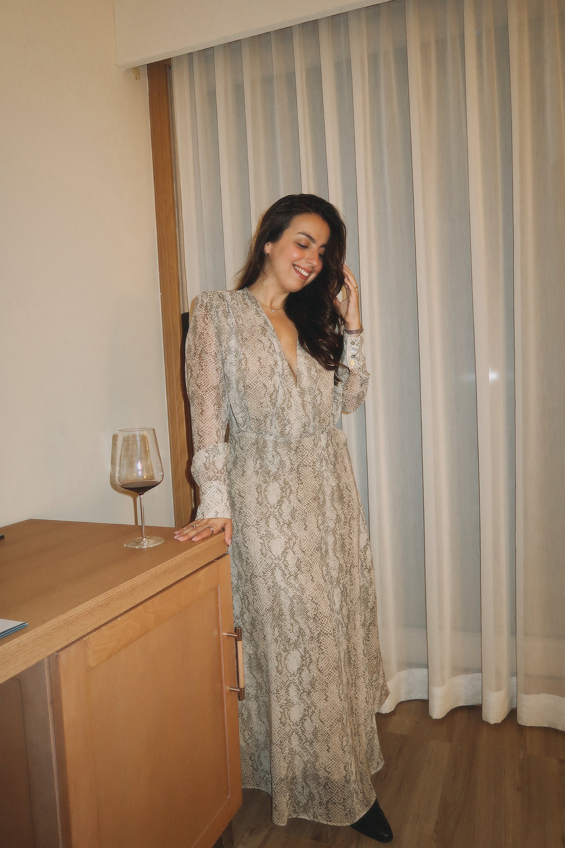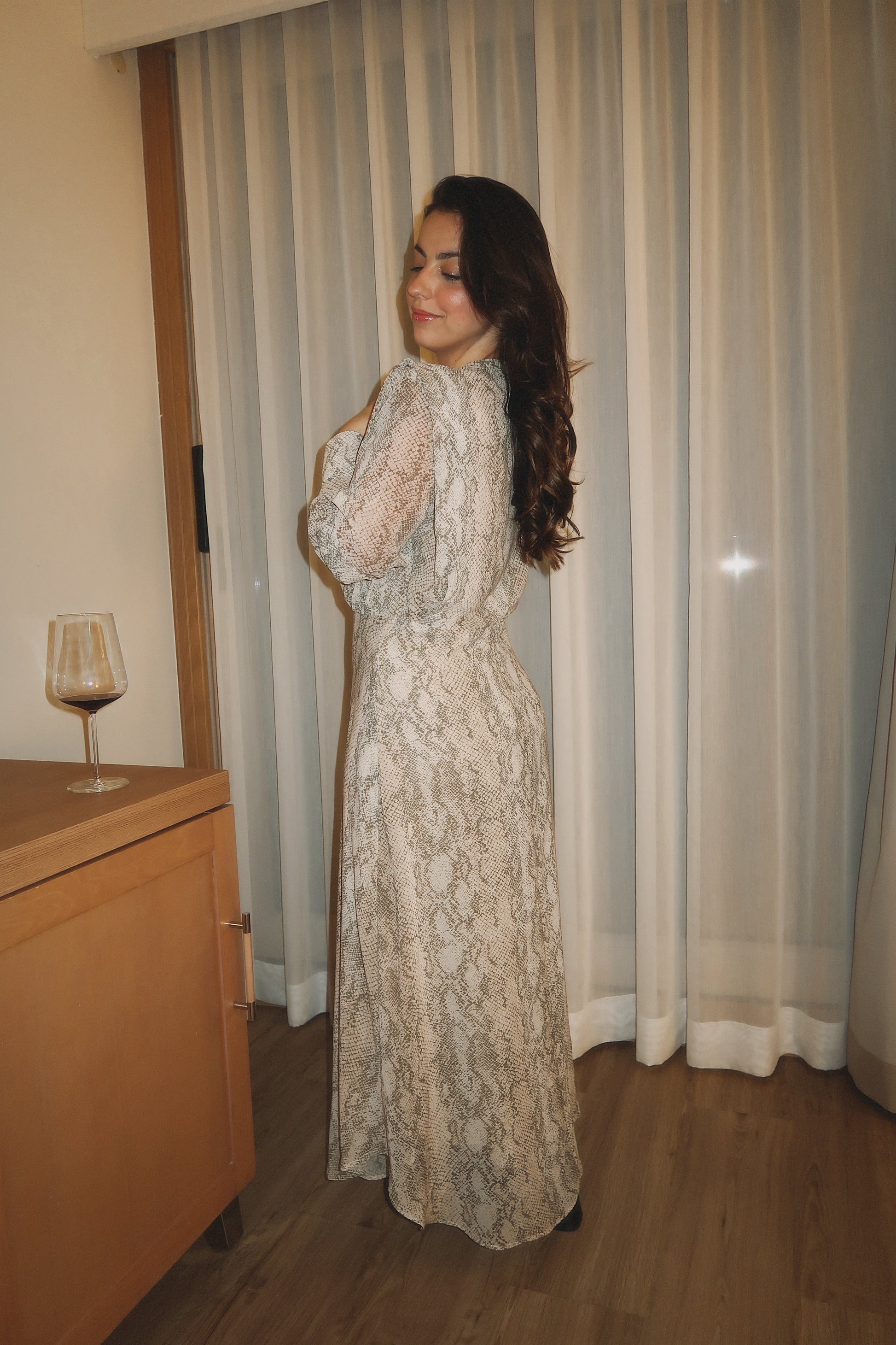 Vestido comprido com padrão snake print, pensado para mulheres que gostam de elegância sem esforço. Com decote em V delicado e mangas compridas levemente soltas, este vestido cria uma silhueta fluida e feminina, perfeita para ocasiões especiais ou jantares mais sofisticados.